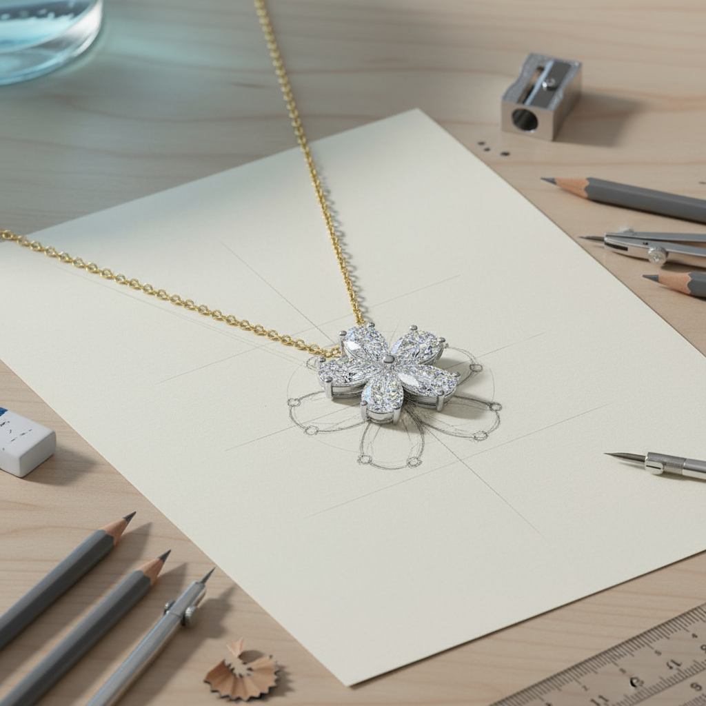This enchanting diamond pendant features five expertly set pear-shaped diamonds, arranged to form a delicate flower design. The graceful curves and brilliant sparkle of each diamond create a captivating, feminine piece that adds a touch of elegance to any outfit. Perfect for special occasions or as a timeless addition to your jewelry collection.