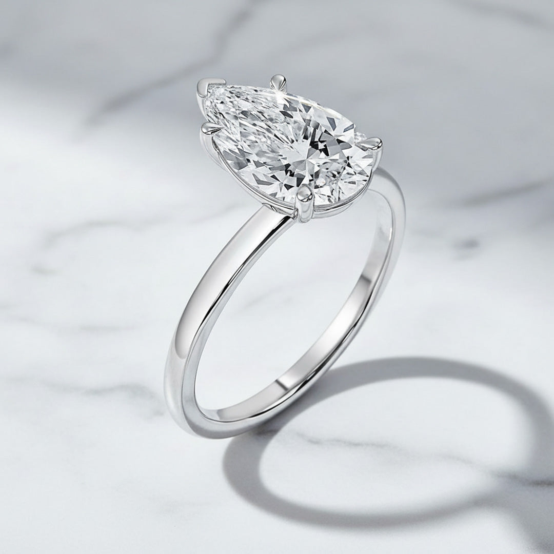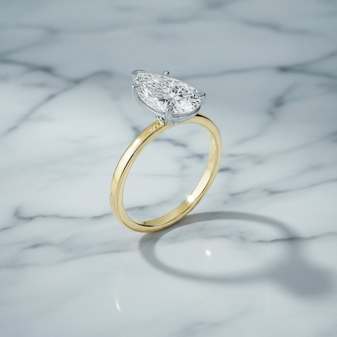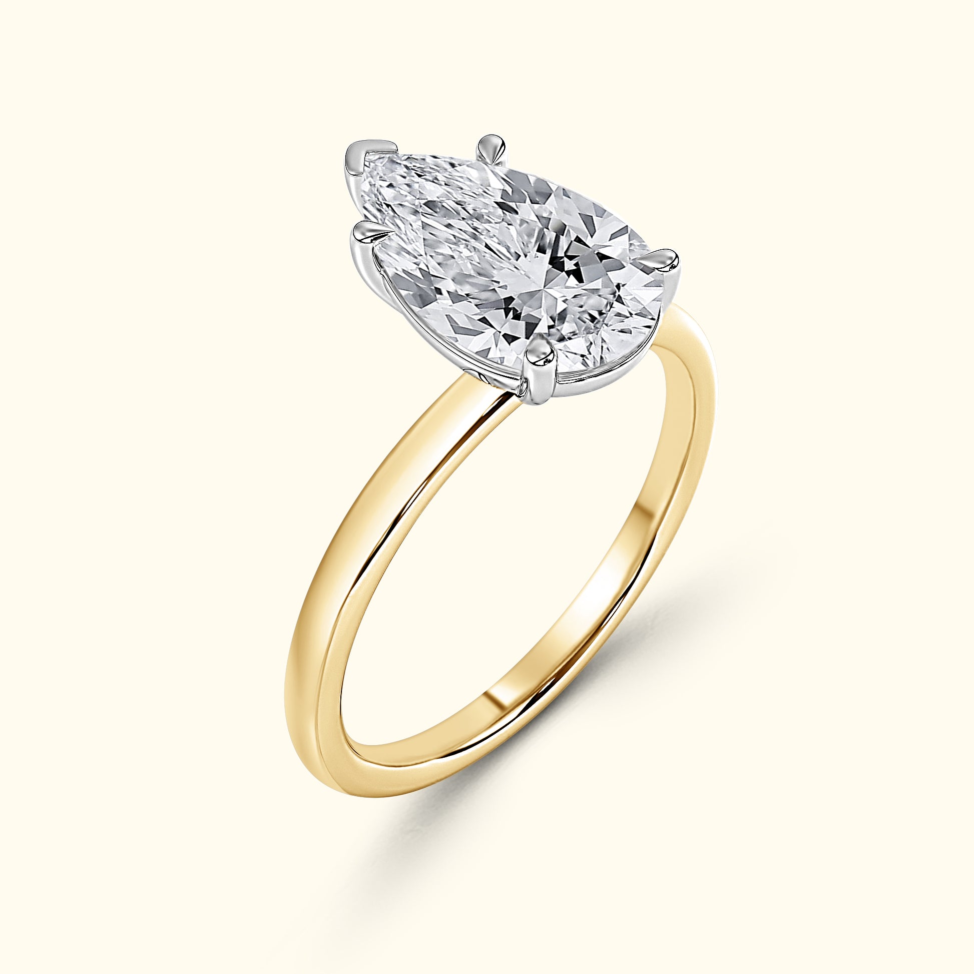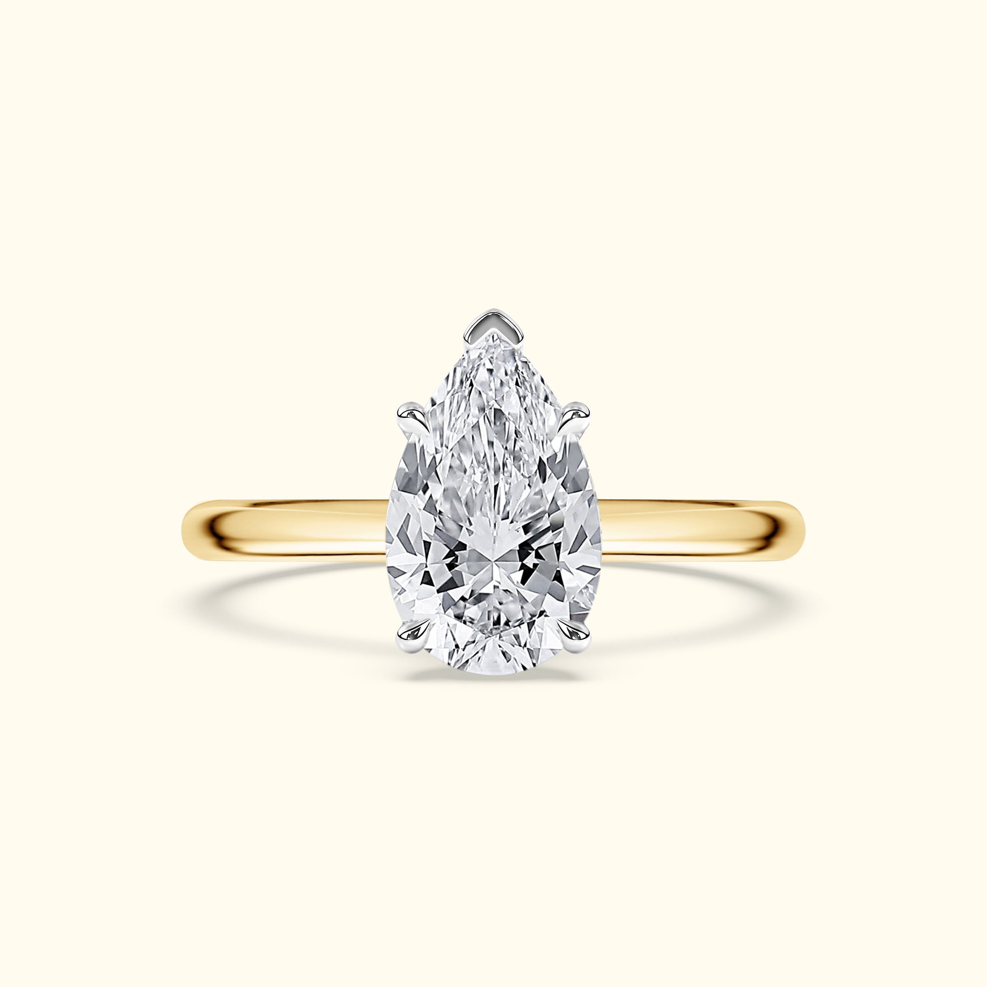 Elegant and timeless, this engagement ring features a beautiful pear-shaped diamond in a secure five-prong setting. The sleek two-tone band keeps the focus on the diamond’s graceful shape and brilliant sparkle.
