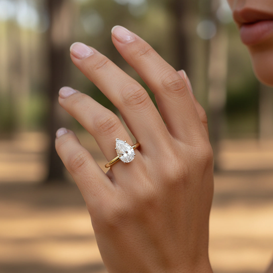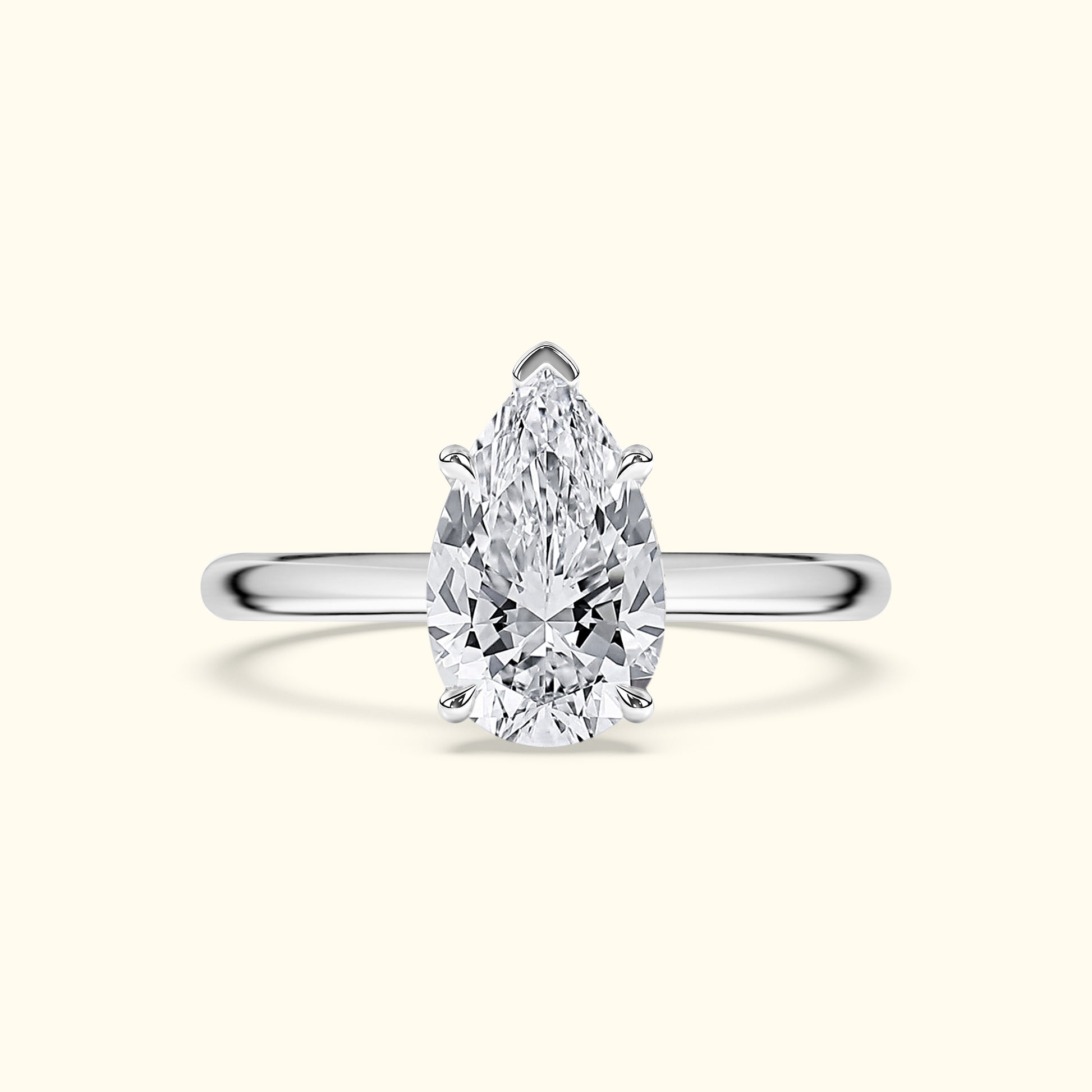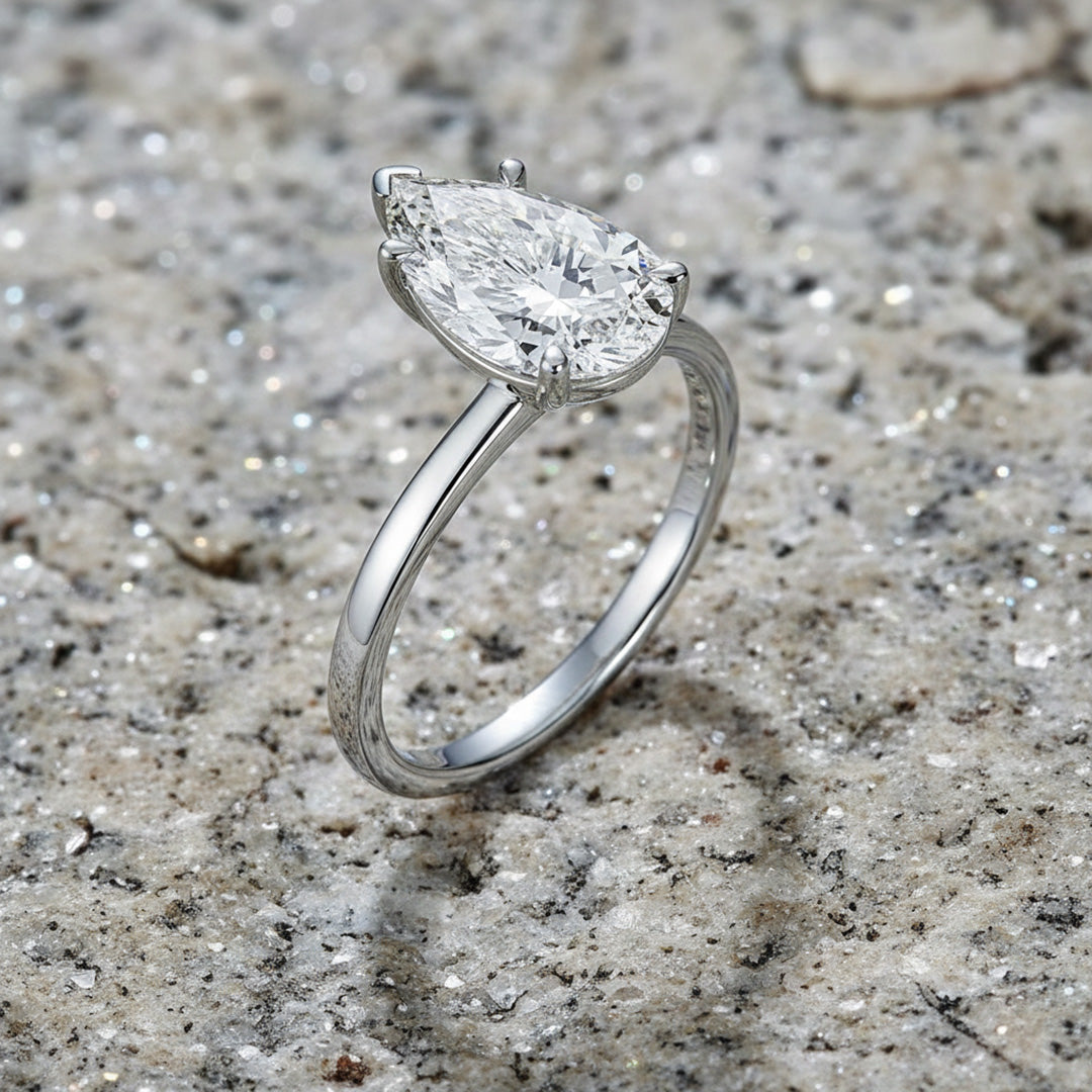 Elegant and timeless, this engagement ring features a beautiful pear-shaped diamond in a secure five-prong setting. The sleek two-tone band keeps the focus on the diamond’s graceful shape and brilliant sparkle.