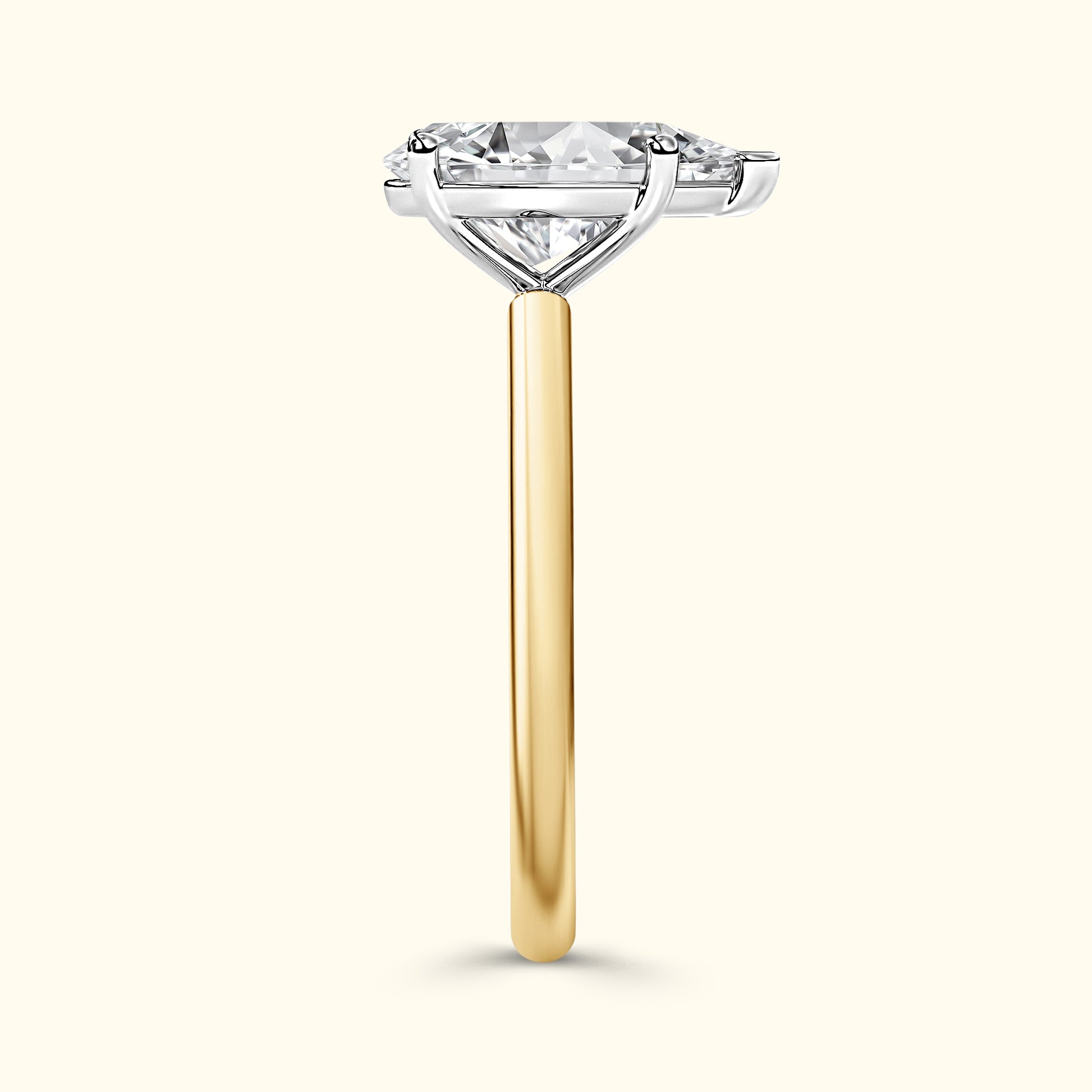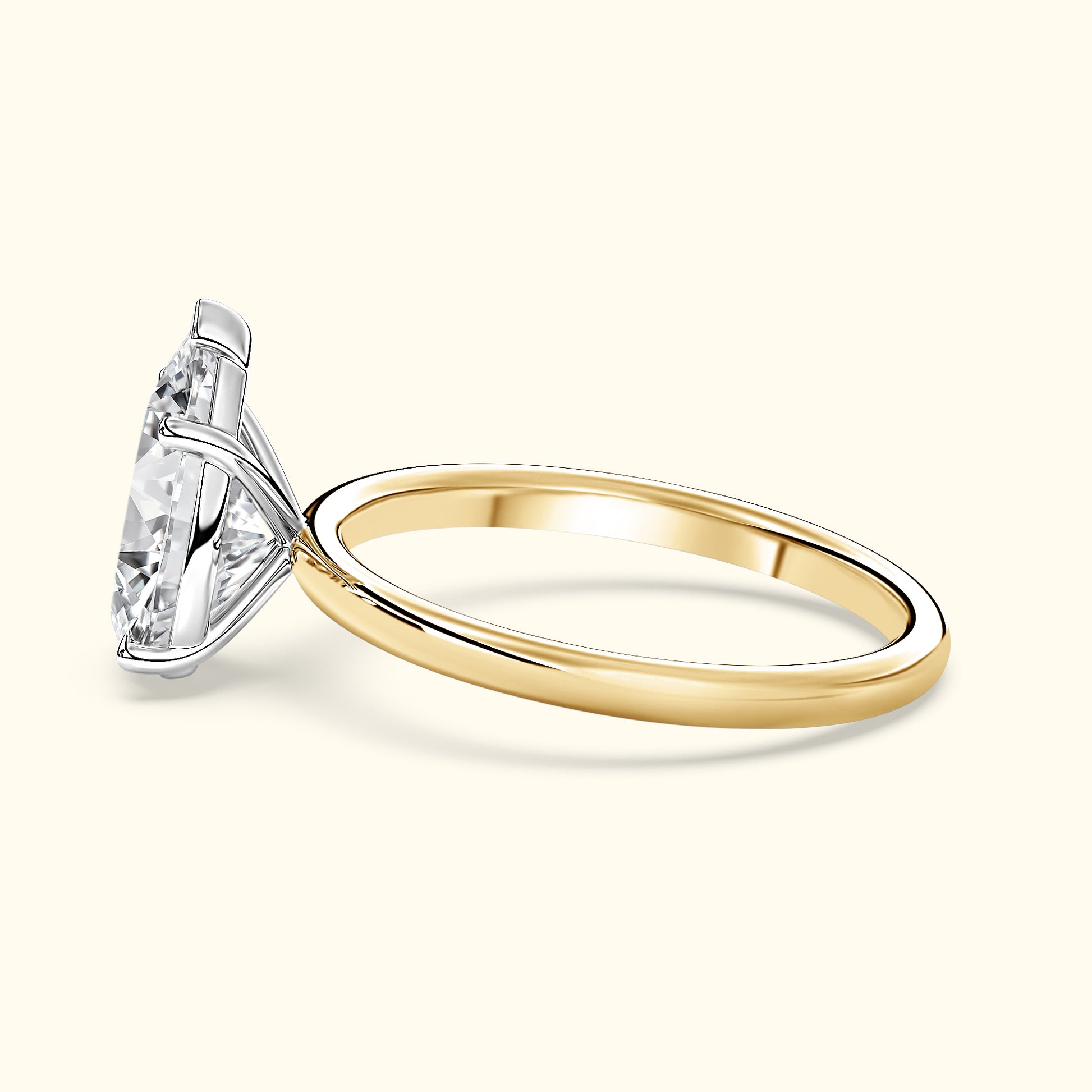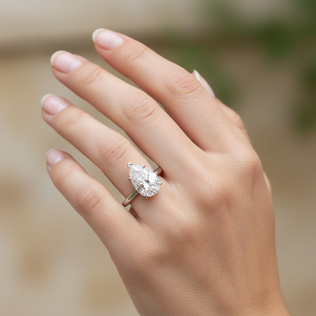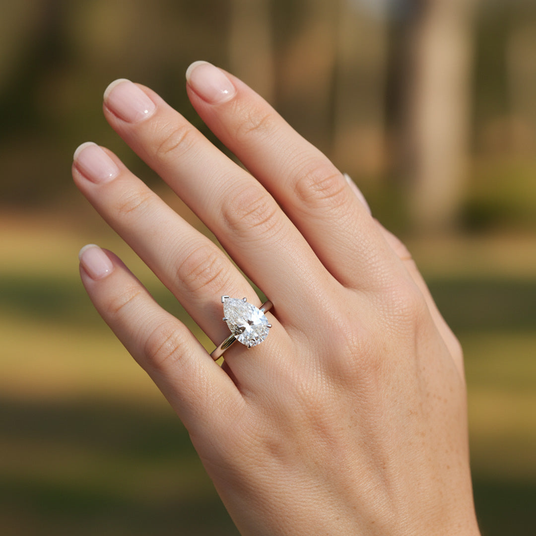 Elegant and timeless, this engagement ring features a beautiful pear-shaped diamond in a secure five-prong setting. The sleek two-tone band keeps the focus on the diamond’s graceful shape and brilliant sparkle.