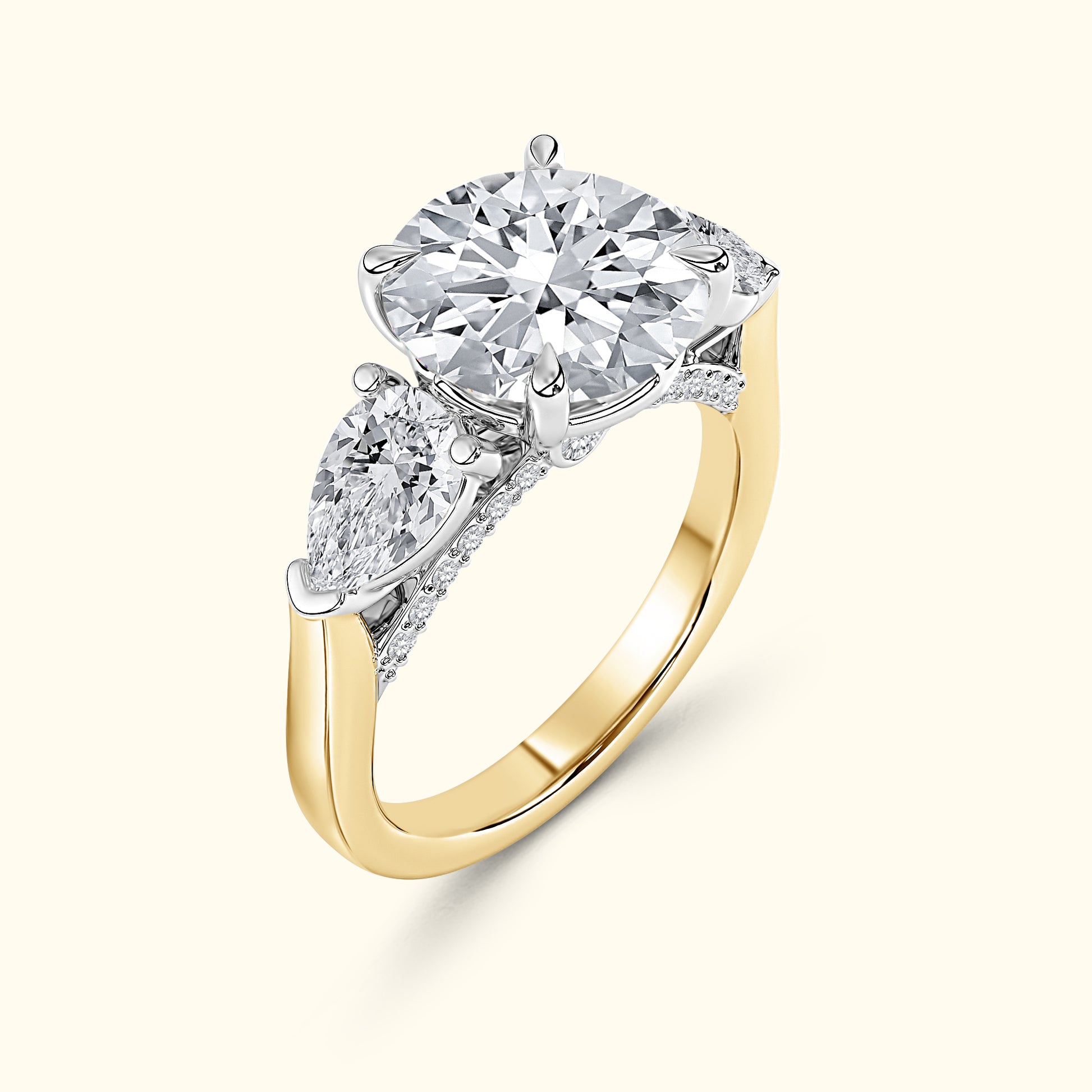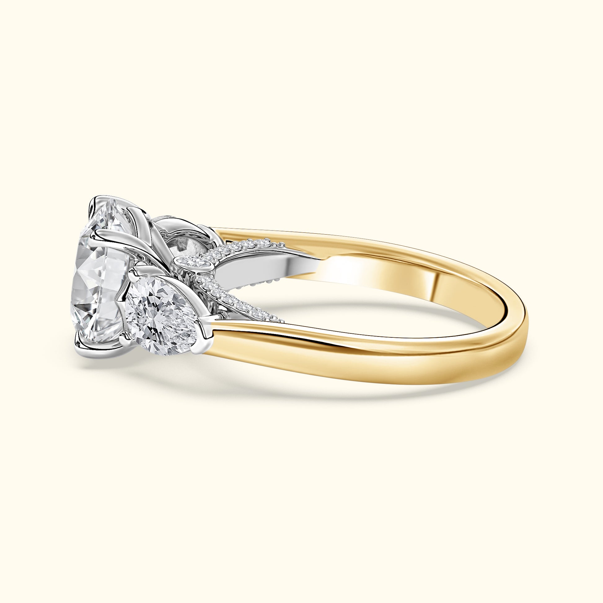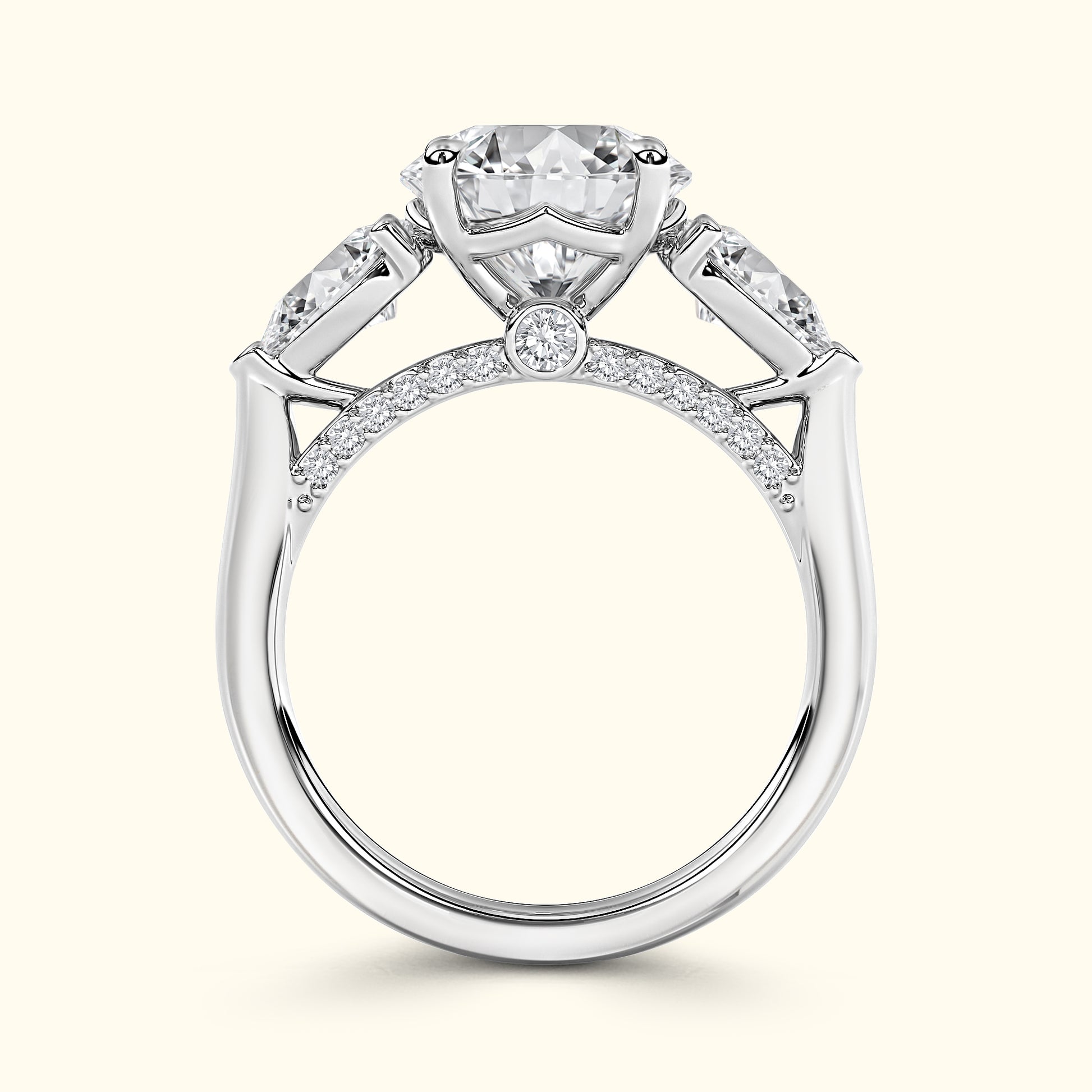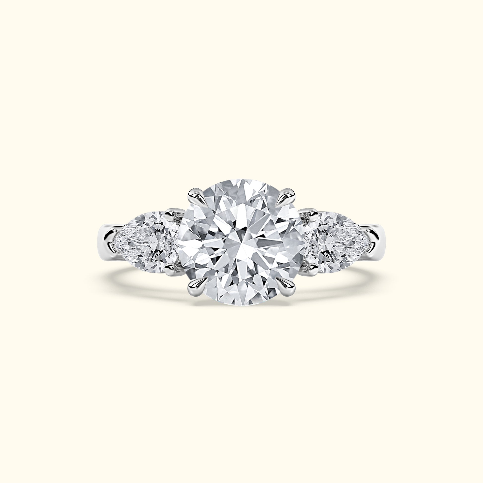 This elegant engagement ring features a brilliant round center stone paired with matching pear-shaped side stones for a timeless, graceful look. A delicate diamond bridge adds subtle sparkle beneath the setting. Beautiful from every angle, it offers classic style with refined detail.