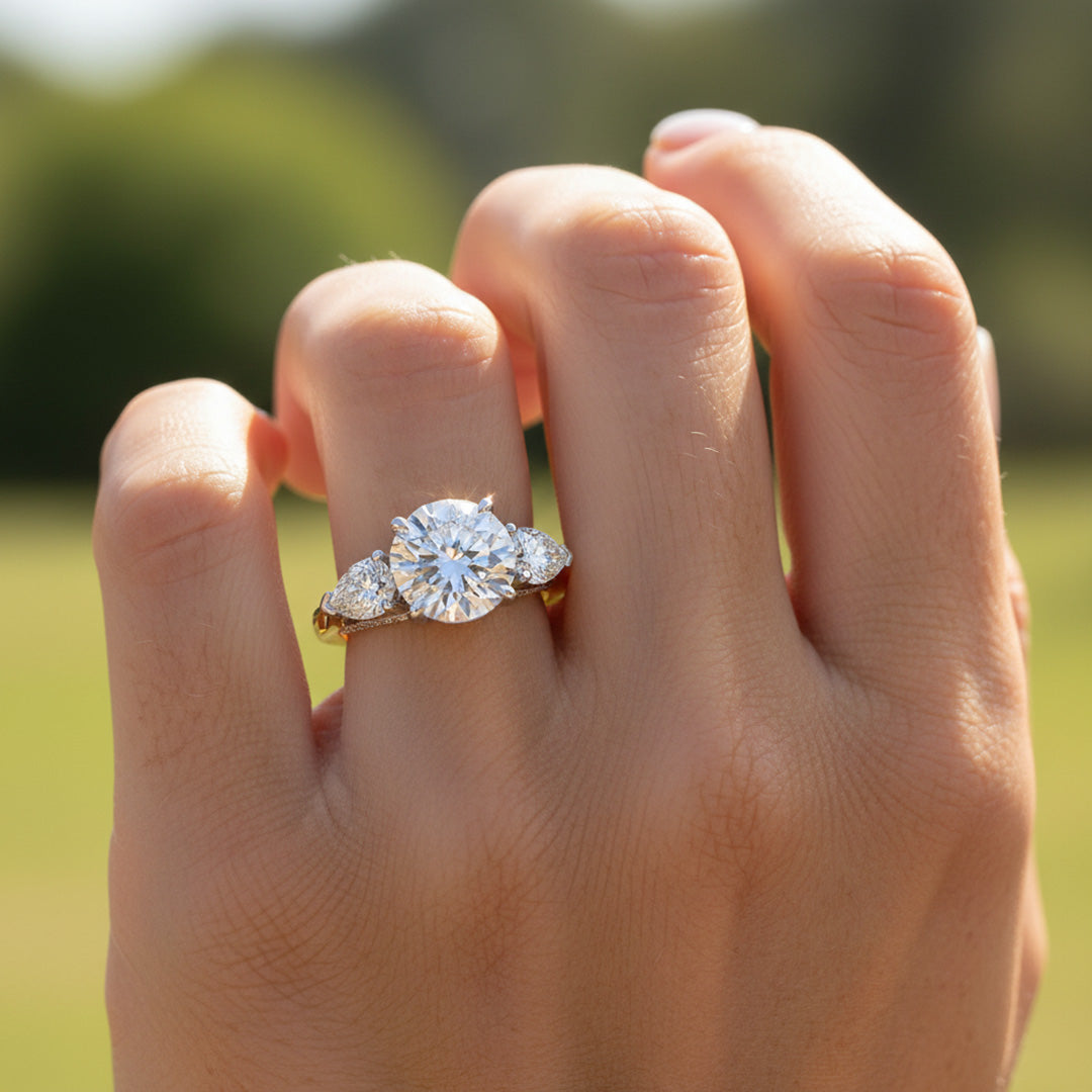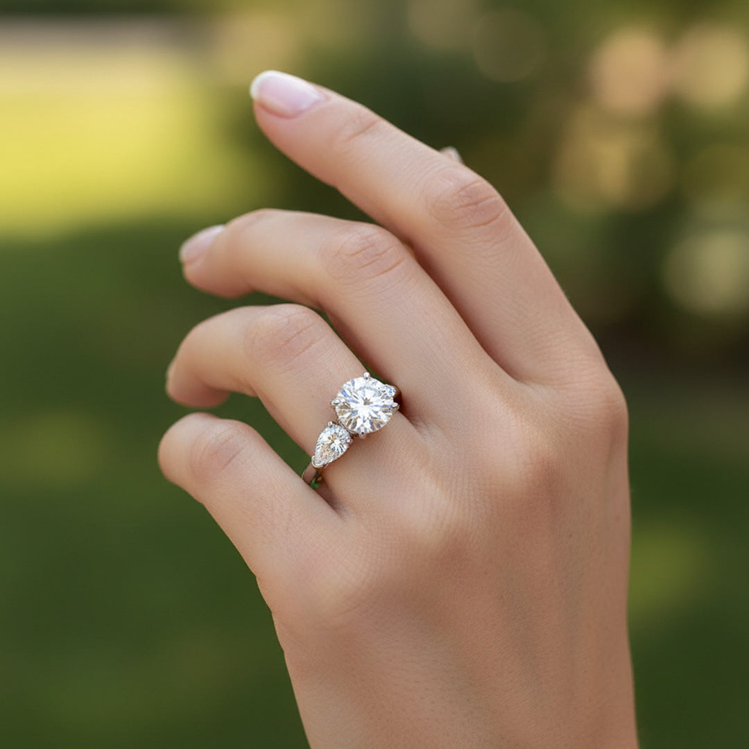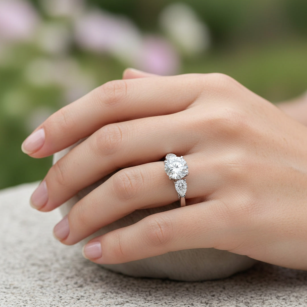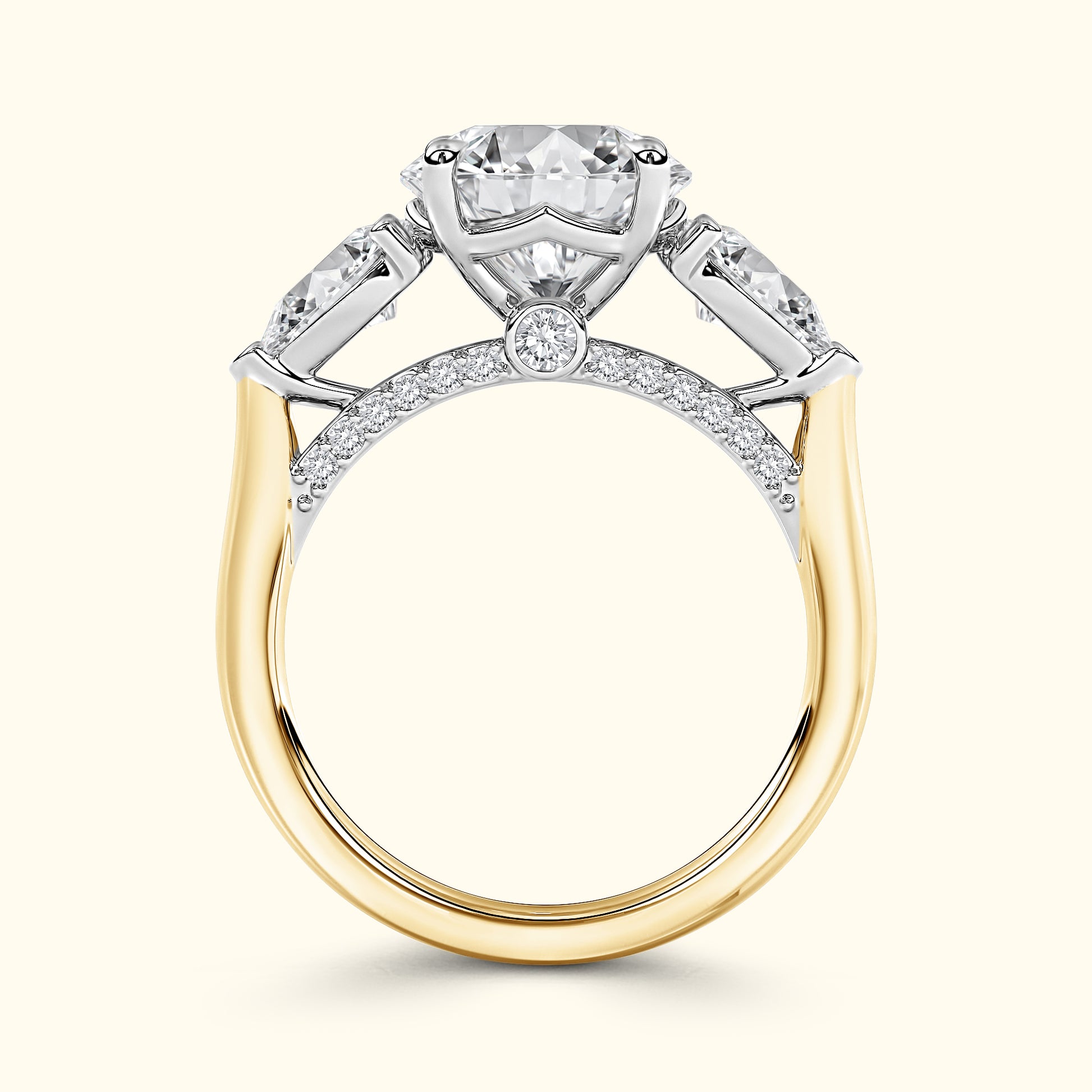 This elegant engagement ring features a brilliant round center stone paired with matching pear-shaped side stones for a timeless, graceful look. A delicate diamond bridge adds subtle sparkle beneath the setting. Beautiful from every angle, it offers classic style with refined detail.