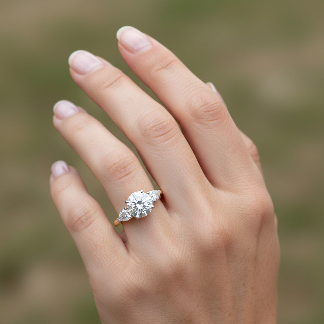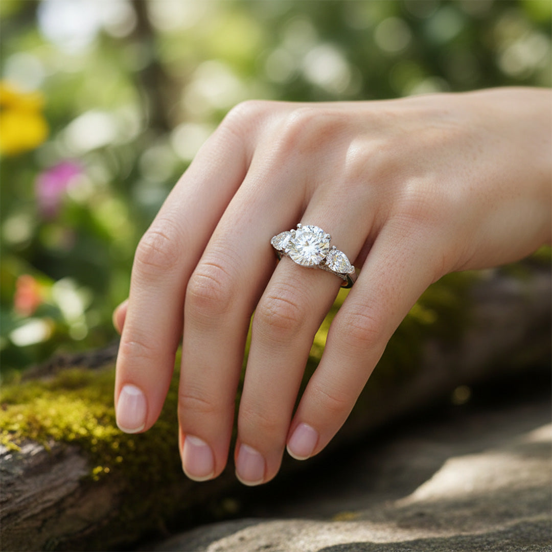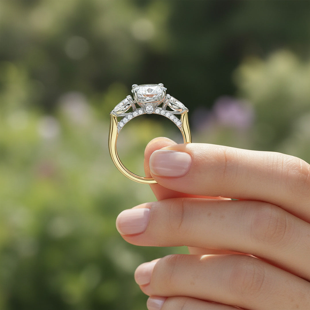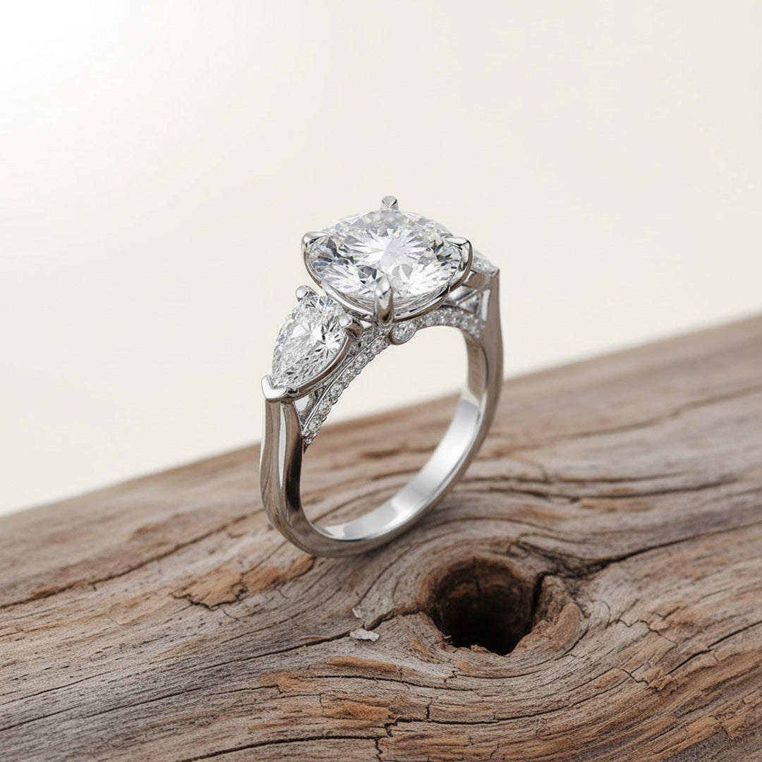 This elegant engagement ring features a brilliant round center stone paired with matching pear-shaped side stones for a timeless, graceful look. A delicate diamond bridge adds subtle sparkle beneath the setting. Beautiful from every angle, it offers classic style with refined detail.