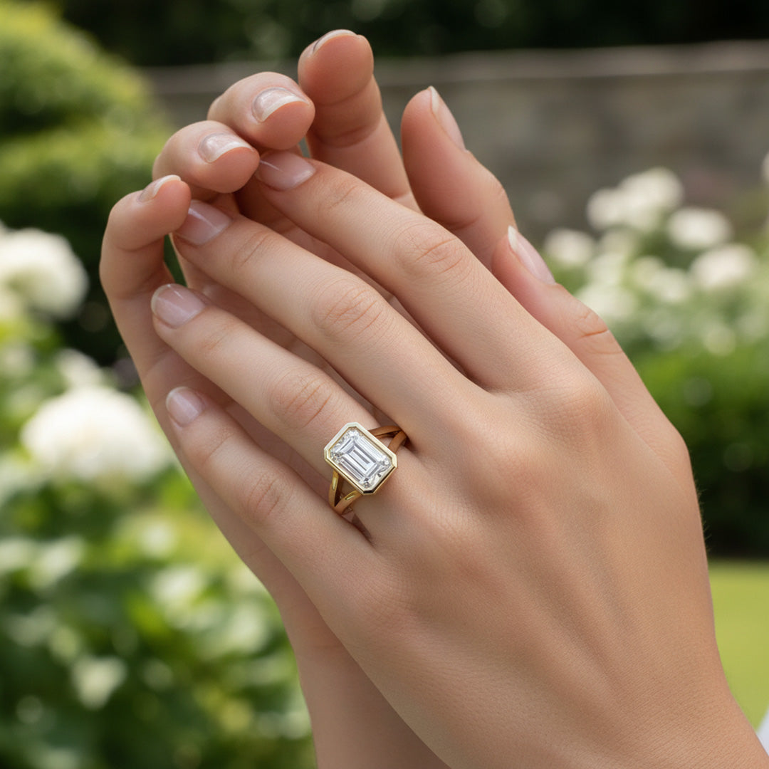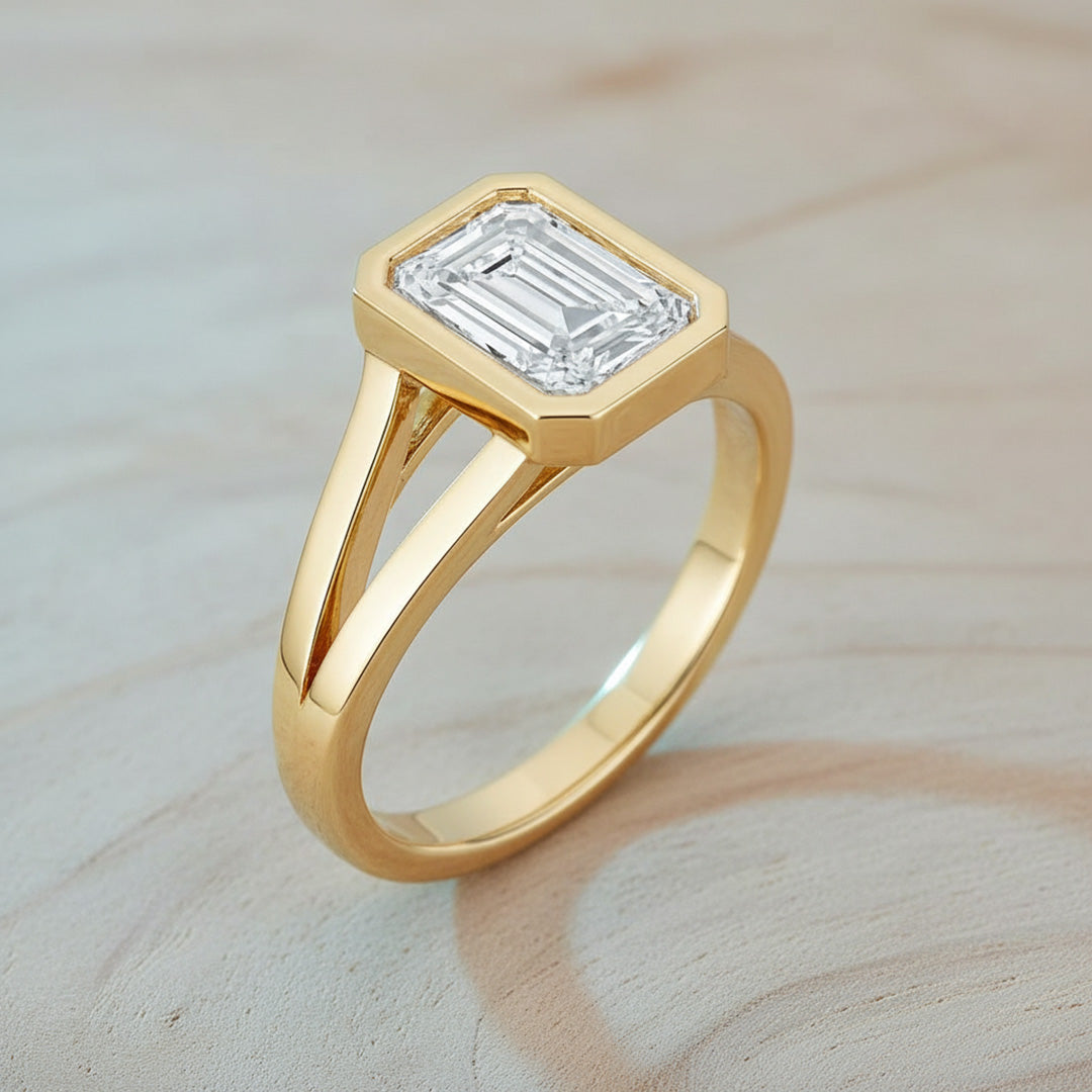 This elegant engagement ring features a dazzling bezel-set diamond for a modern, secure look. A sleek split shank adds sophistication and enhances the center stone’s brilliance. A beautiful blend of contemporary style and timeless charm.