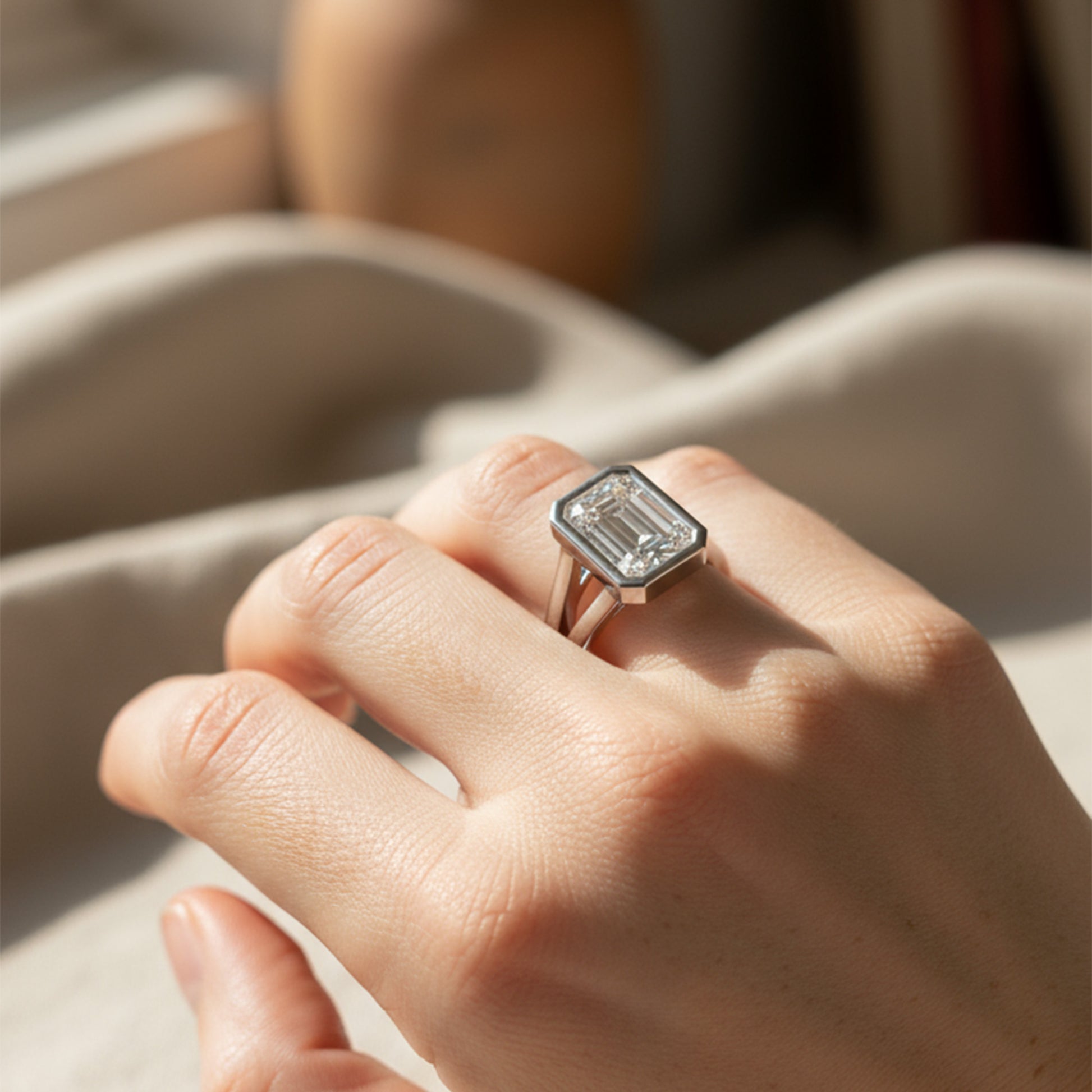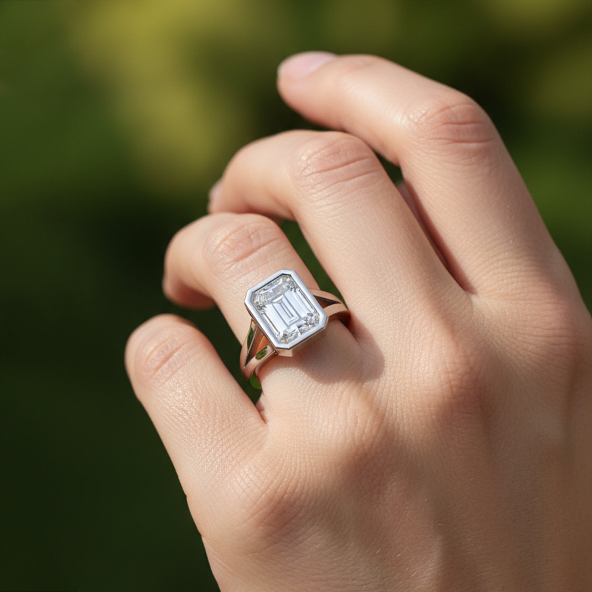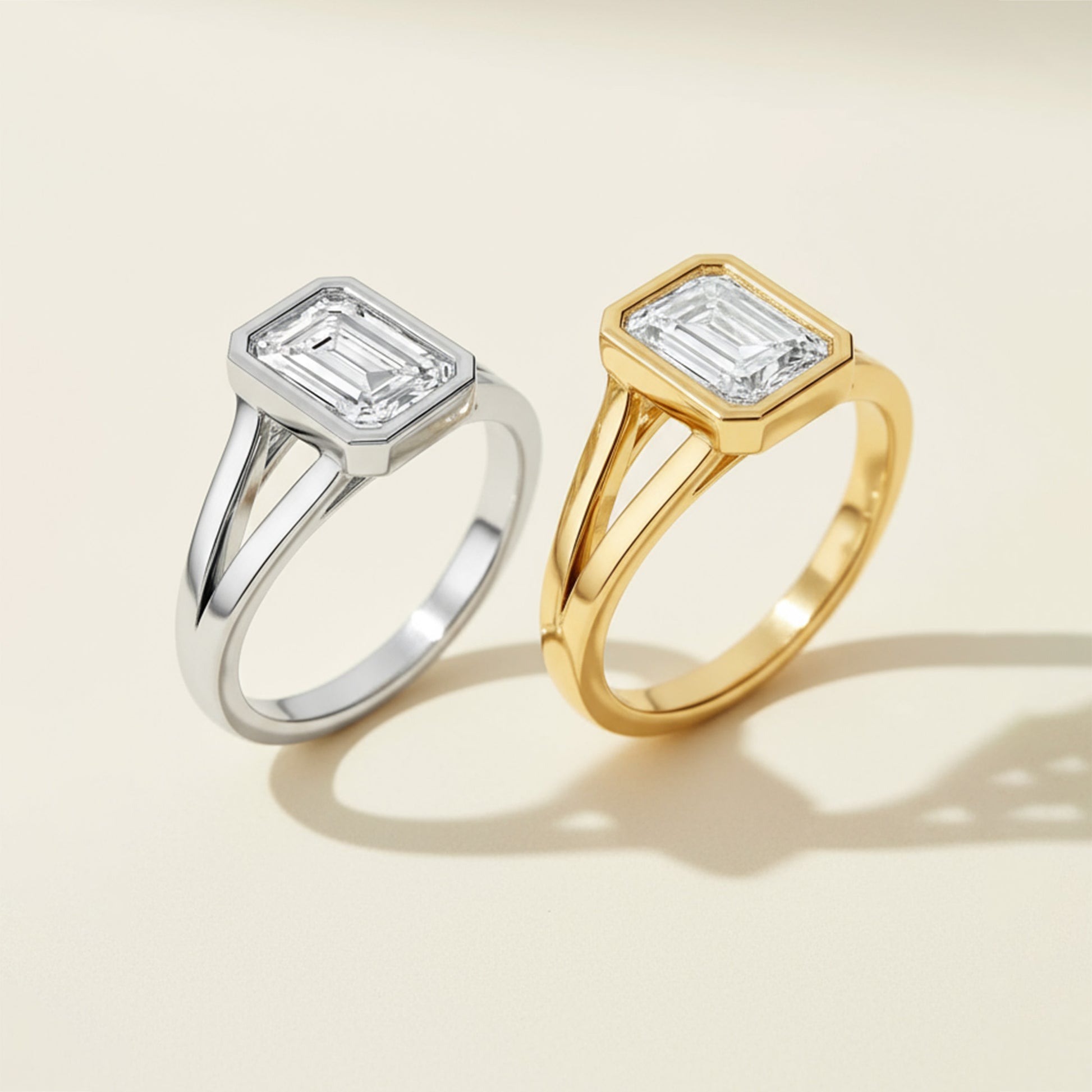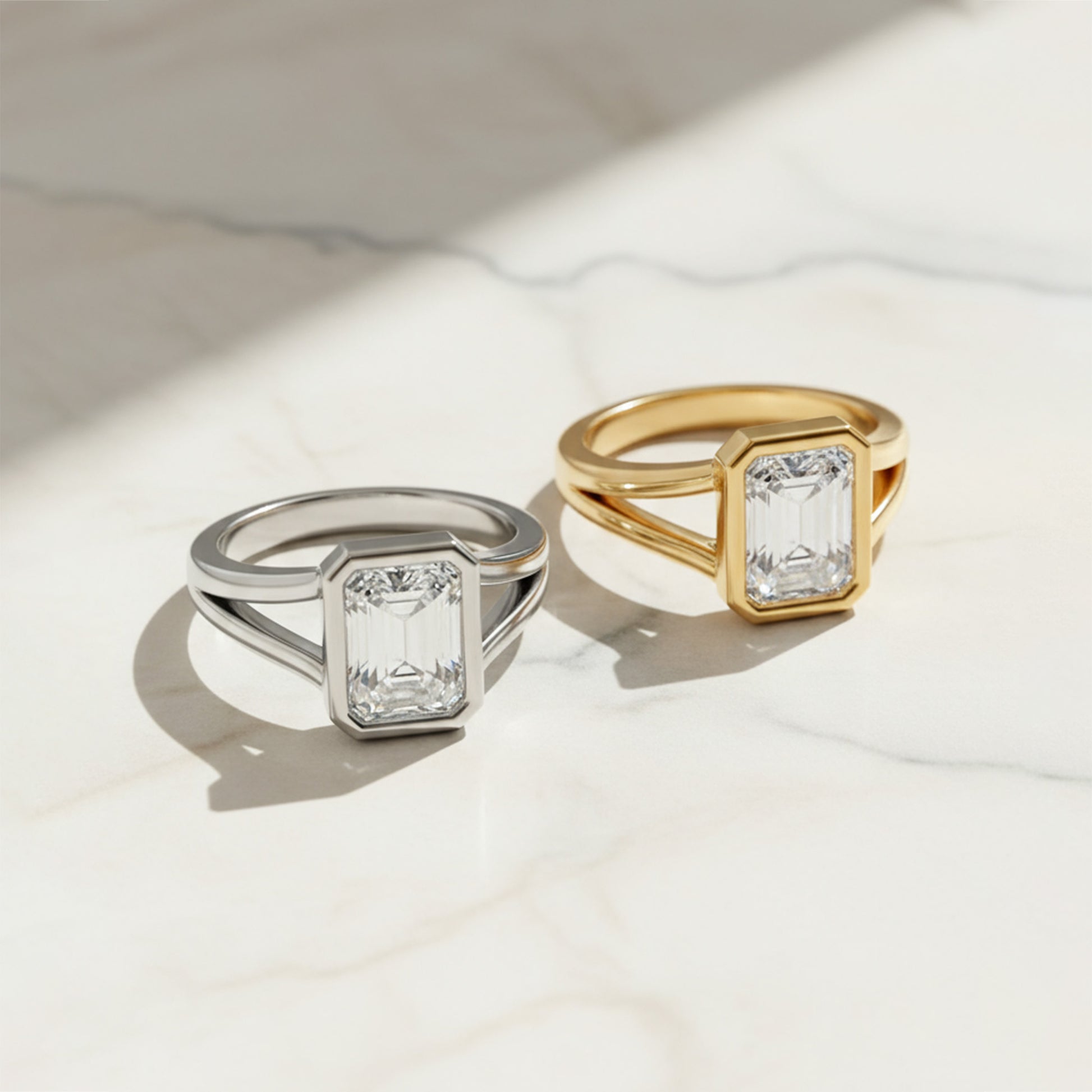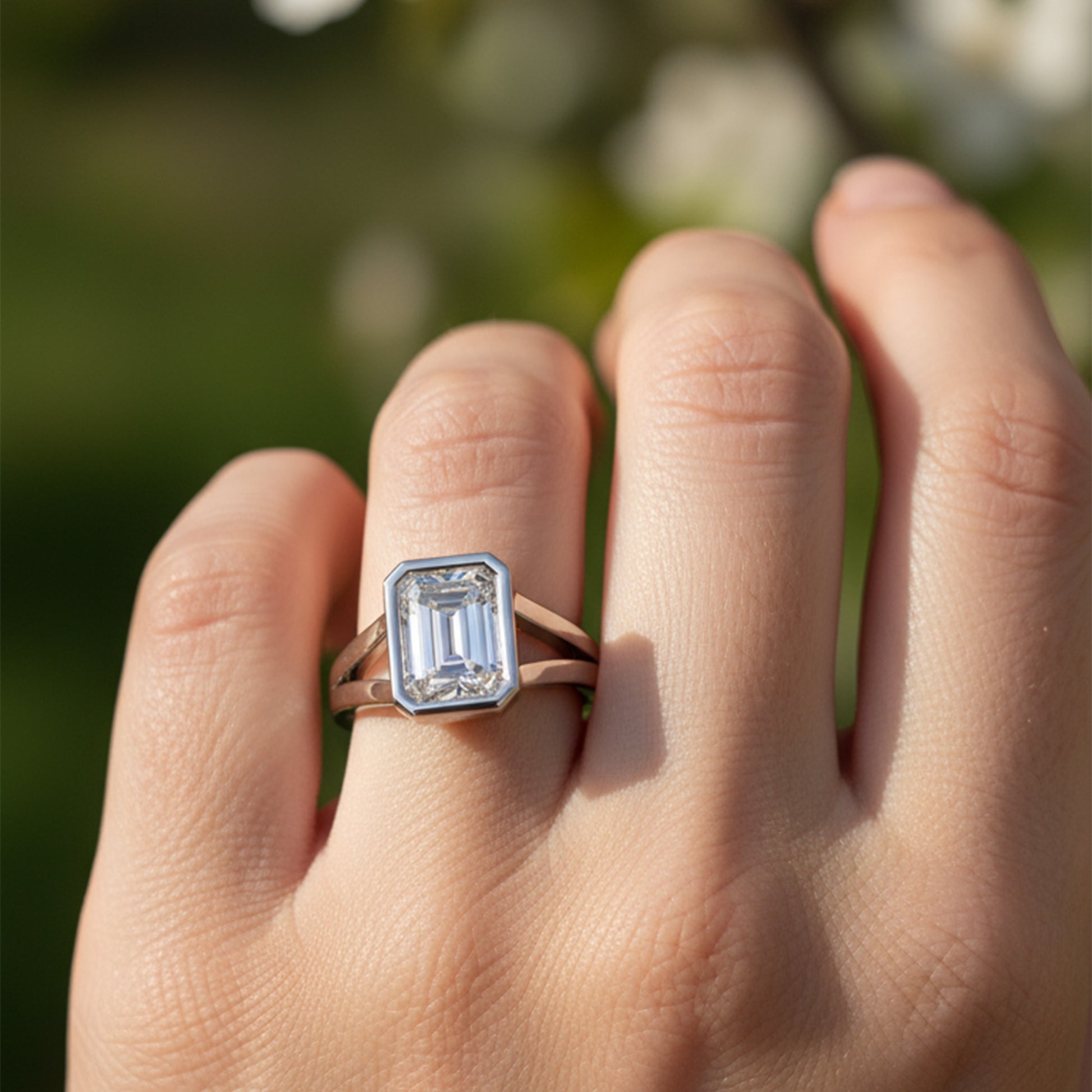 This stunning engagement ring features a dazzling diamond set in a sleek bezel, offering a modern and secure setting that enhances the stone's brilliance. The split shank design adds a touch of sophistication and elegance, creating a graceful flow that beautifully complements the center diamond. A perfect blend of contemporary style and timeless beauty, this ring is a true symbol of lasting love.