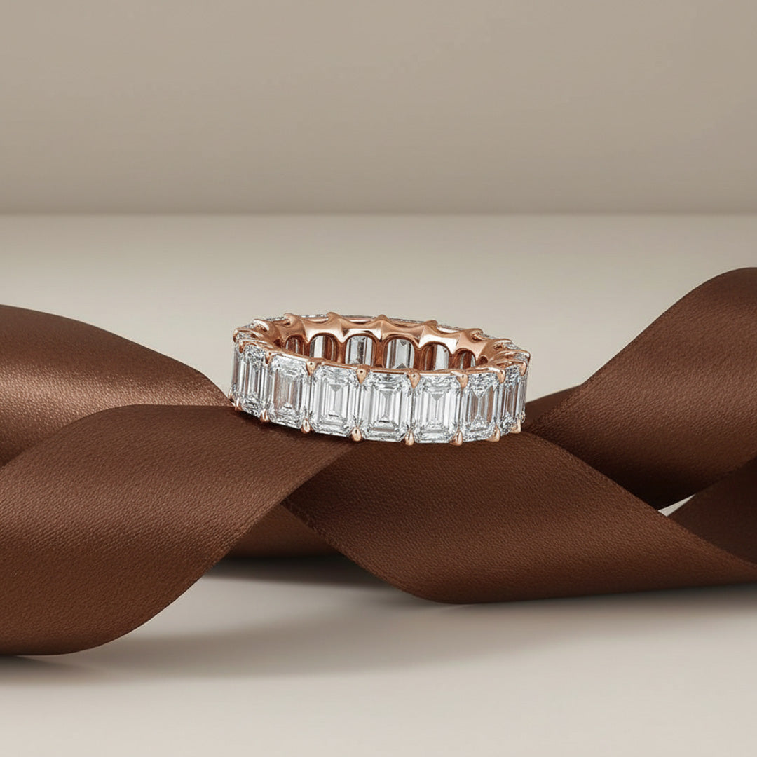 This eternity band features a seamless row of emerald-cut diamonds for a clean, timeless look. Elegant and sophisticated, it shines beautifully on its own or with any engagement ring.