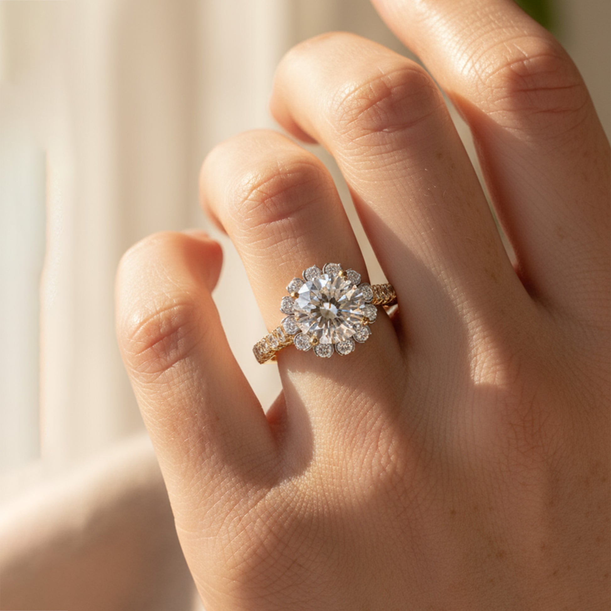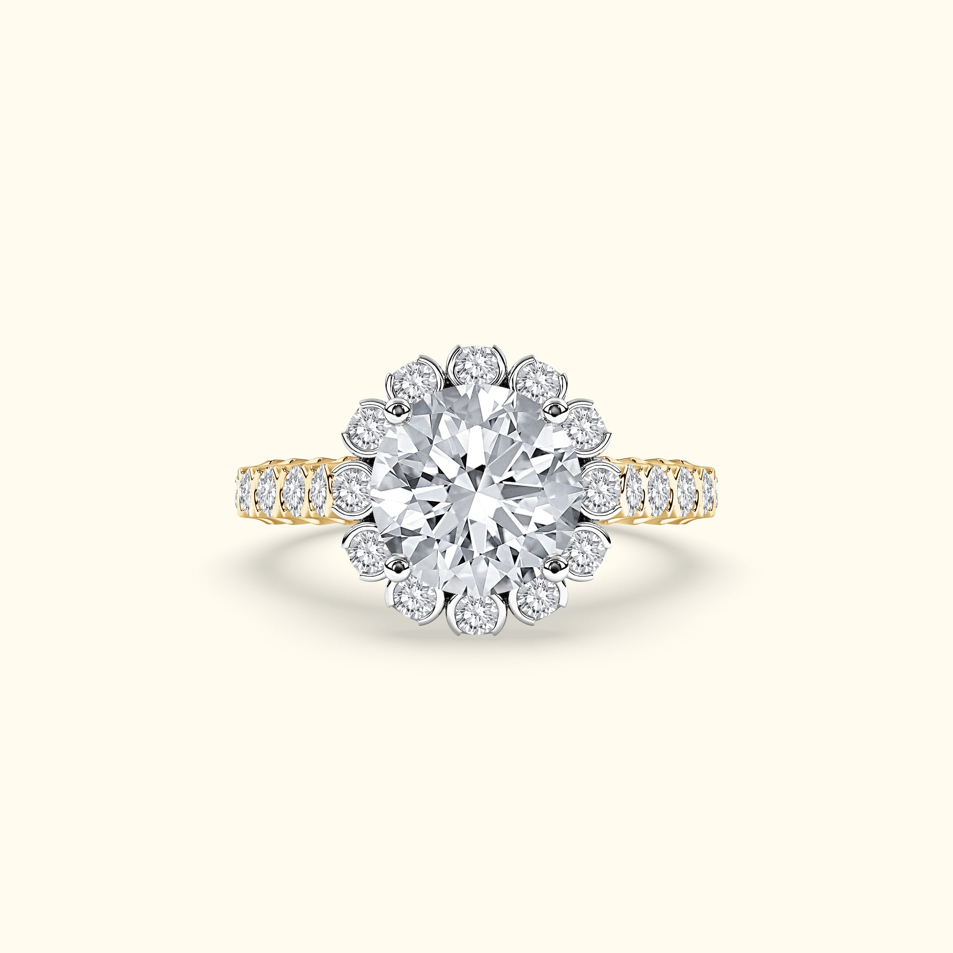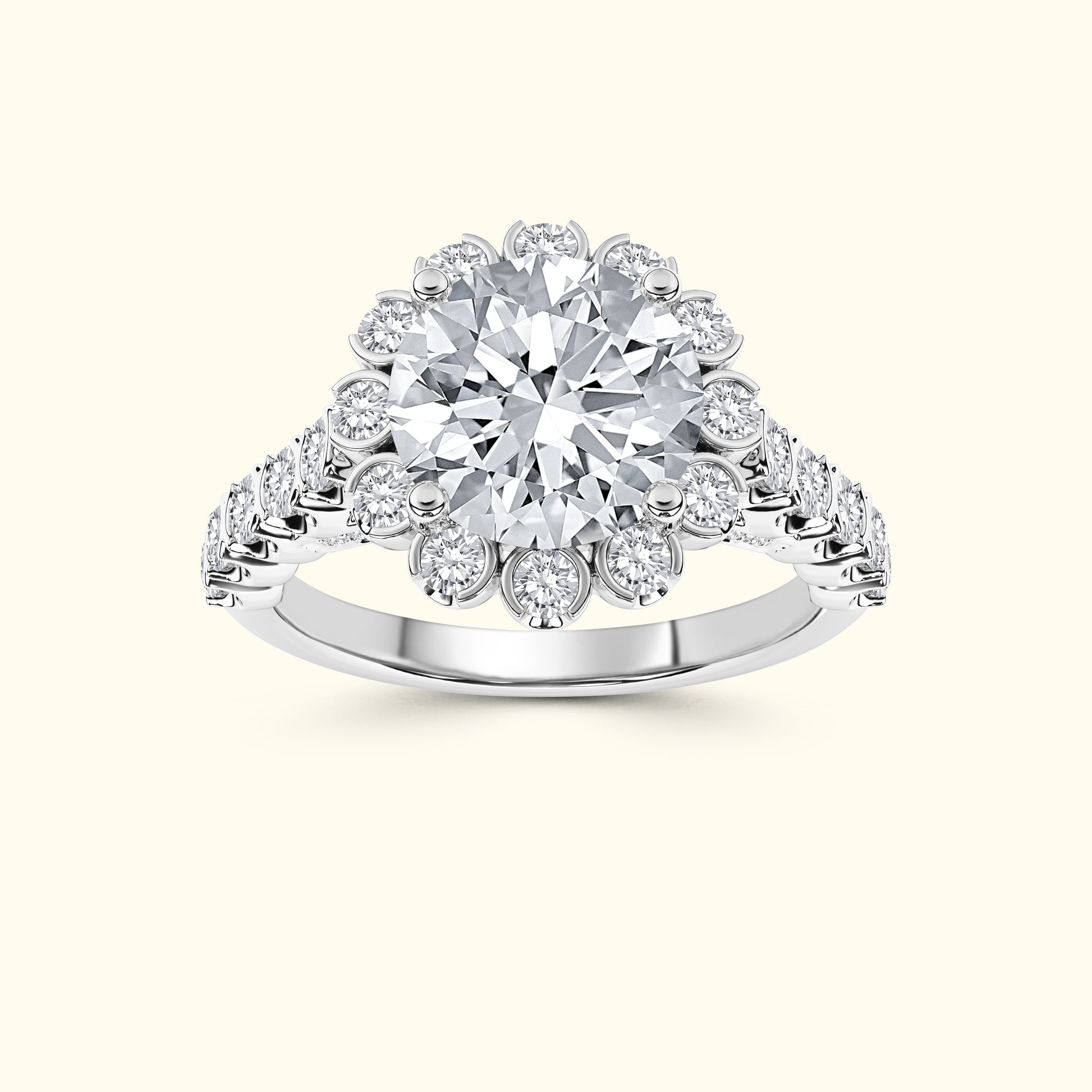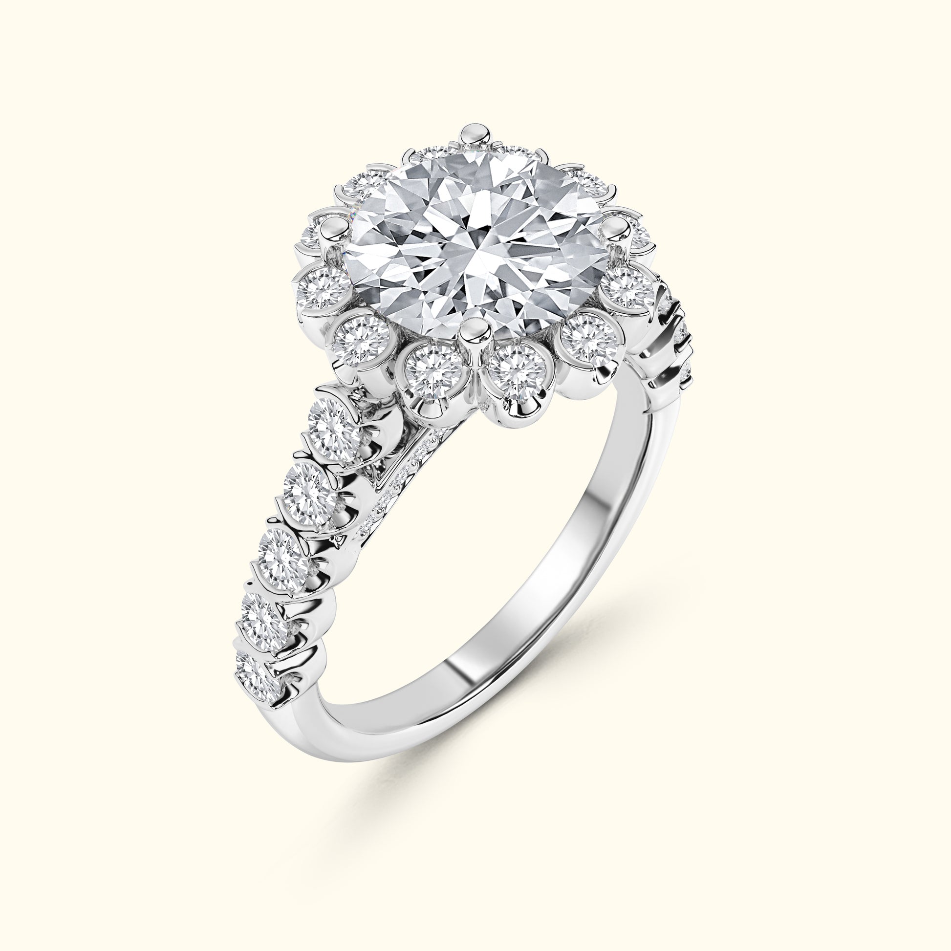 This stunning round engagement ring features a captivating flower-inspired design, with half bezel-set diamonds encircling the center stone. The delicate diamond accents continue down the shank, adding brilliance and elegance to the timeless design. A perfect symbol of love and commitment.