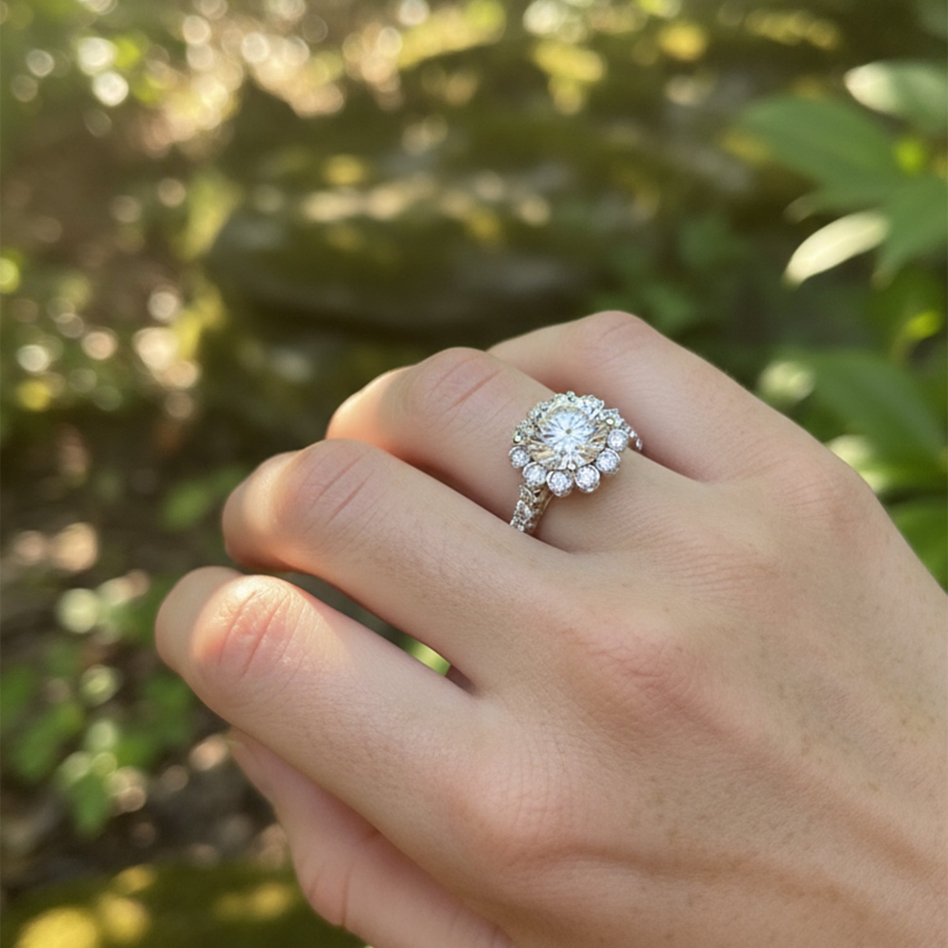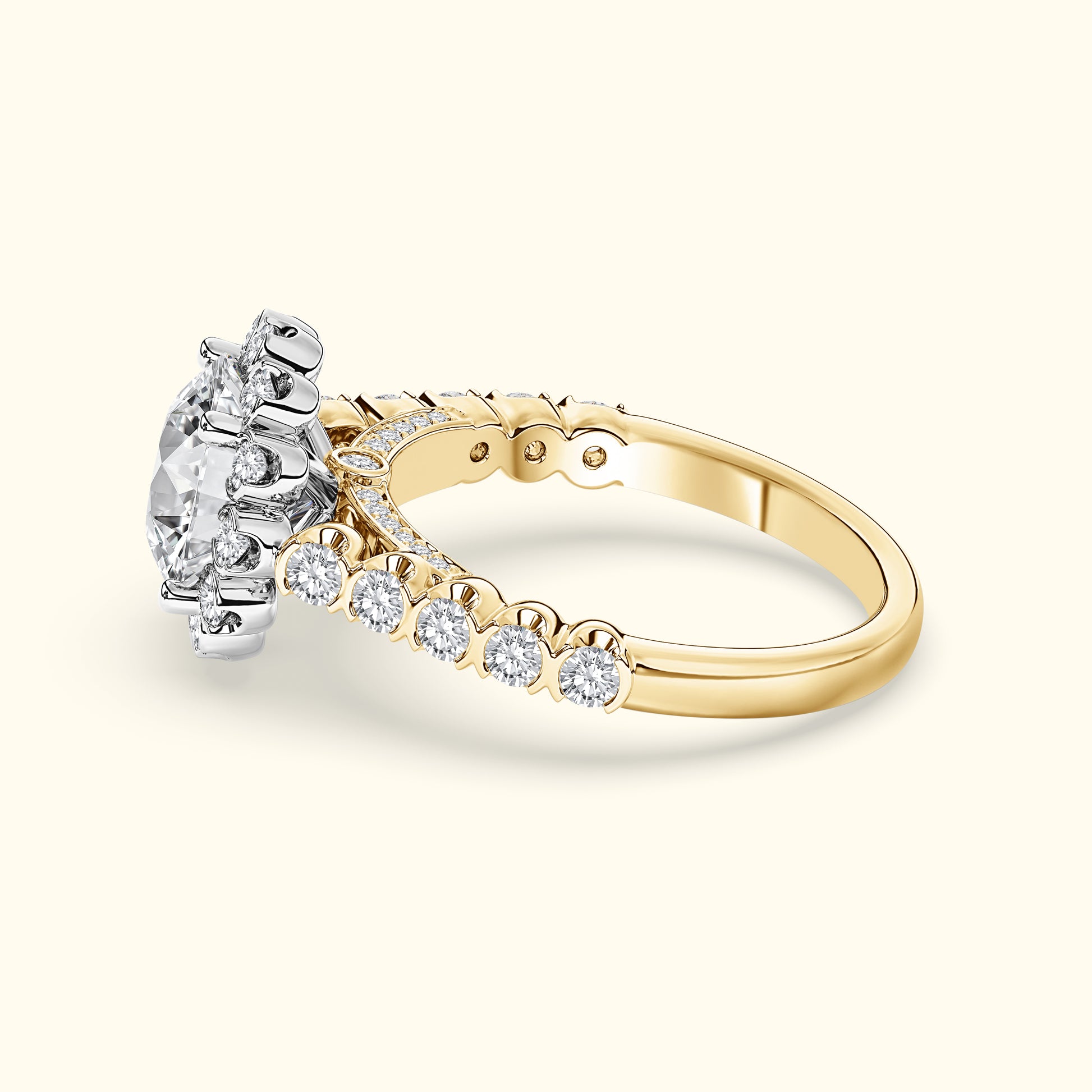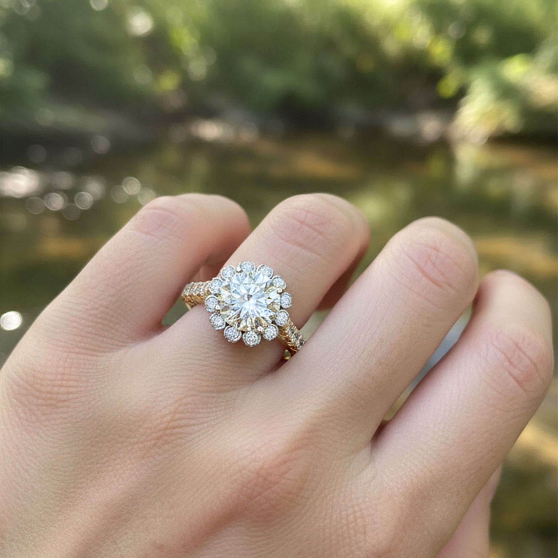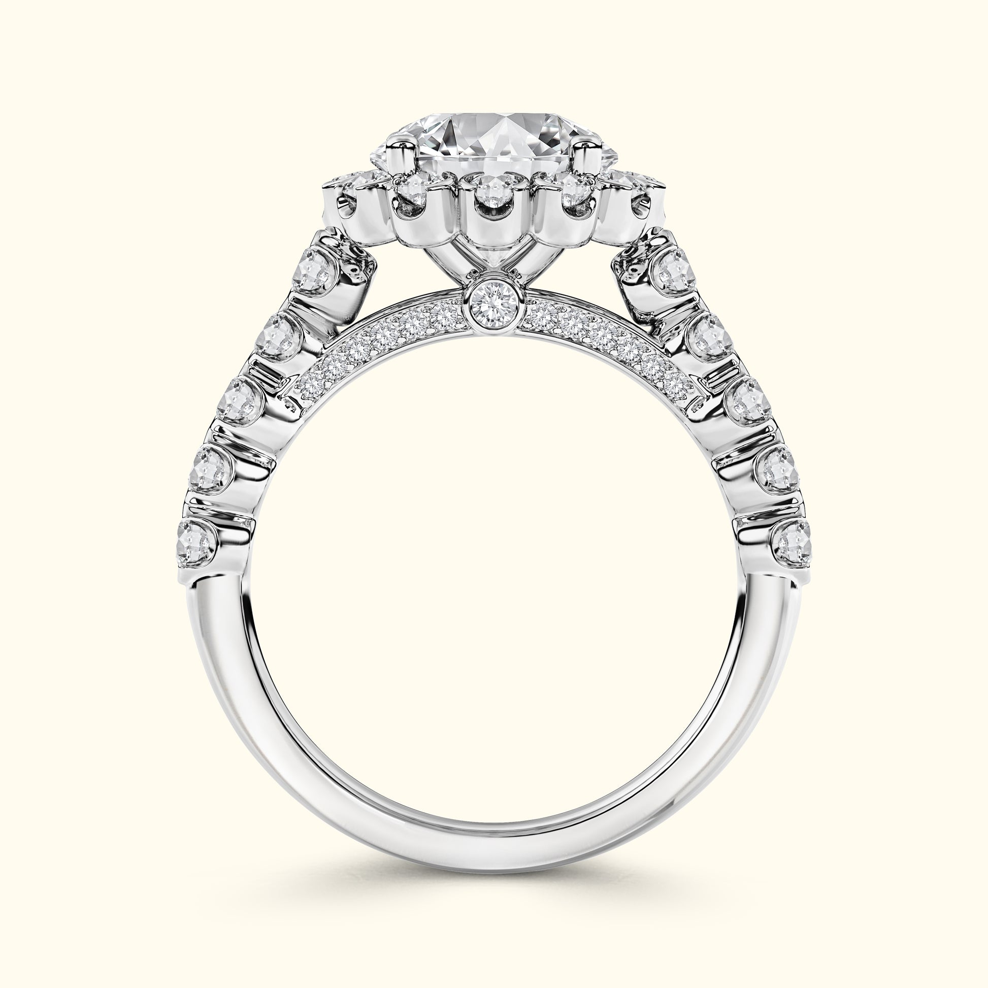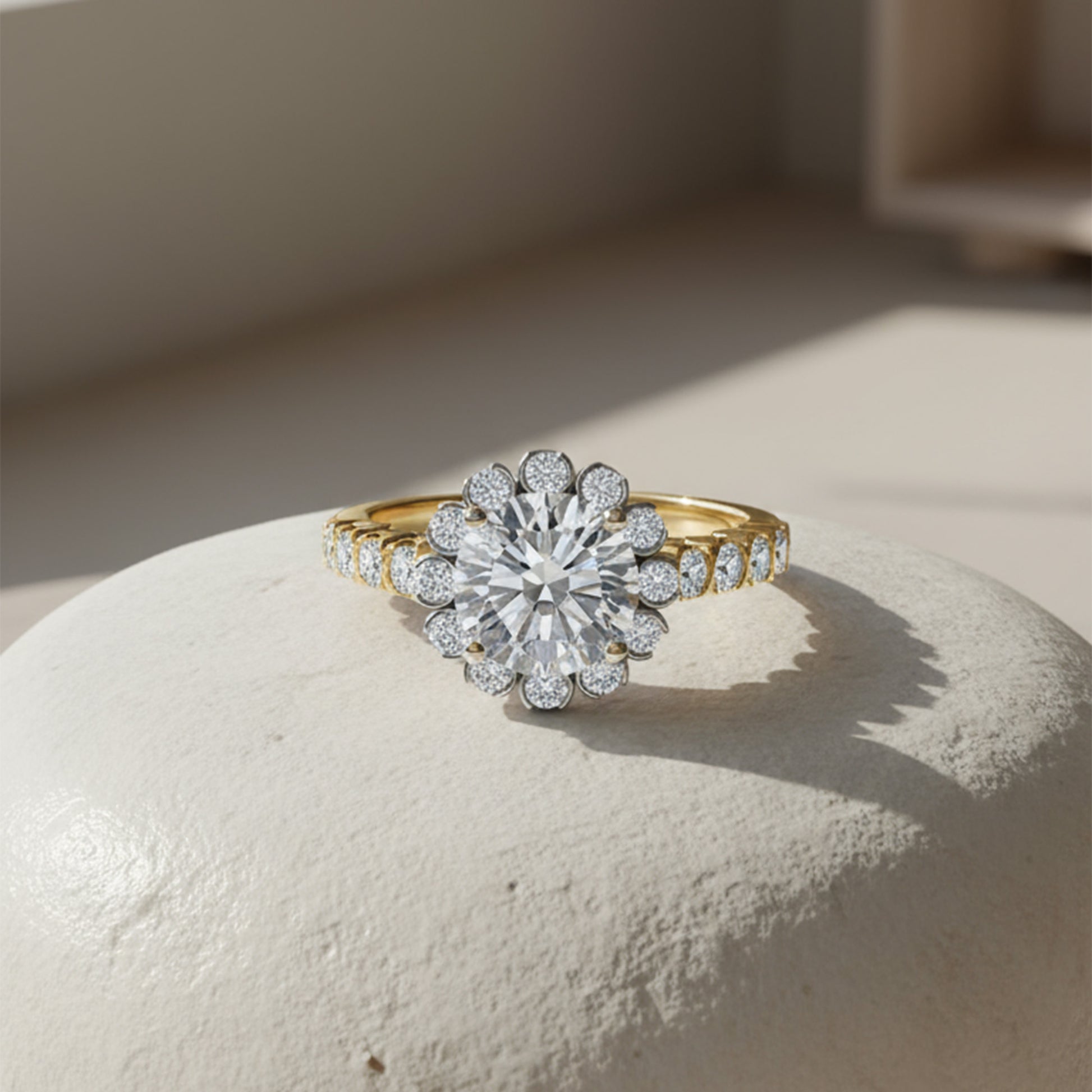 This stunning round engagement ring features a captivating flower-inspired design, with half bezel-set diamonds encircling the center stone. The delicate diamond accents continue down the shank, adding brilliance and elegance to the timeless design. A perfect symbol of love and commitment.