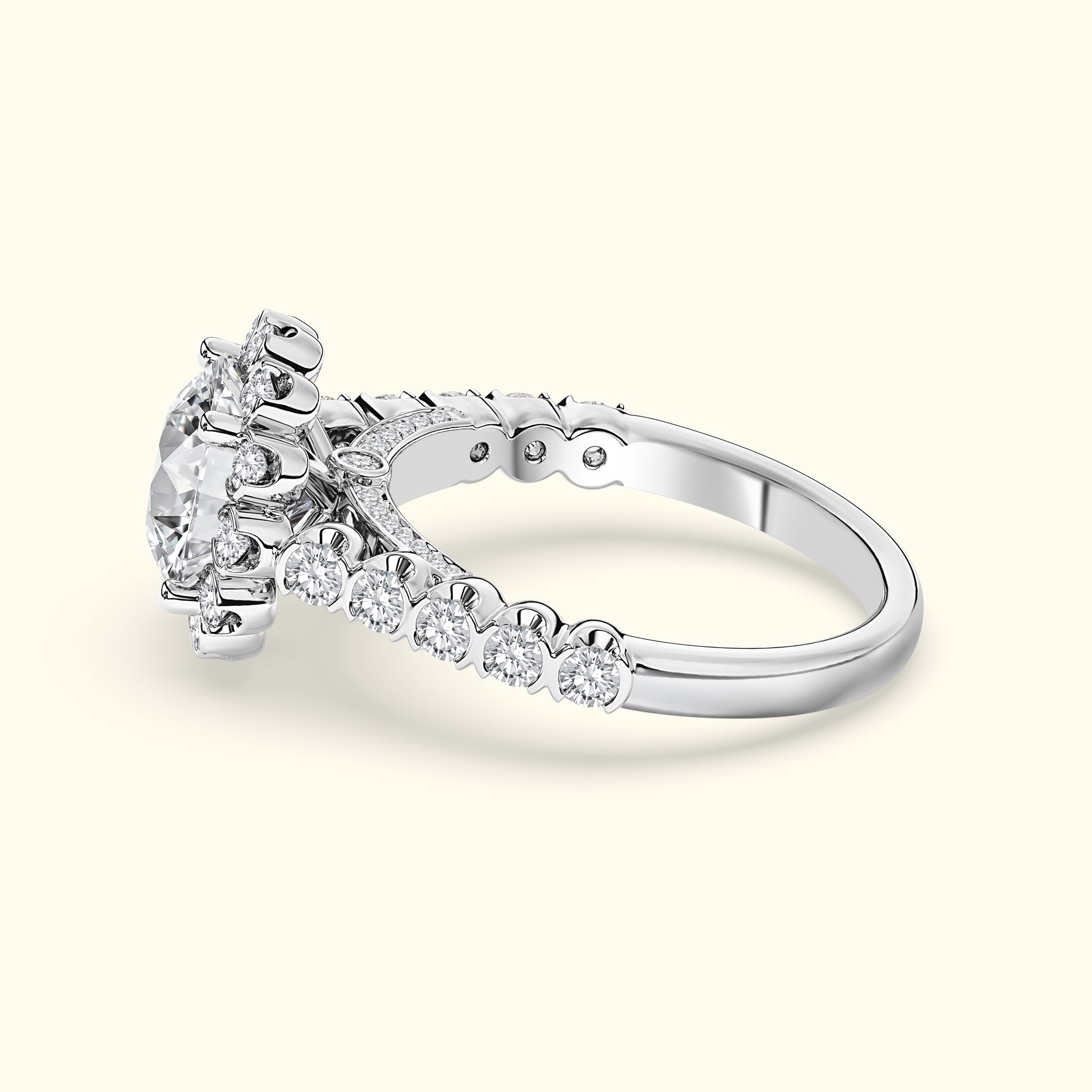 This stunning round engagement ring features a captivating flower-inspired design, with half bezel-set diam... Show more