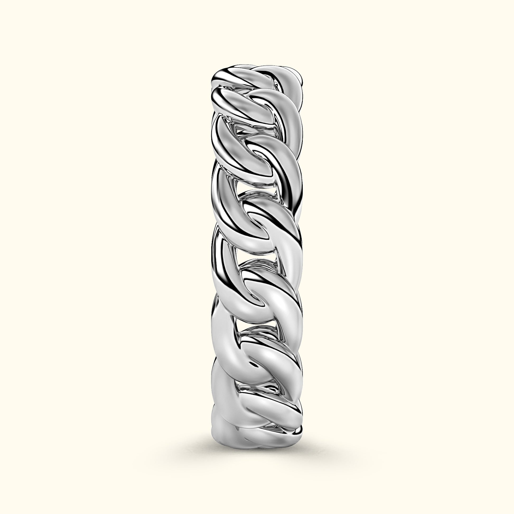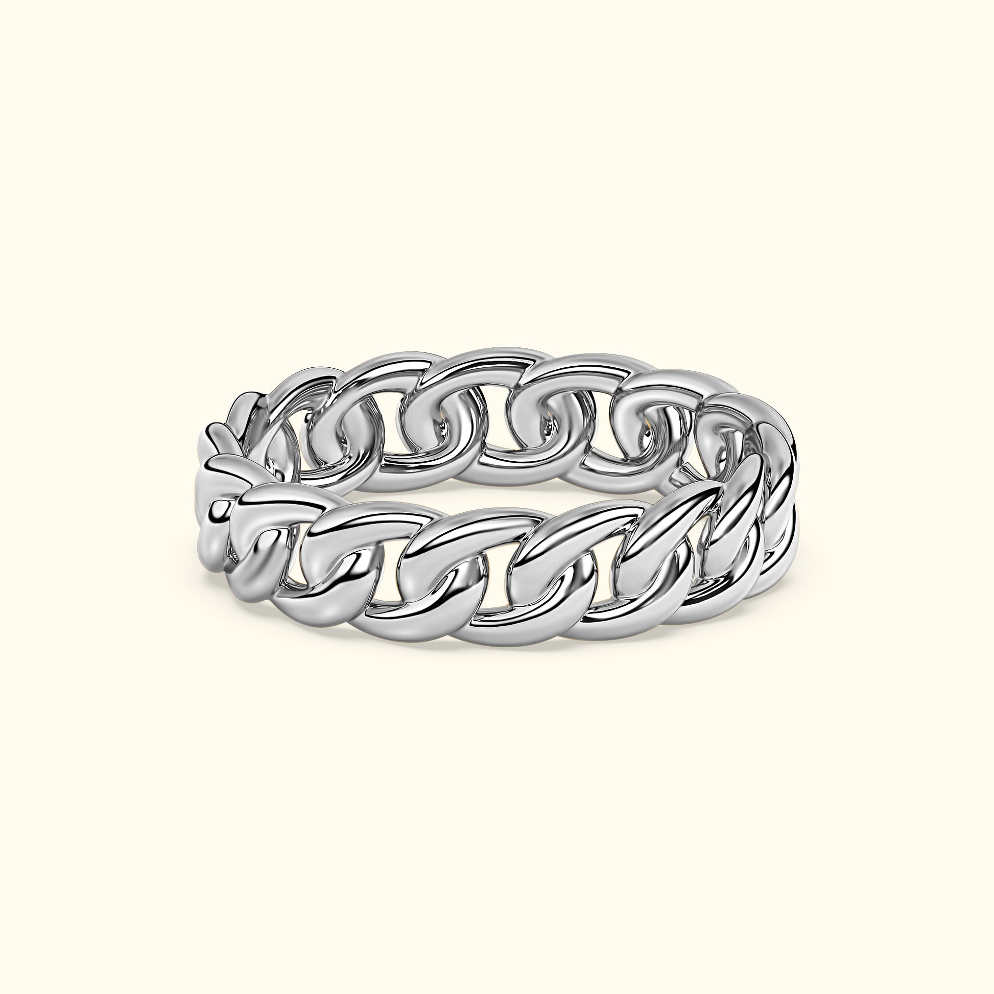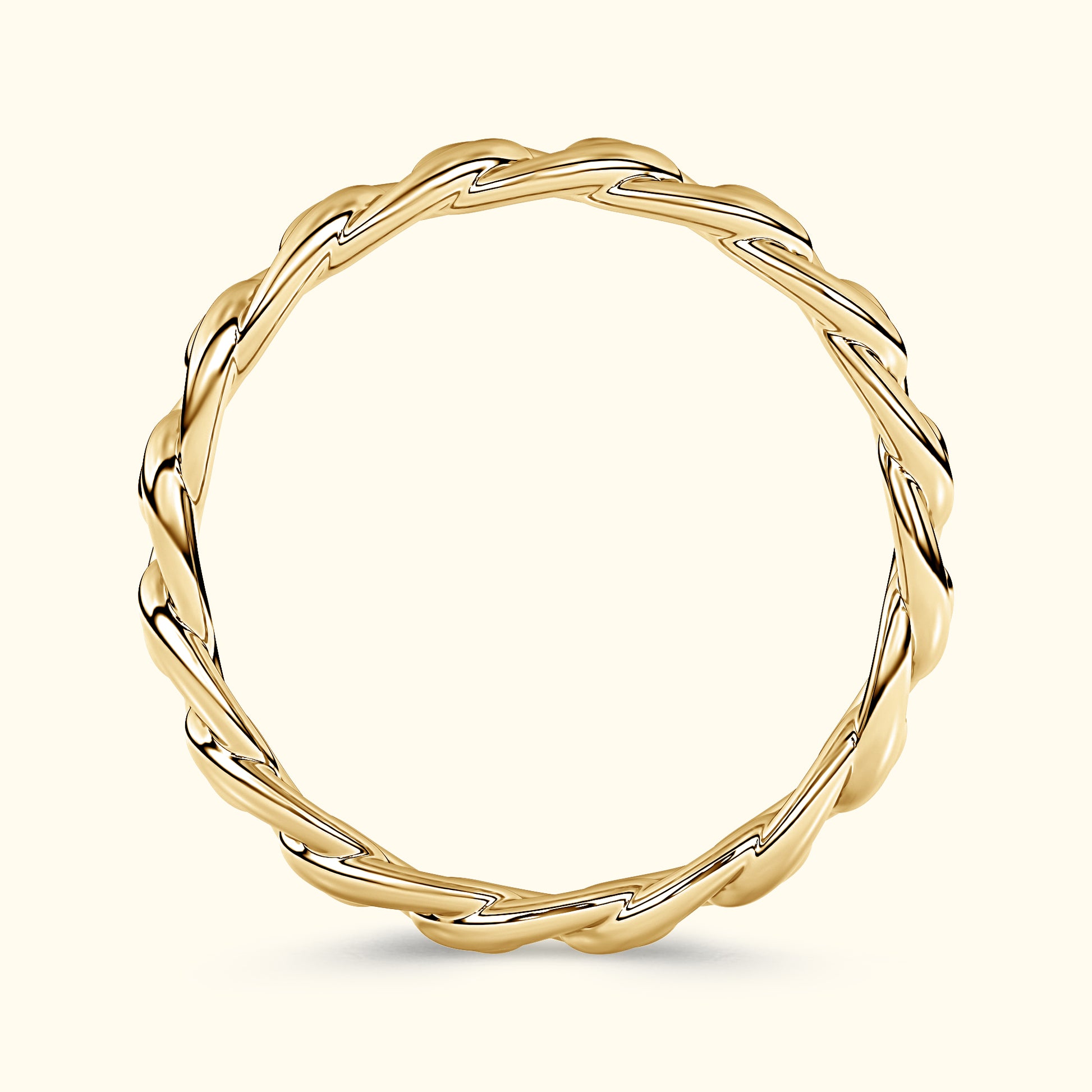 This elegant band features an interwoven braid design symbolizing unity and timeless connection. Smooth links and a high-polish finish create a seamless, sculptural look that catches the light beautifully.