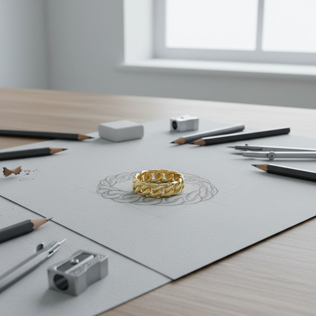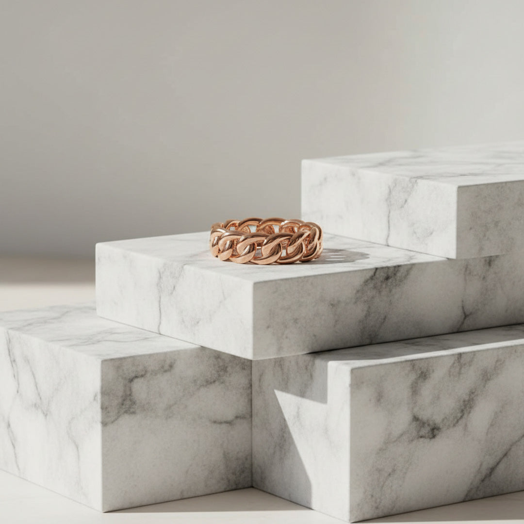 This elegant band features an interwoven braid design symbolizing unity, with smooth links and a high-polish finish that catch the light beautifully.