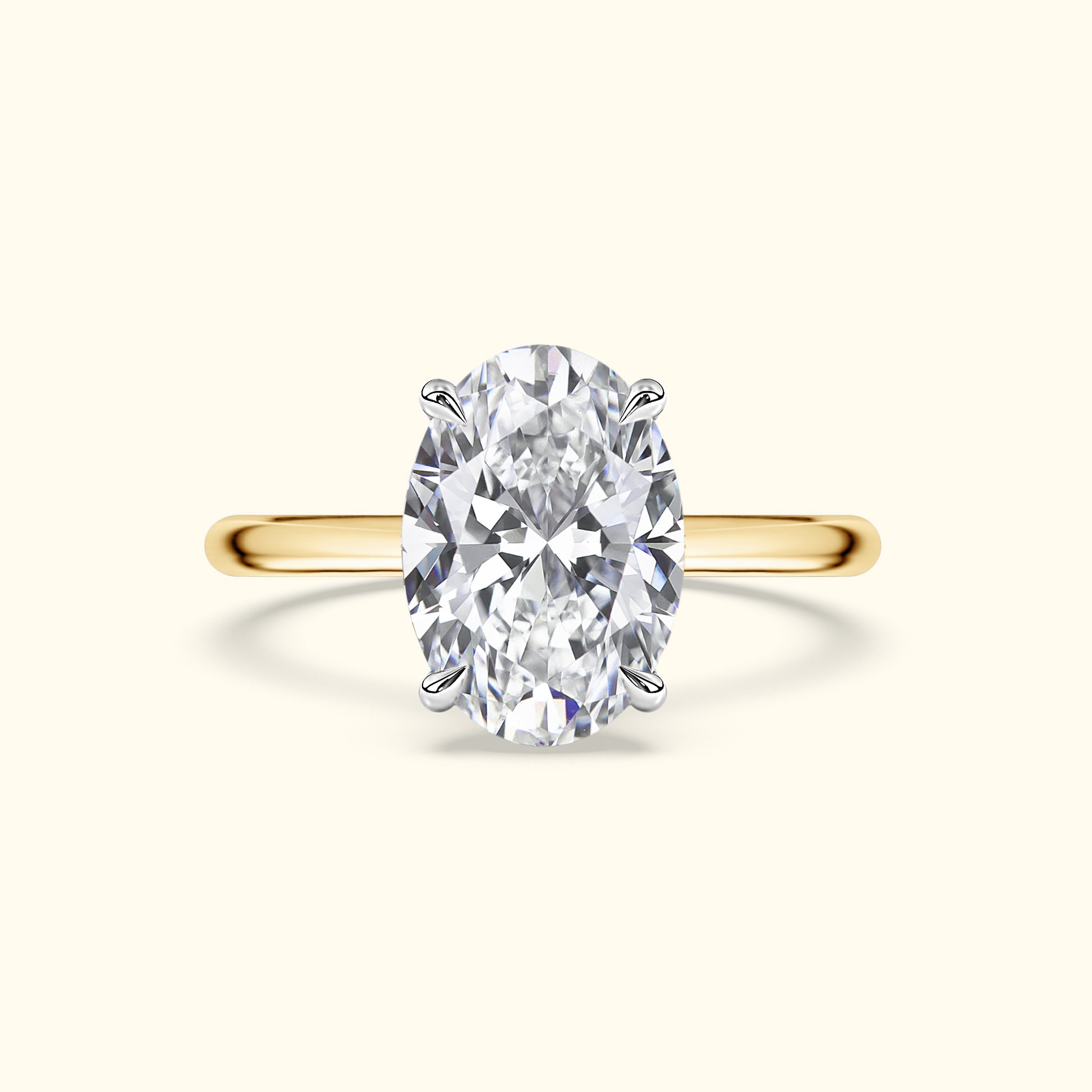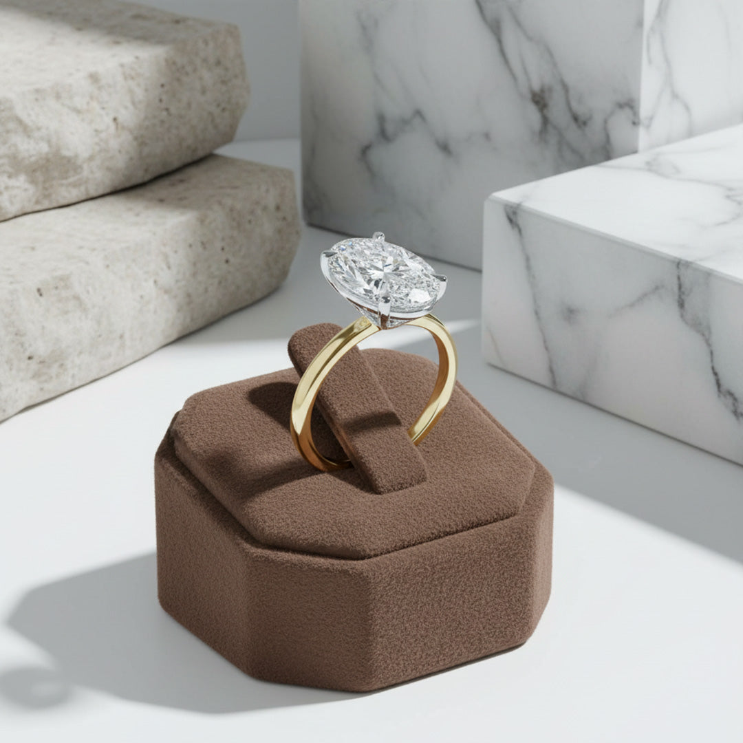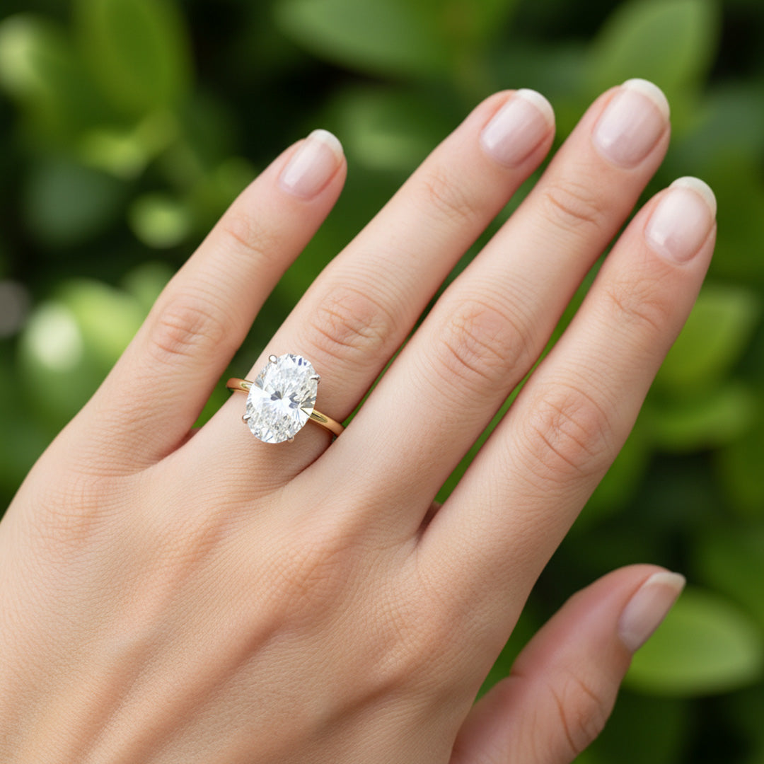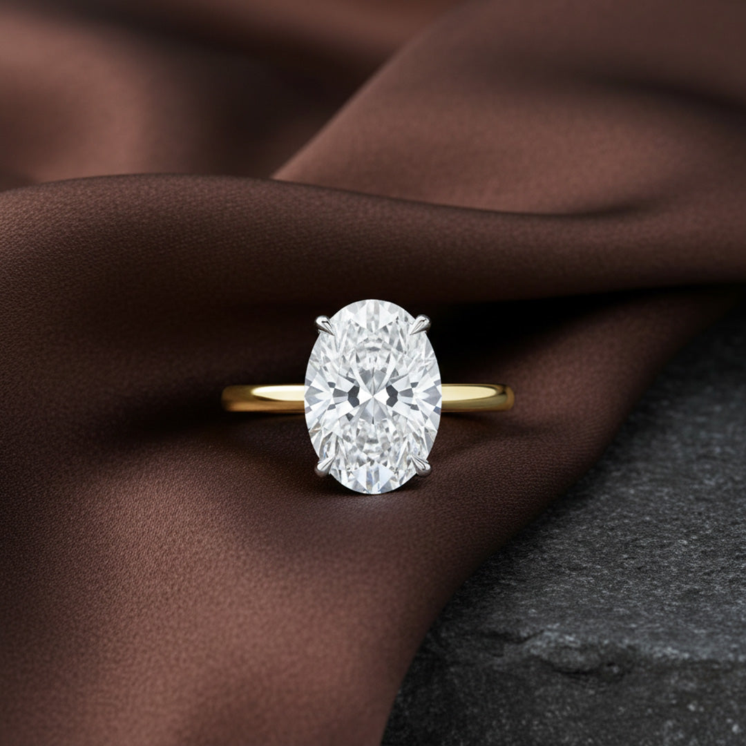 A timeless oval-cut diamond set on a sleek yellow gold band. Elegant, classic, and designed to shine from every angle.