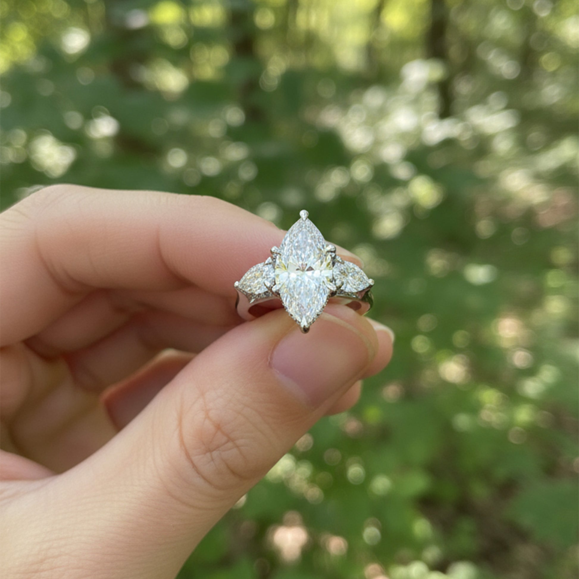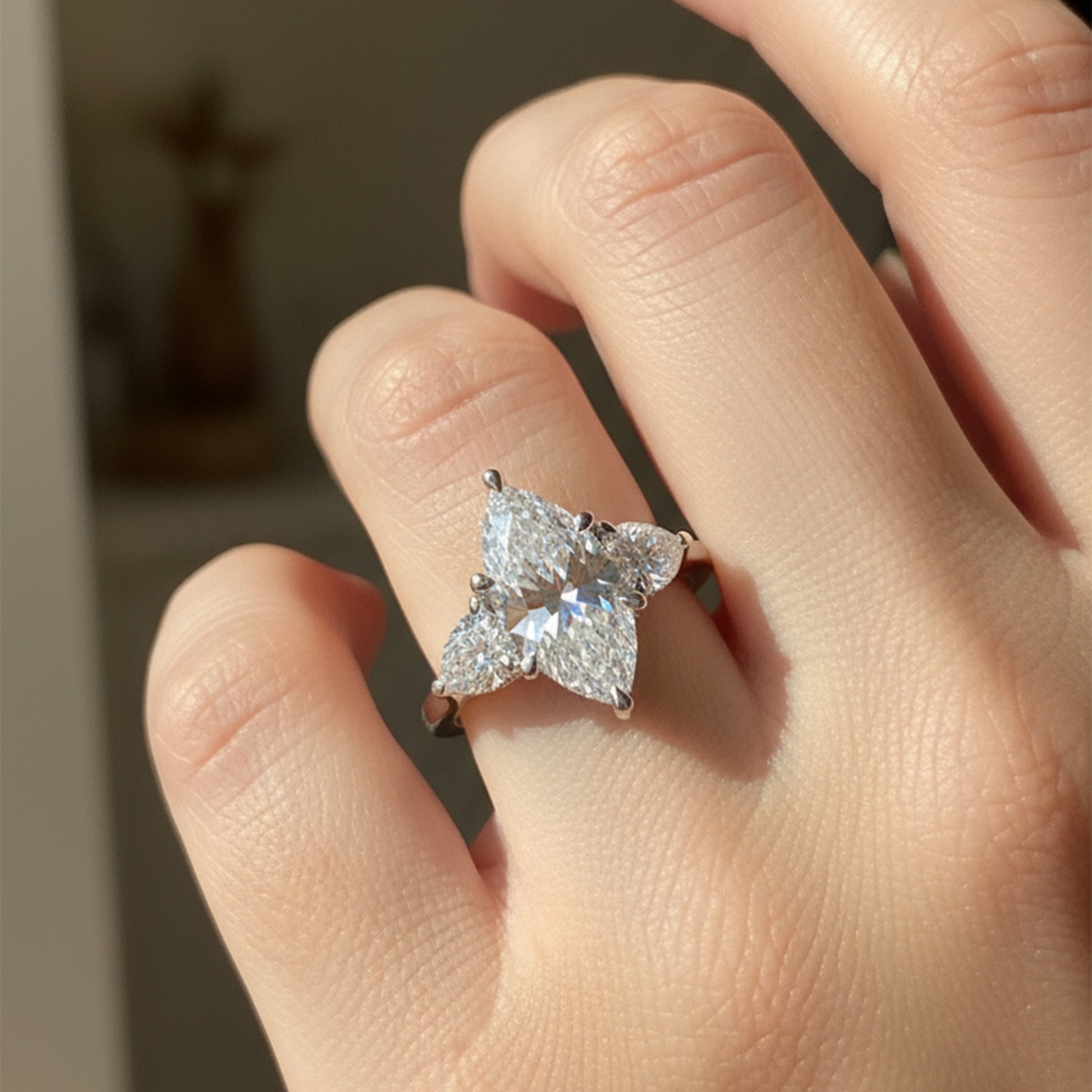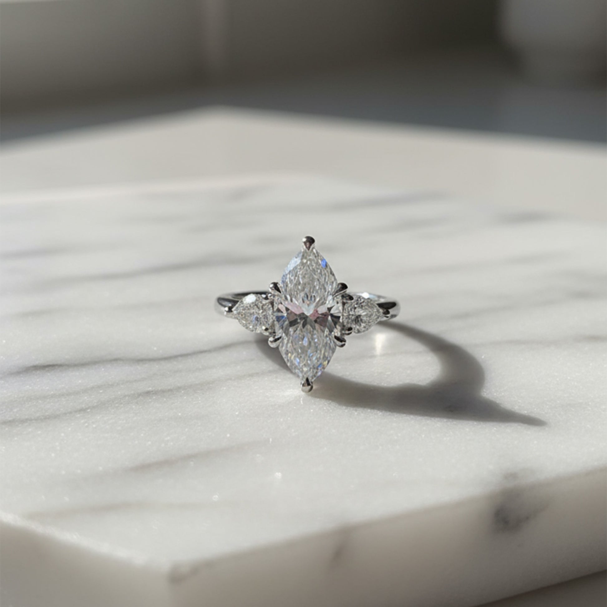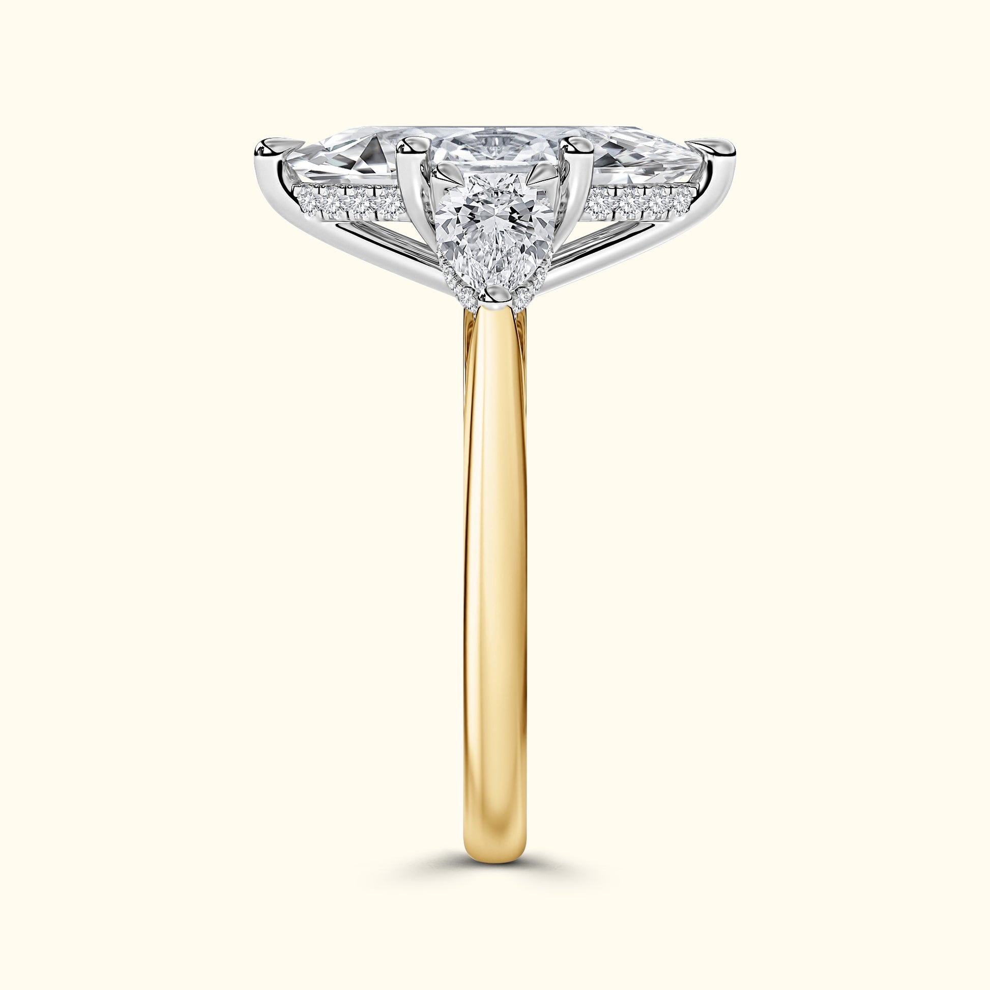 This three-stone engagement ring features a dazzling marquise center stone, accentuated by pear-shaped diamonds and a delicate underhalo that sparkles softly from below. Set on a refined solitaire band, it’s a symbol of love that feels both classic and uniquely personal.