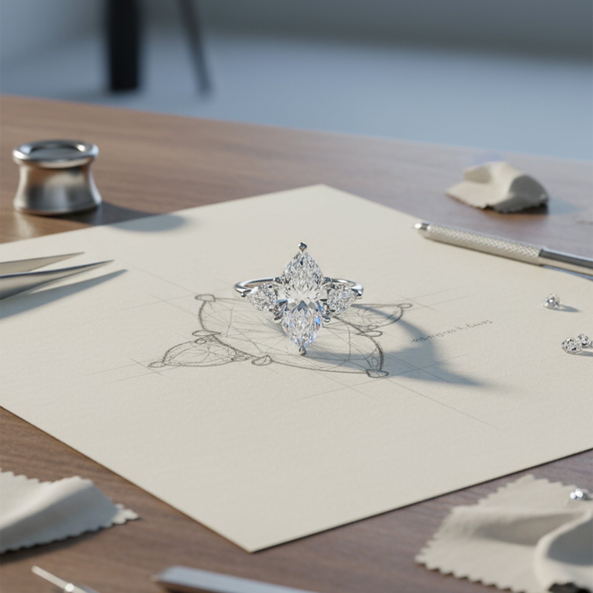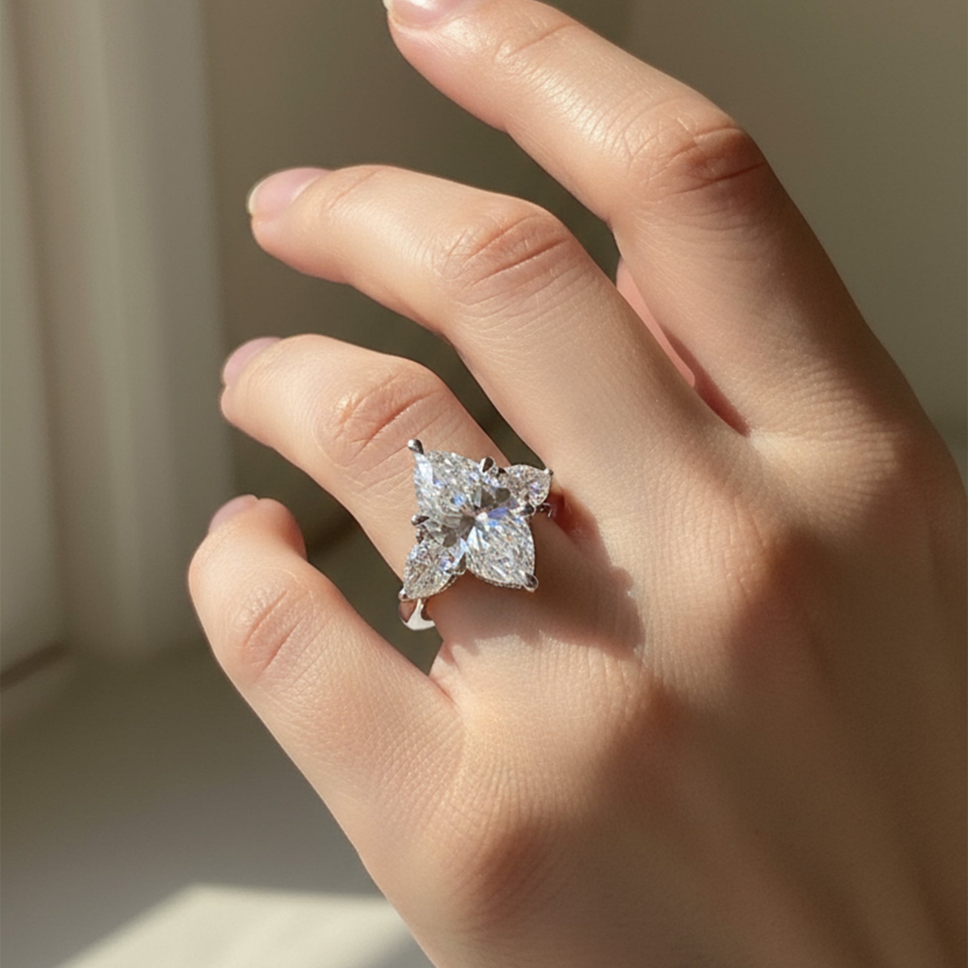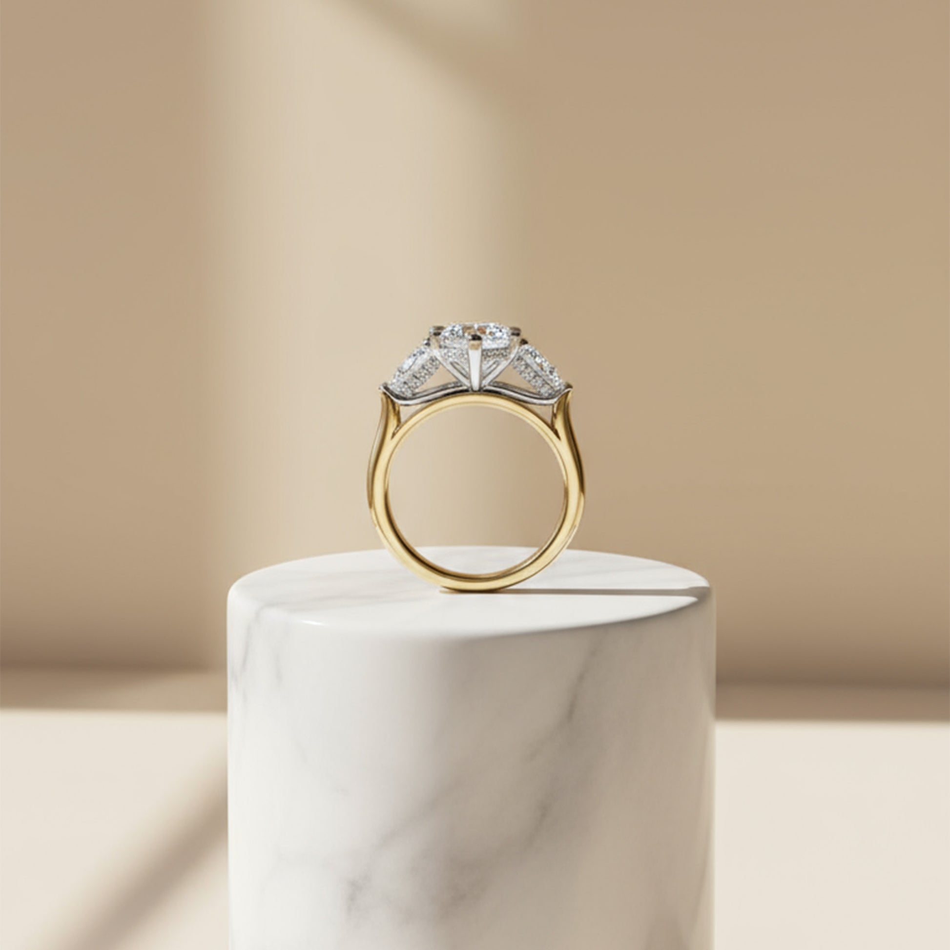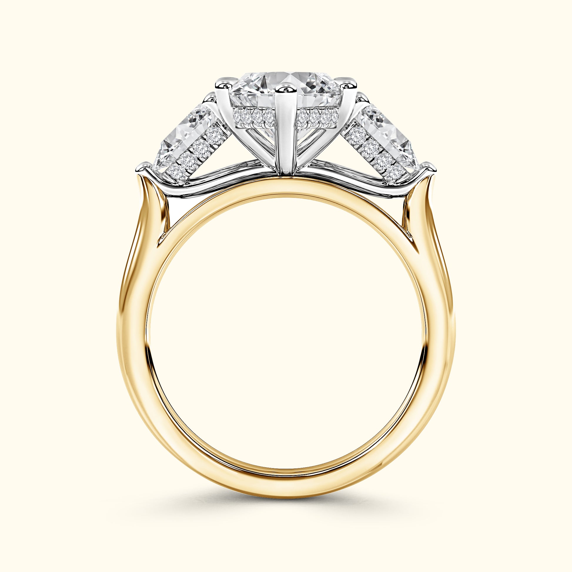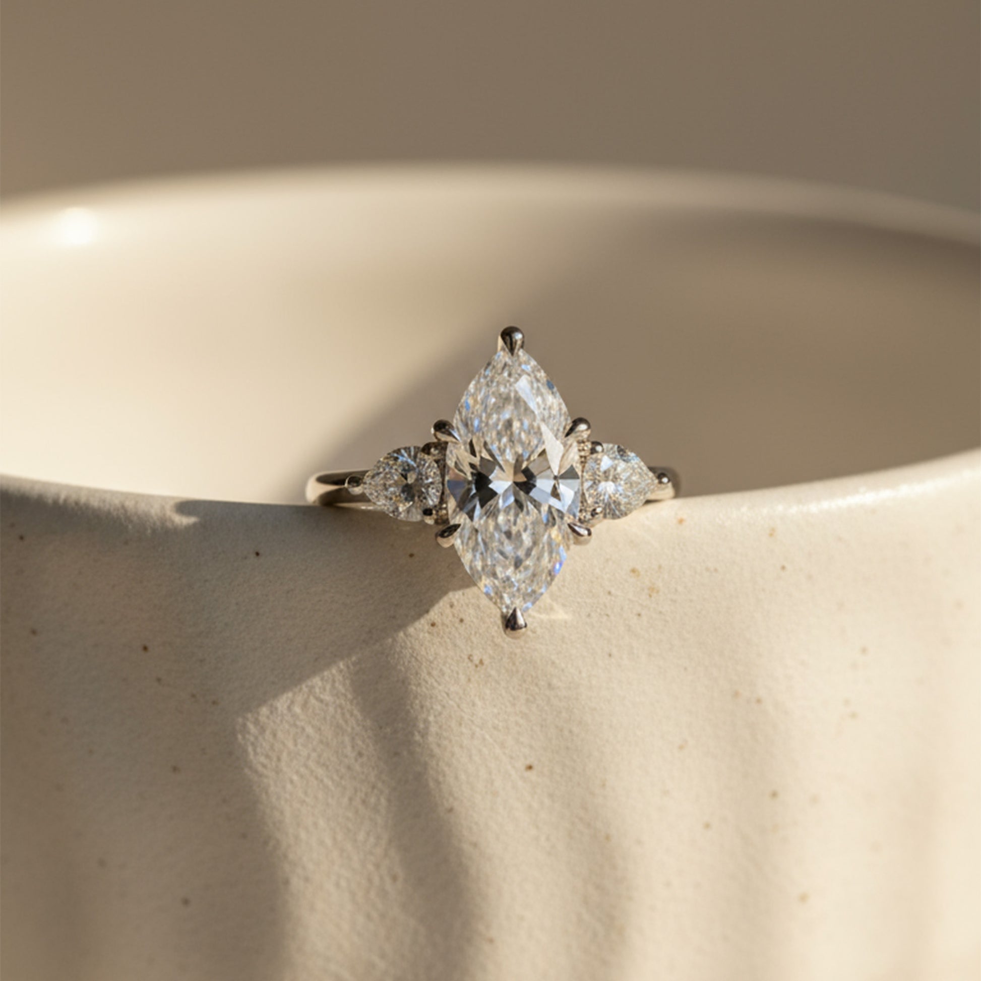 This three-stone engagement ring features a dazzling marquise center stone, accentuated by pear-shaped diamonds and a delicate underhalo that sparkles softly from below. Set on a refined solitaire band, it’s a symbol of love that feels both classic and uniquely personal.