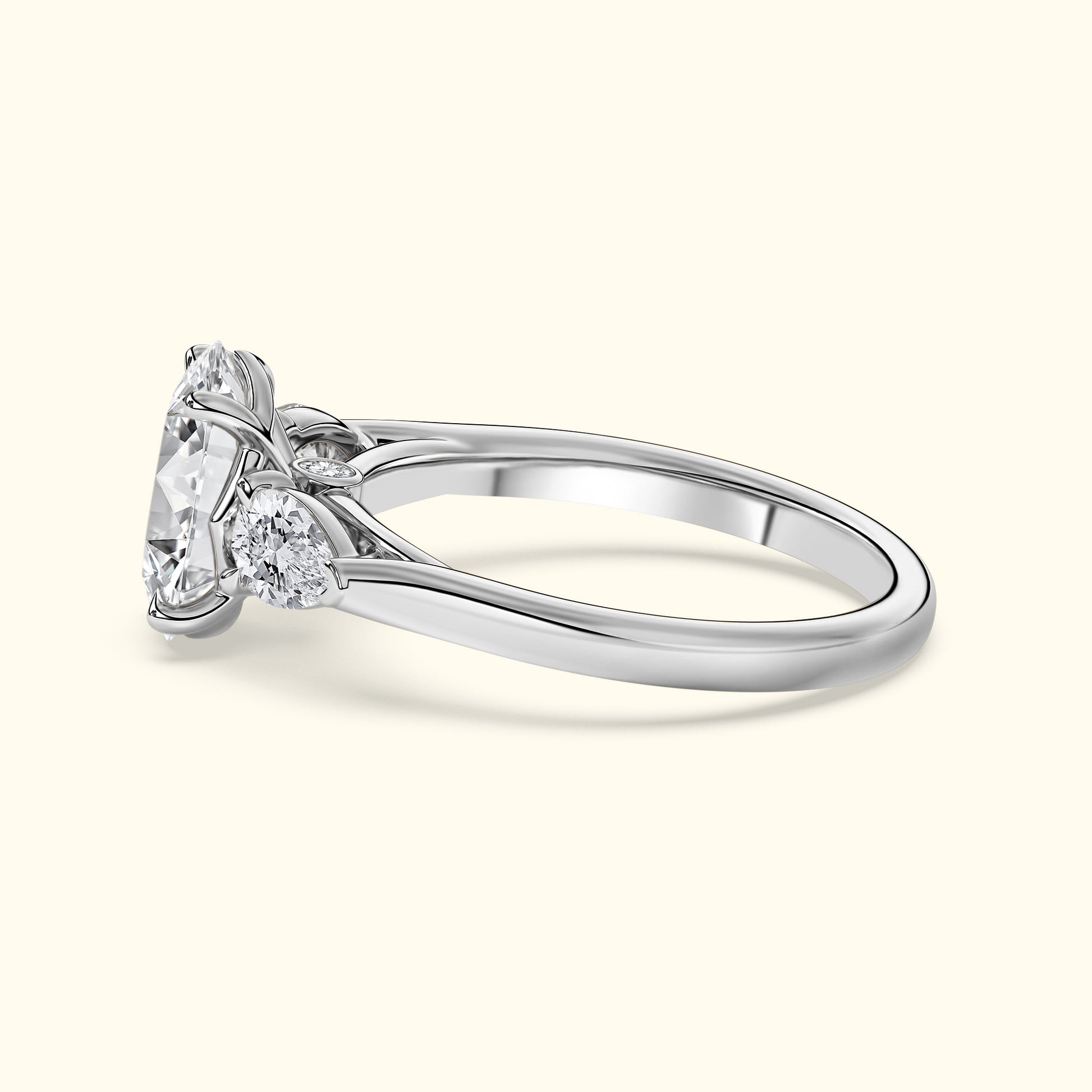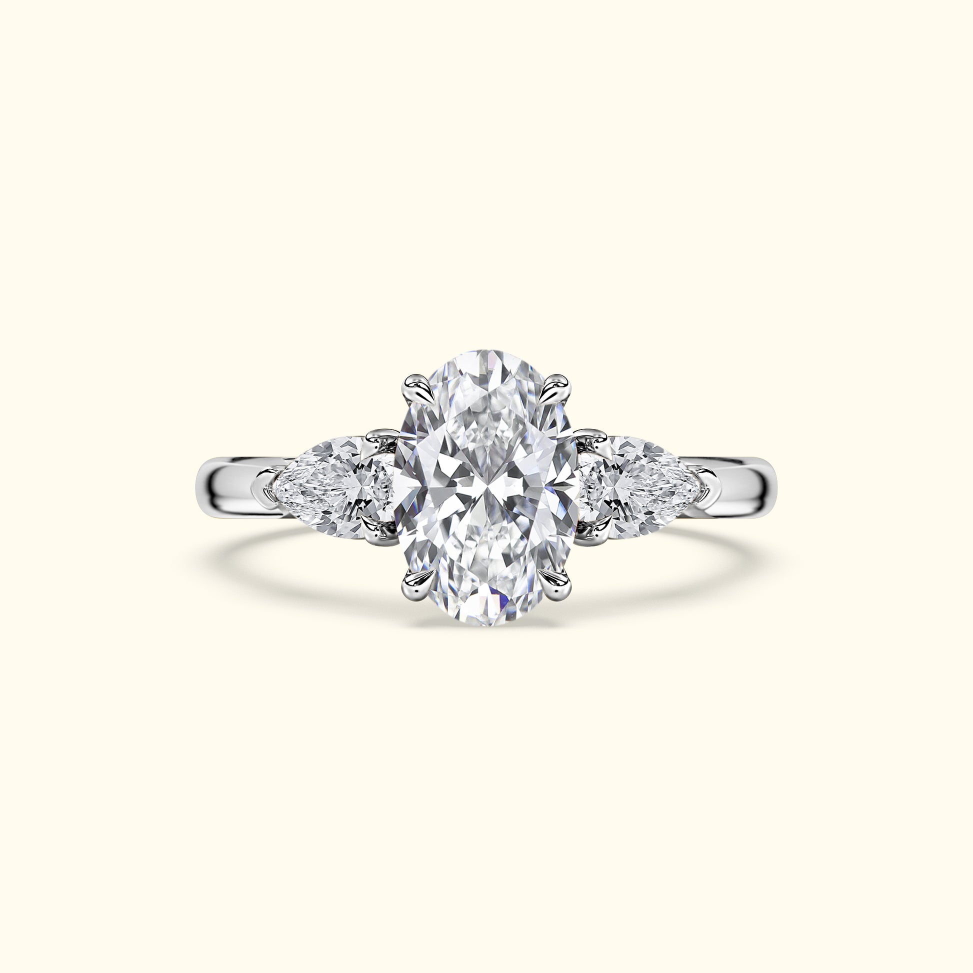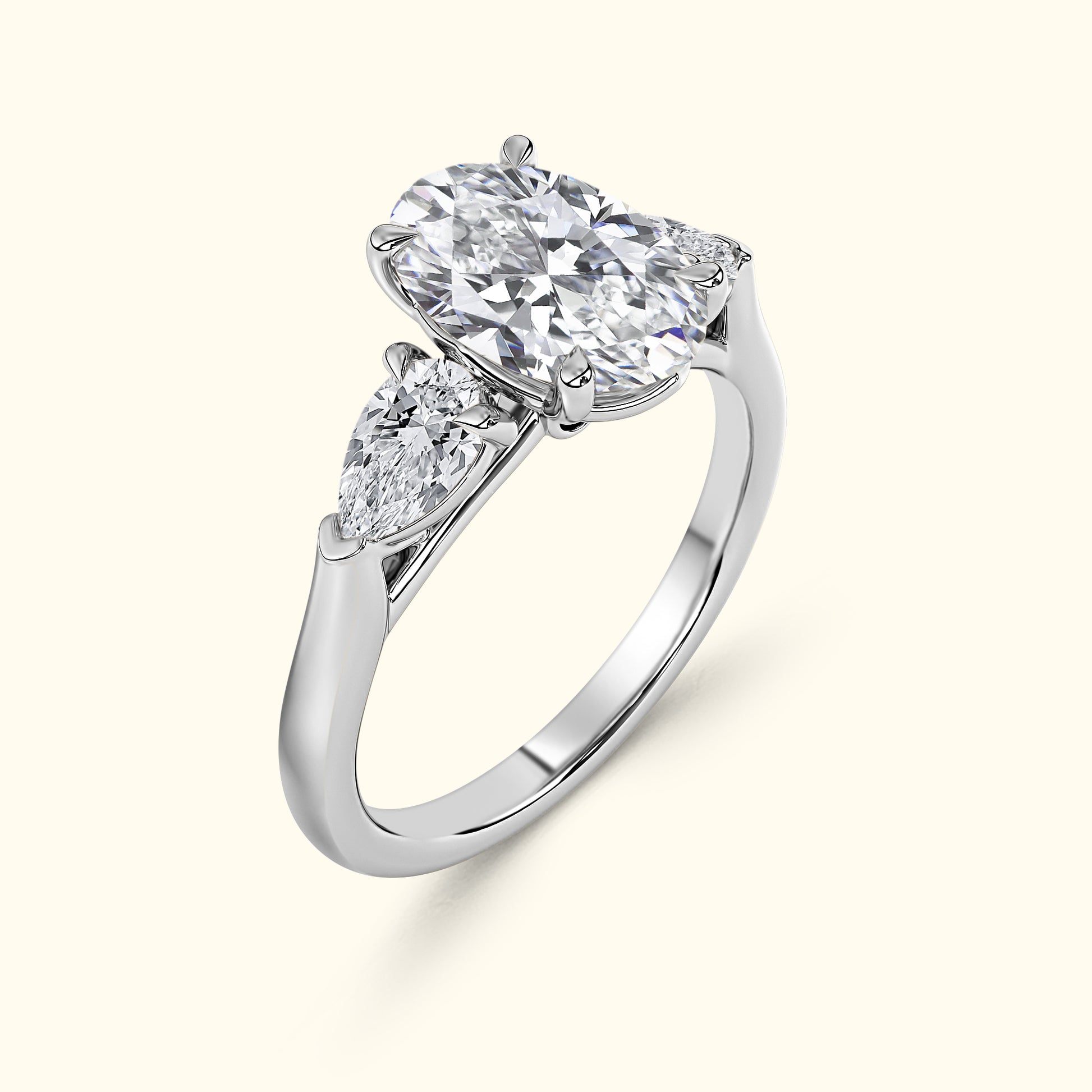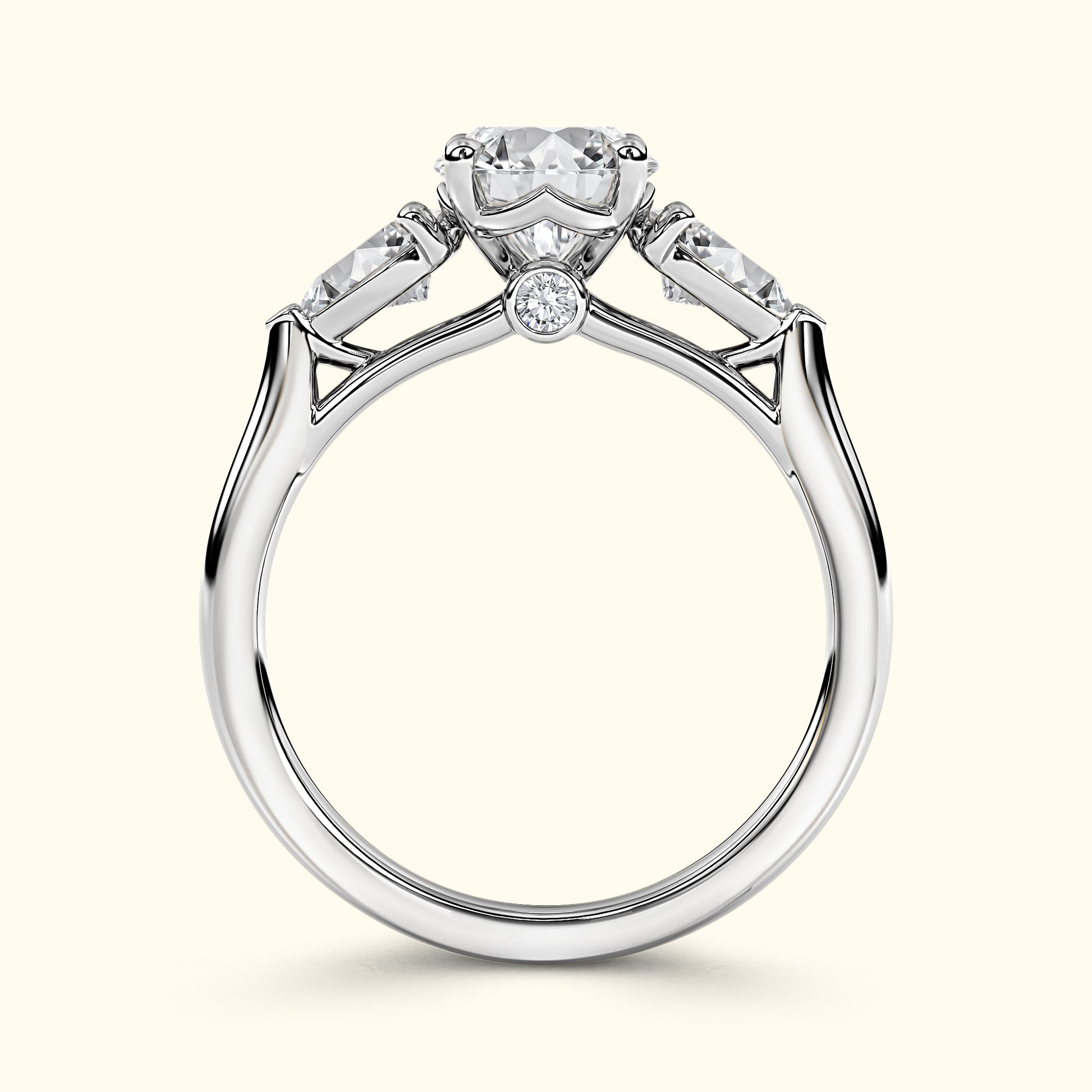 This elegant three-stone engagement ring showcases a stunning oval center diamond flanked by pear-shaped side stones, symbolizing your past, present, and future. Set in a graceful cathedral design with a subtle peekaboo diamond for added sparkle, it beautifully balances timeless romance and modern sophistication.