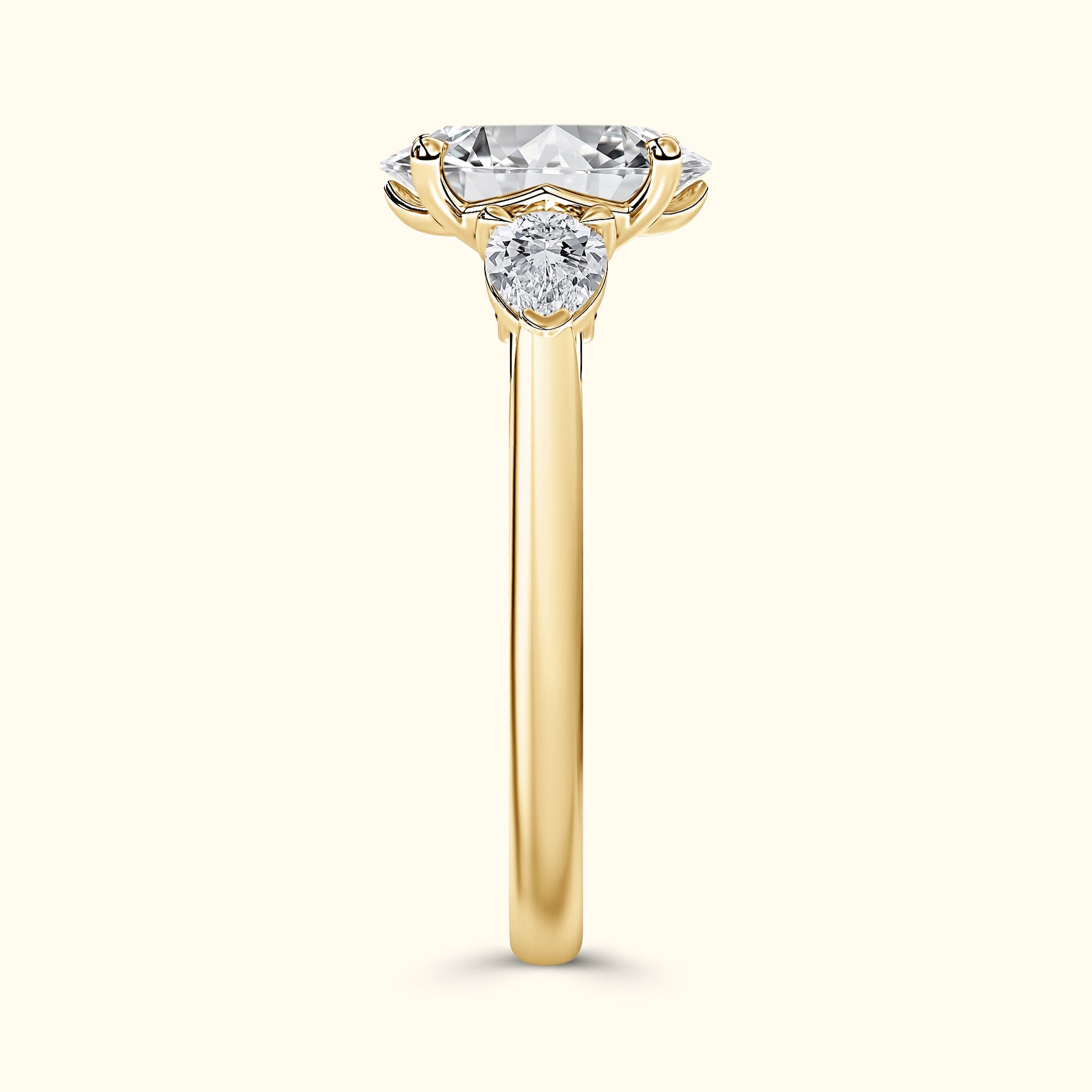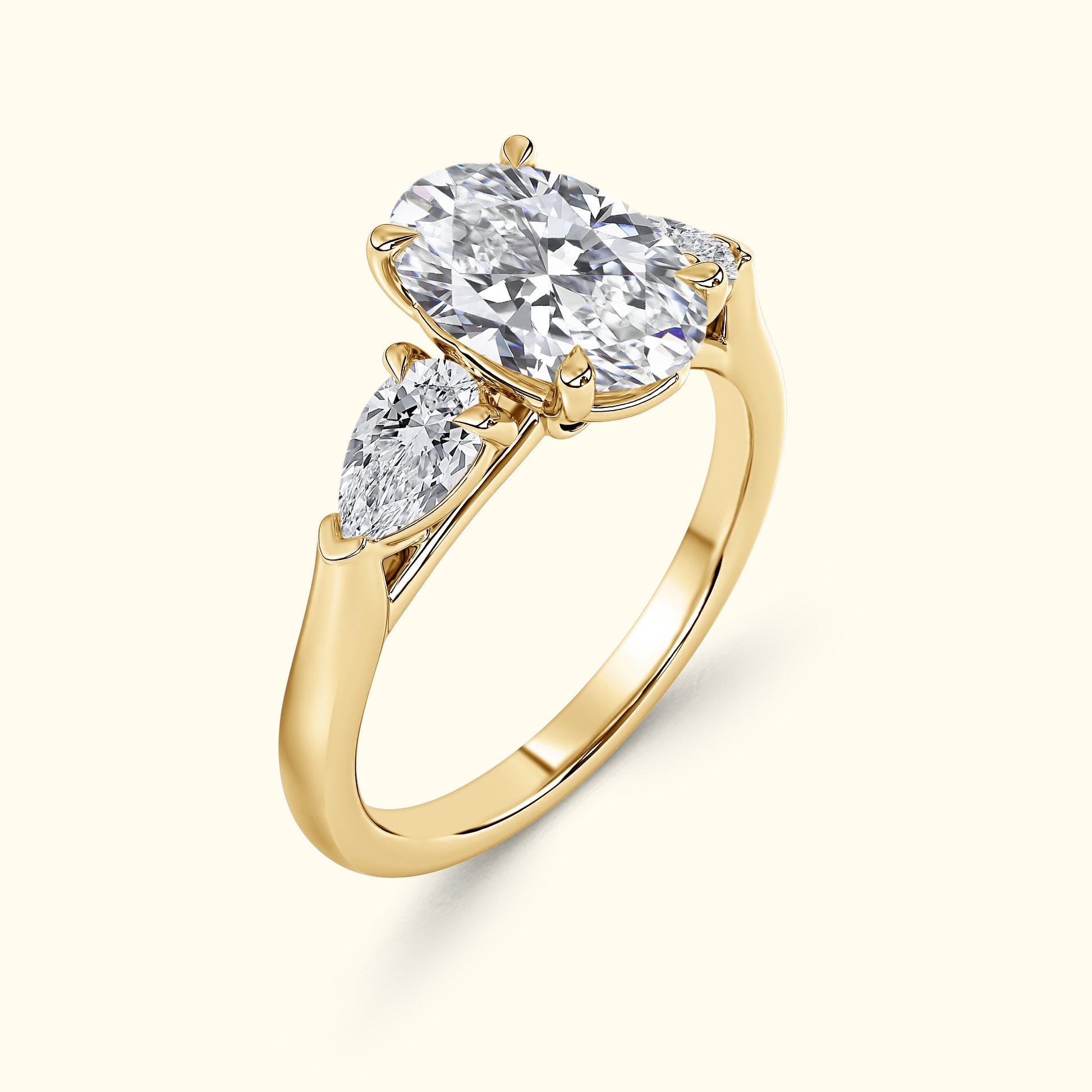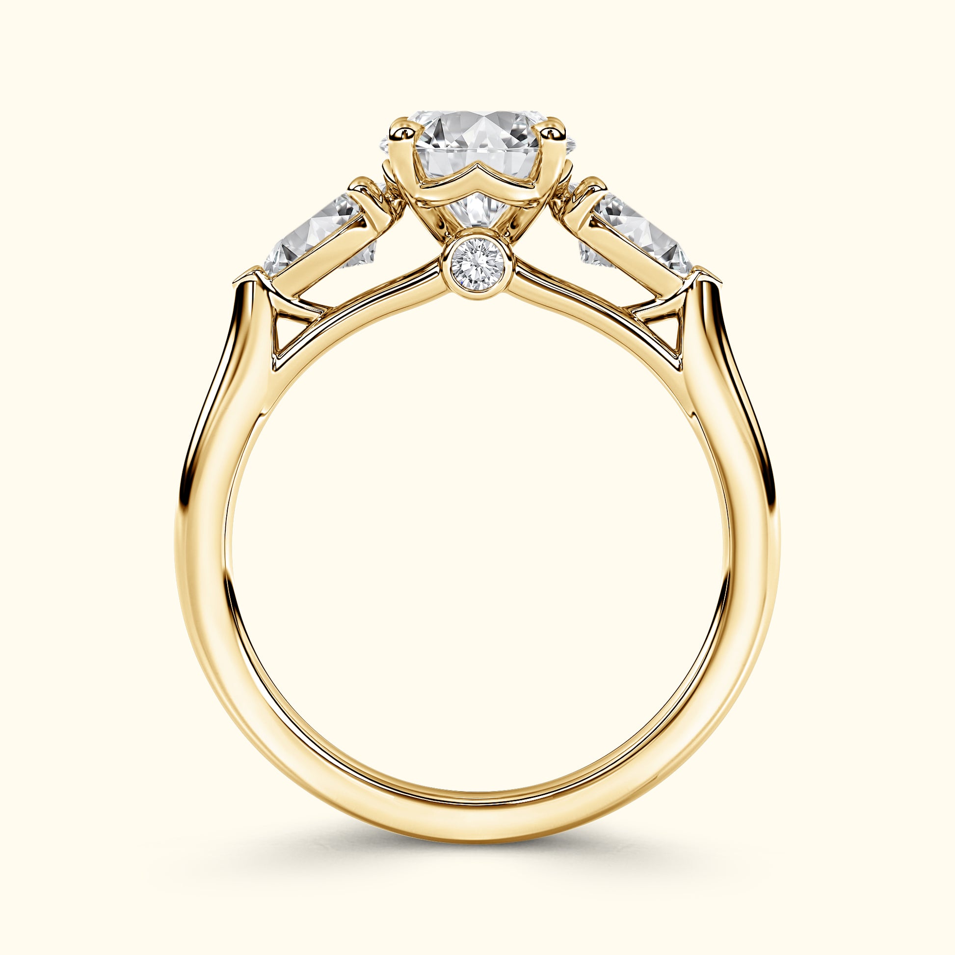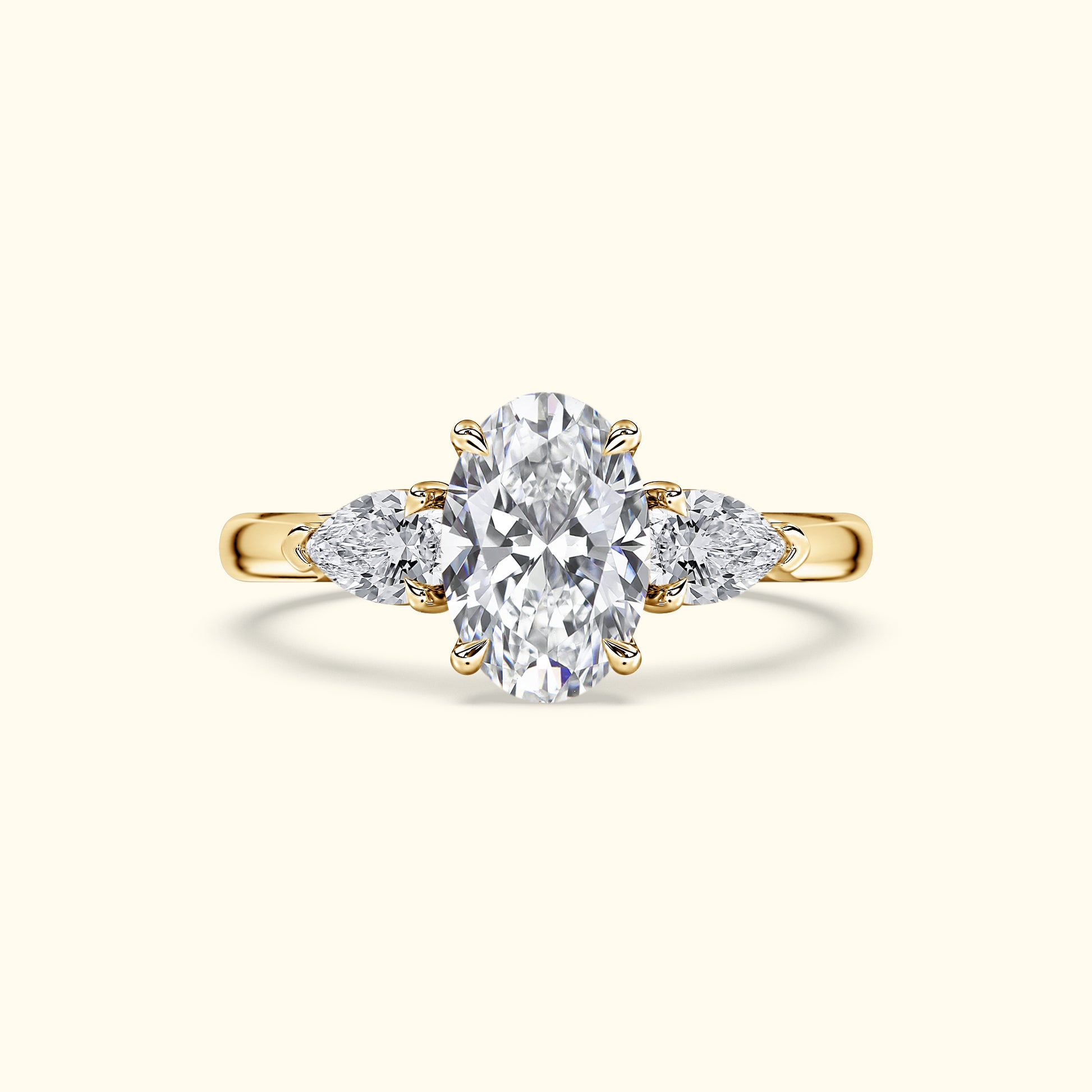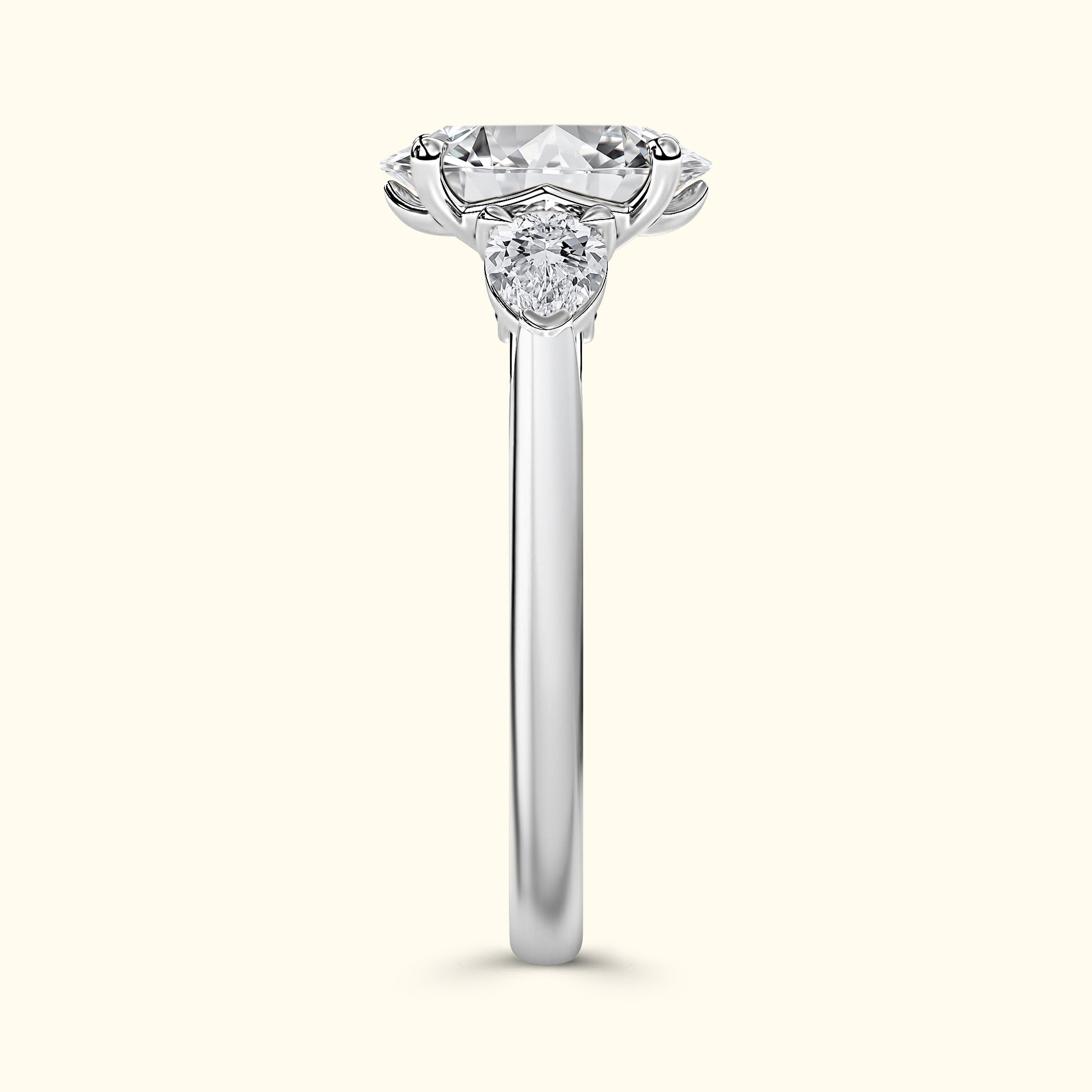This elegant three-stone engagement ring showcases a stunning oval center diamond flanked by pear-shaped side stones, symbolizing your past, present, and future. Set in a graceful cathedral design with a subtle peekaboo diamond for added sparkle, it beautifully balances timeless romance and modern sophistication.