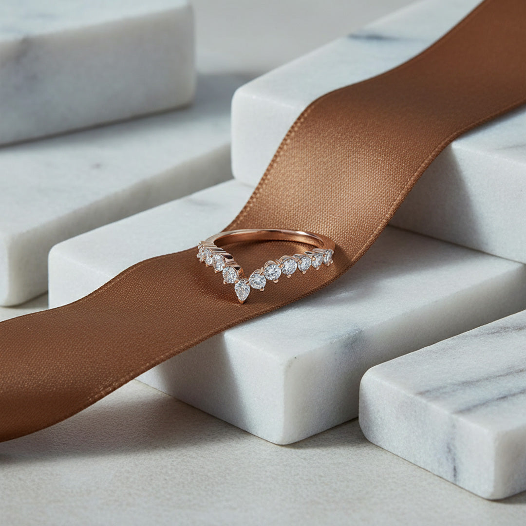 This V-shaped band features 0.25 carats of diamonds in a French pavé, tapered design, creating a delicate, elegant sparkle that pairs beautifully with an engagement ring.
