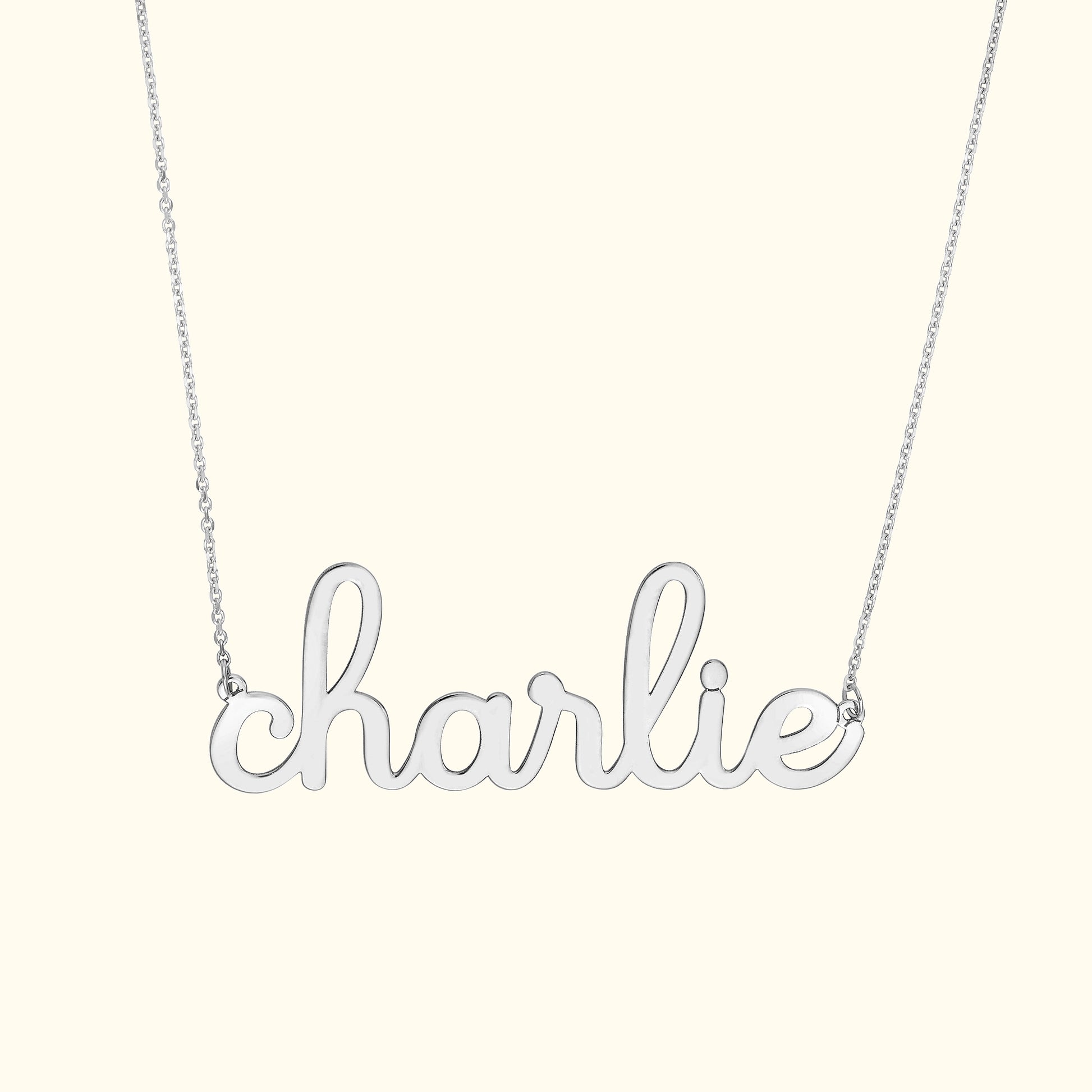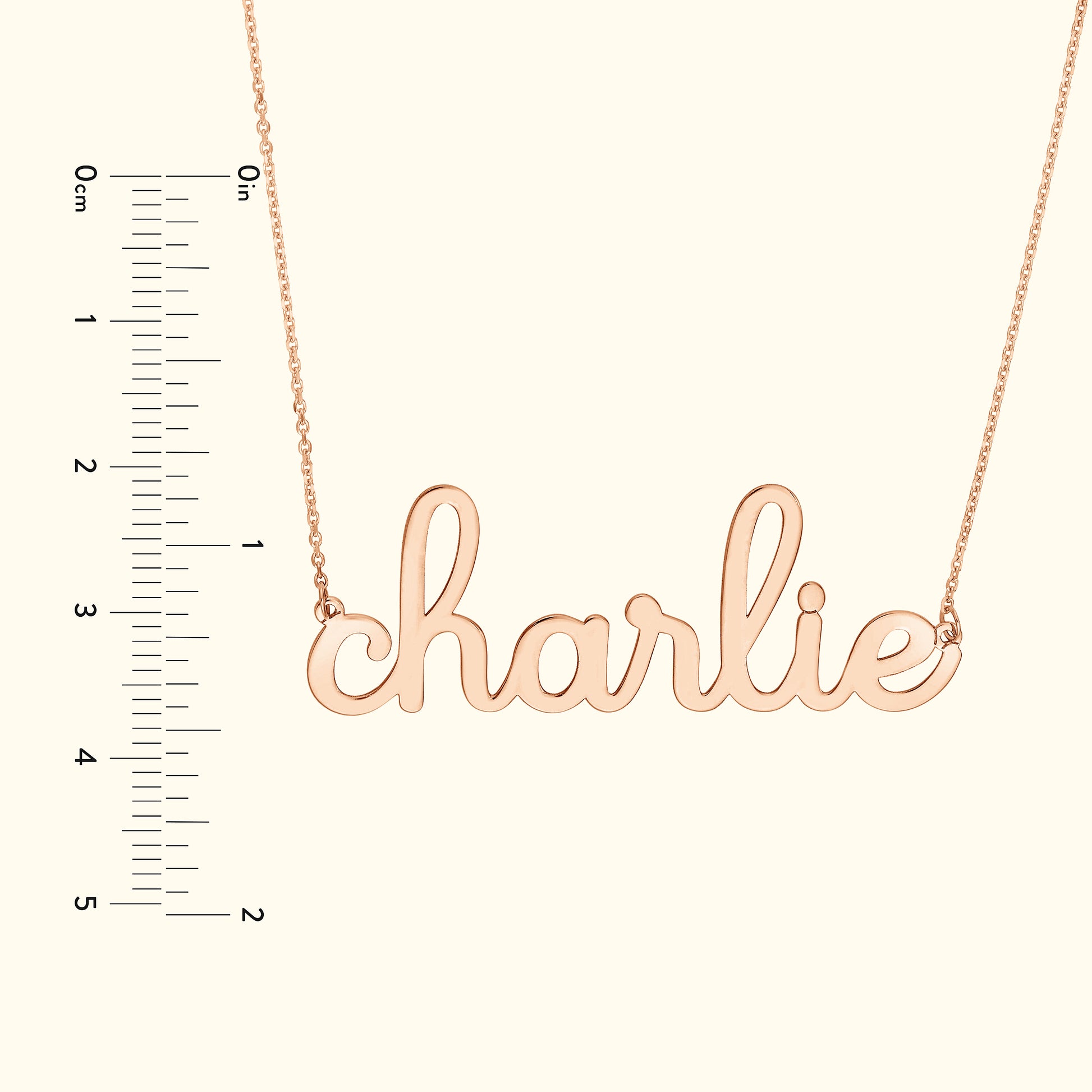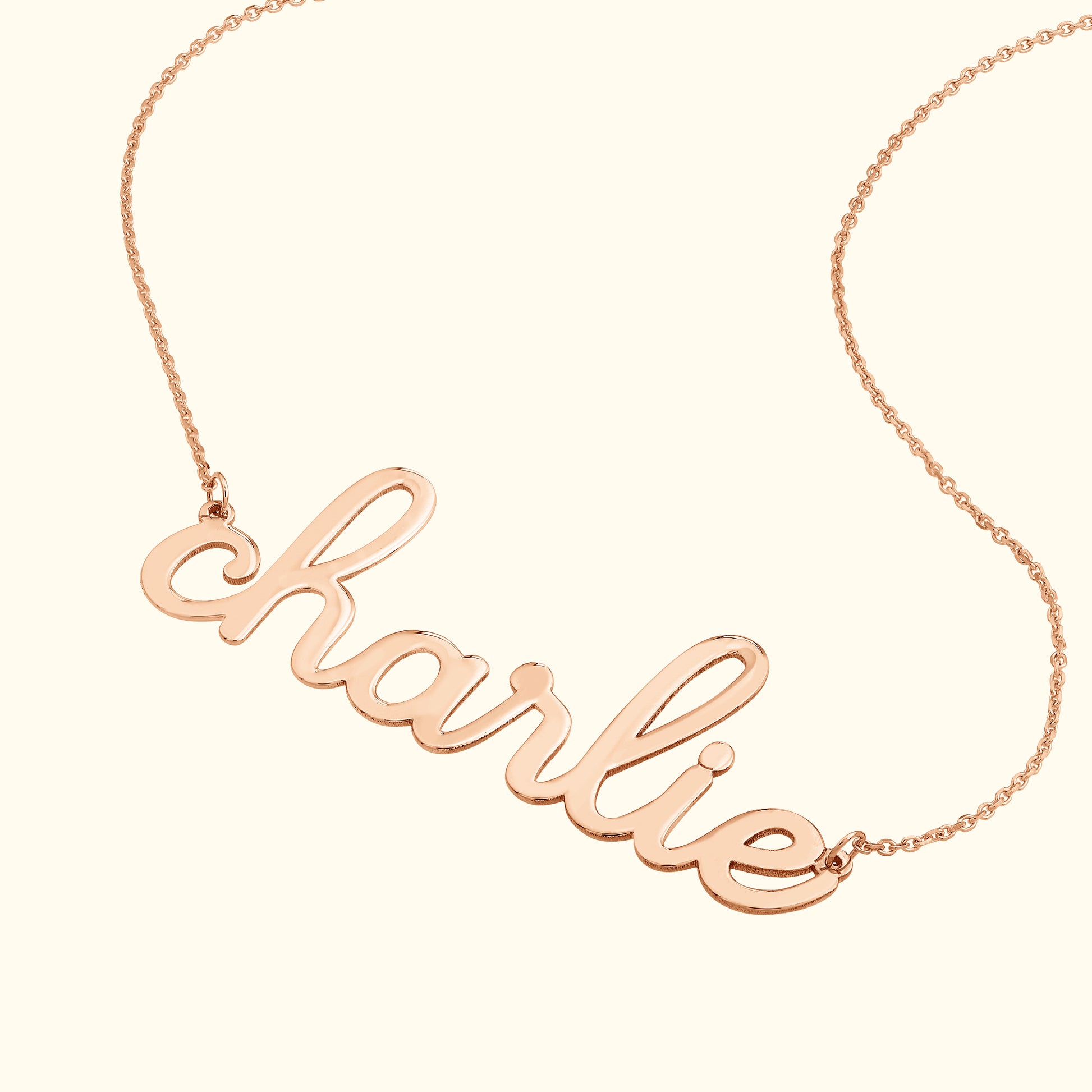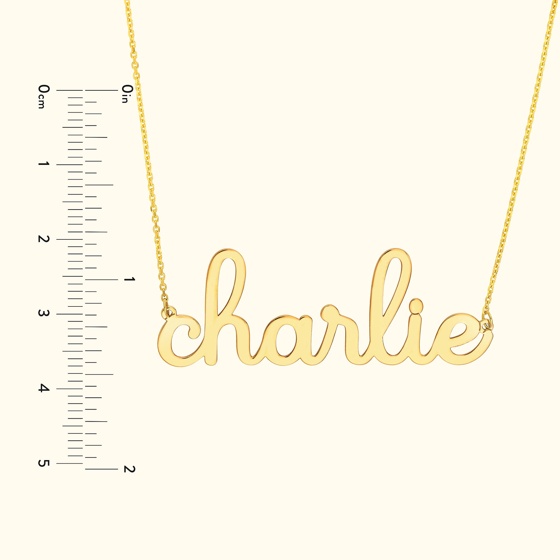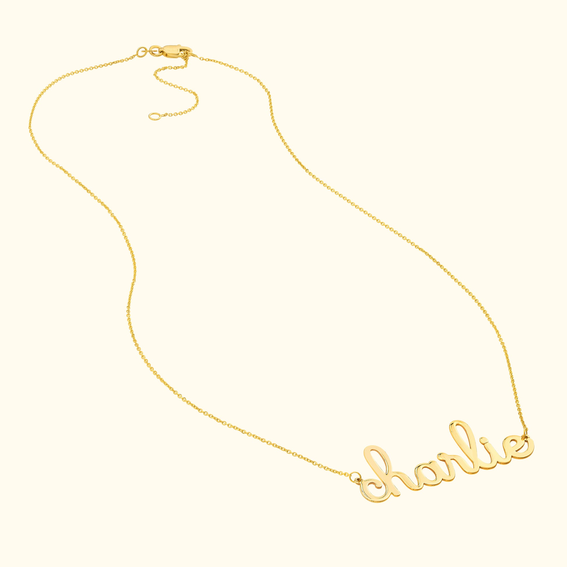 Feeling whimsical? Create a custom piece with this playful, doodle font nameplate necklace. Crafted in 14K yellow, white or rose gold