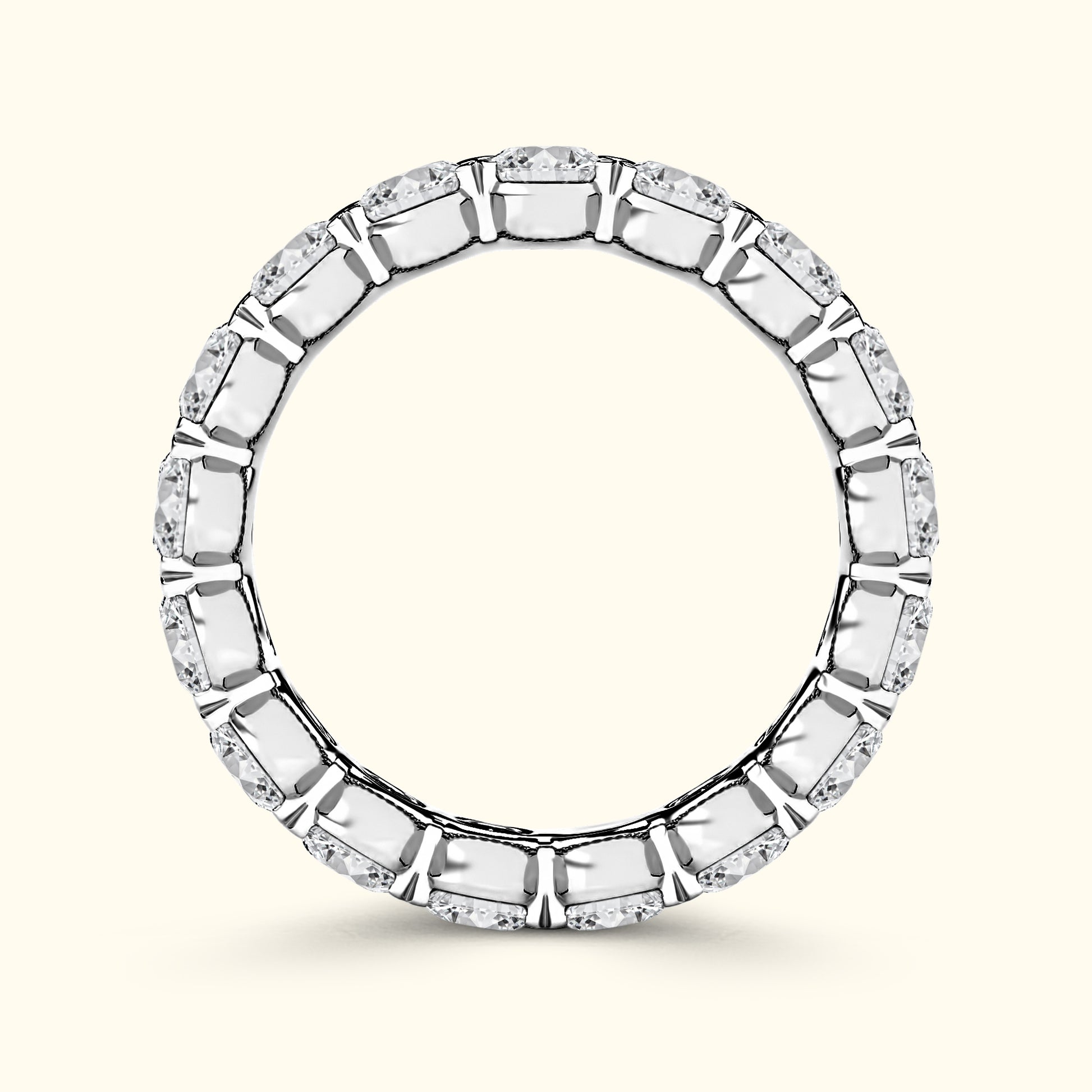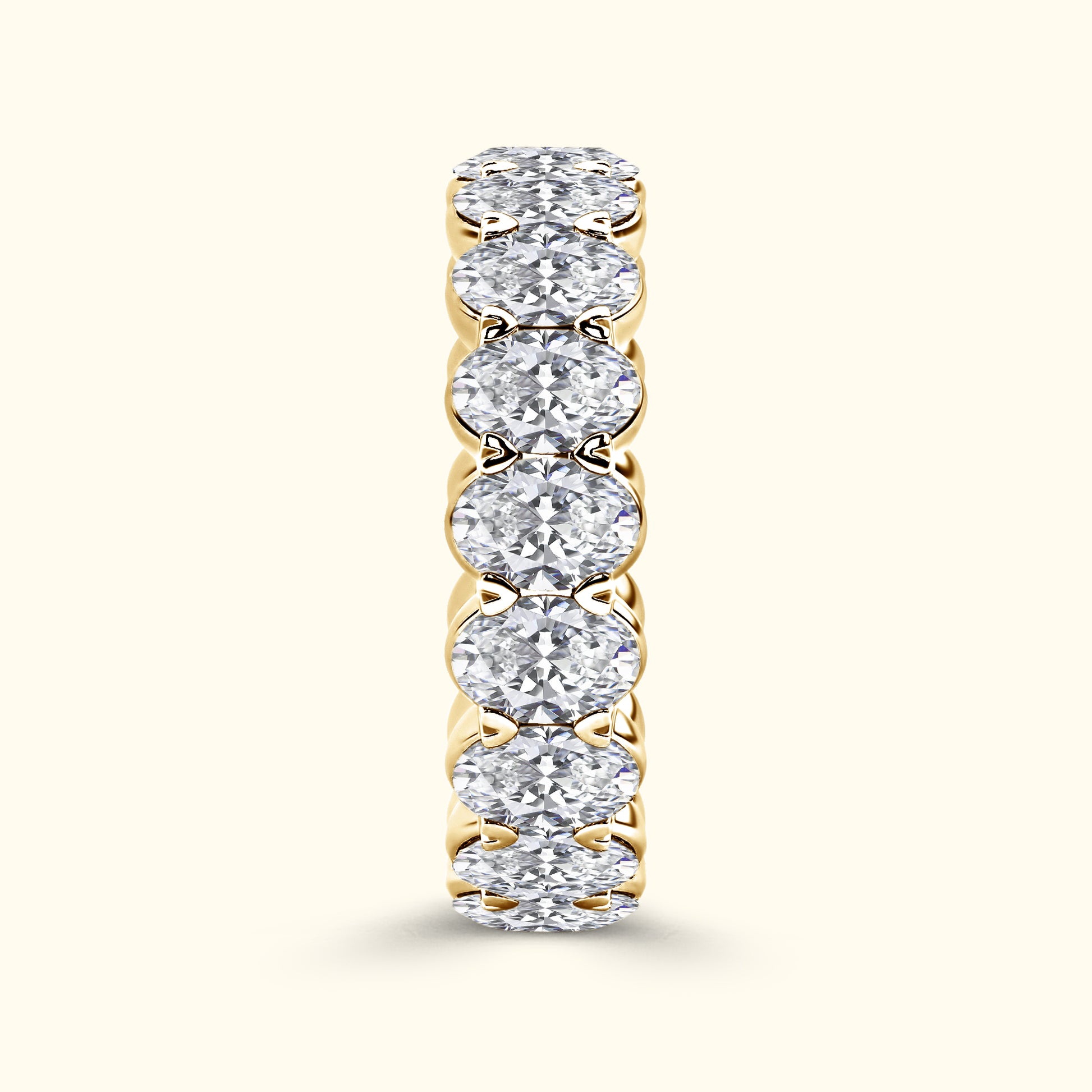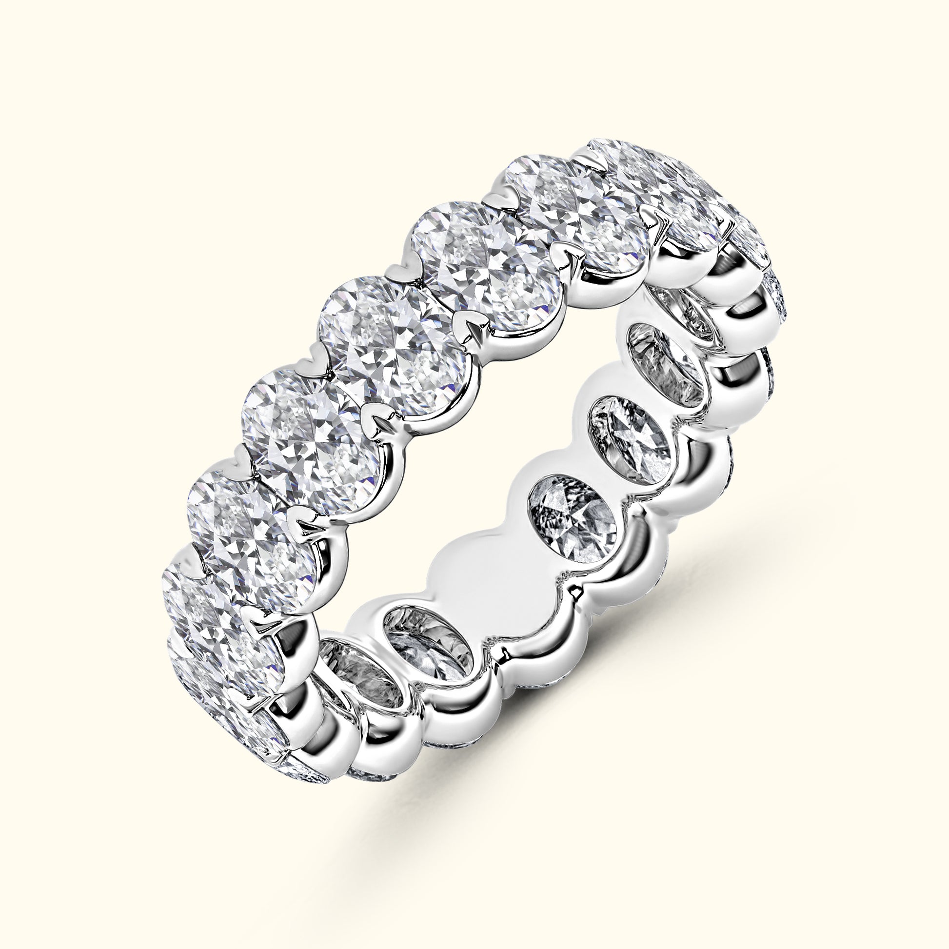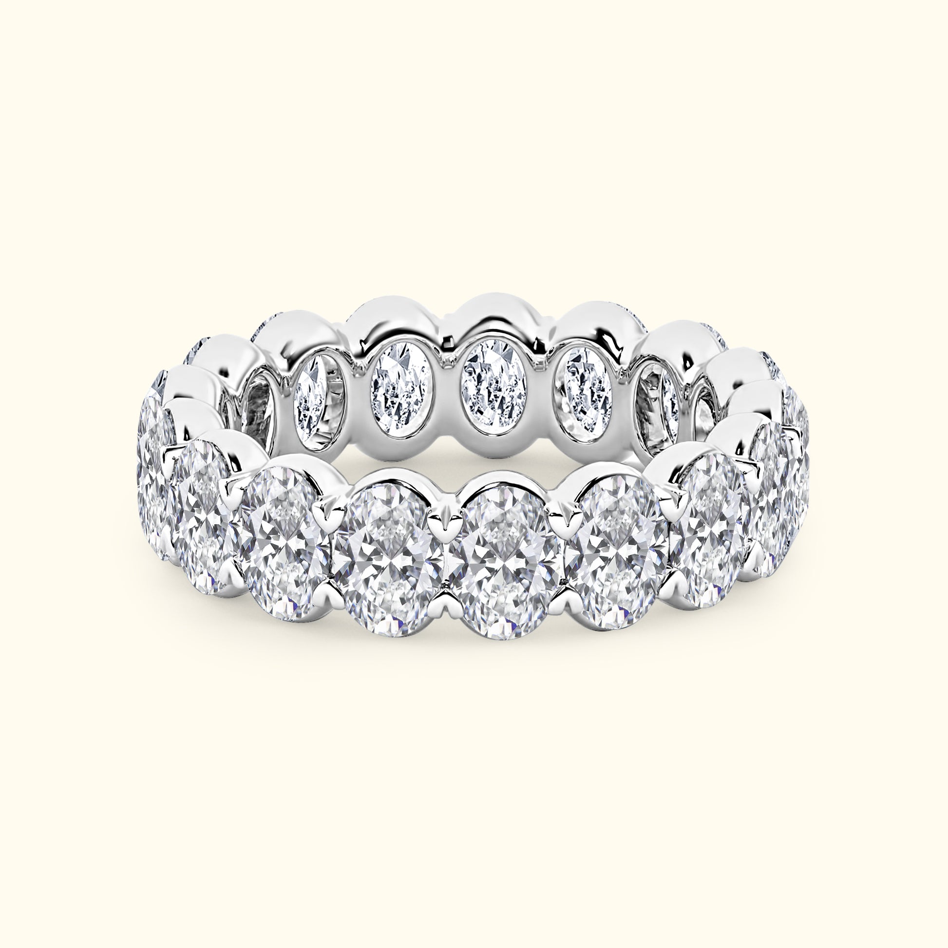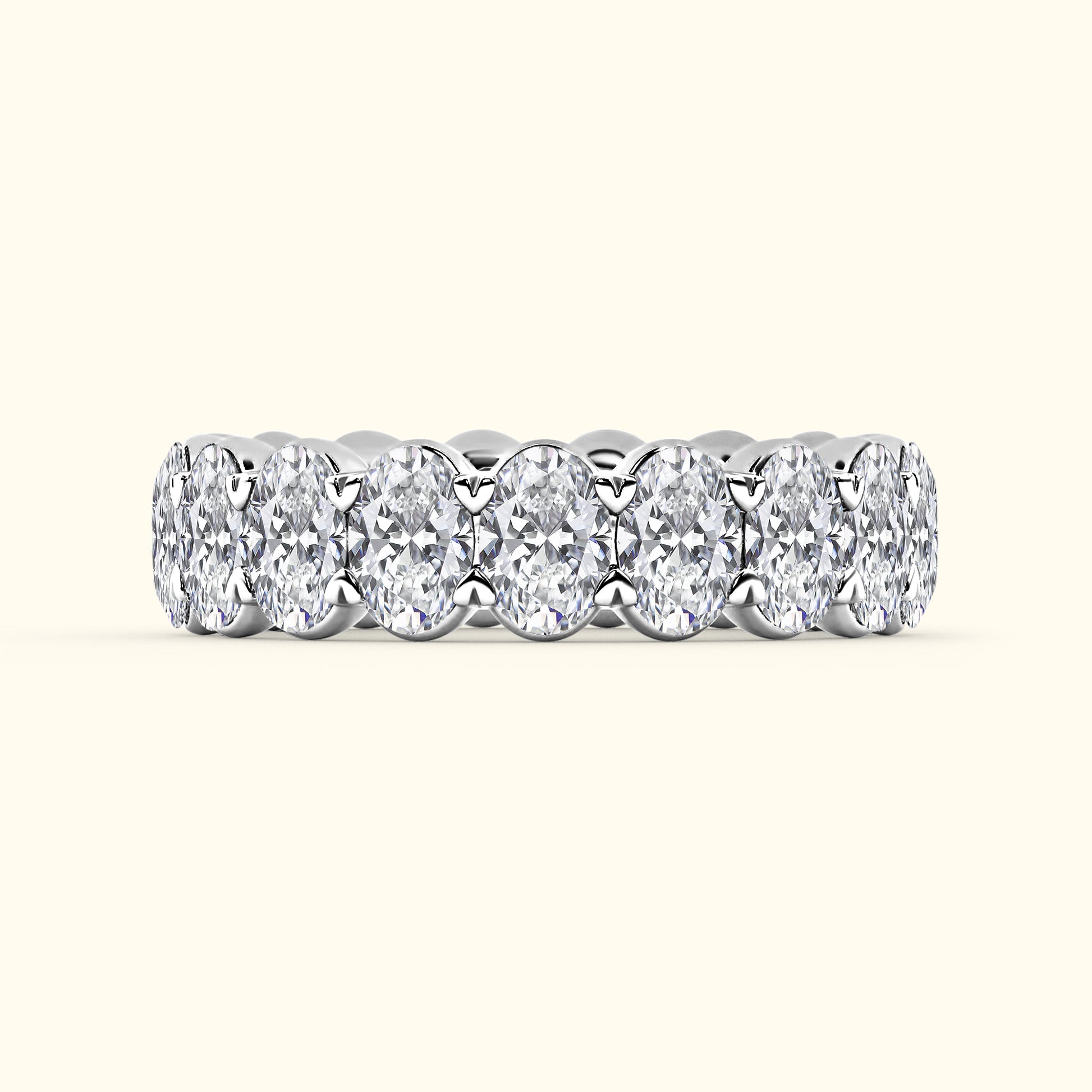This low-profile eternity band features a continuous row of oval-cut diamonds, creating a refined and sophisticated look that catches the light beautifully from every angle.