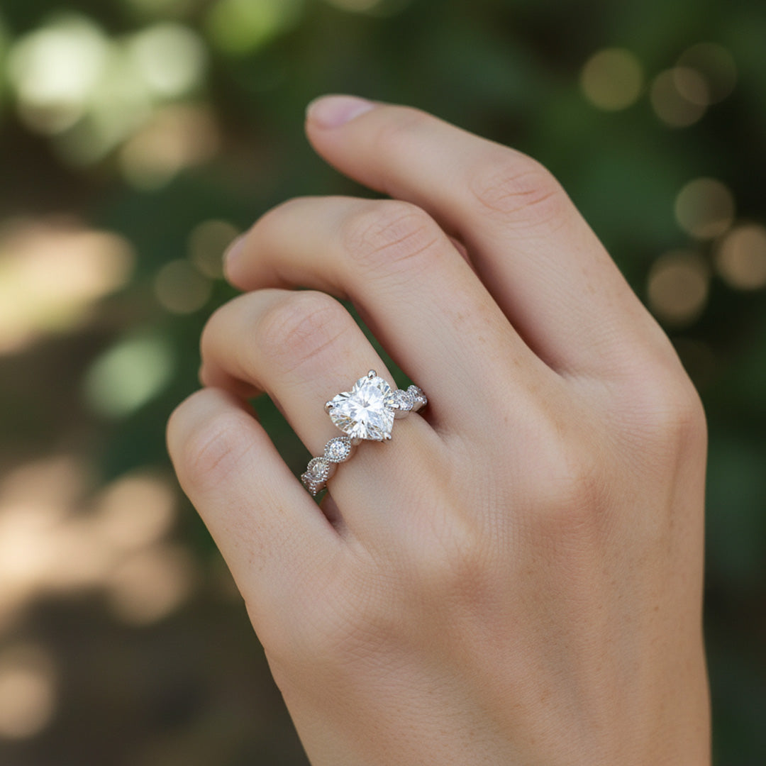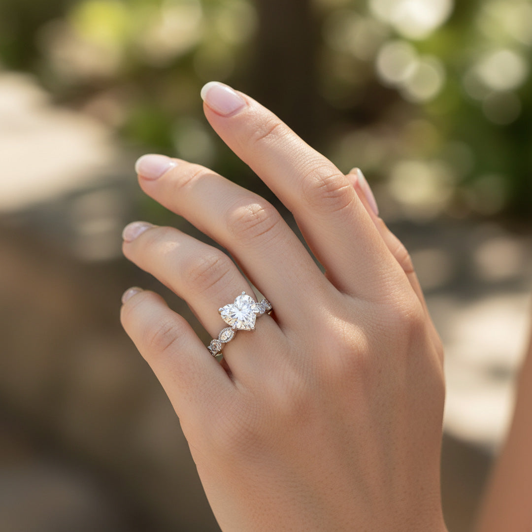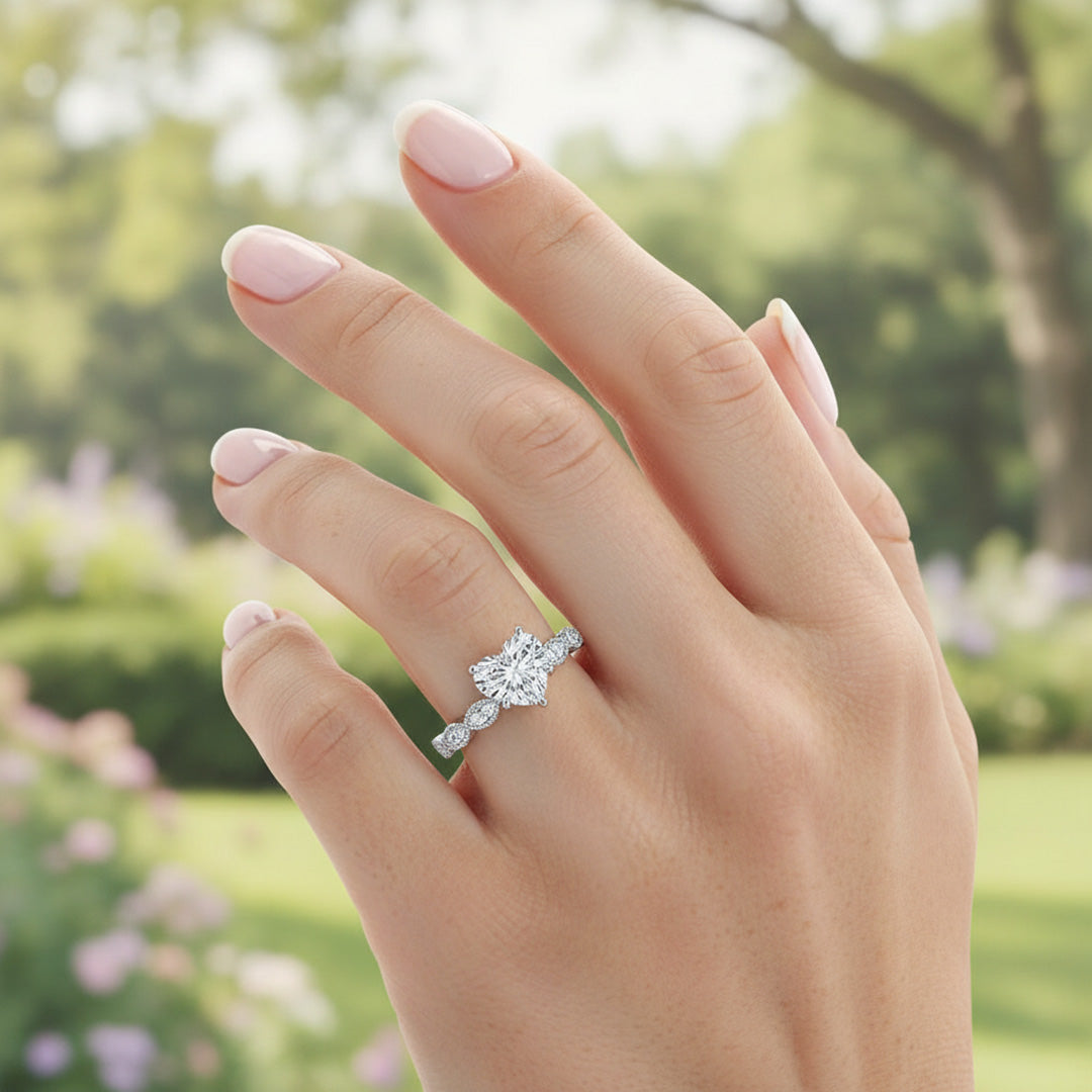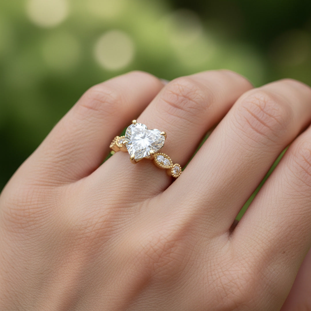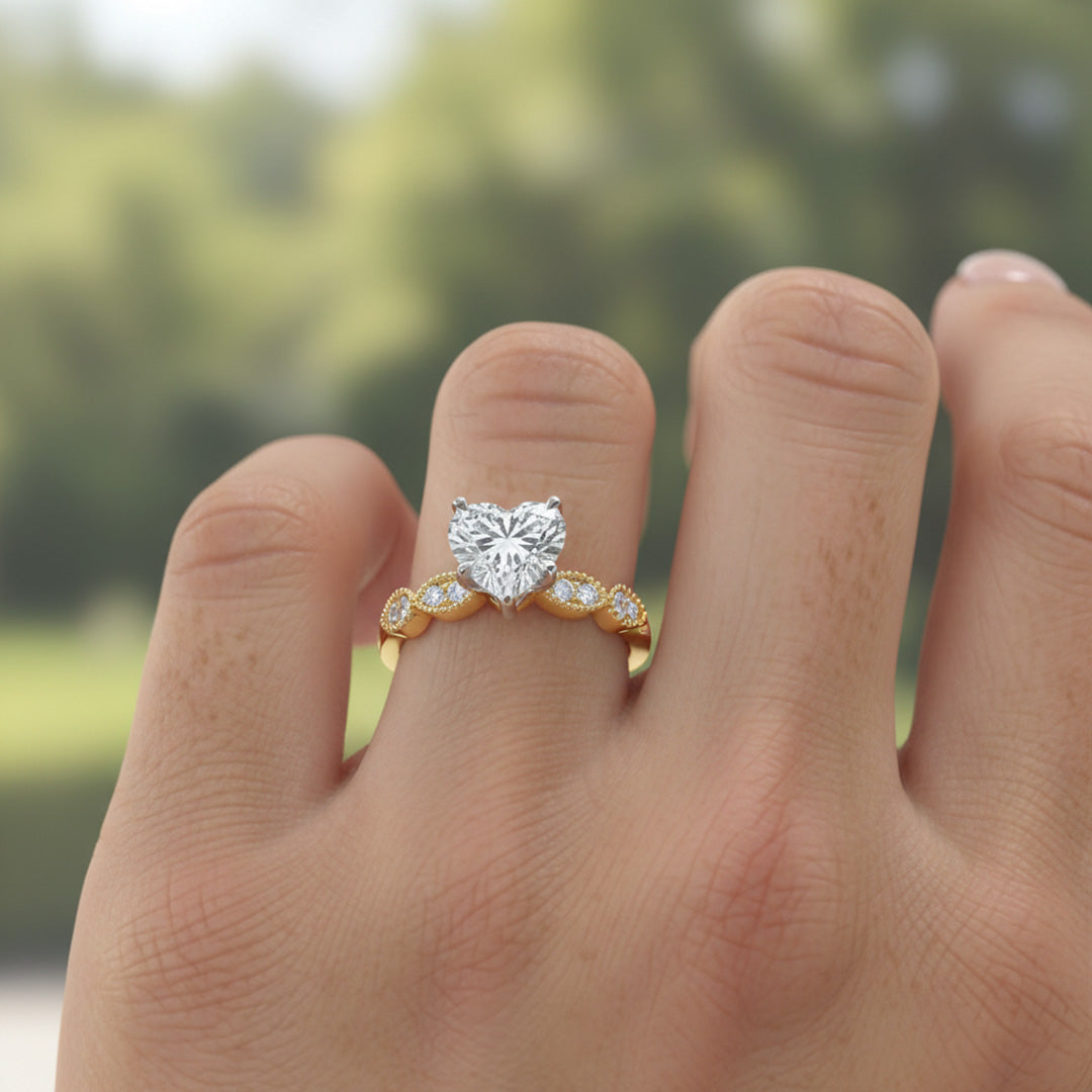 This romantic ring features a heart-shaped center diamond paired with a vintage-inspired band of alternating shapes and delicate milgrain detail. Its intricate design offers timeless charm and heartfelt beauty.