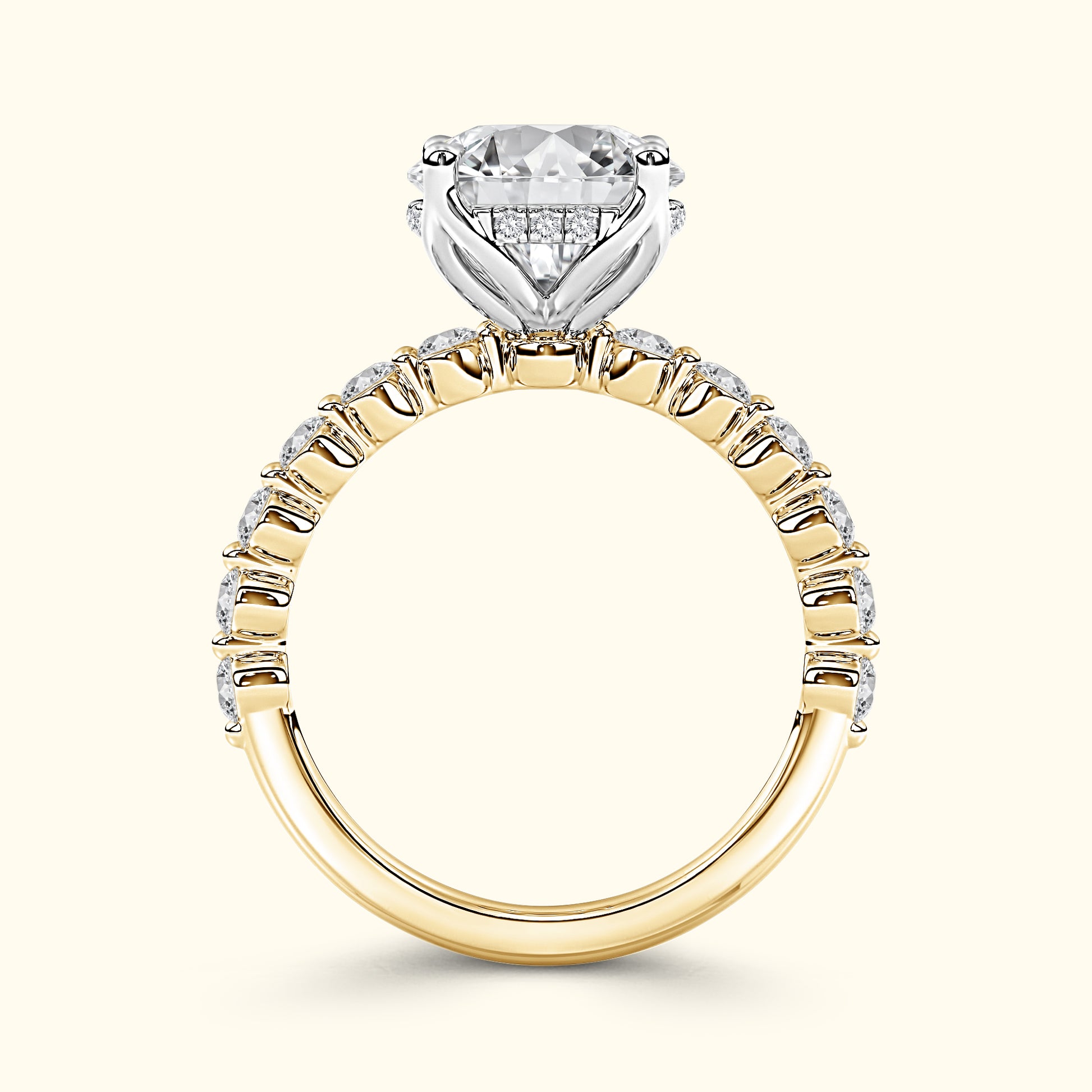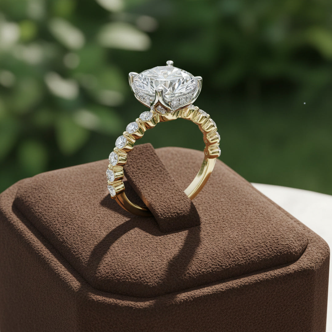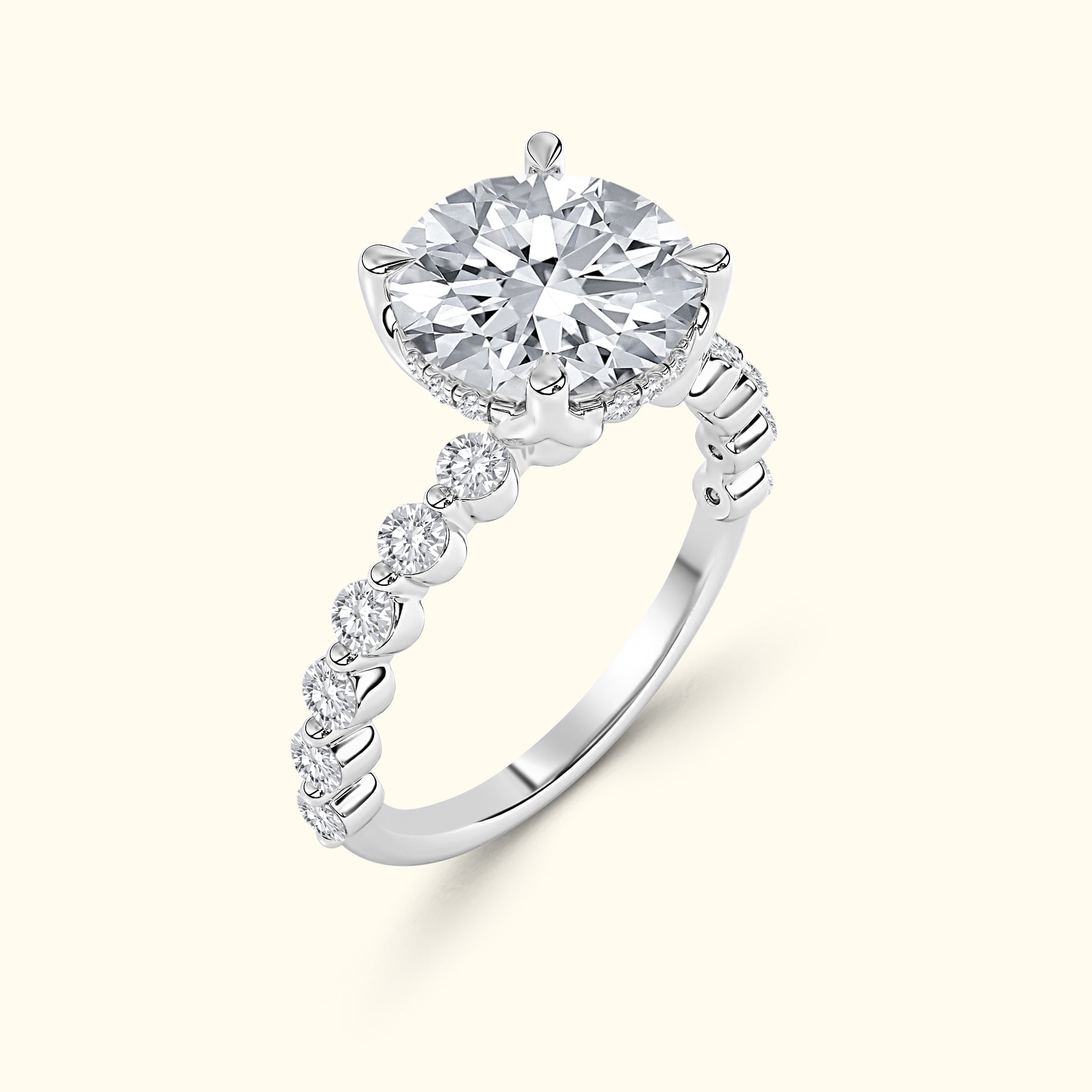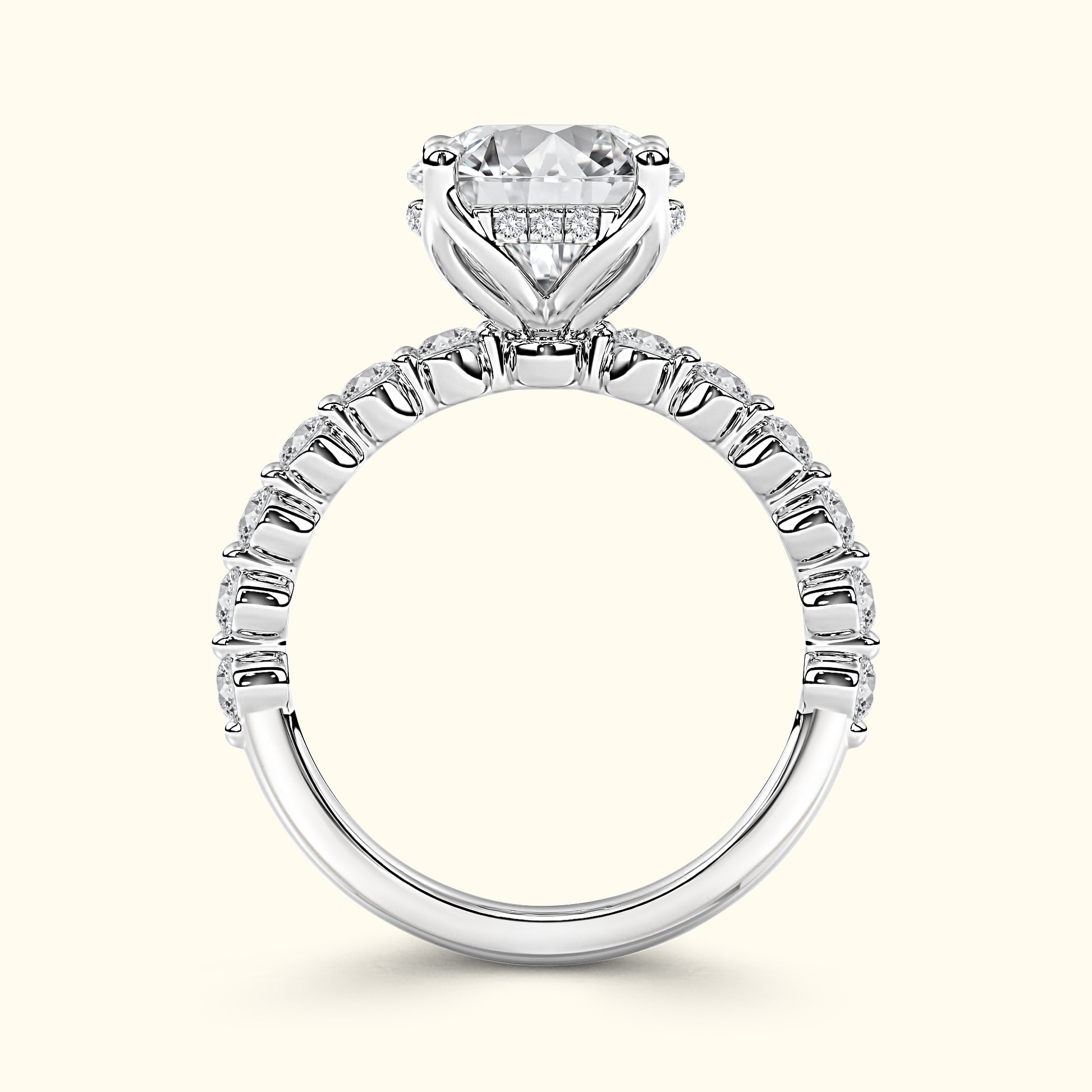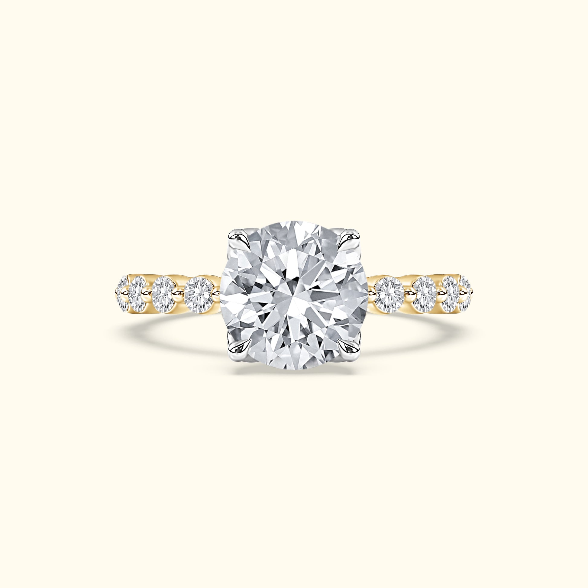 A brilliant round diamond with a sparkling pavé band. Classic, radiant, and effortlessly elegant.