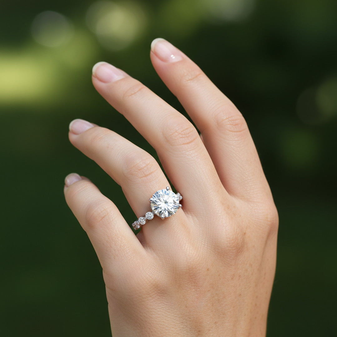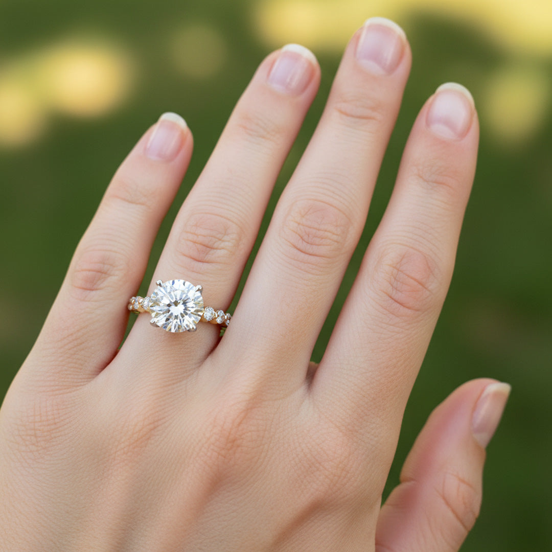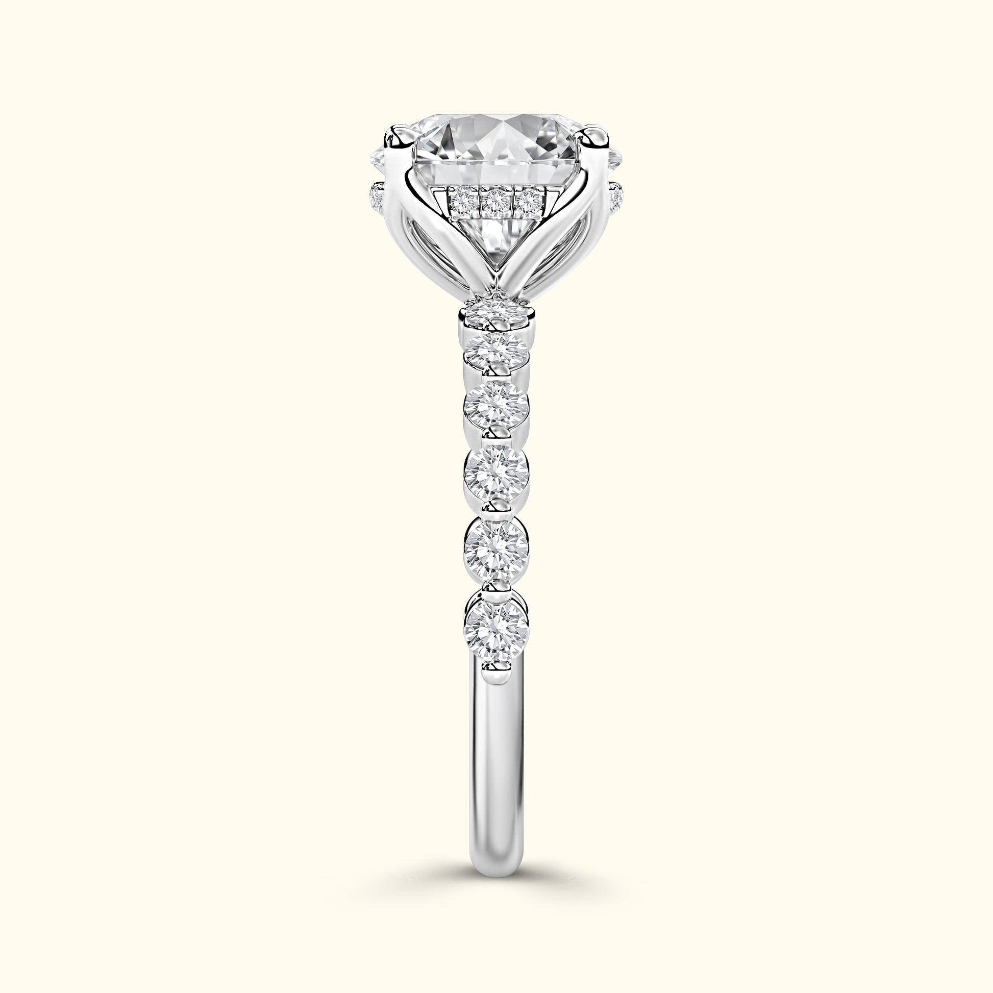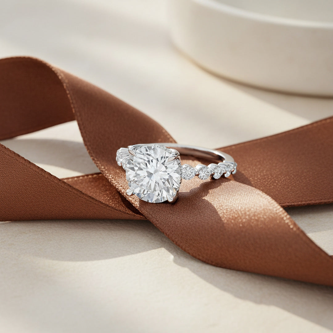 A brilliant round diamond with a sparkling pavé band. Classic, radiant, and effortlessly elegant.