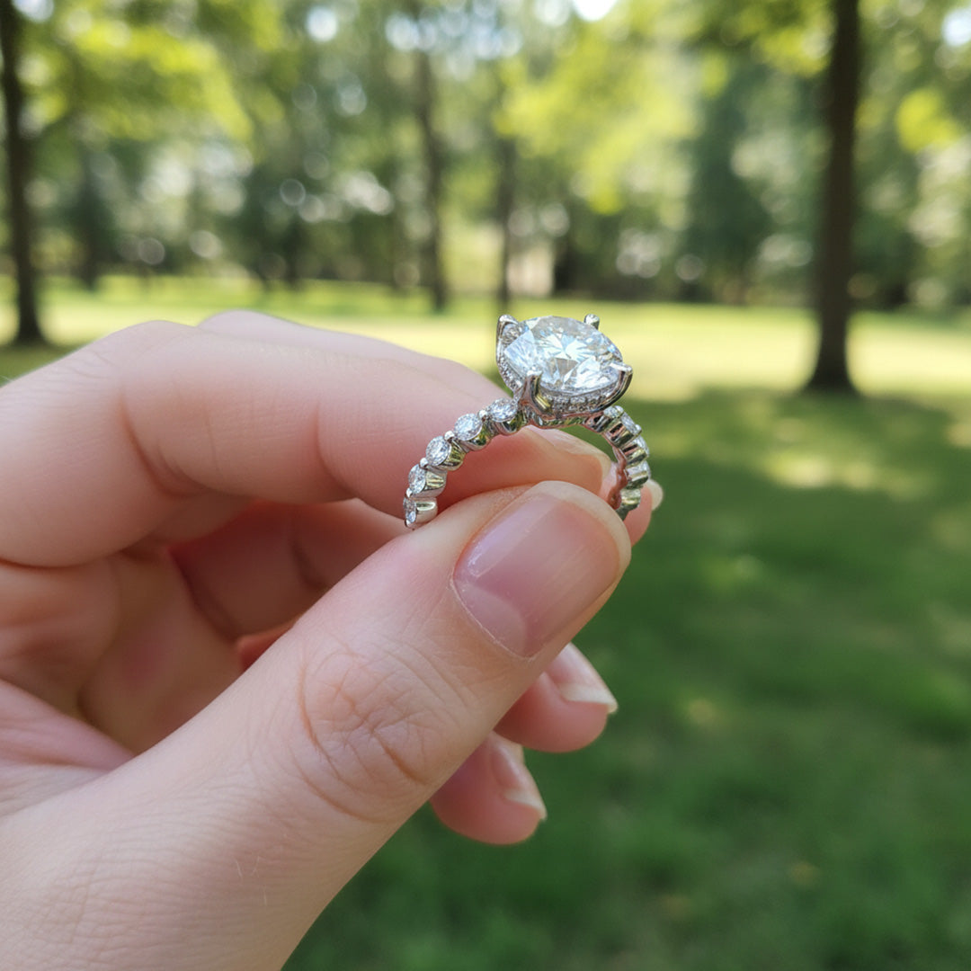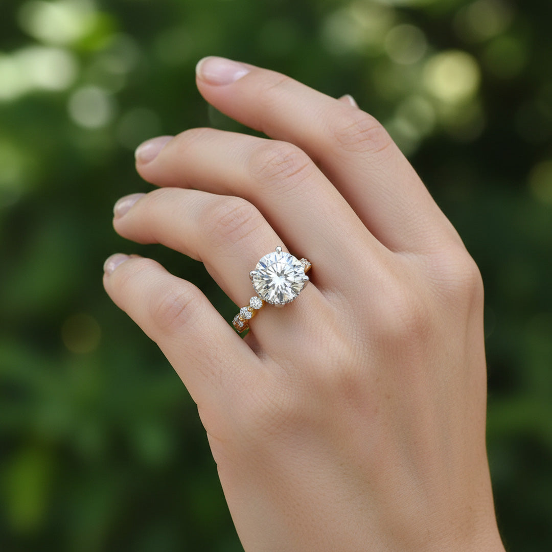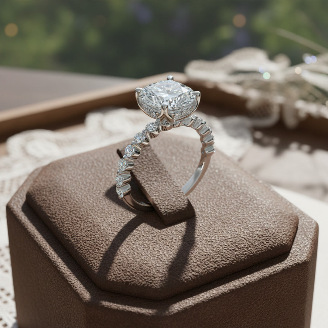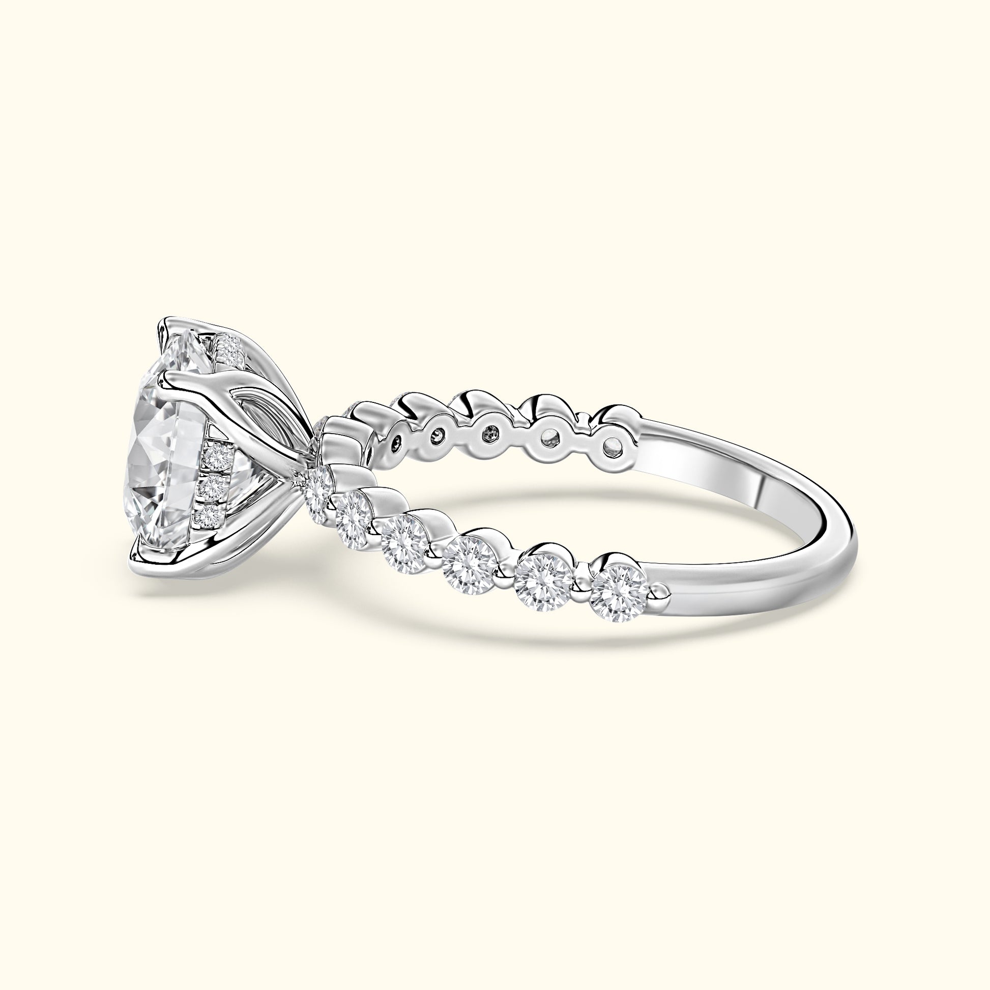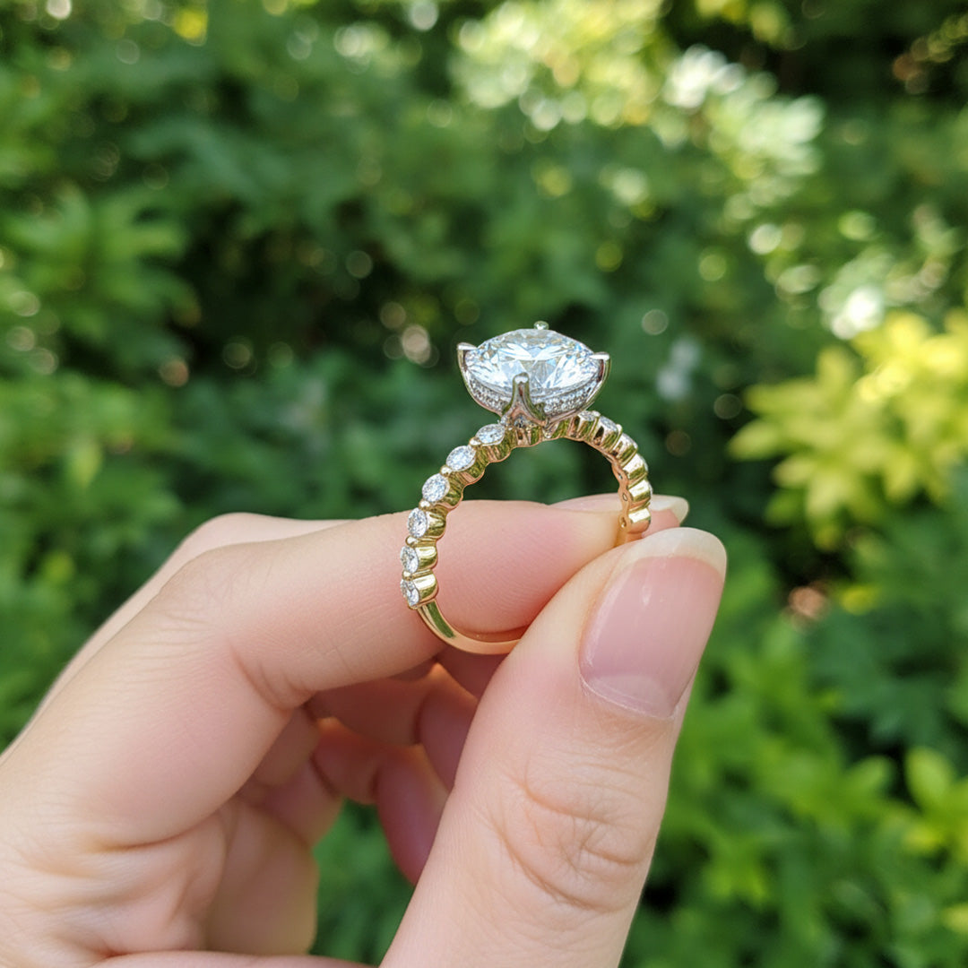 A brilliant round diamond with a sparkling pavé band. Classic, radiant, and effortlessly elegant.