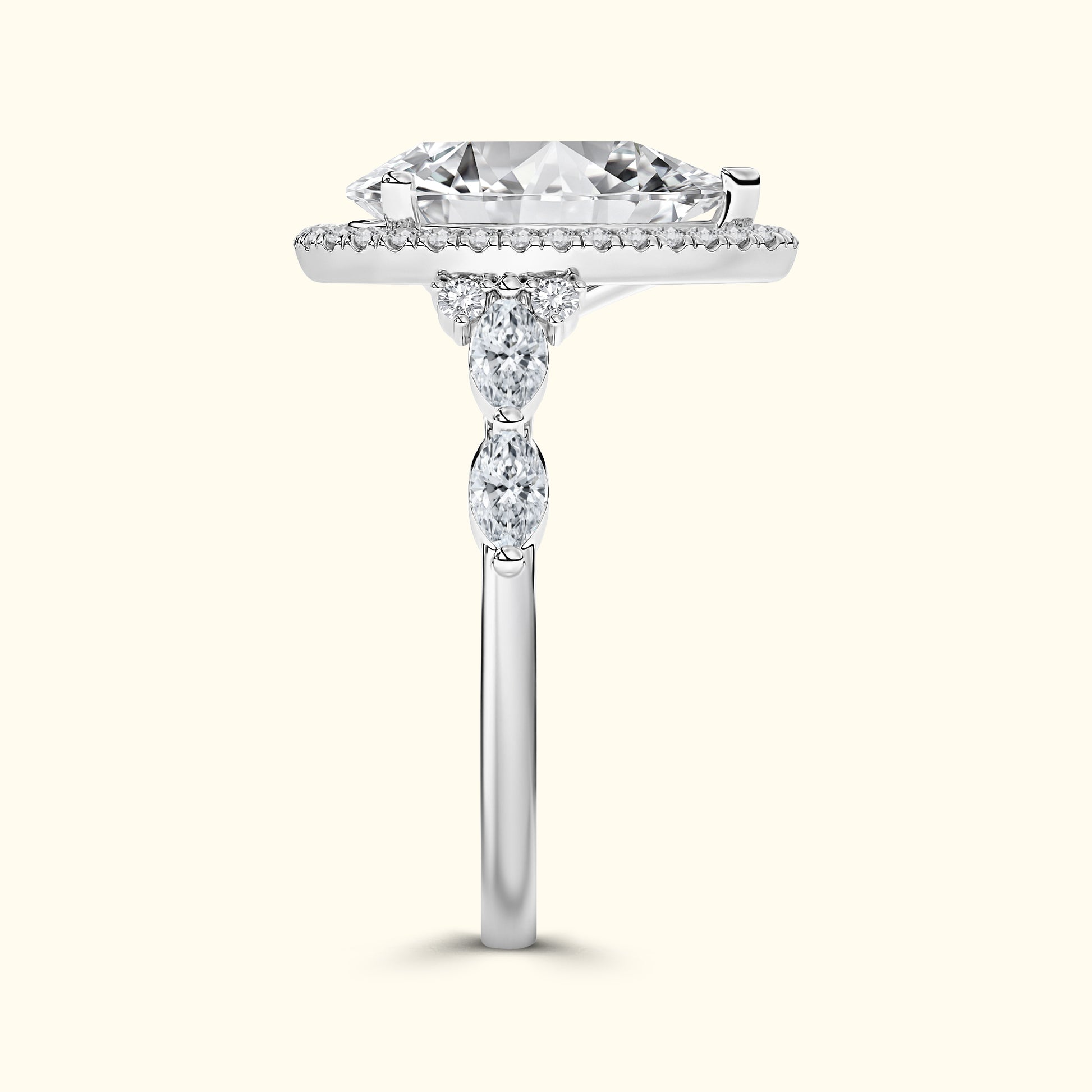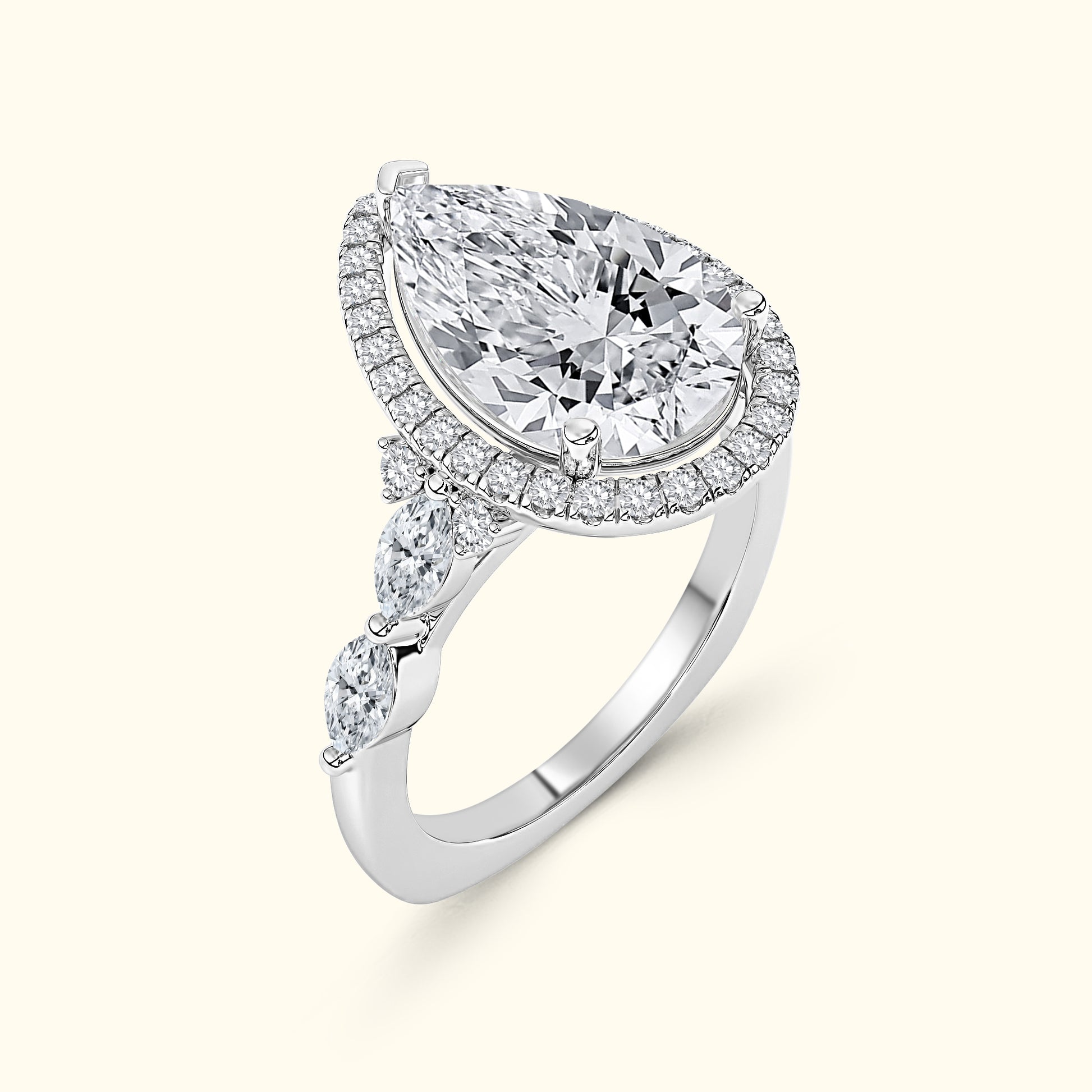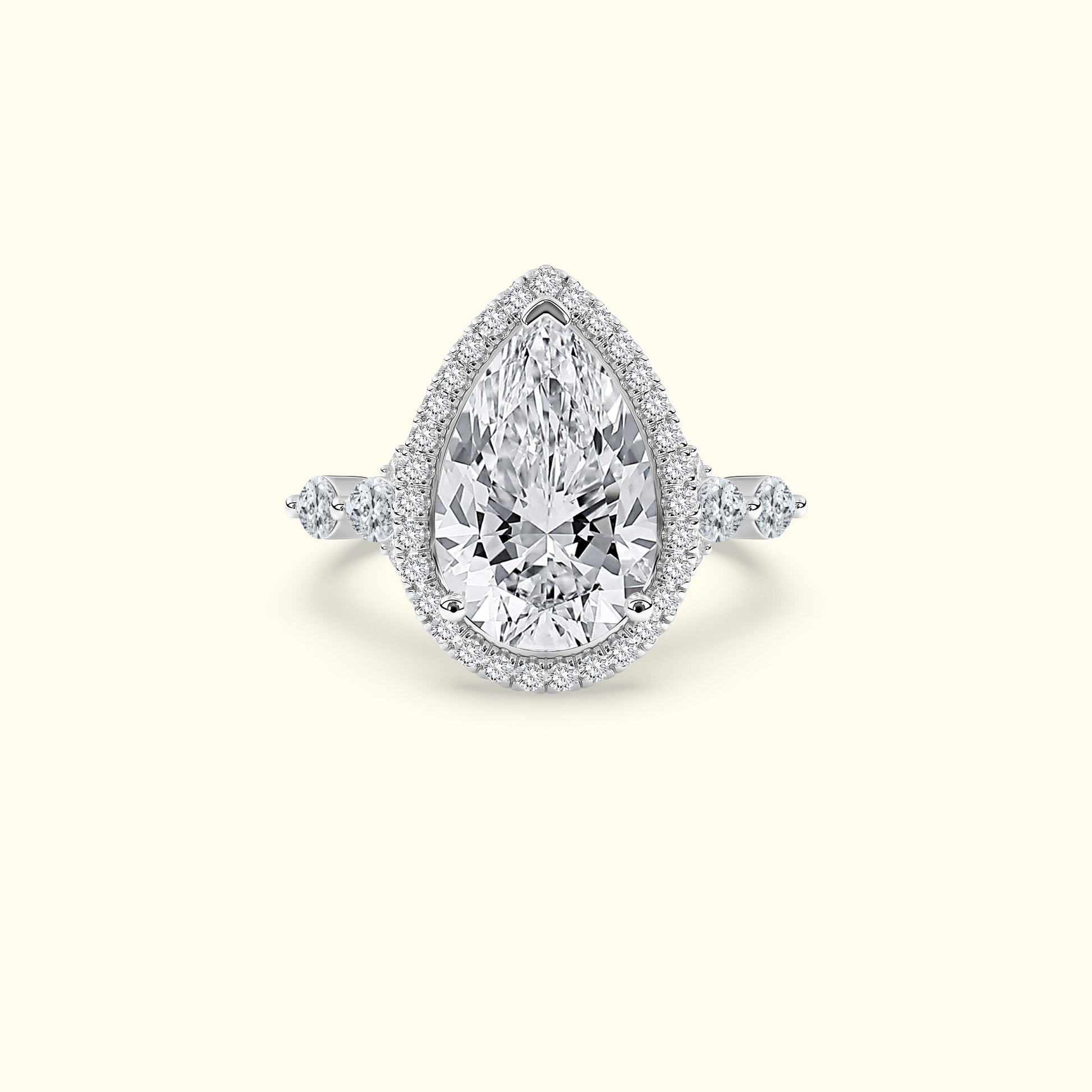 This elegant engagement ring features a captivating pear-shaped center diamond surrounded by a sparkling halo that enhances its brilliance and shape. On either side of the center stone, the band is accented with two horizontally set oval diamonds, secured with shared prongs for a seamless, refined look. A unique design that blends classic sparkle with distinctive, modern detail. The pear-shaped silhouette creates a graceful, elongated effect on the finger, while the side ovals add symmetry and sophistication. Crafted with attention to every detail, this ring is a perfect balance of timeless beauty and artistic elegance.