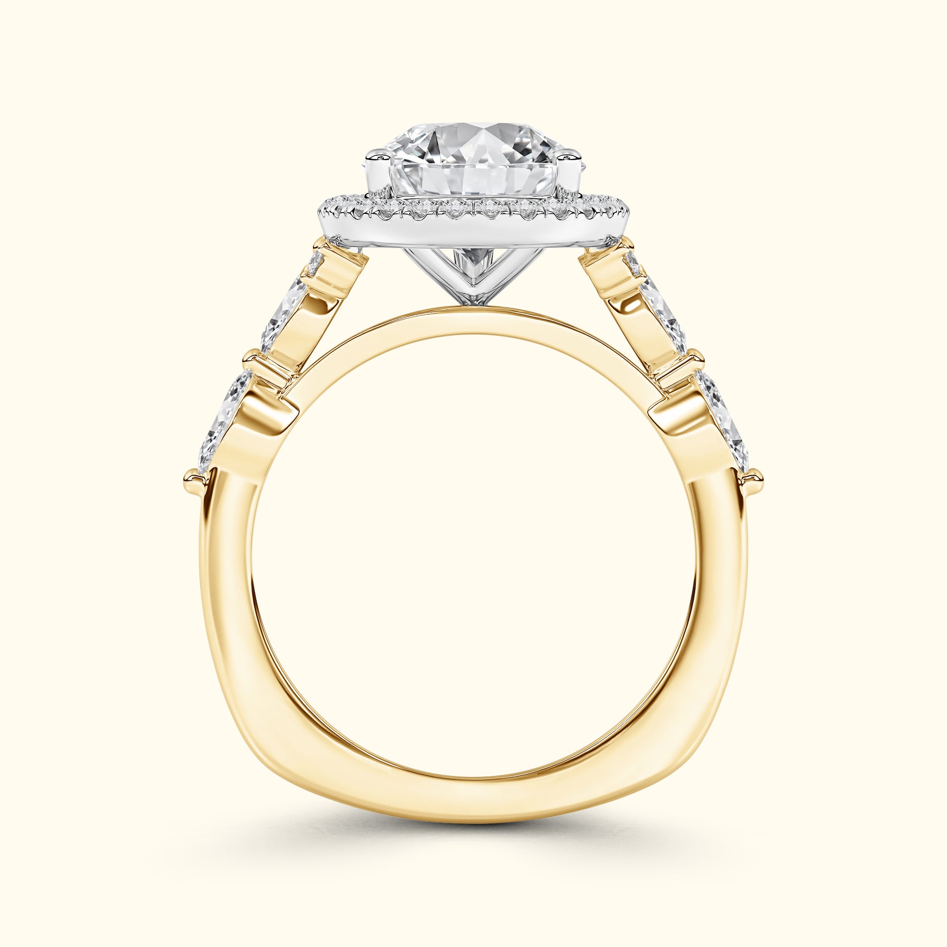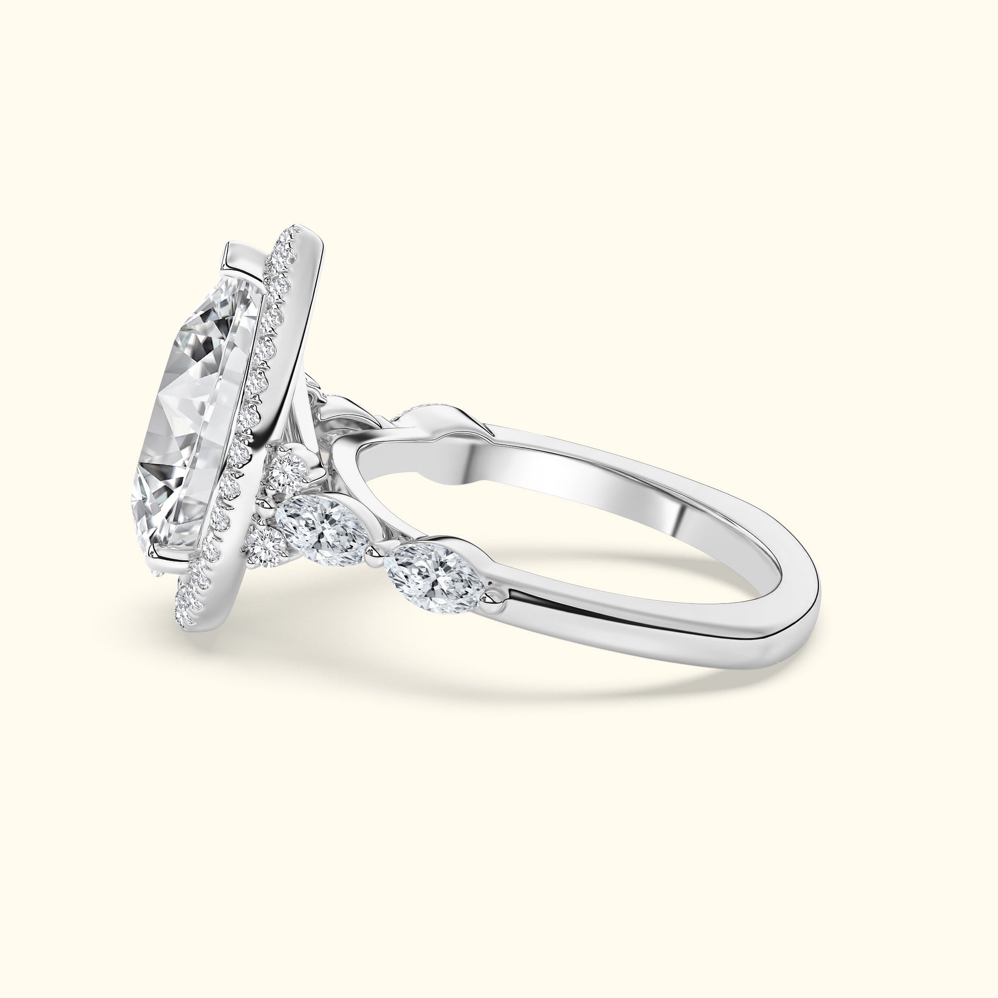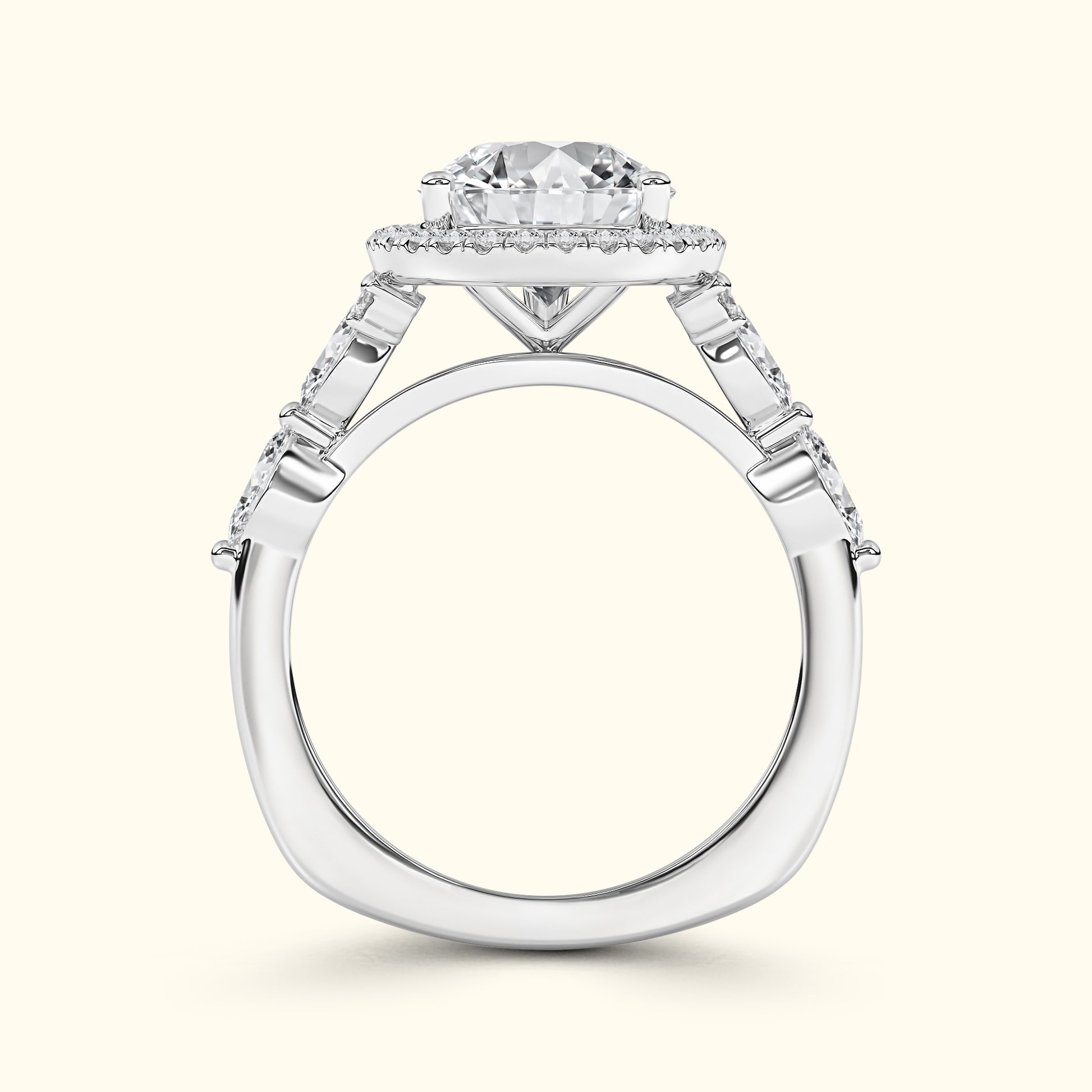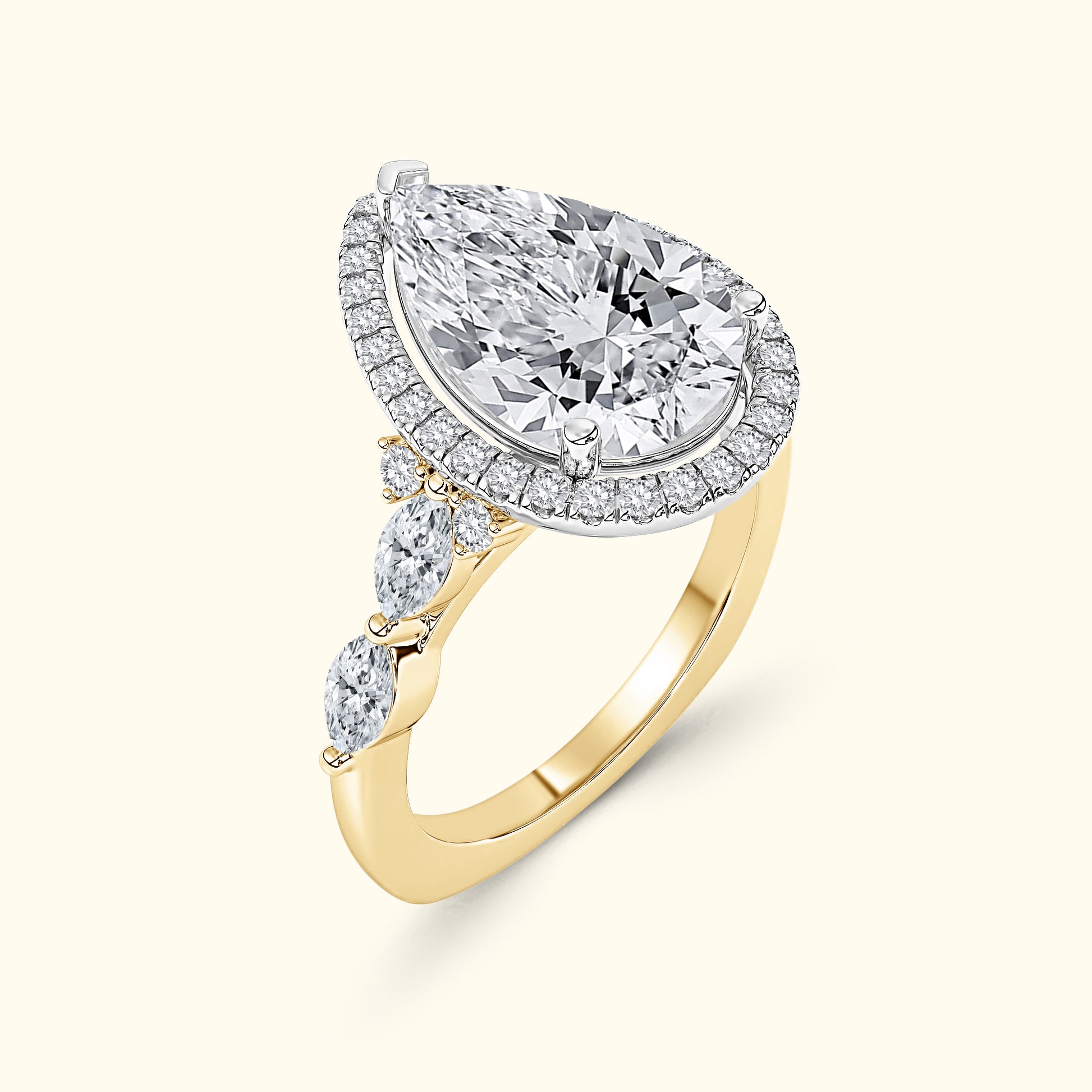 This elegant engagement ring features a captivating pear-shaped center diamond surrounded by a sparkling halo that enhances its brilliance and shape. On either side of the center stone, the band is accented with two horizontally set oval diamonds, secured with shared prongs for a seamless, refined look. A unique design that blends classic sparkle with distinctive, modern detail. The pear-shaped silhouette creates a graceful, elongated effect on the finger, while the side ovals add symmetry and sophistication. Crafted with attention to every detail, this ring is a perfect balance of timeless beauty and artistic elegance.