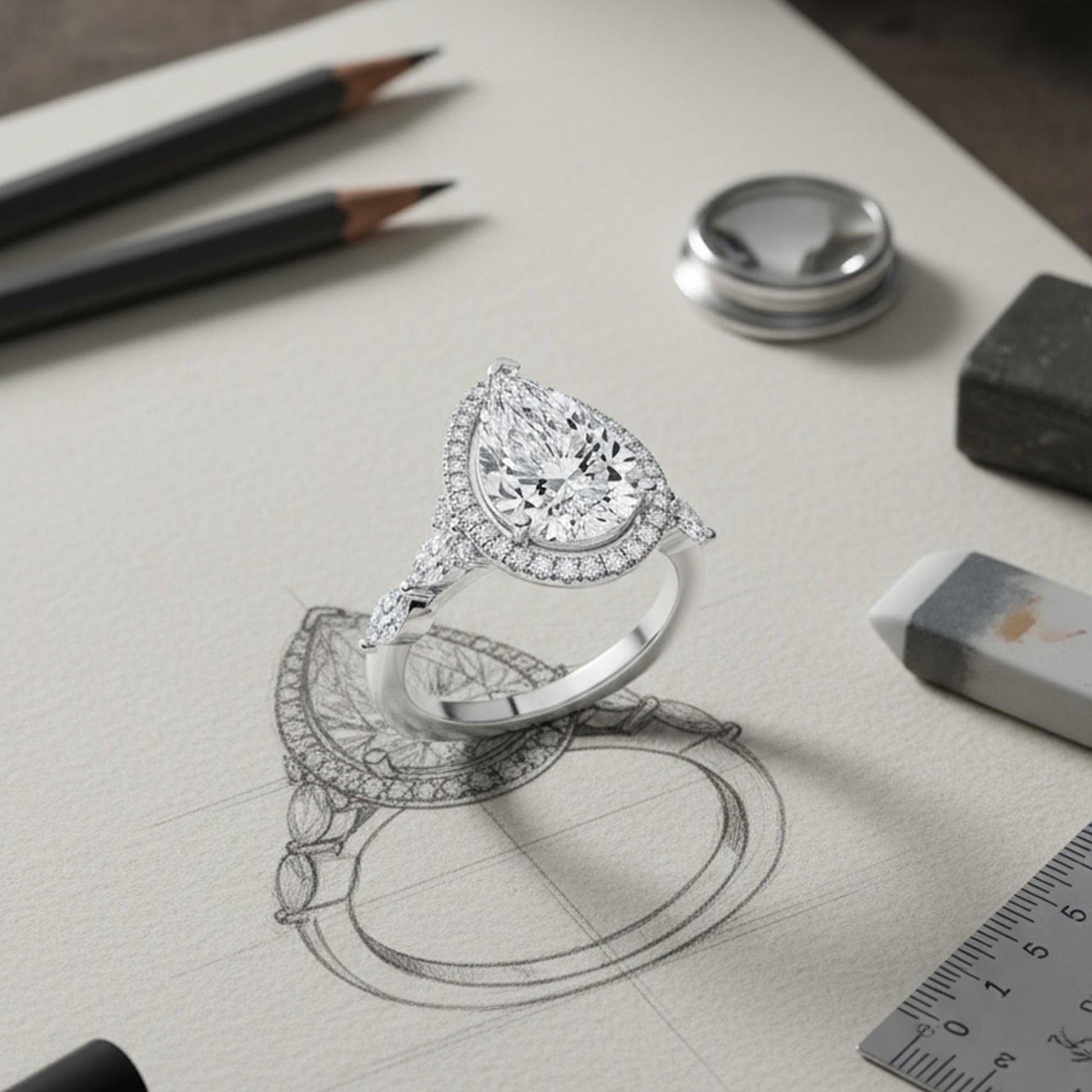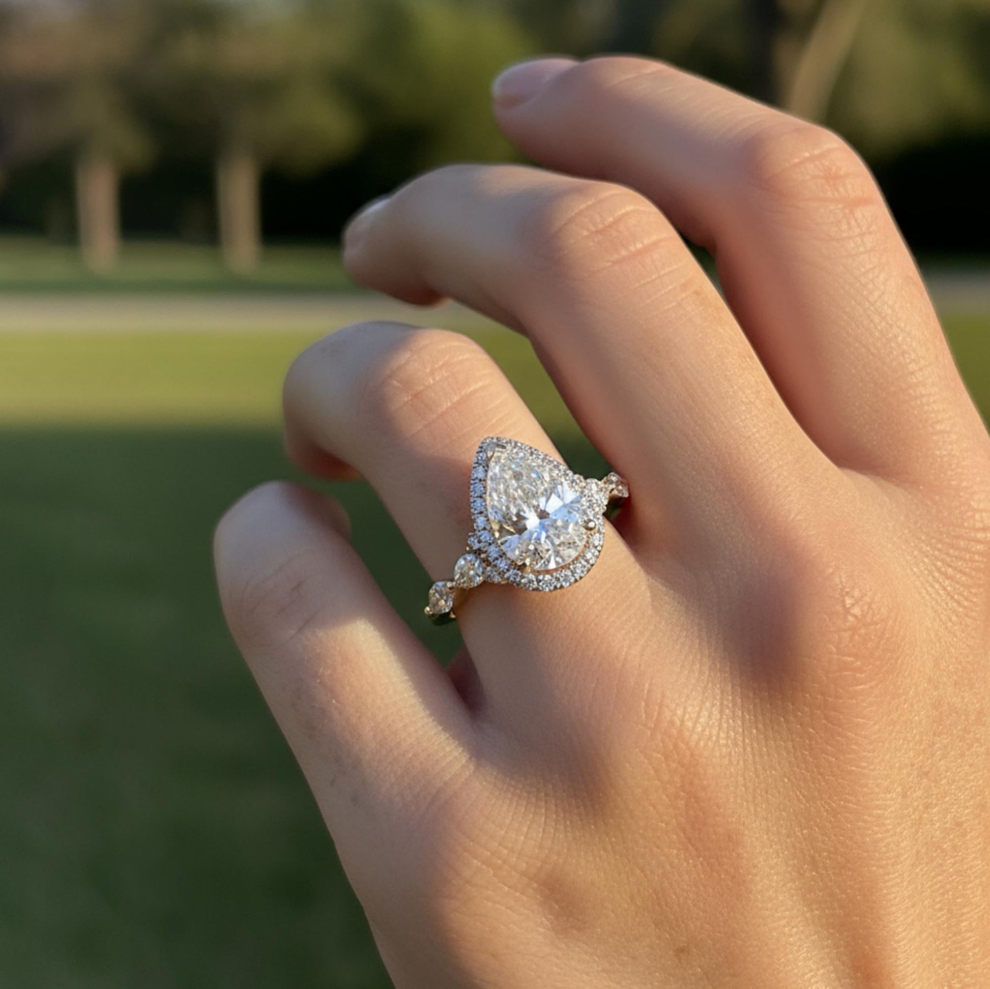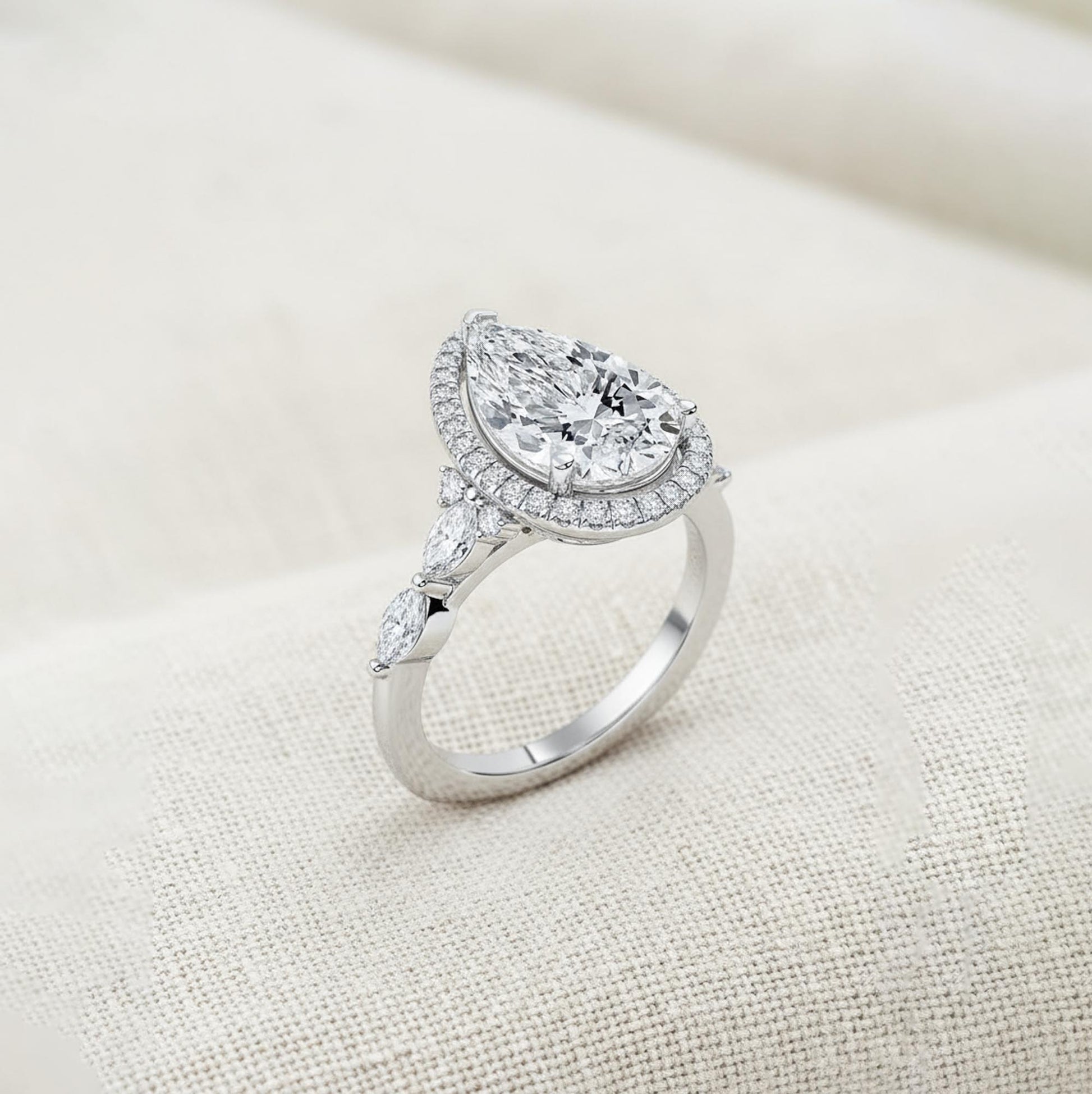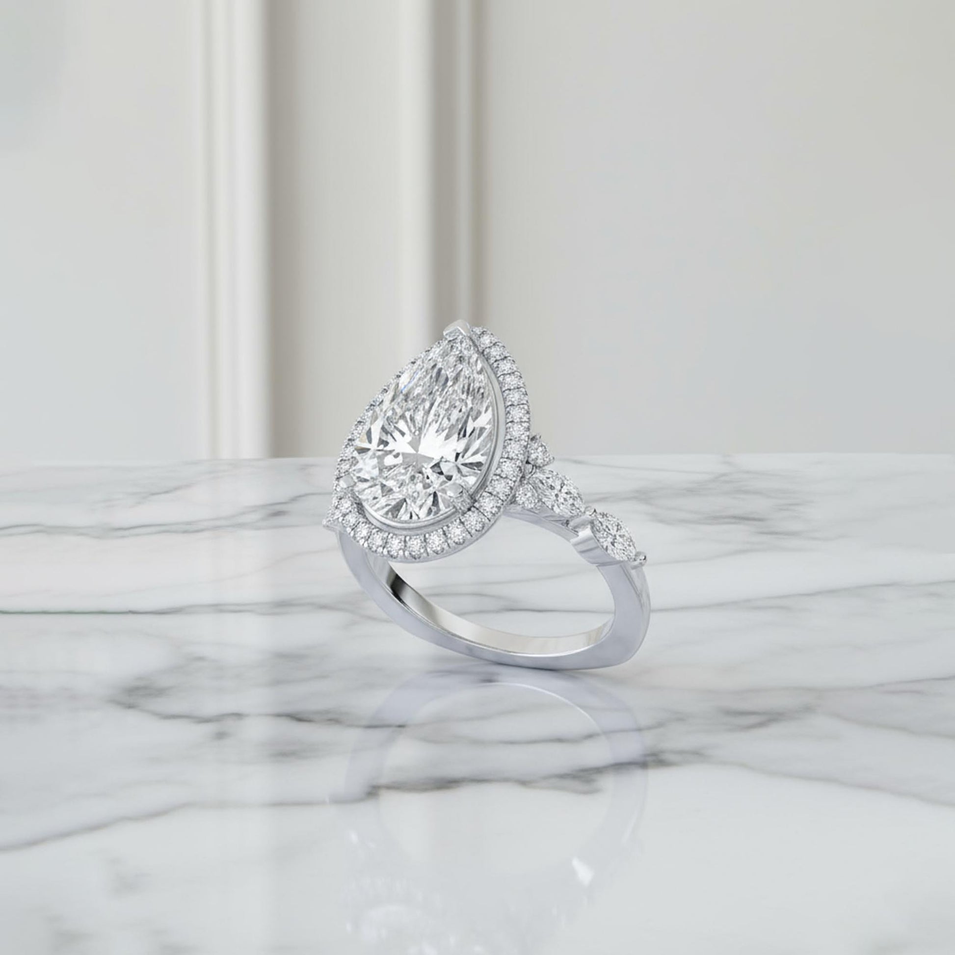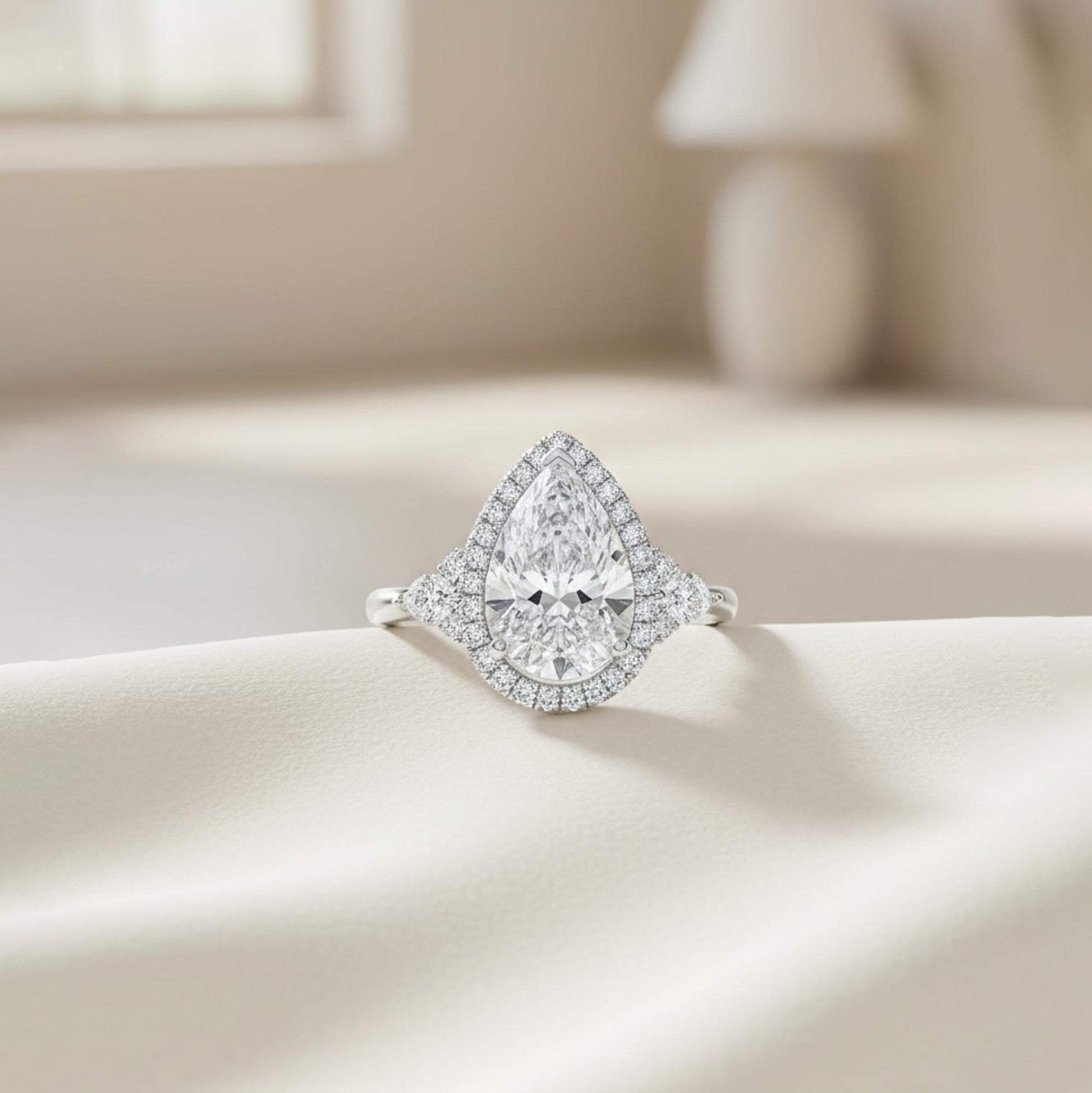 This elegant engagement ring features a captivating pear-shaped center diamond surrounded by a sparkling halo that enhances its brilliance and shape. On either side of the center stone, the band is accented with two horizontally set oval diamonds, secured with shared prongs for a seamless, refined look. A unique design that blends classic sparkle with distinctive, modern detail. The pear-shaped silhouette creates a graceful, elongated effect on the finger, while the side ovals add symmetry and sophistication. Crafted with attention to every detail, this ring is a perfect balance of timeless beauty and artistic elegance.