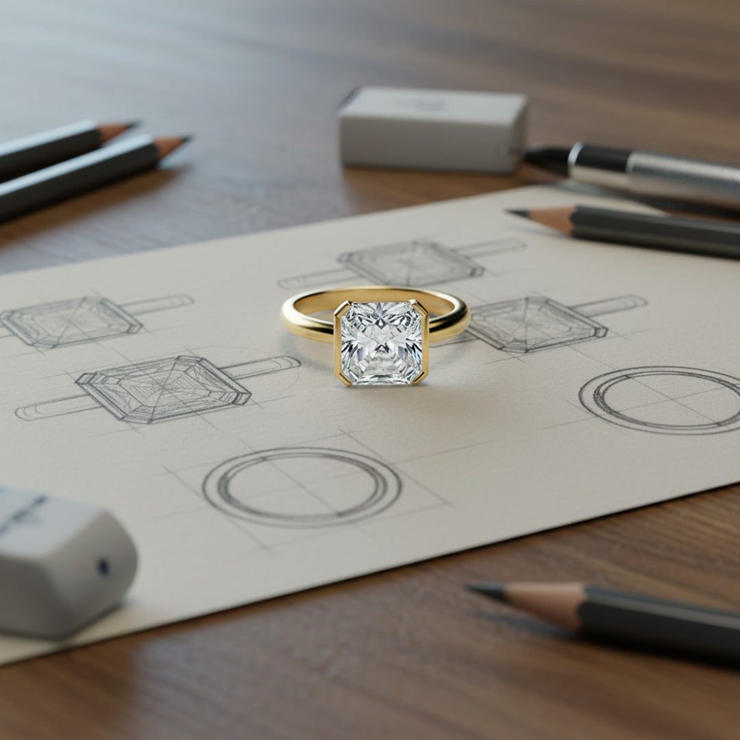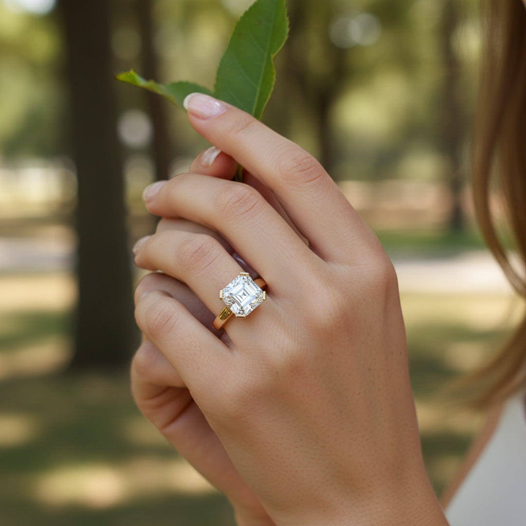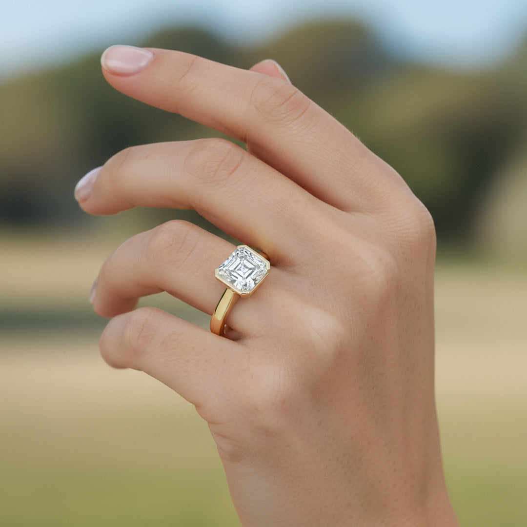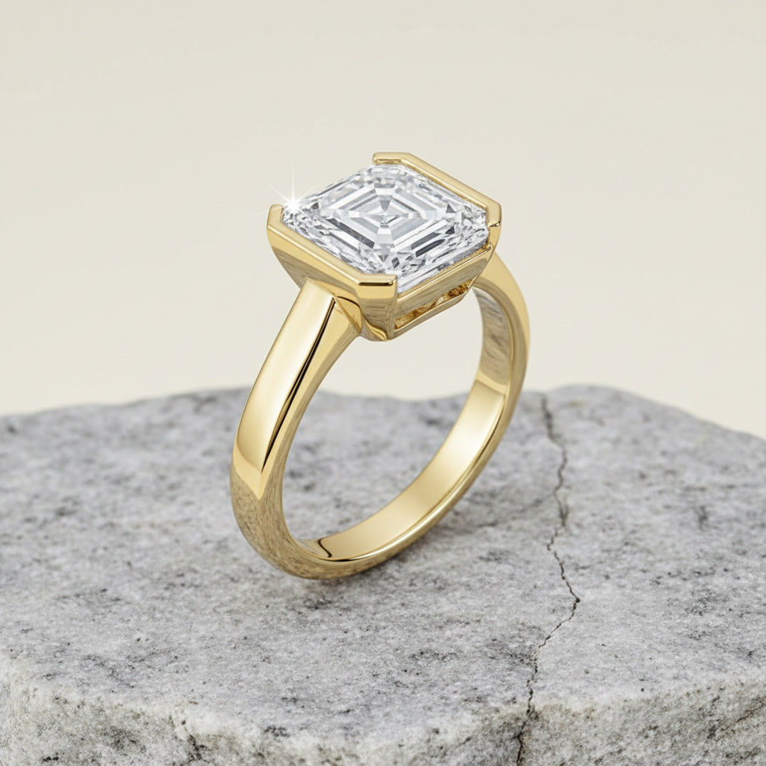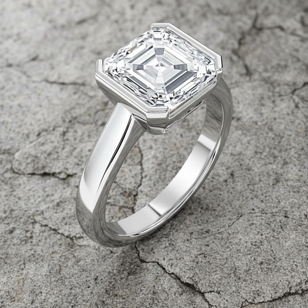 Showcase timeless sophistication with this Asscher-cut solitaire—half-bezel setting and cathedral shoulders highlight the diamond’s step-cut sparkle with sleek, architectural elegance