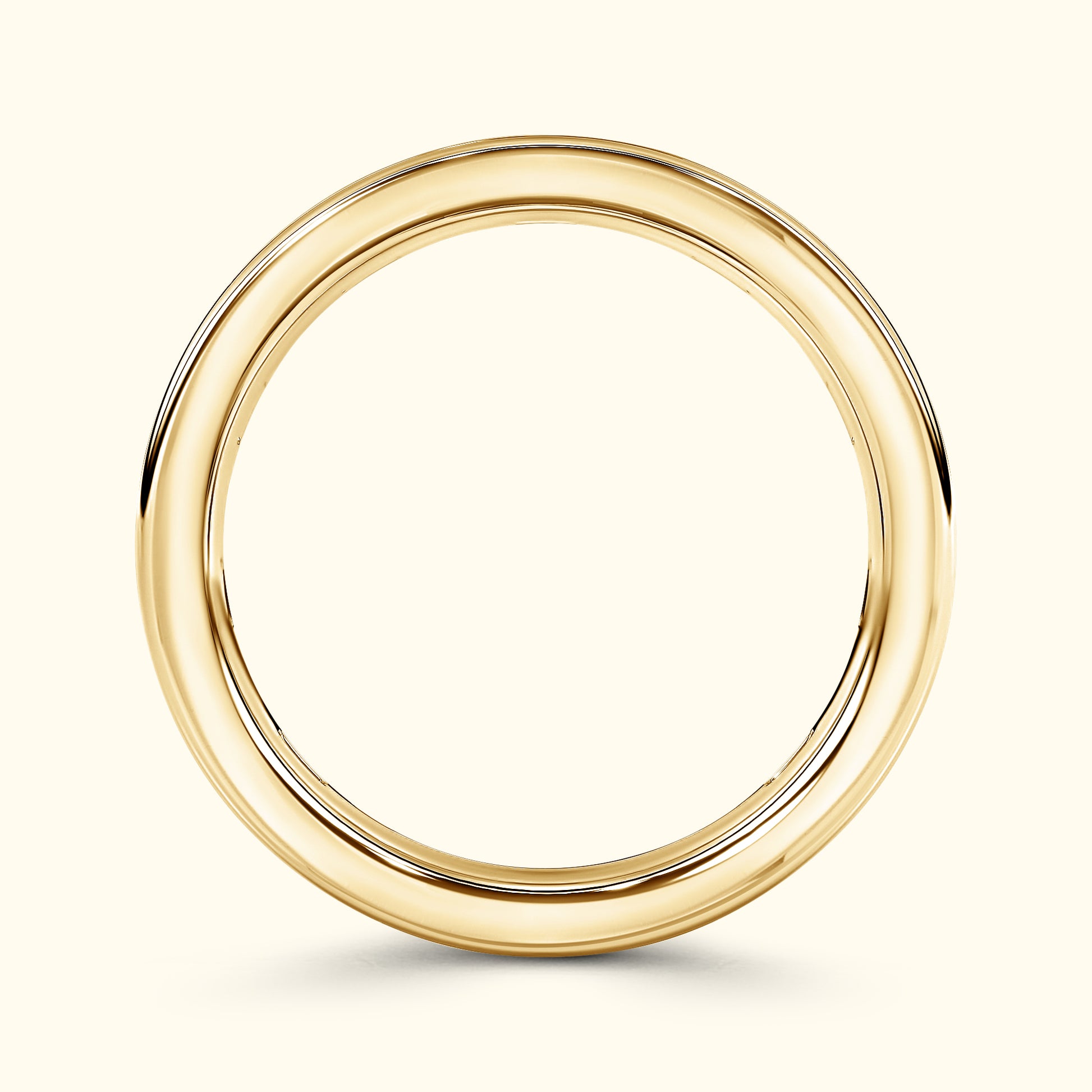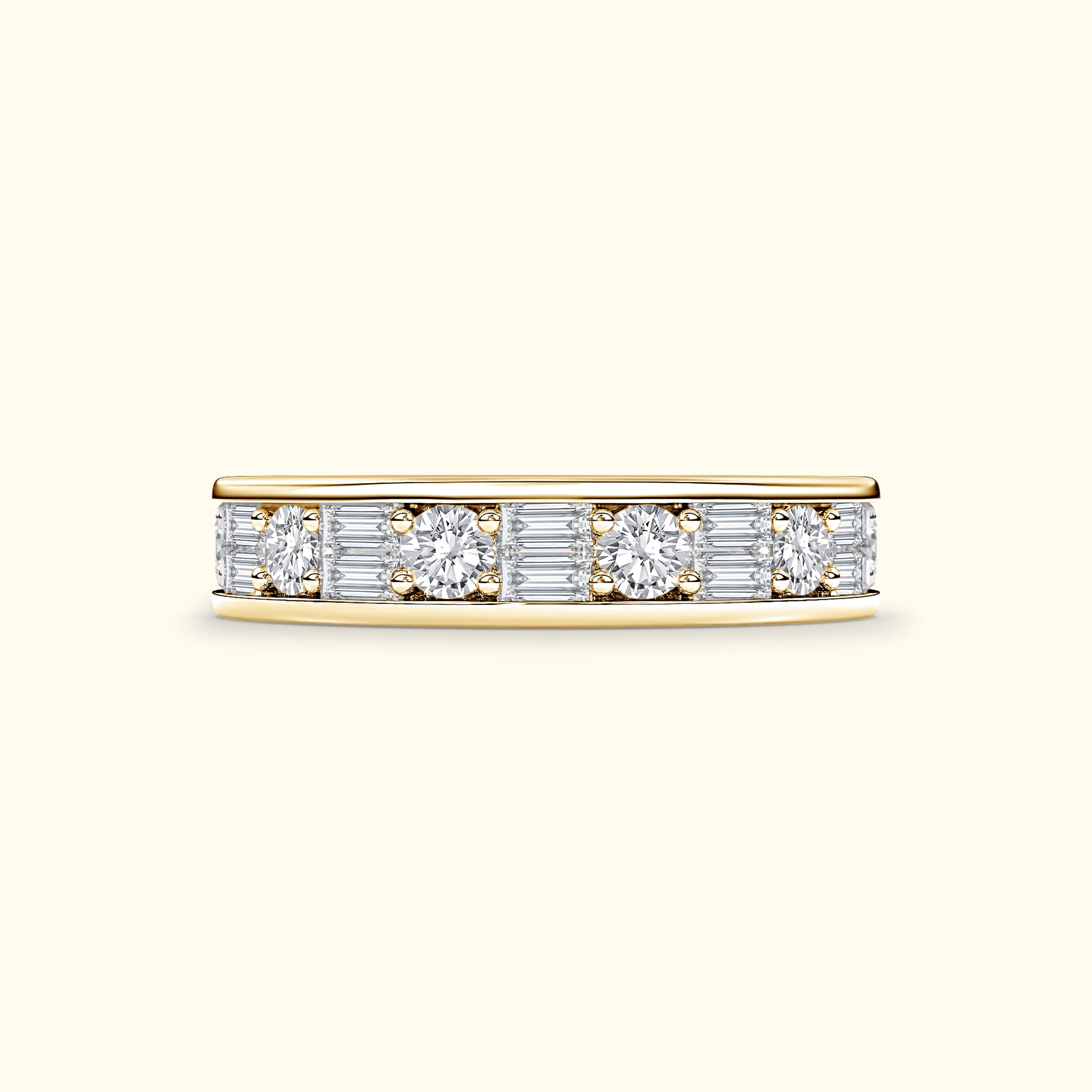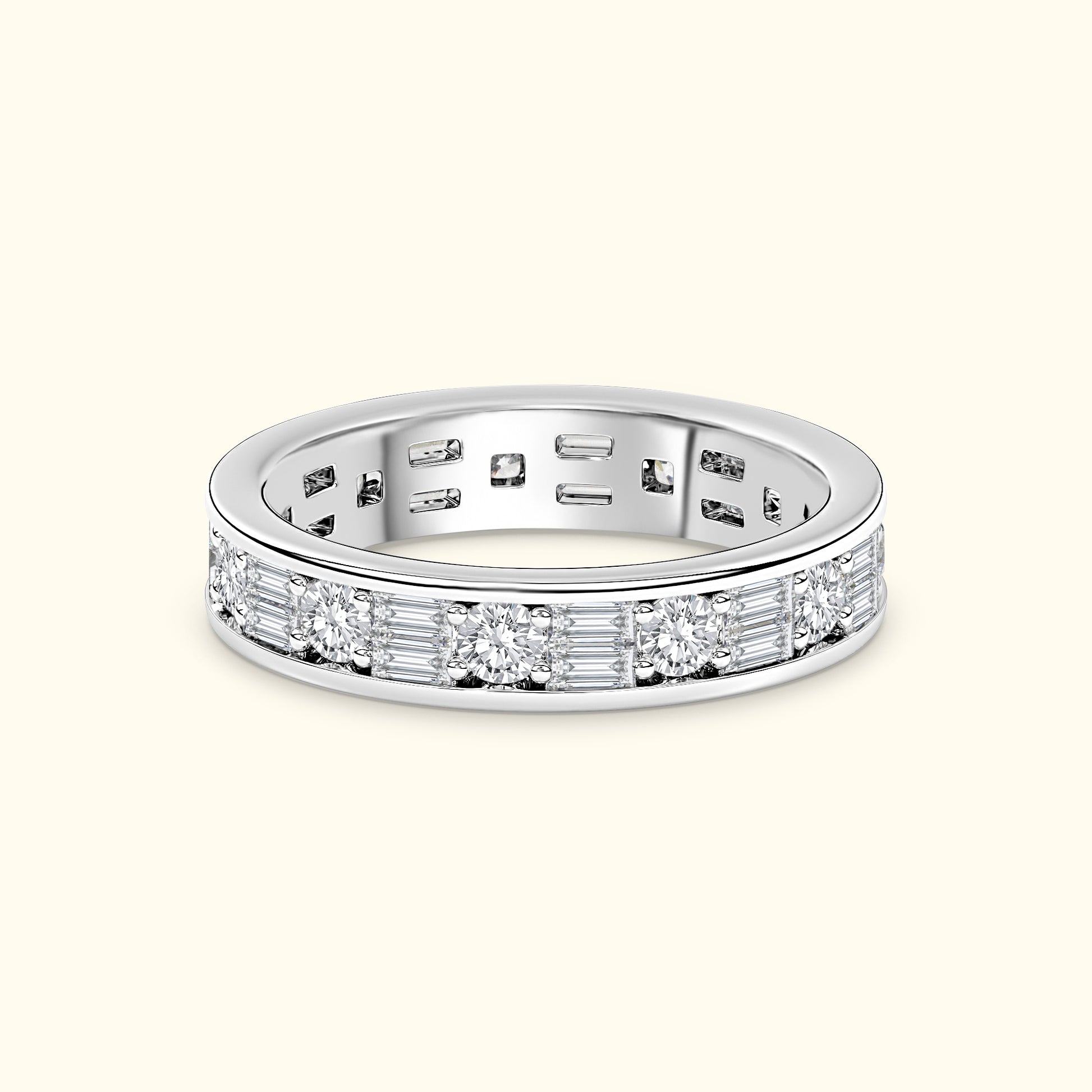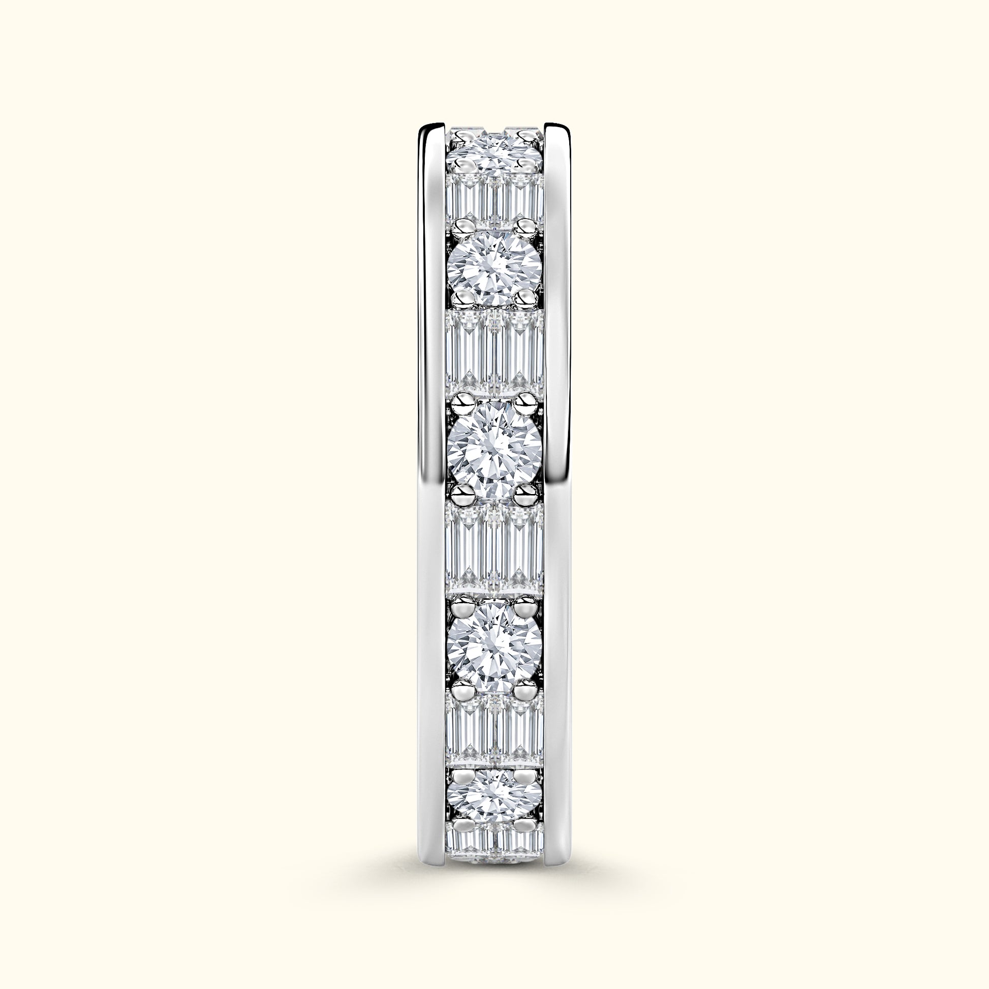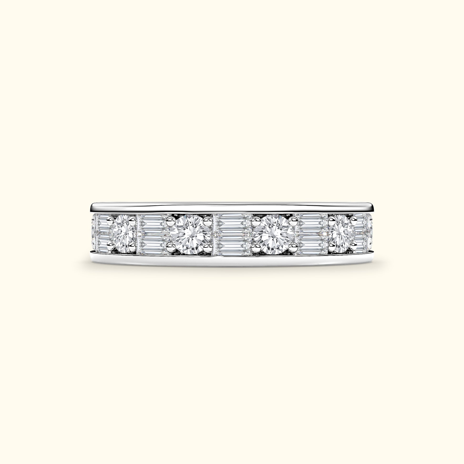This modern band combines 3.00 carats of baguette and round diamonds in a channel setting, with tapered baguettes creating sleek lines and round stones adding radiant sparkle.