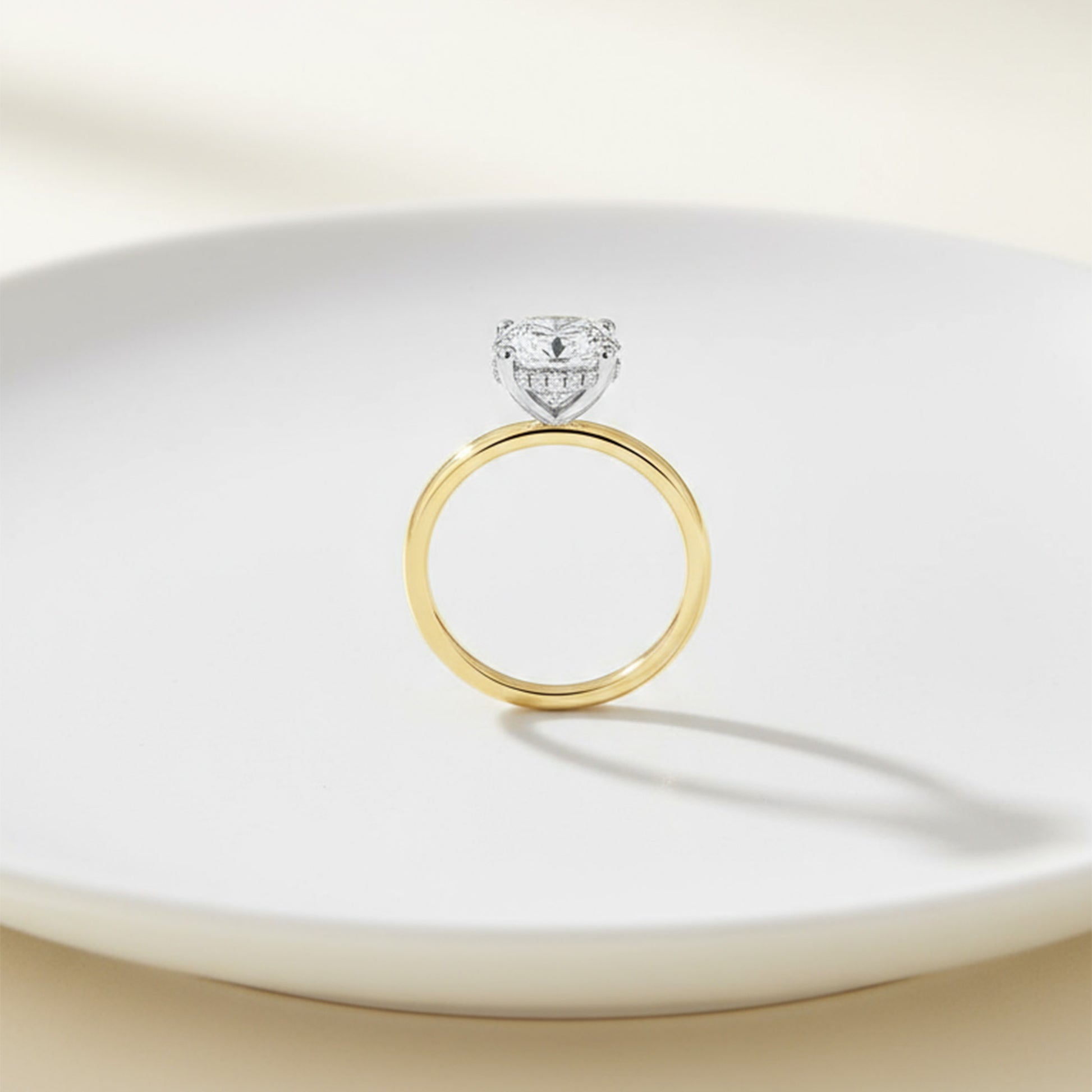 This exquisite solitaire engagement ring features a stunning central stone, elegantly highlighted by a hid... Show more