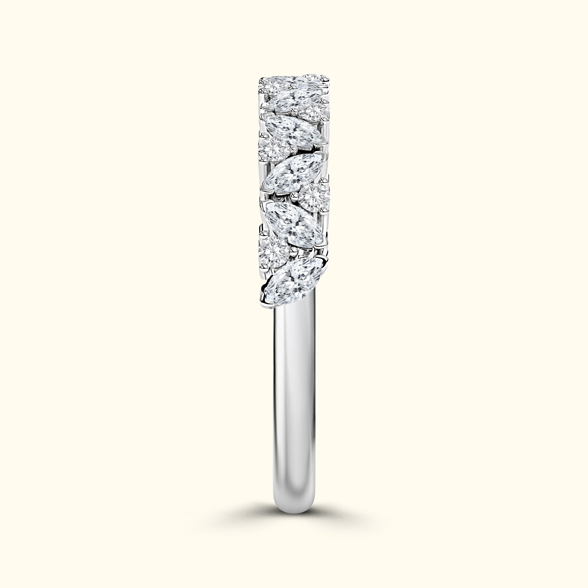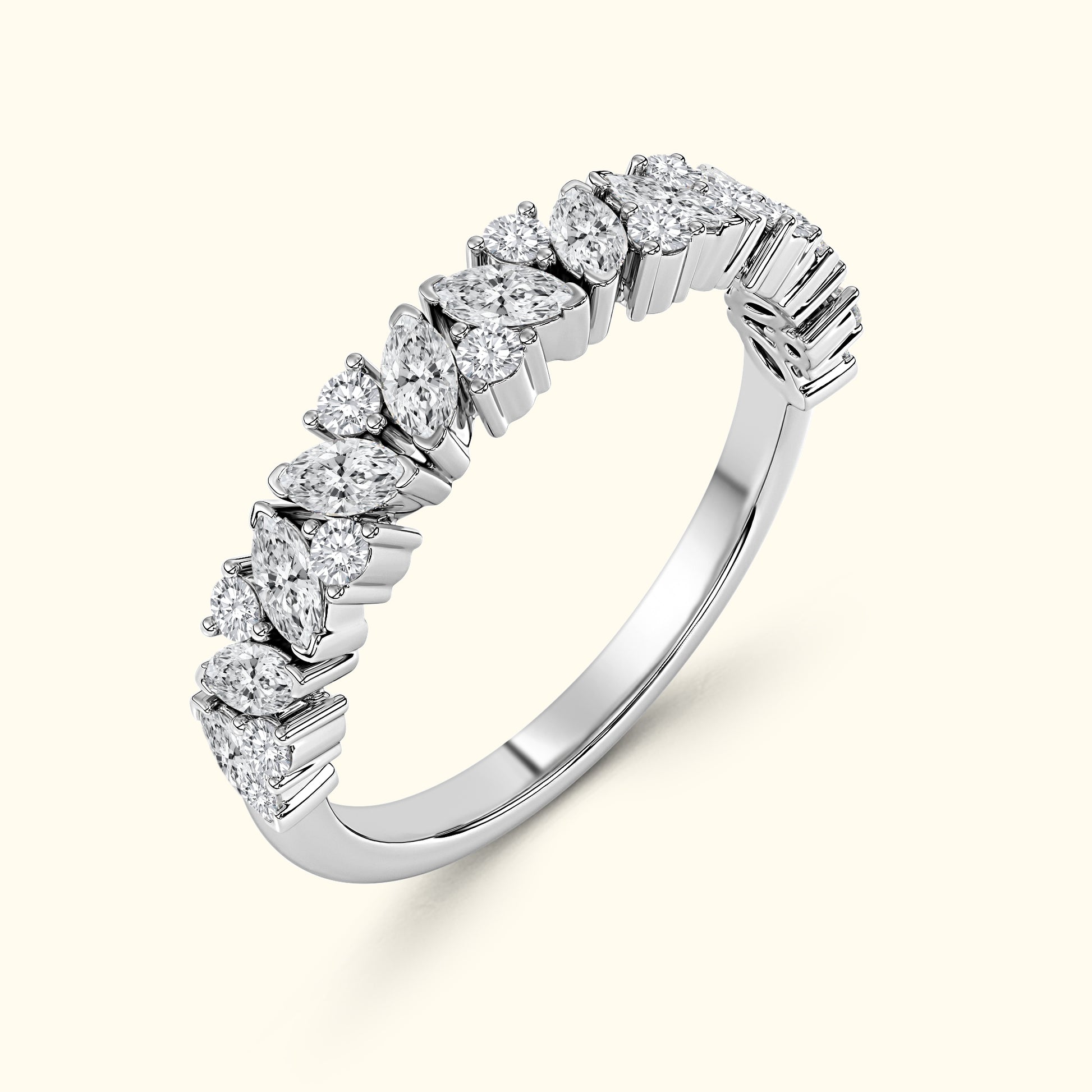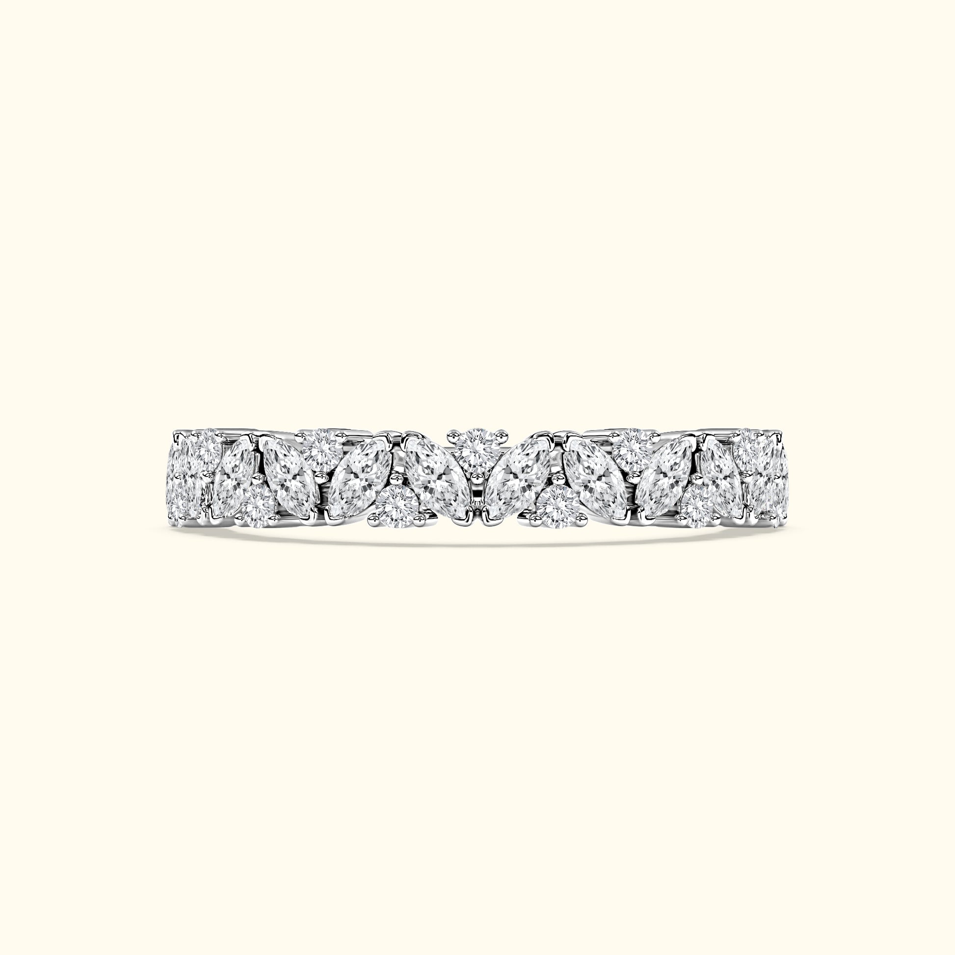 This layered wedding band features marquise and round diamonds totaling 1.50 carats, creating a sparkling, textured design that pairs beautifully with an engagement ring.