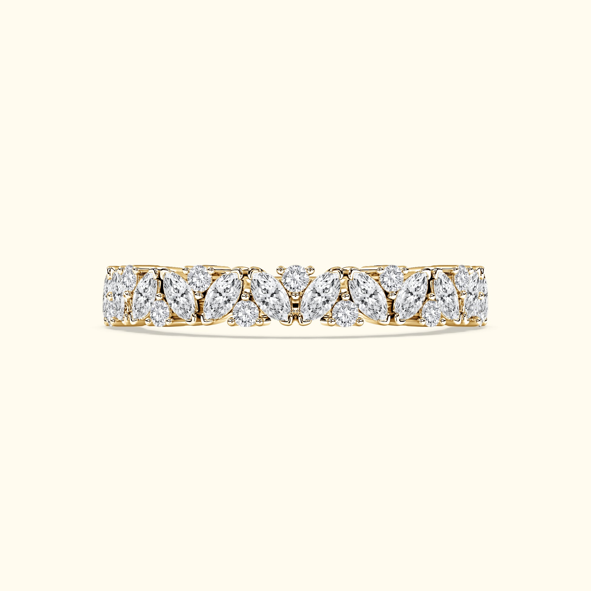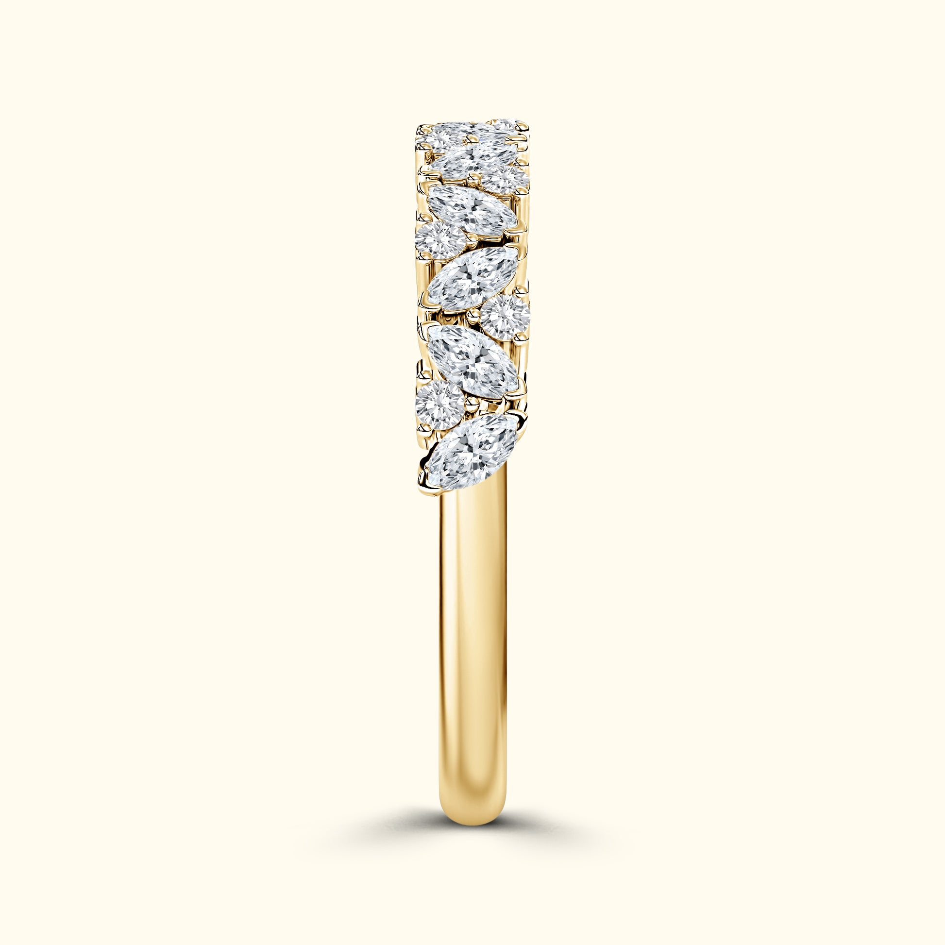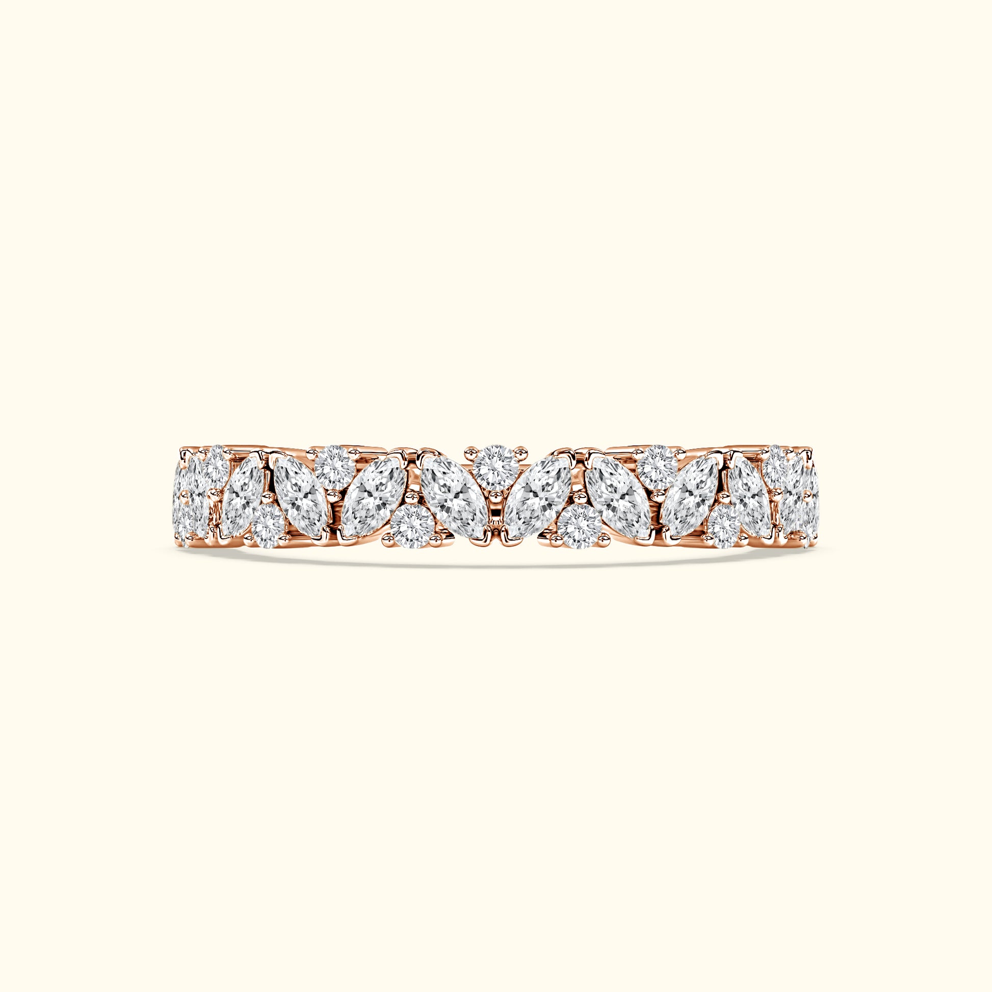 This layered wedding band features marquise and round diamonds totaling 1.50 carats, creating a sparkling, textured design that pairs beautifully with an engagement ring.