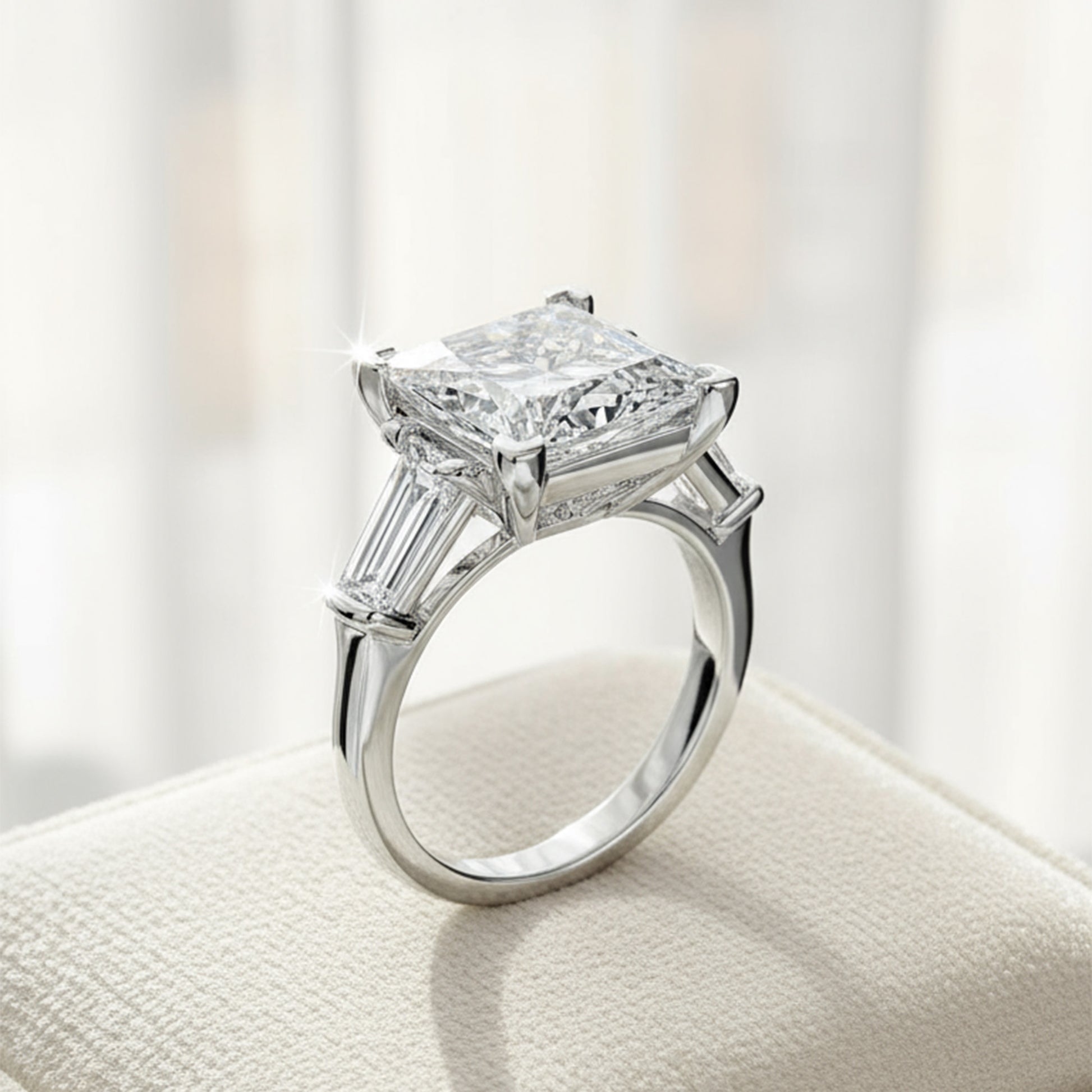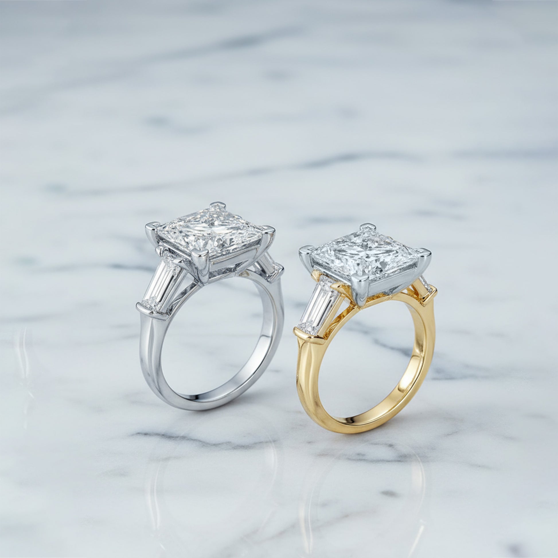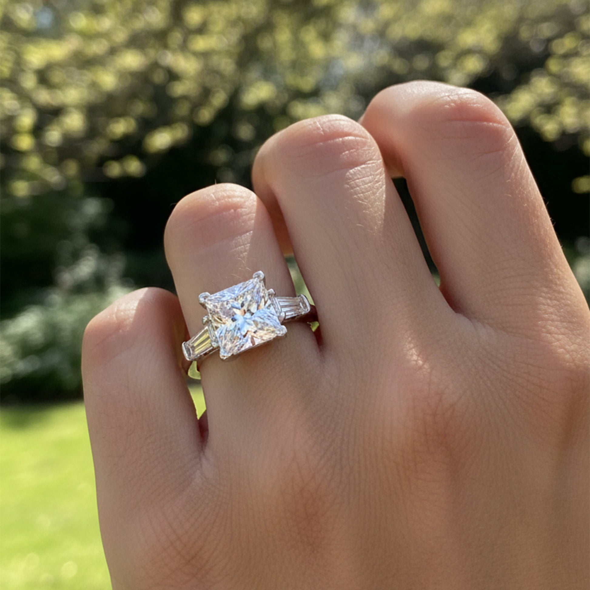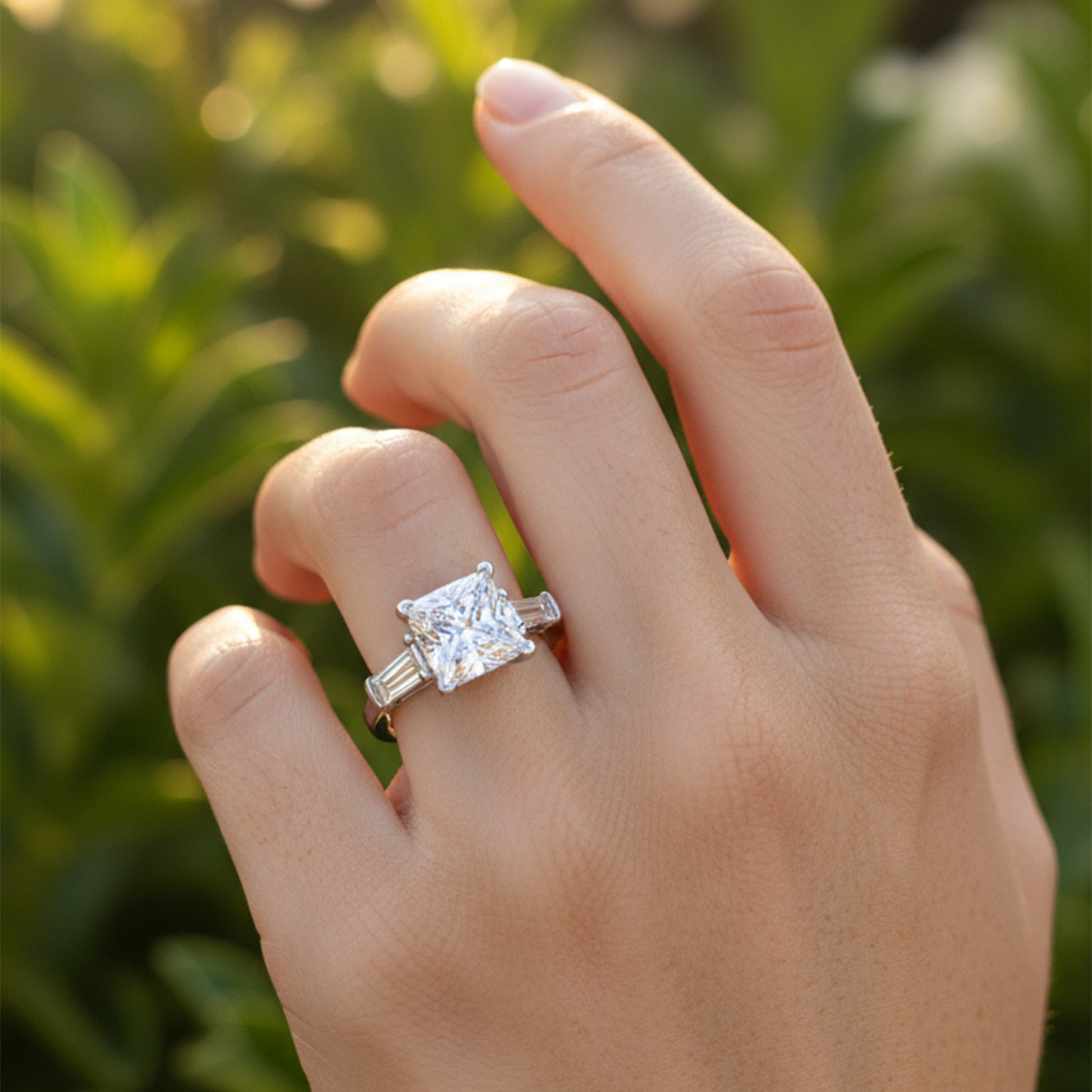 Elegant and timeless, this princess cut diamond engagement ring features a dazzling center stone flanked by two tapered baguette side diamonds. Set in a sleek band, the clean lines and brilliant sparkle create a sophisticated look that's both modern and classic - the perfect symbol of everlasting love.