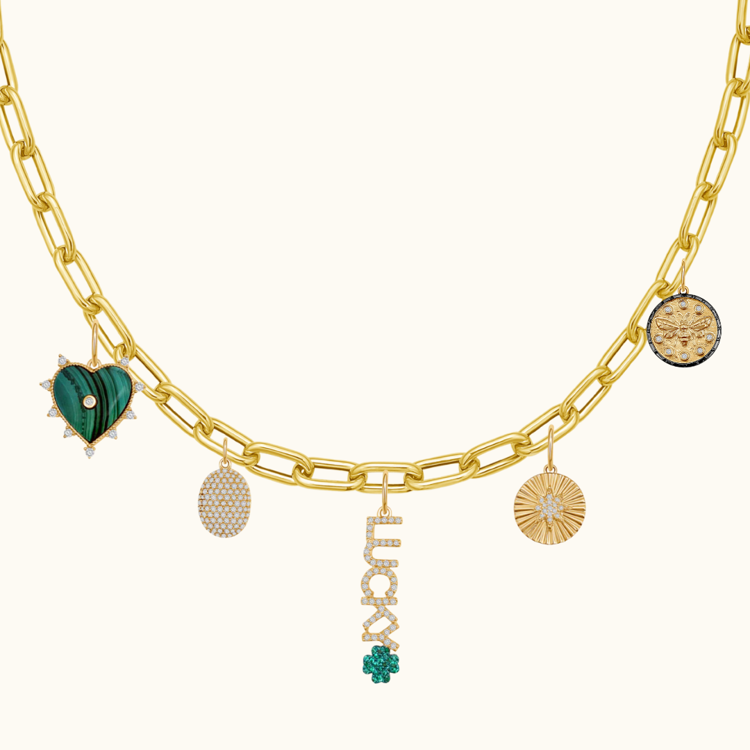 Lucky looks good on you! Spell it out in style! Our "LUCKY" letter pendant brings the charm—literally—with sparkling letters and a vibrant green emerald clover to top it all off. It’s bold, bright, and your new favorite good luck charm. Wear it, wish big, and let the magic follow.