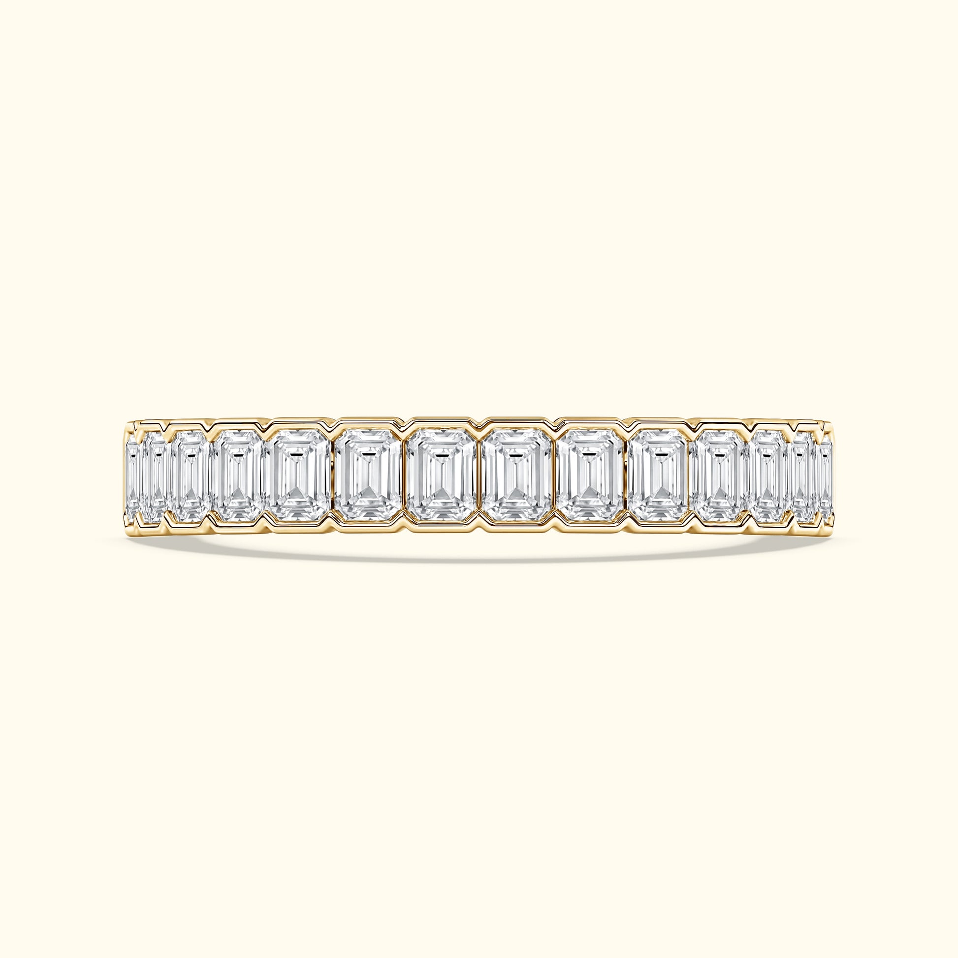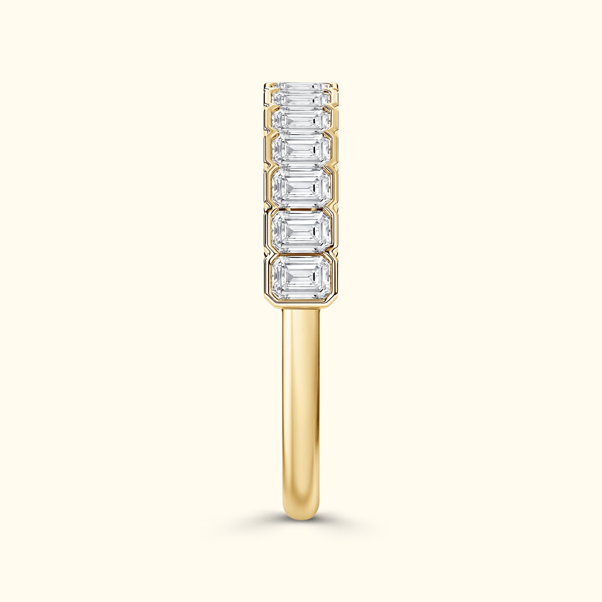 This sleek band features a row of emerald-cut diamonds, set for seamless geometric sparkle. The elongated facets create a refined, mirror-like shine against polished gold.