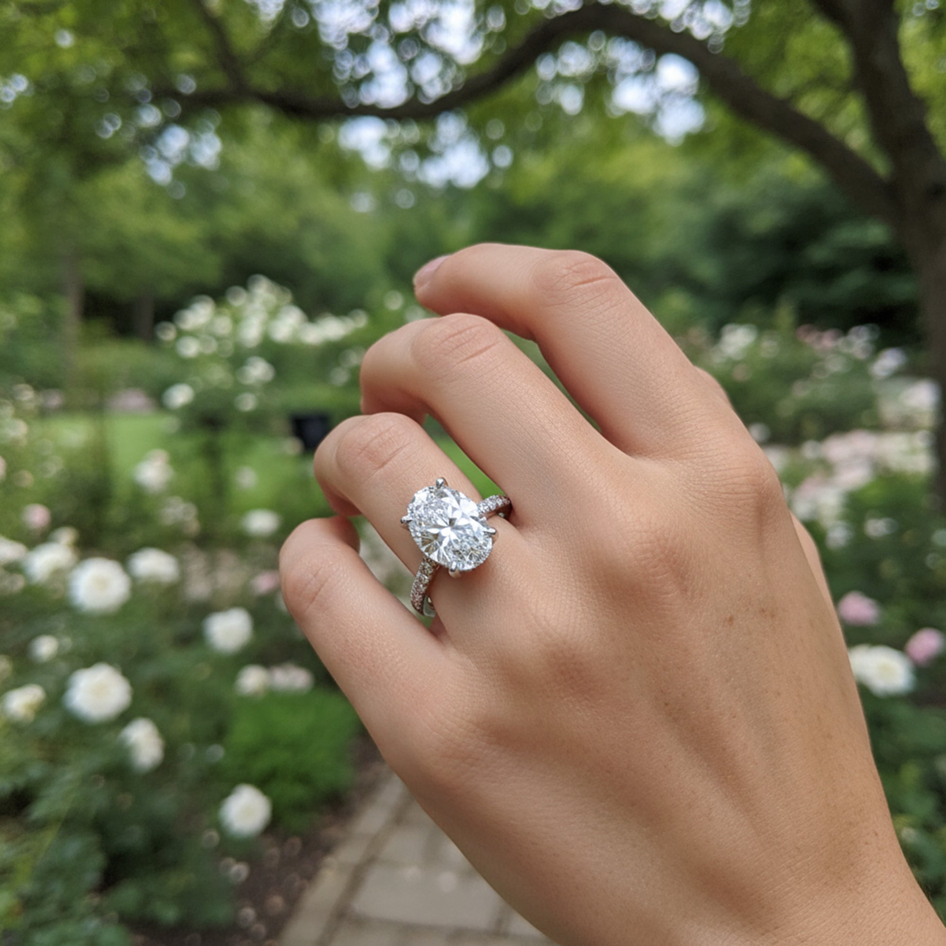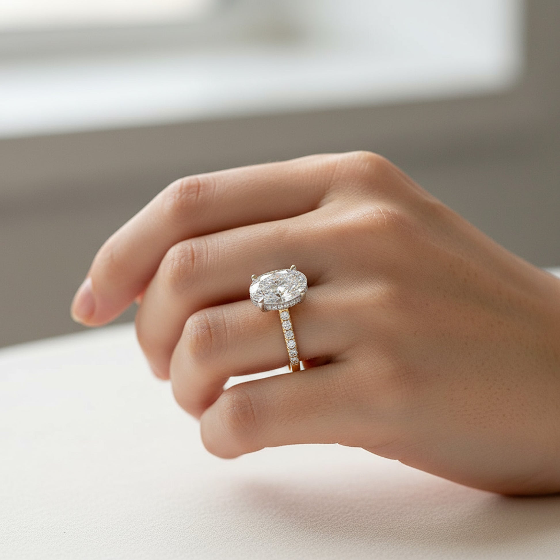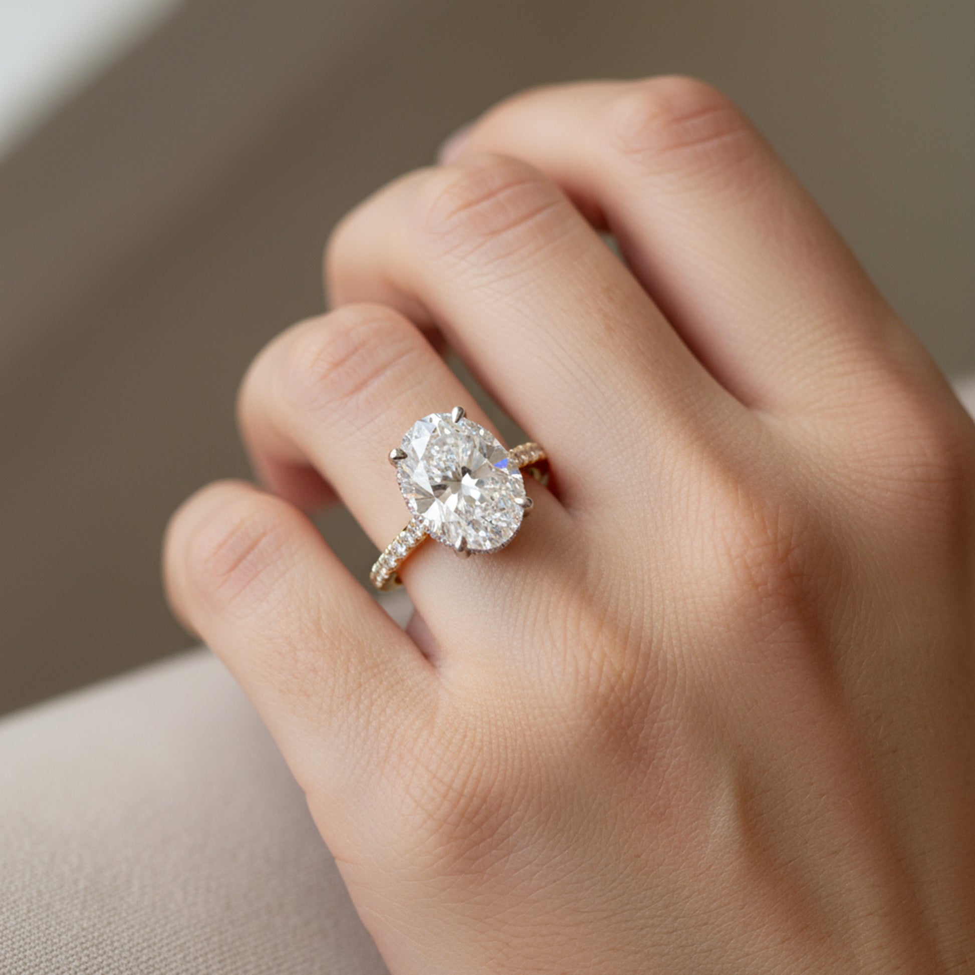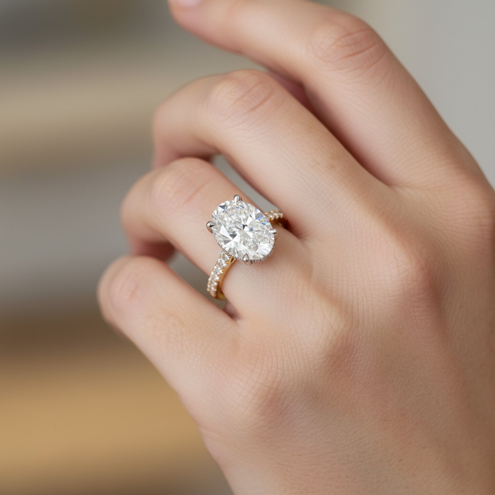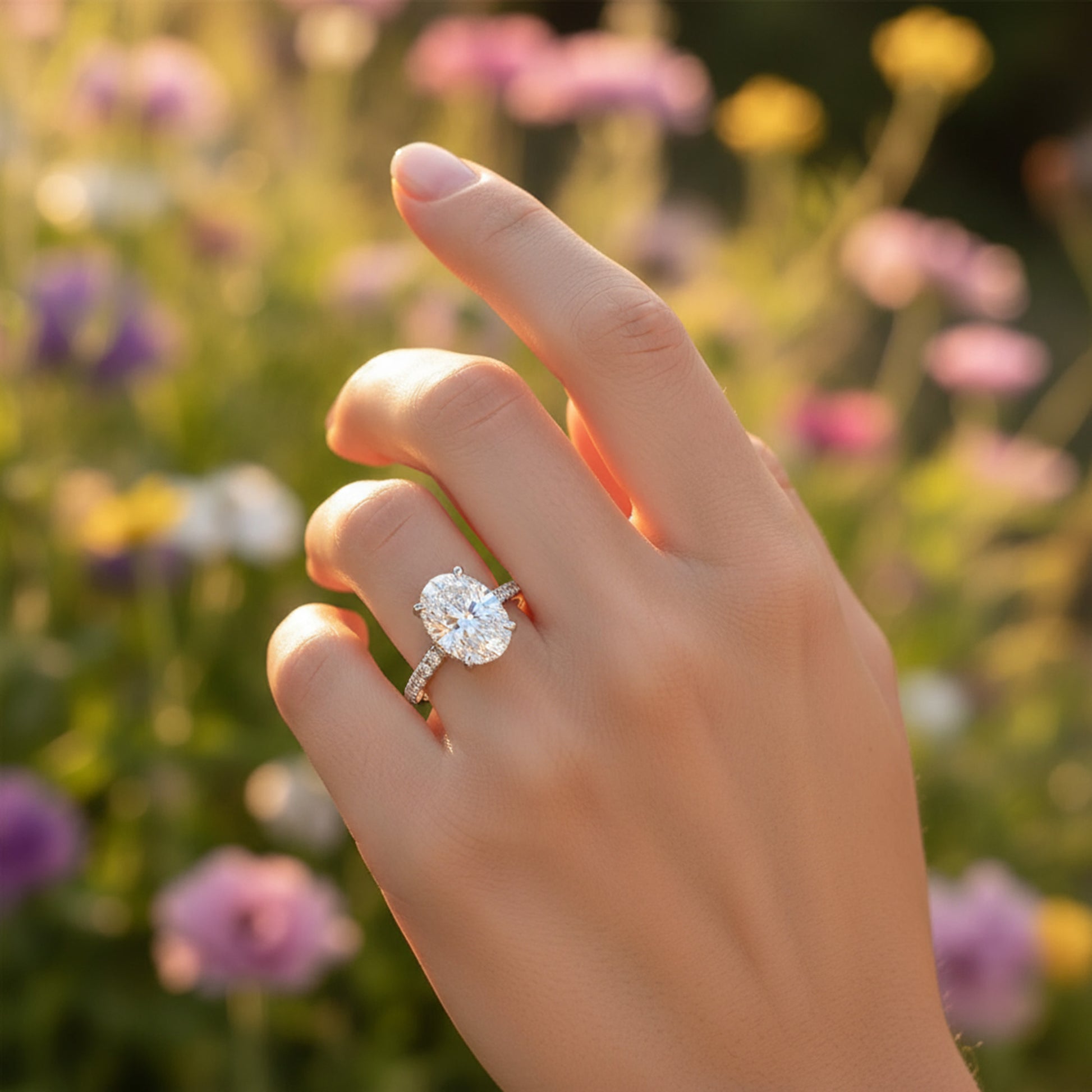 Elegant and sophisticated, this oval diamond engagement ring features a stunning cathedral-style setting that lifts the center stone in graceful arches. A hidden underhalo adds a subtle touch of sparkle beneath the oval diamond, while a band adorned with shimmering accent diamonds completes the timeless design. A perfect blend of classic beauty and modern detail.