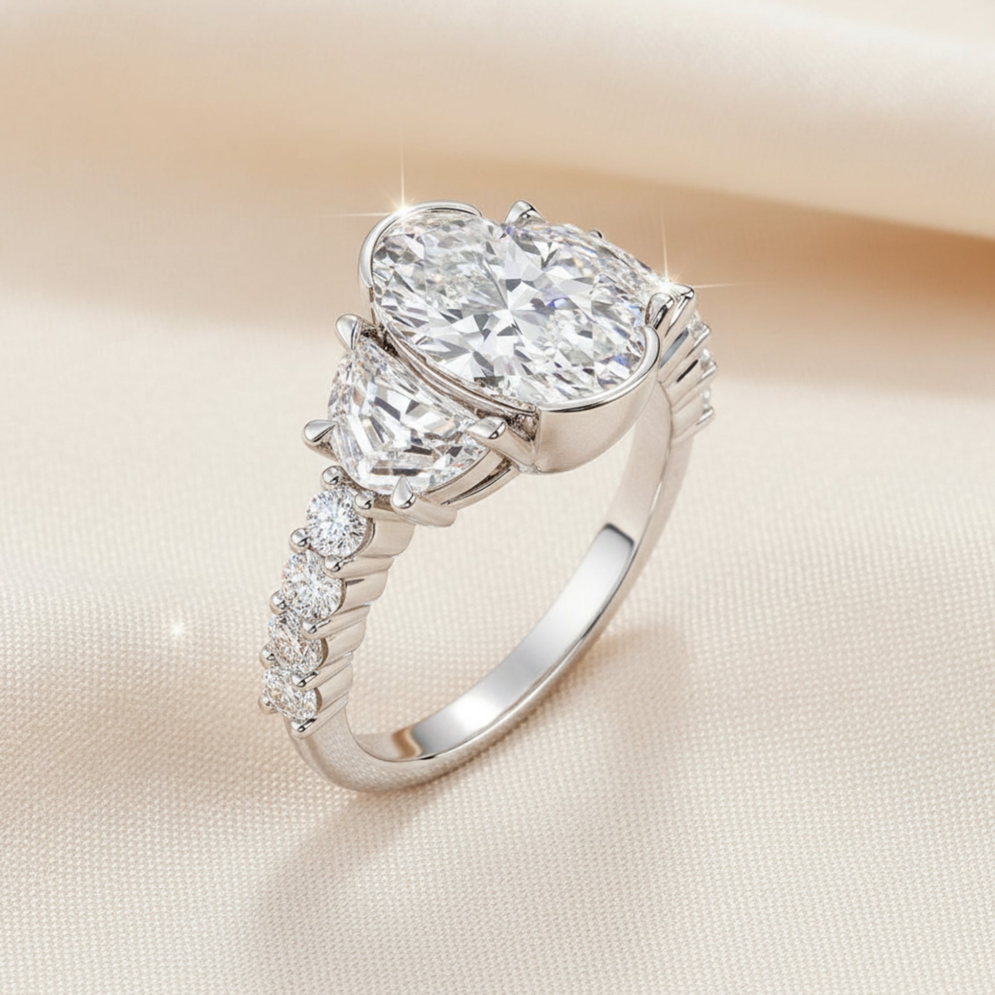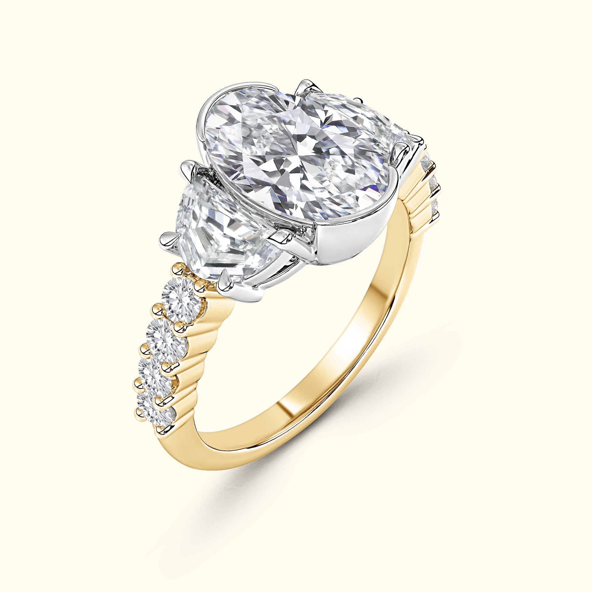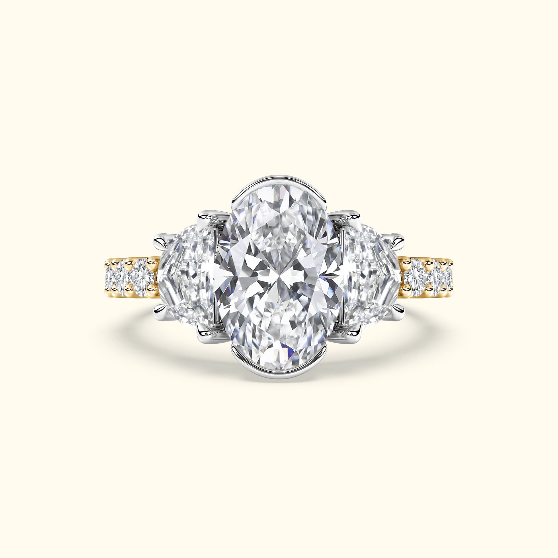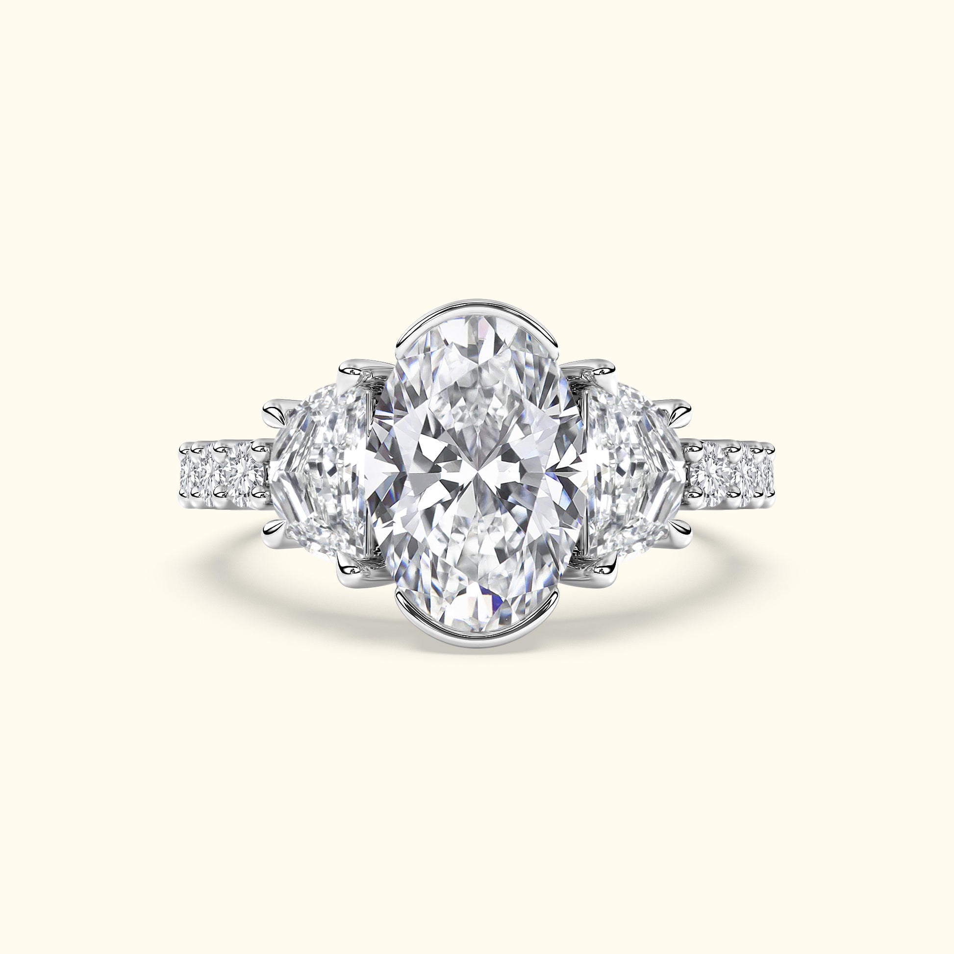 A captivating half bezel set oval-cut center diamond is framed by half-moon side stones, creating a graceful balance of brilliance and symmetry. Round brilliant diamonds along the shank complete the design with a radiant sparkle from every angle — a timeless symbol of elegance and love