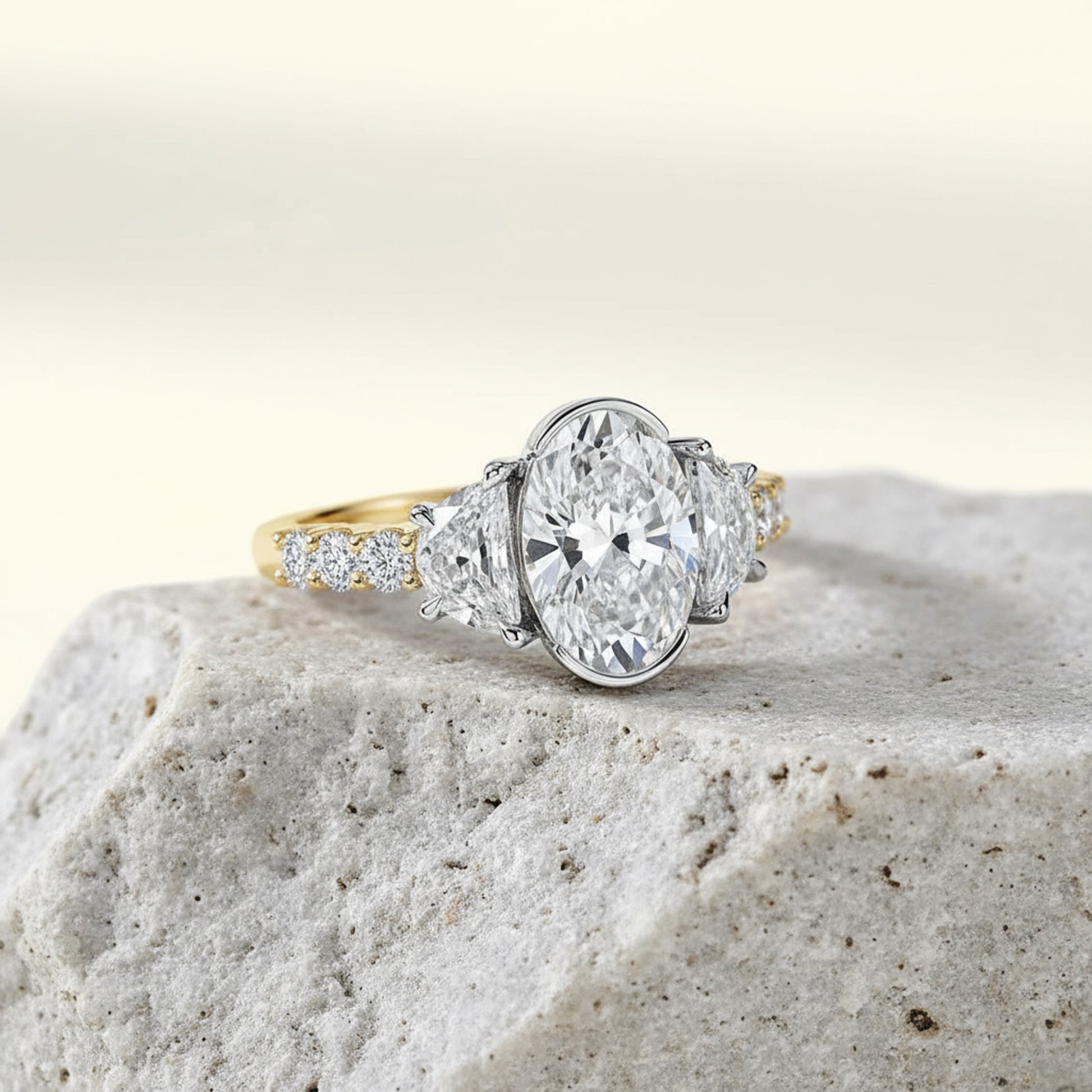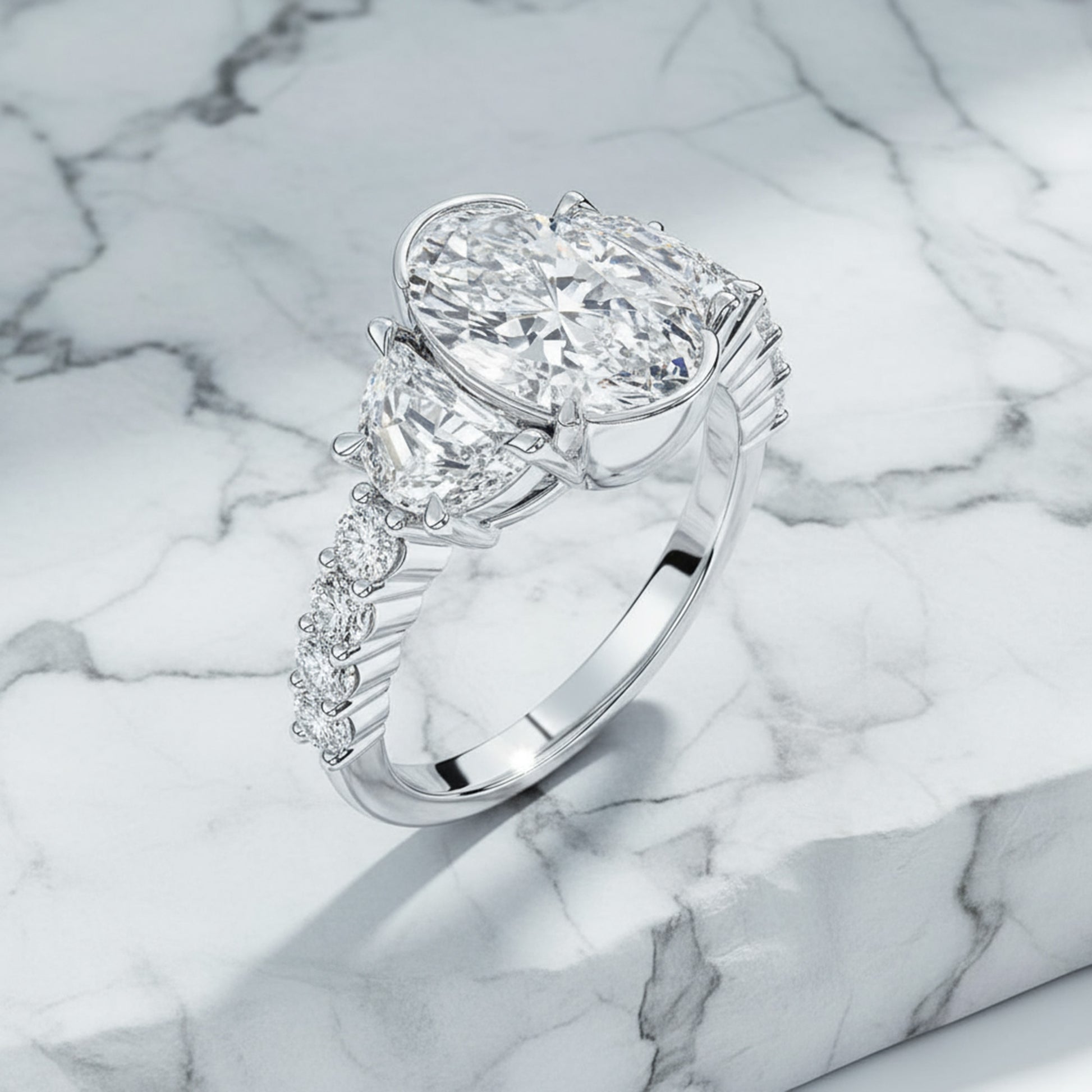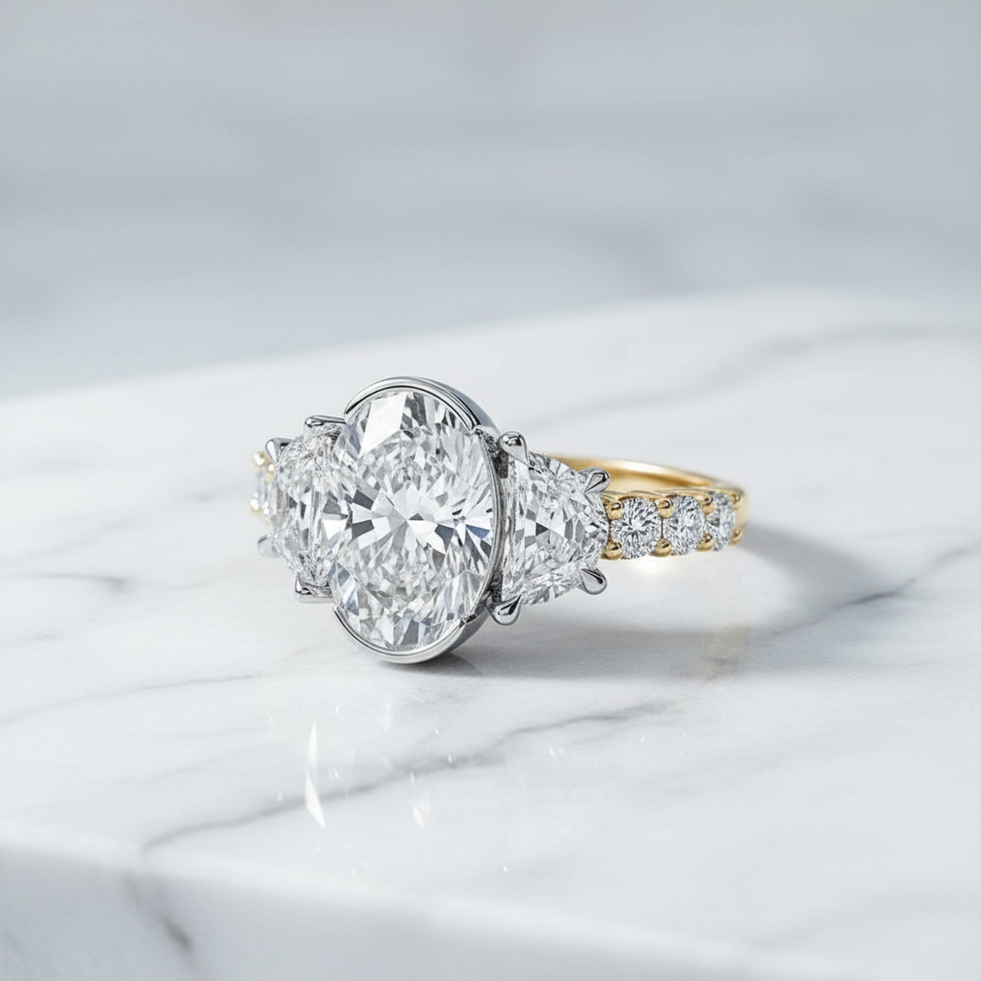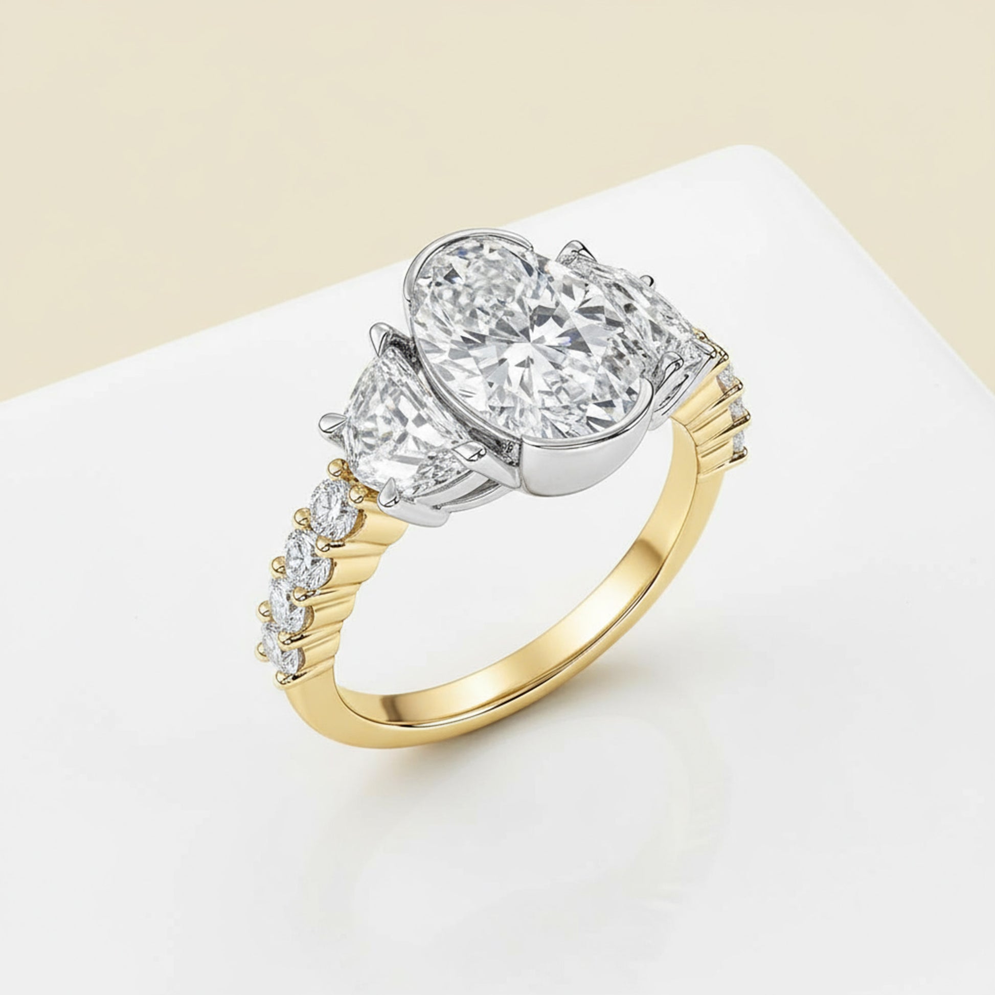 A captivating half bezel set oval-cut center diamond is framed by half-moon side stones, creating a graceful balance of brilliance and symmetry. Round brilliant diamonds along the shank complete the design with a radiant sparkle from every angle — a timeless symbol of elegance and love