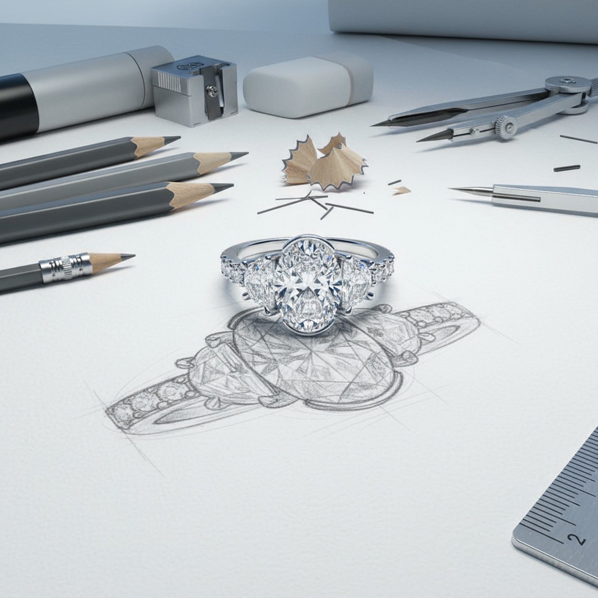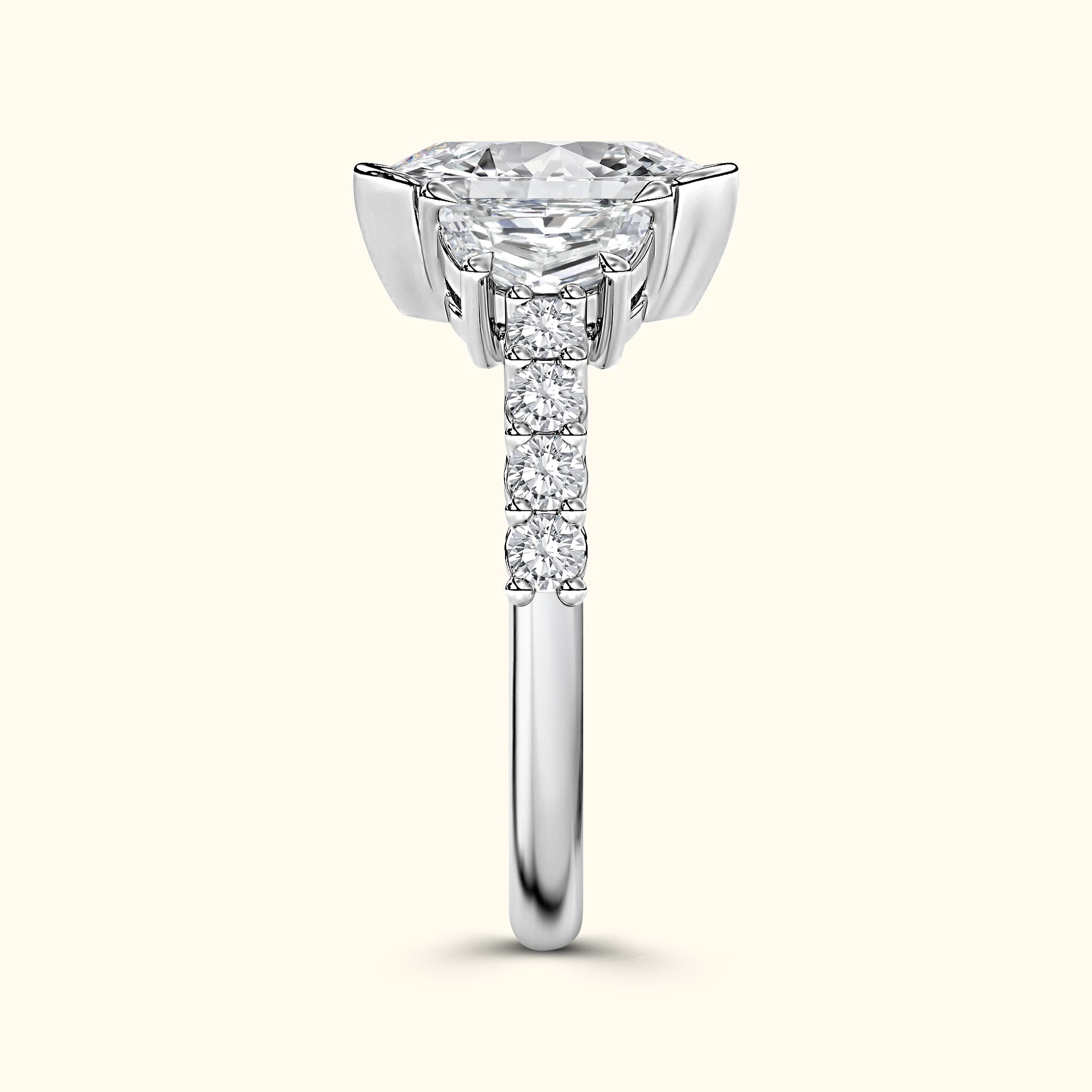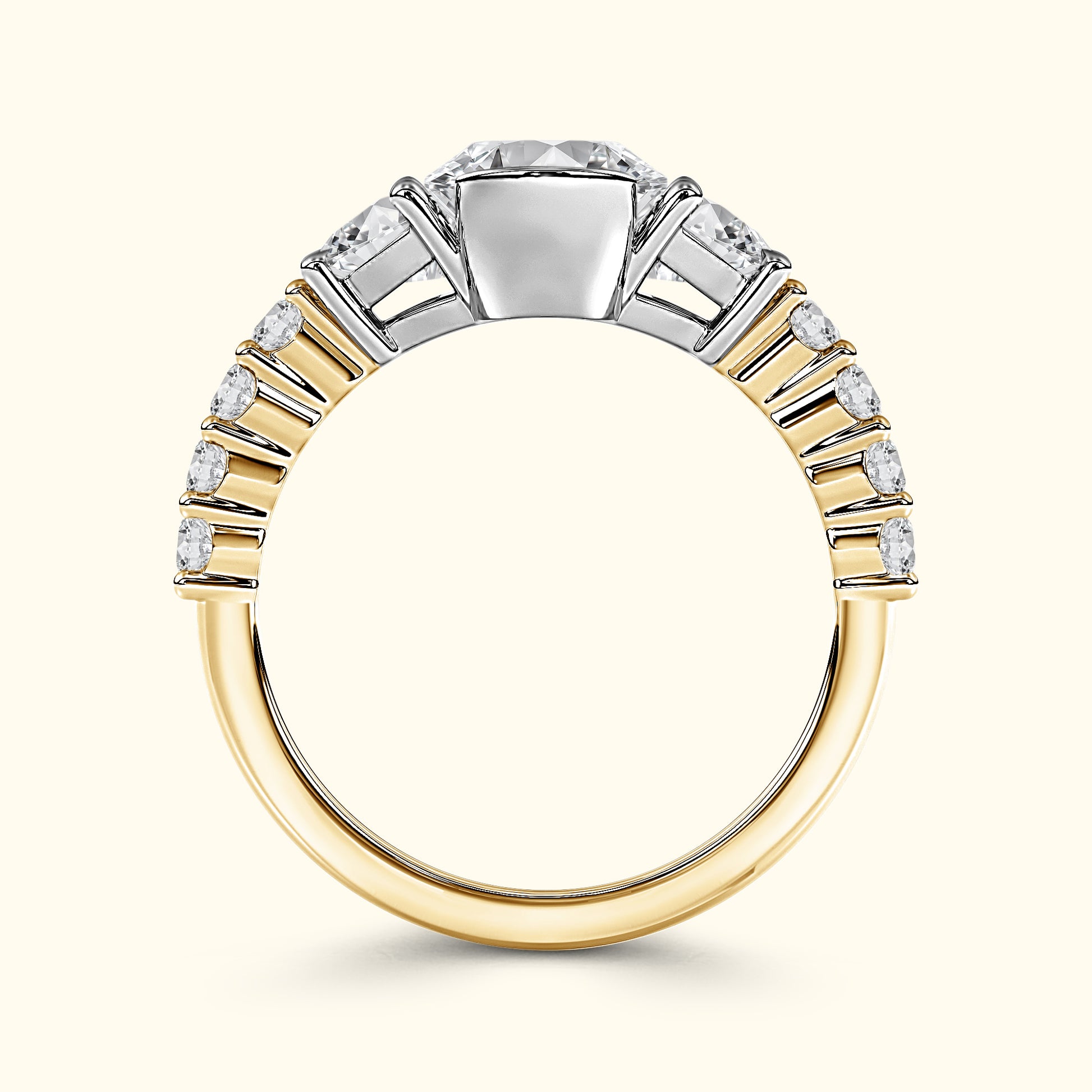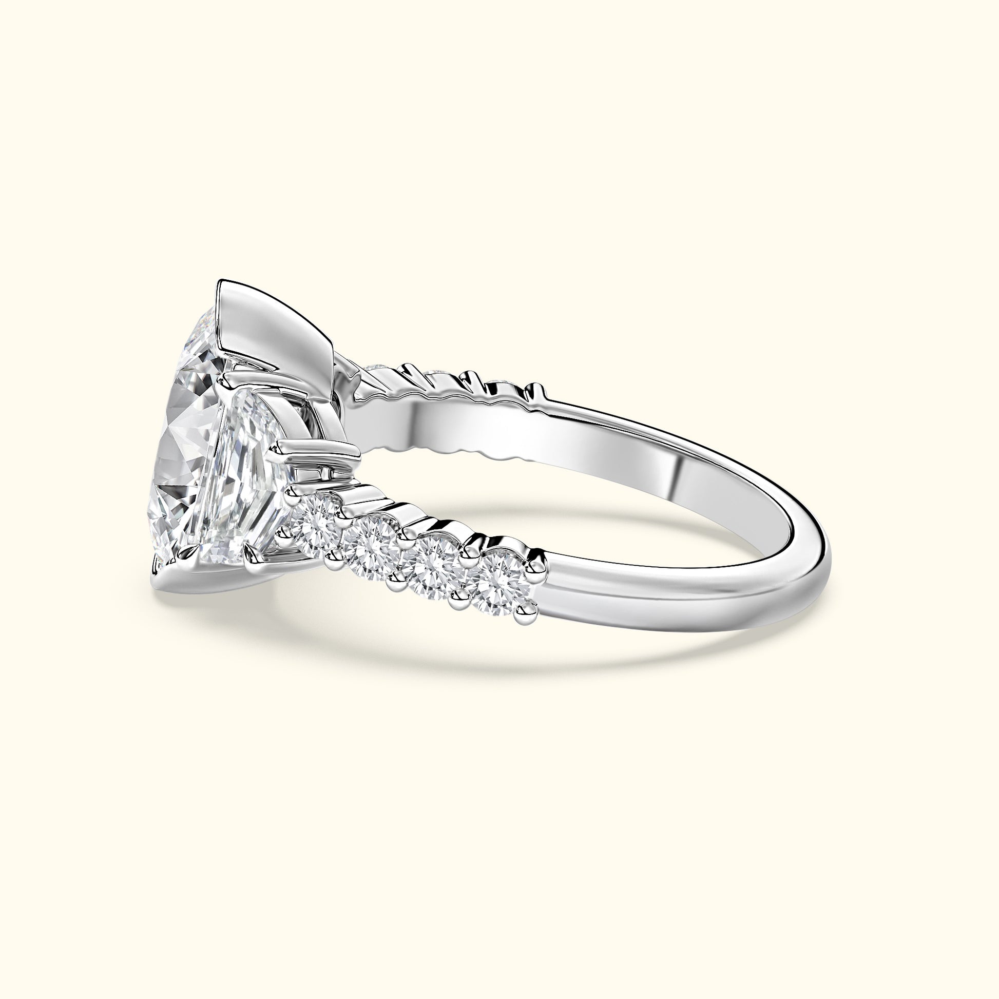 A captivating half bezel set oval-cut center diamond is framed by half-moon side stones, creating a graceful balance of brilliance and symmetry. Round brilliant diamonds along the shank complete the design with a radiant sparkle from every angle — a timeless symbol of elegance and love