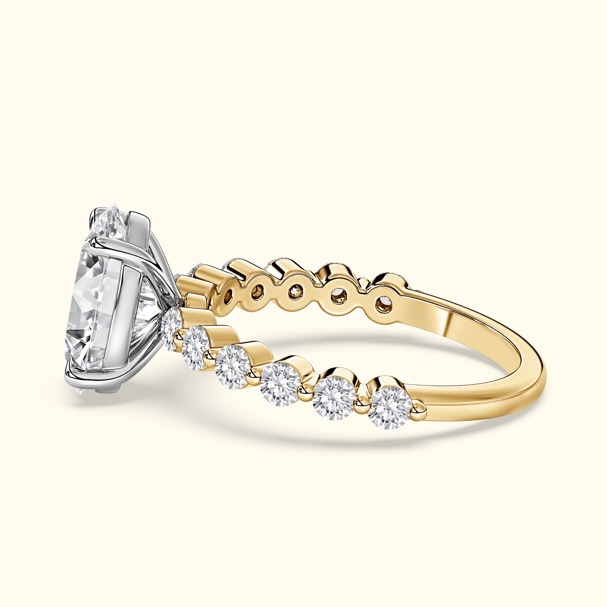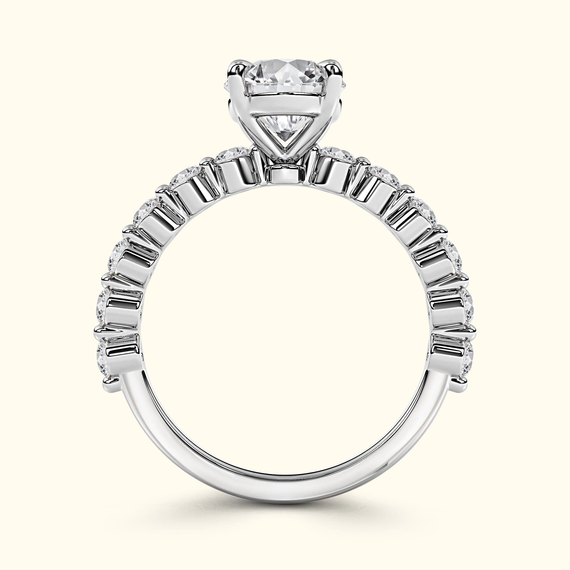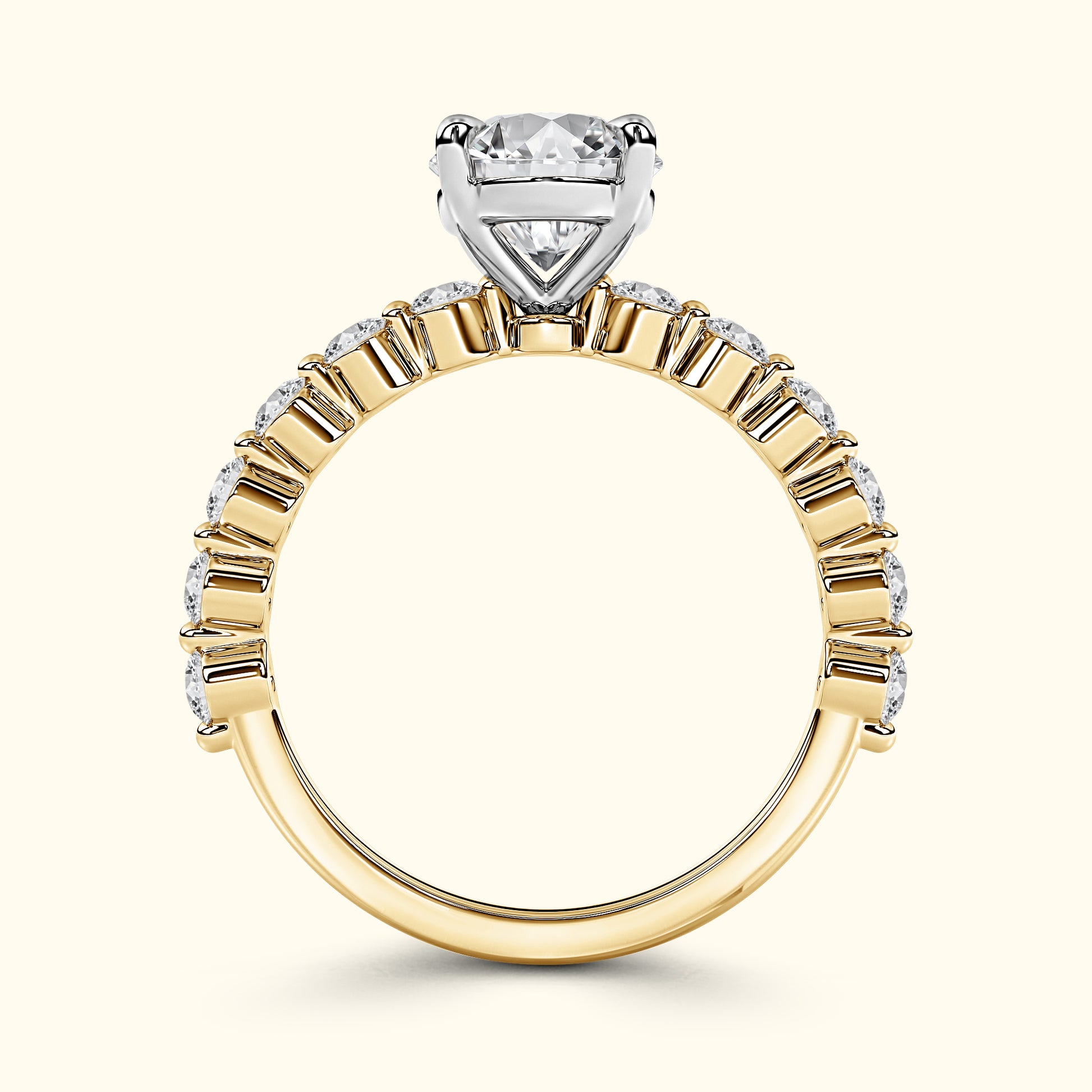 Radiant, refined, and irresistibly modern—this exquisite engagement ring brings together timeless craftsmanship with eye-catching contemporary detail. The band, crafted in warm 14K gold, features a row of graduated round diamonds that taper elegantly down the shank. Each stone is set in an open, sculptural basket that maximizes light flow, creating a shimmering line of brilliance leading up to the center diamond.