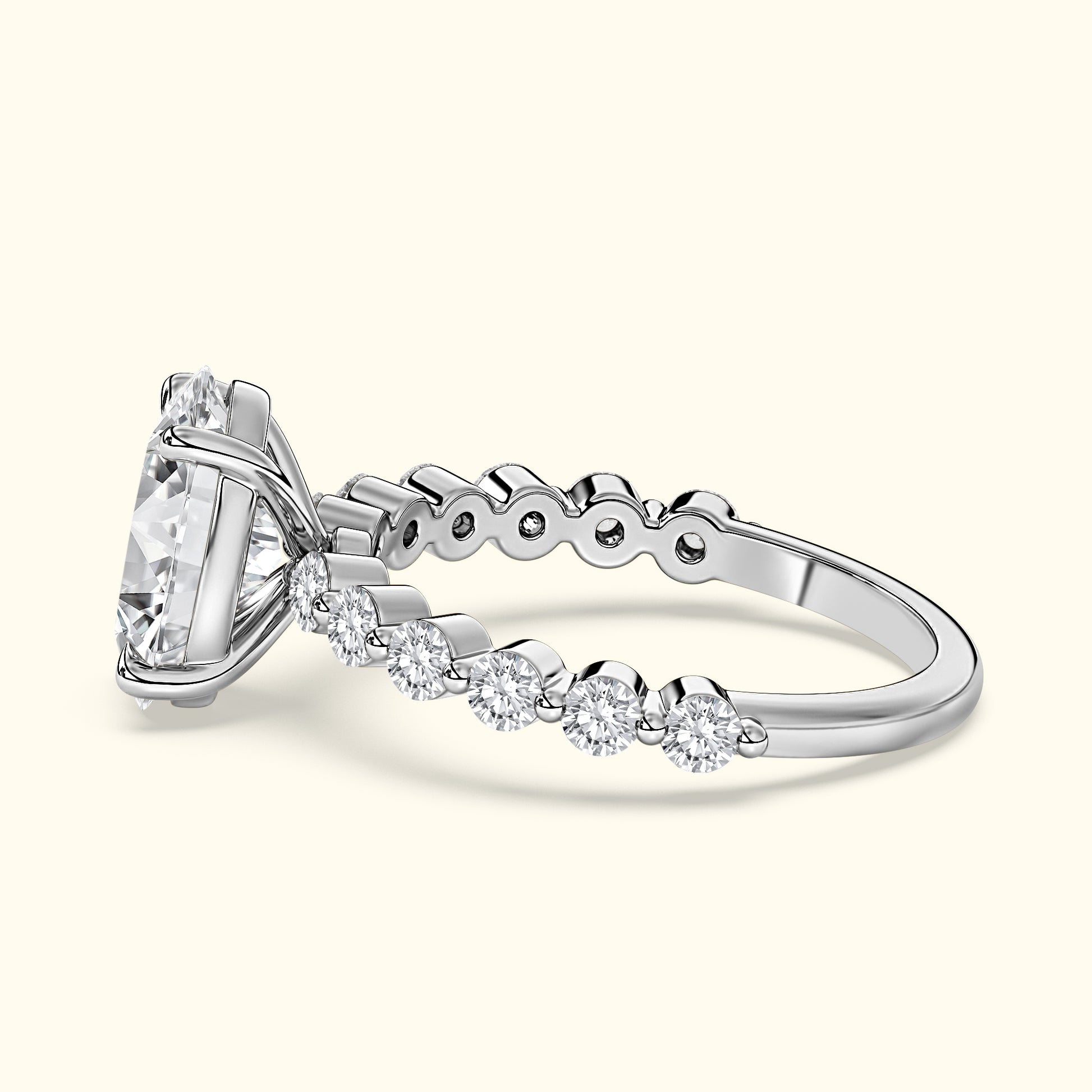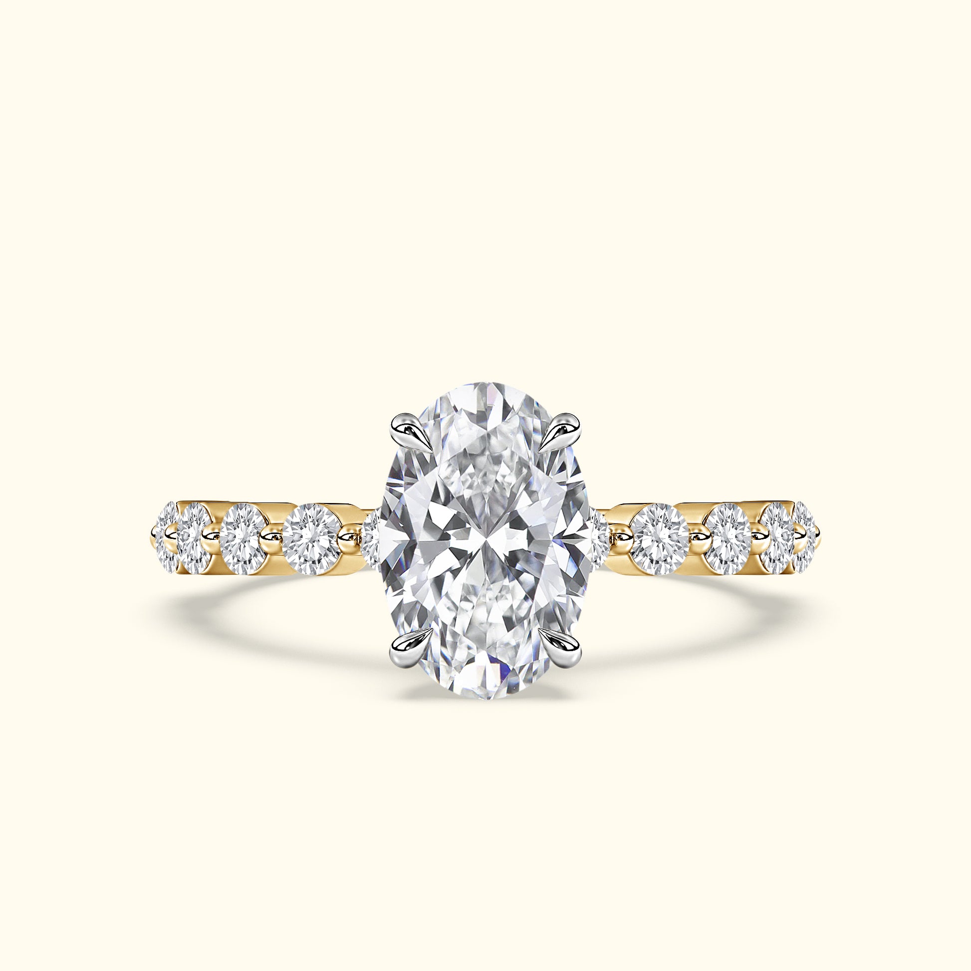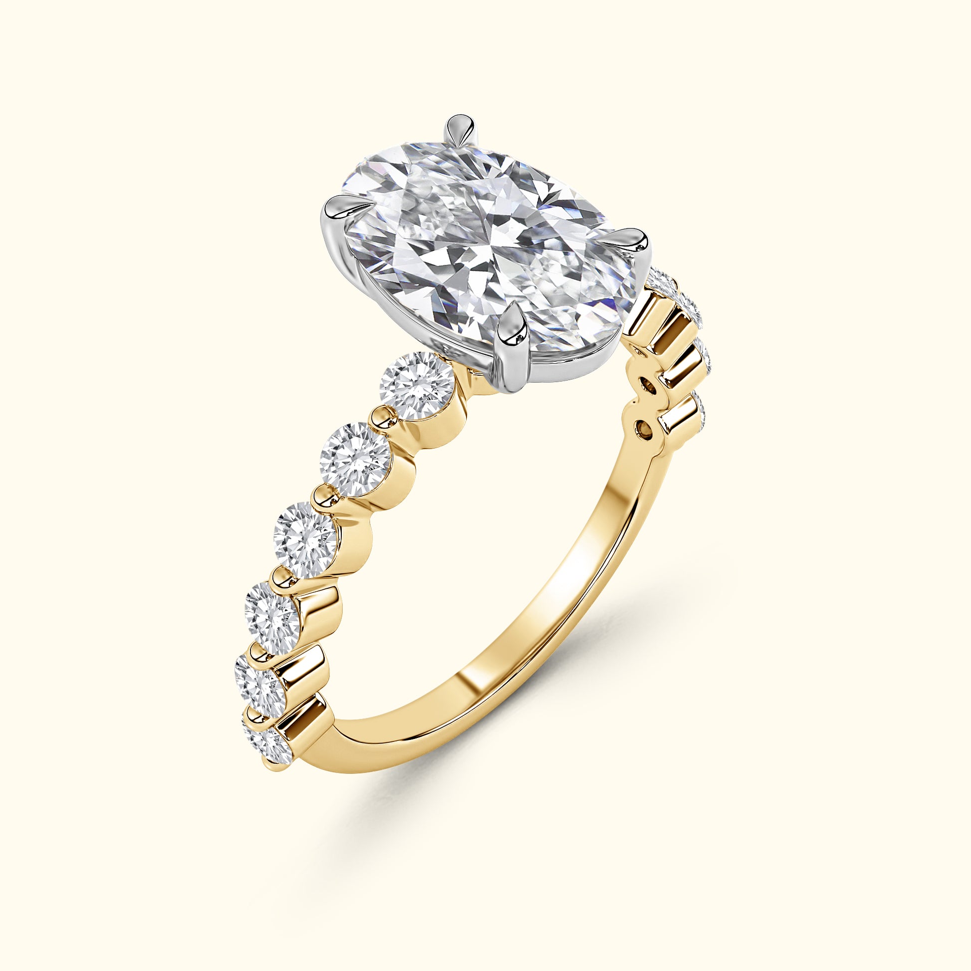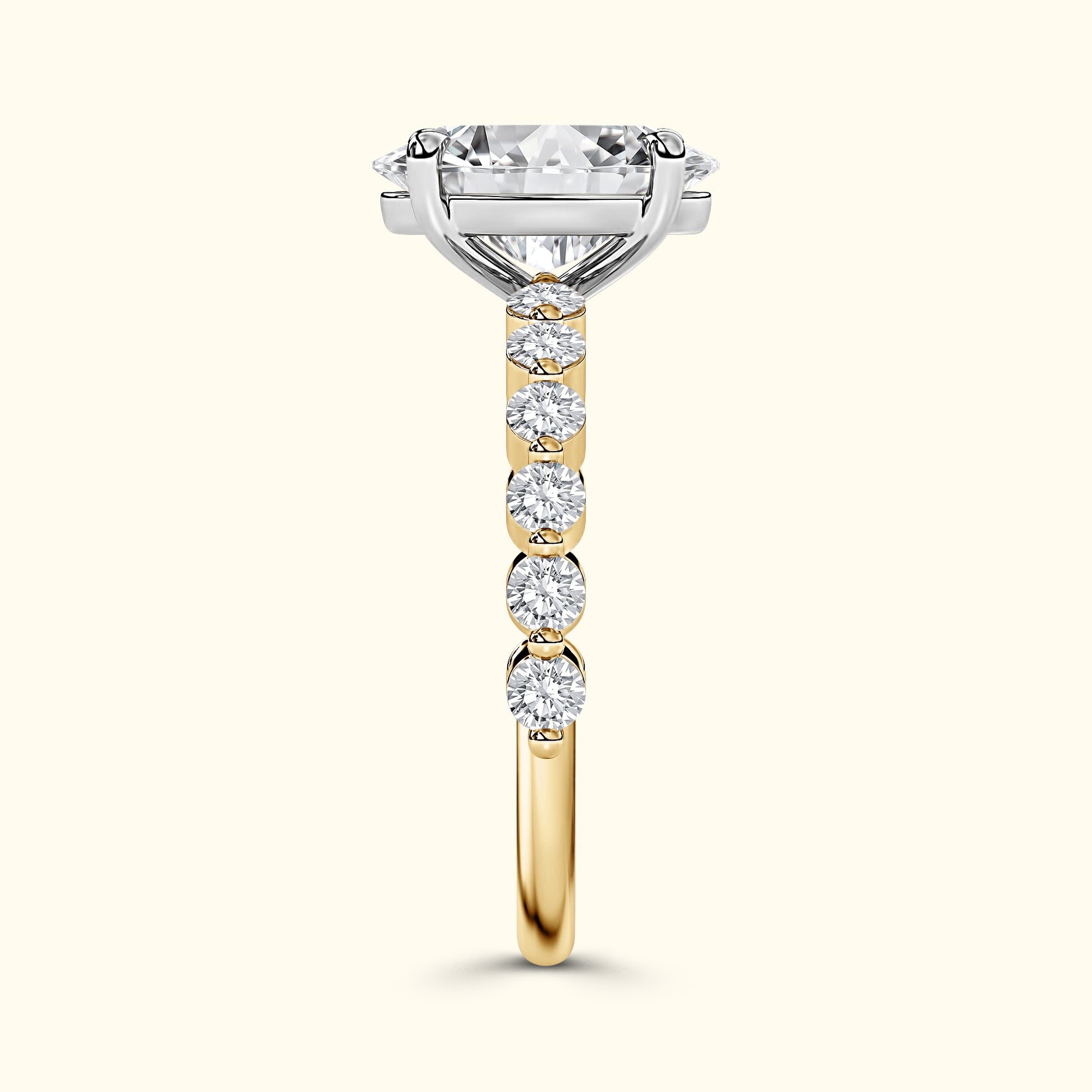 Radiant, refined, and irresistibly modern—this exquisite engagement ring brings together timeless craftsmanship with eye-catching contemporary detail. The band, crafted in warm 14K gold, features a row of graduated round diamonds that taper elegantly down the shank. Each stone is set in an open, sculptural basket that maximizes light flow, creating a shimmering line of brilliance leading up to the center diamond.