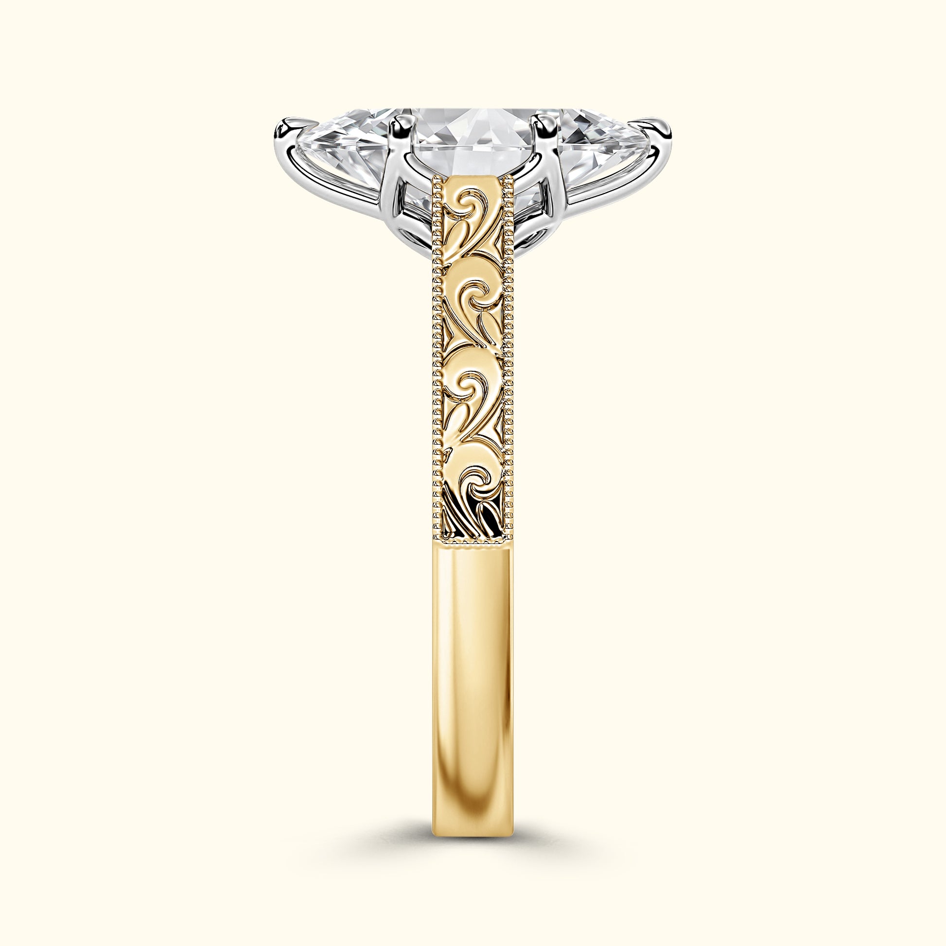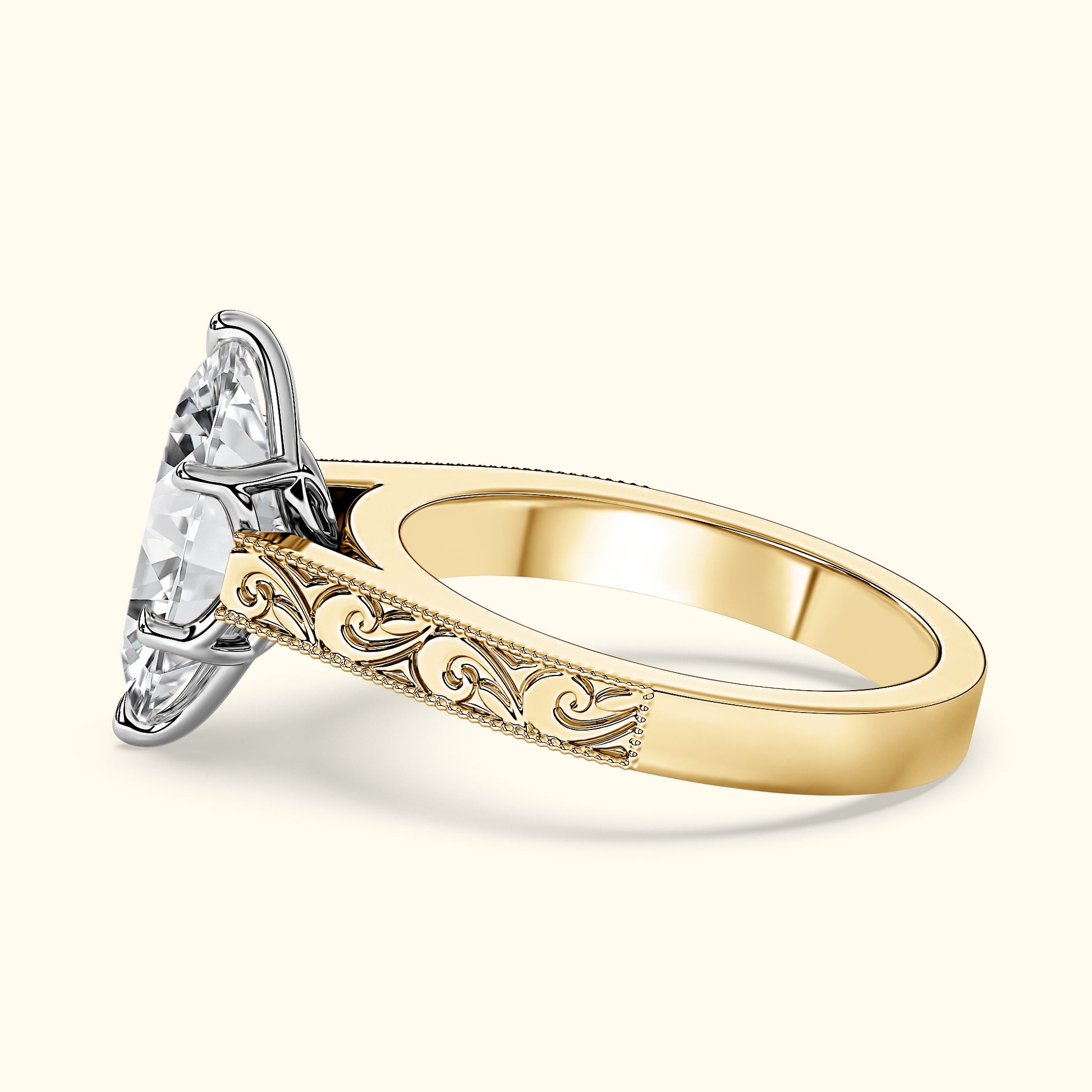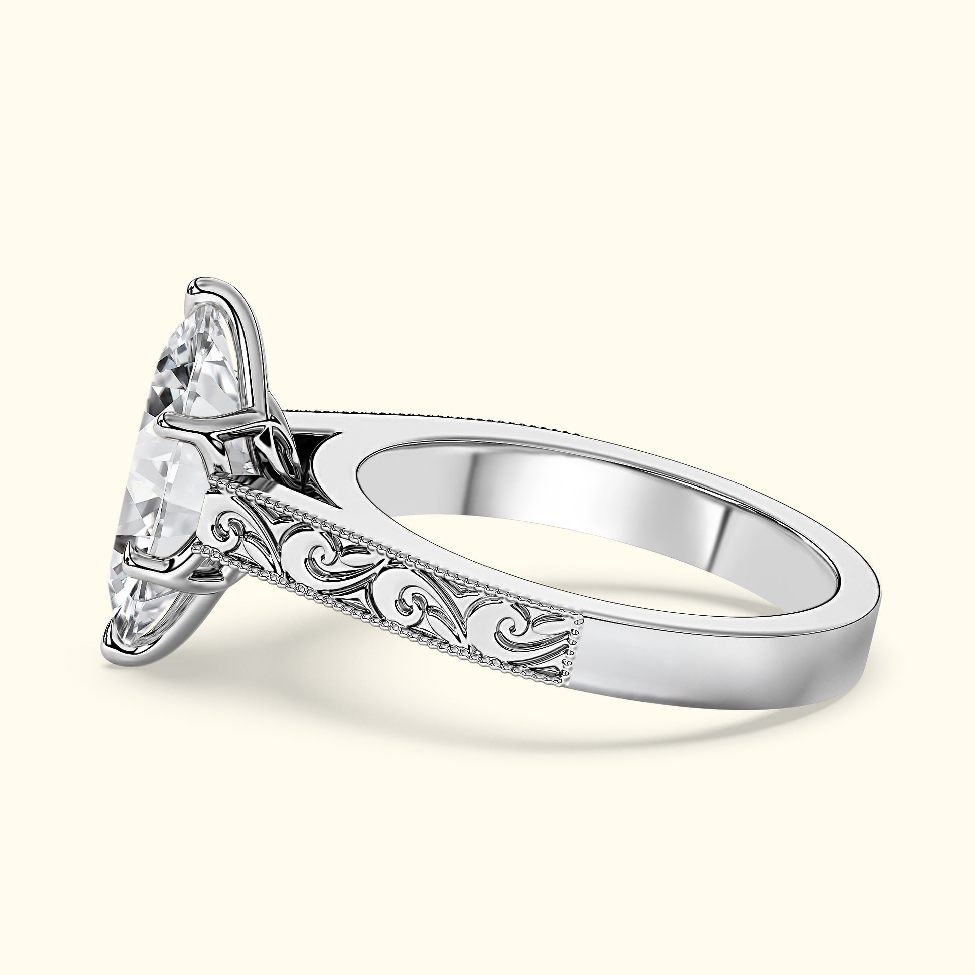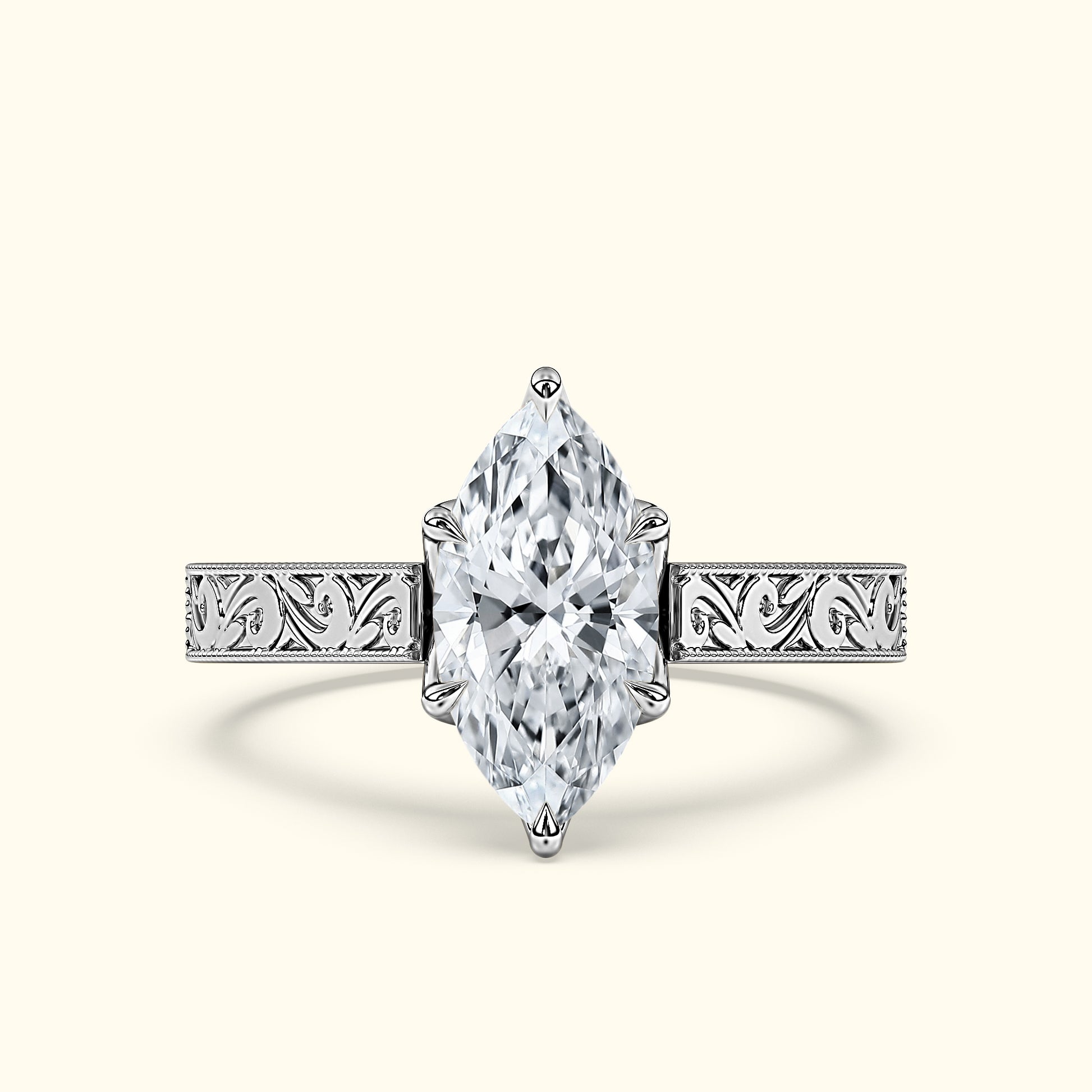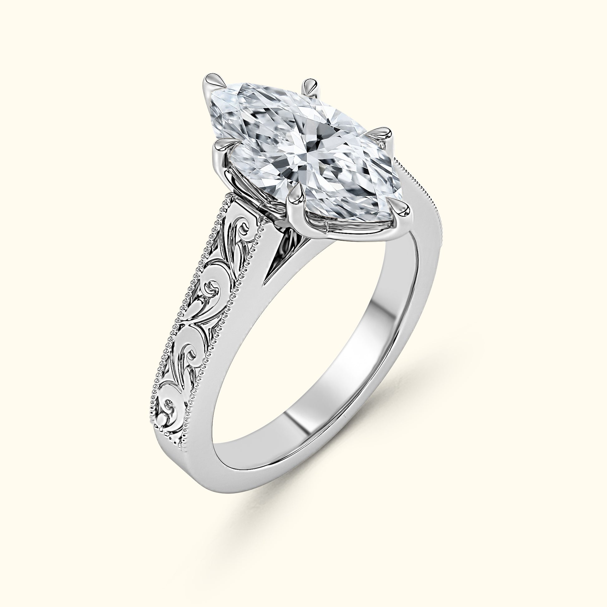 Romantic and eye-catching, this marquise diamond engagement ring highlights the stone’s elegant shape and radiant brilliance. The band features intricate etched swirls, adding vintage-inspired charm and unique detail to the design. A perfect blend of timeless beauty, ornate craftsmanship, and distinctive character.