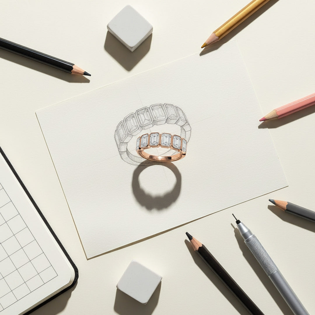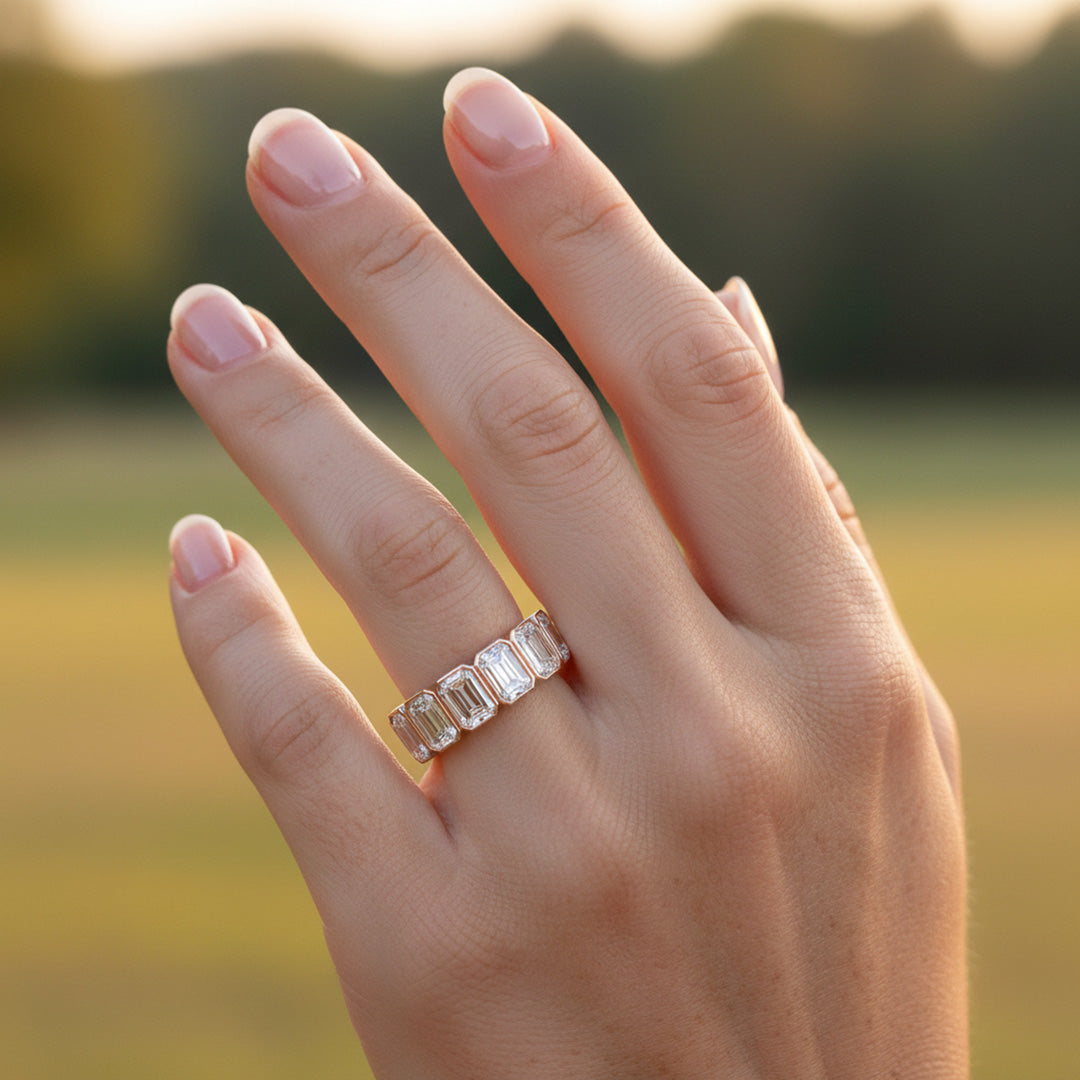 This 7-stone emerald-cut diamond band features sleek bezel settings that highlight each stone’s clarity and clean lines. Elegant and modern, it’s perfect alone or stacked for a timeless, contemporary look.