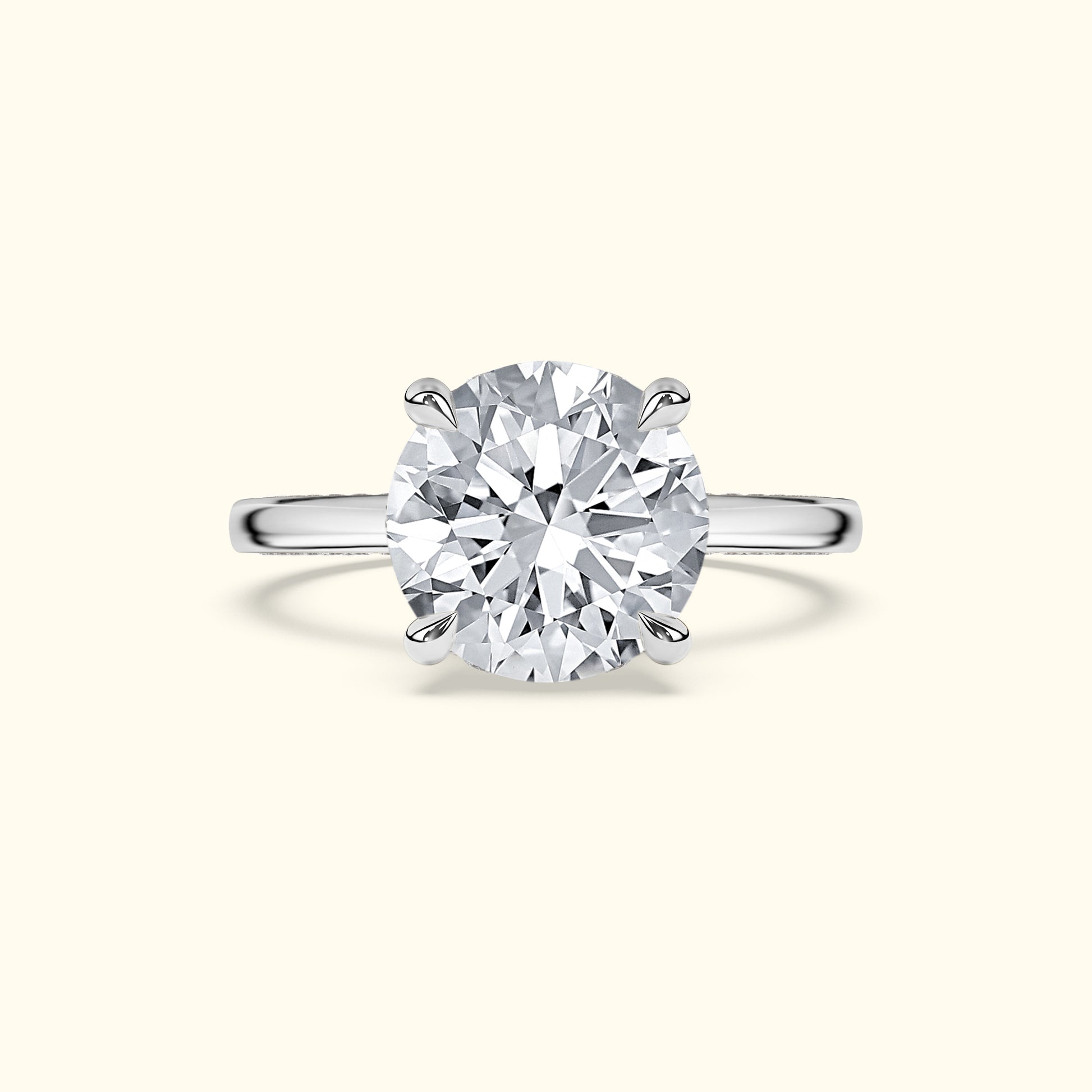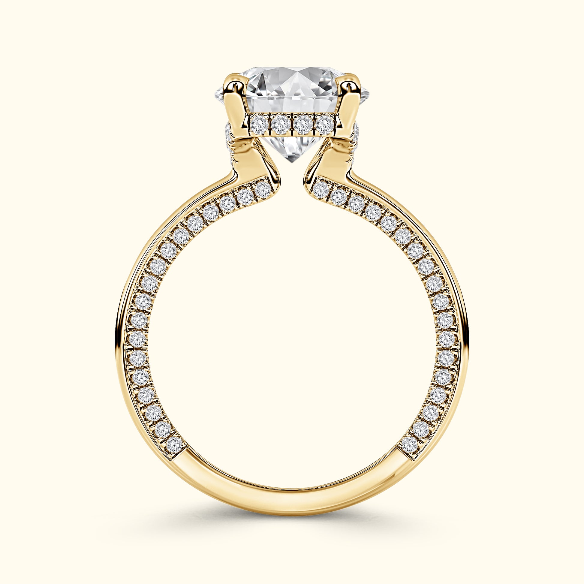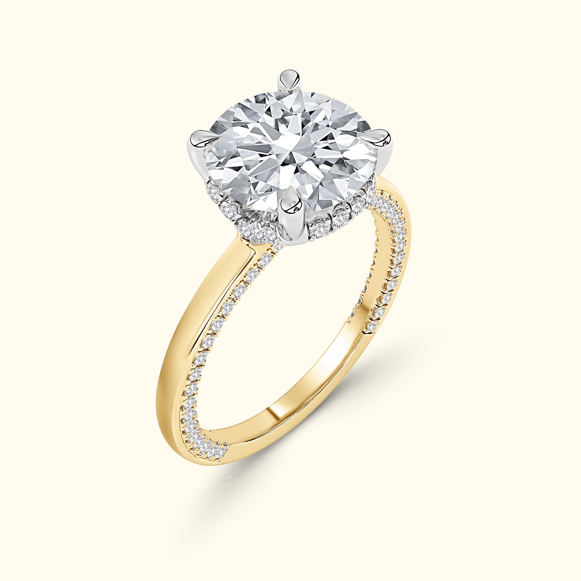 A timeless design with a touch of hidden brilliance. This stunning engagement ring features a round center diamond elevated above a delicate underhalo — adding sparkle from every angle. The front-facing French pavé shank enhances the ring’s graceful profile, allowing light to dance across each hand-set diamond. Elegant, modern, and endlessly romantic, this design celebrates classic beauty with a contemporary twist.