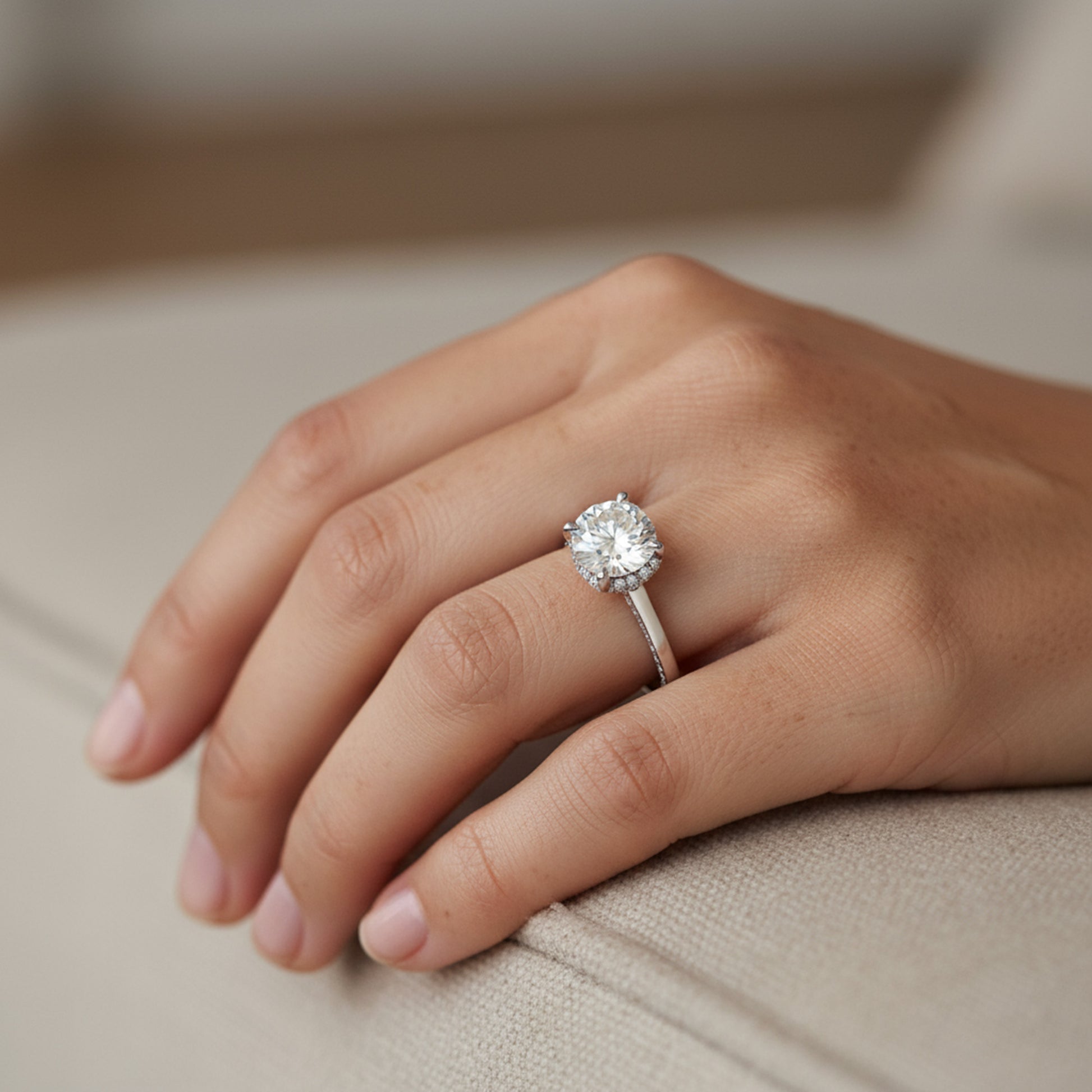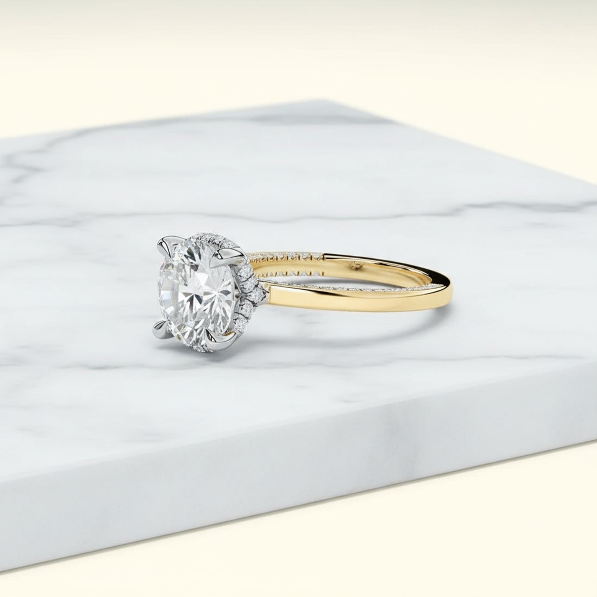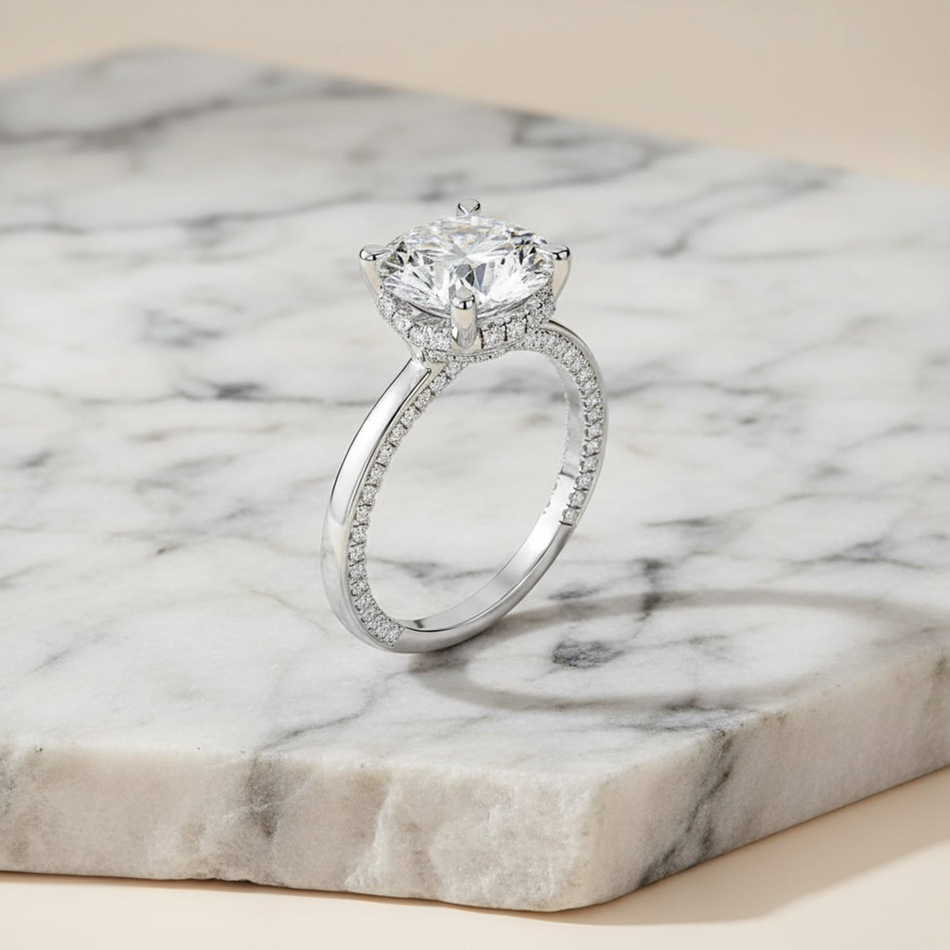 A timeless design with a touch of hidden brilliance. This stunning engagement ring features a round center diamond elevated above a delicate underhalo — adding sparkle from every angle. The front-facing French pavé shank enhances the ring’s graceful profile, allowing light to dance across each hand-set diamond. Elegant, modern, and endlessly romantic, this design celebrates classic beauty with a contemporary twist.