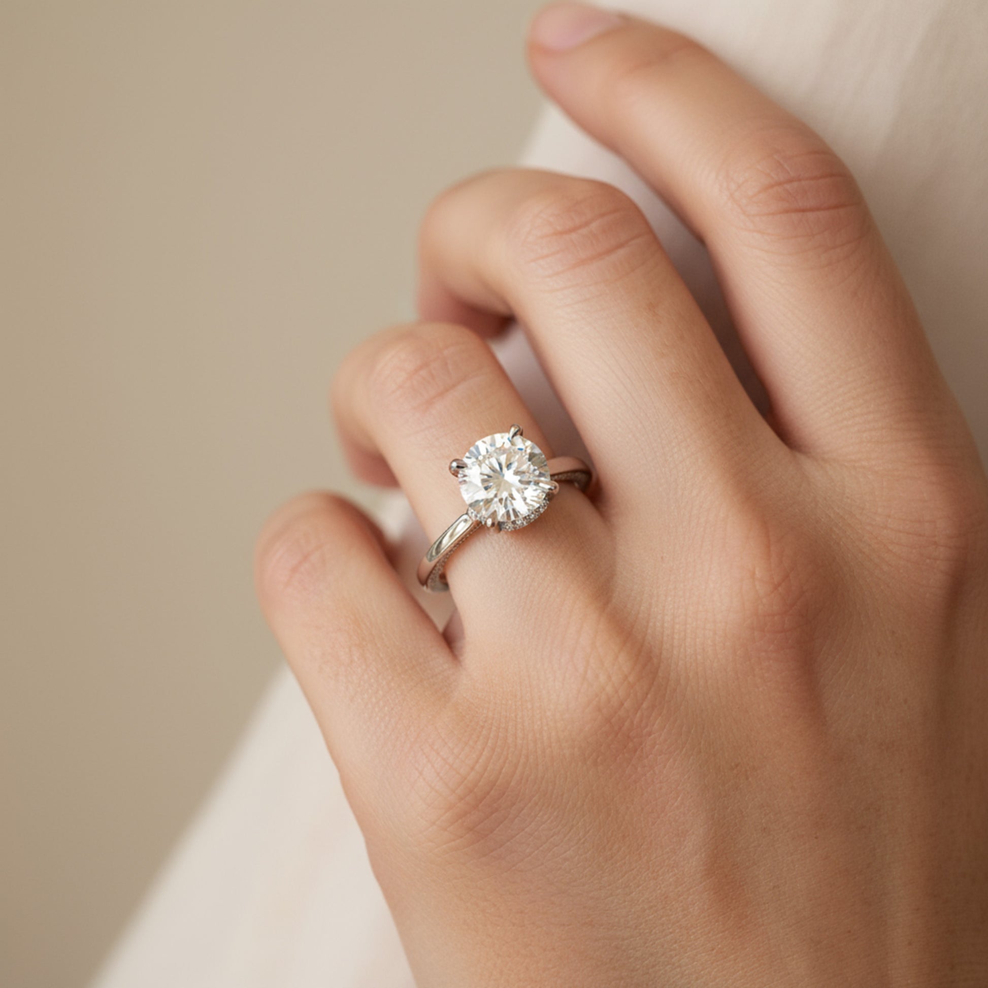 A timeless design with a touch of hidden brilliance. This stunning engagement ring features a round center ... Show more