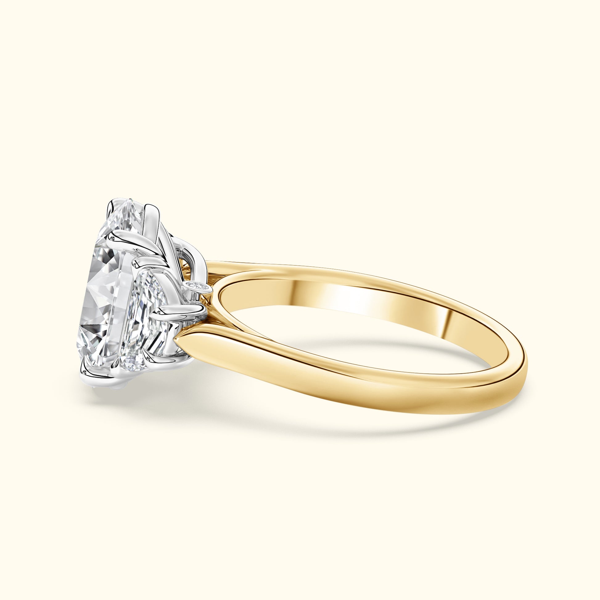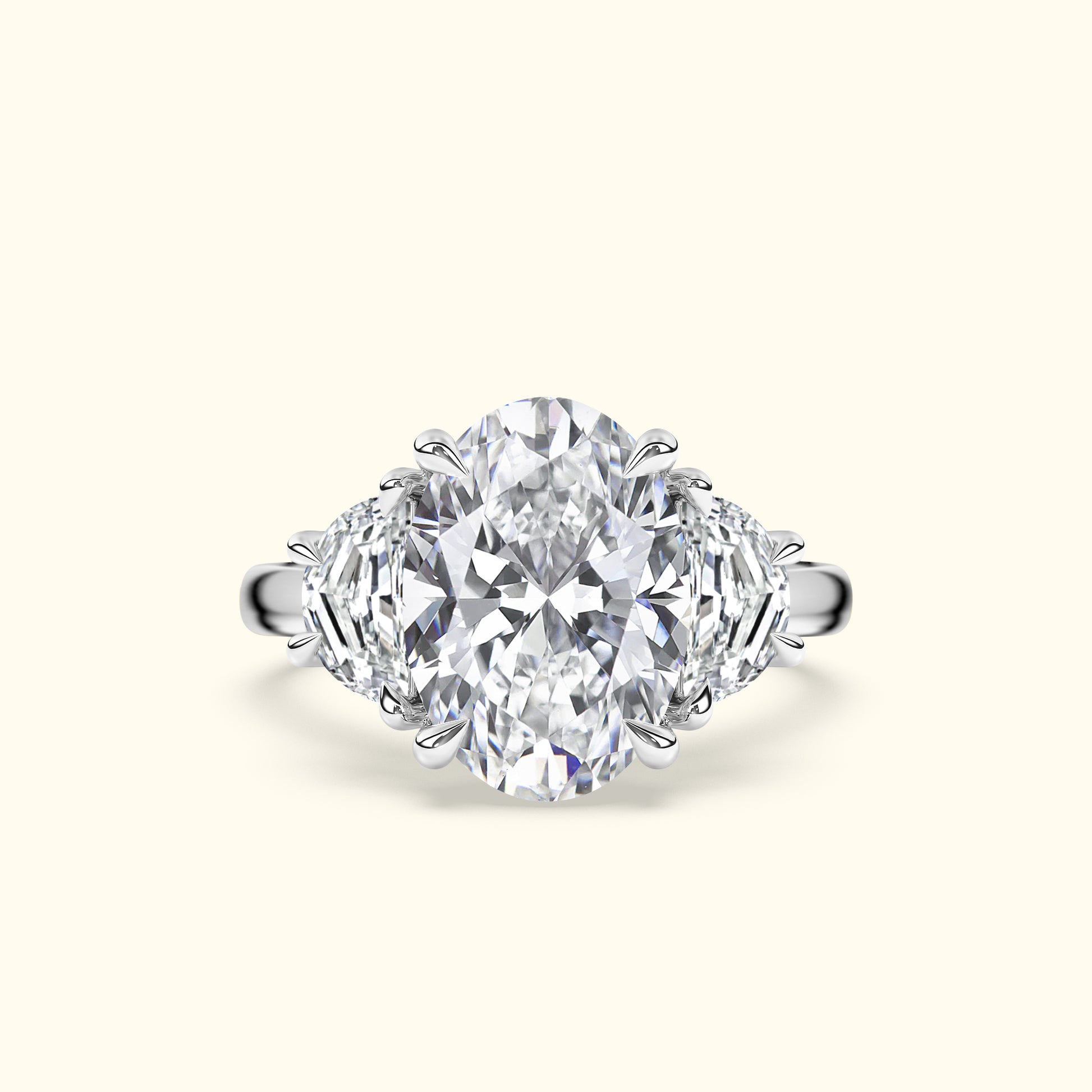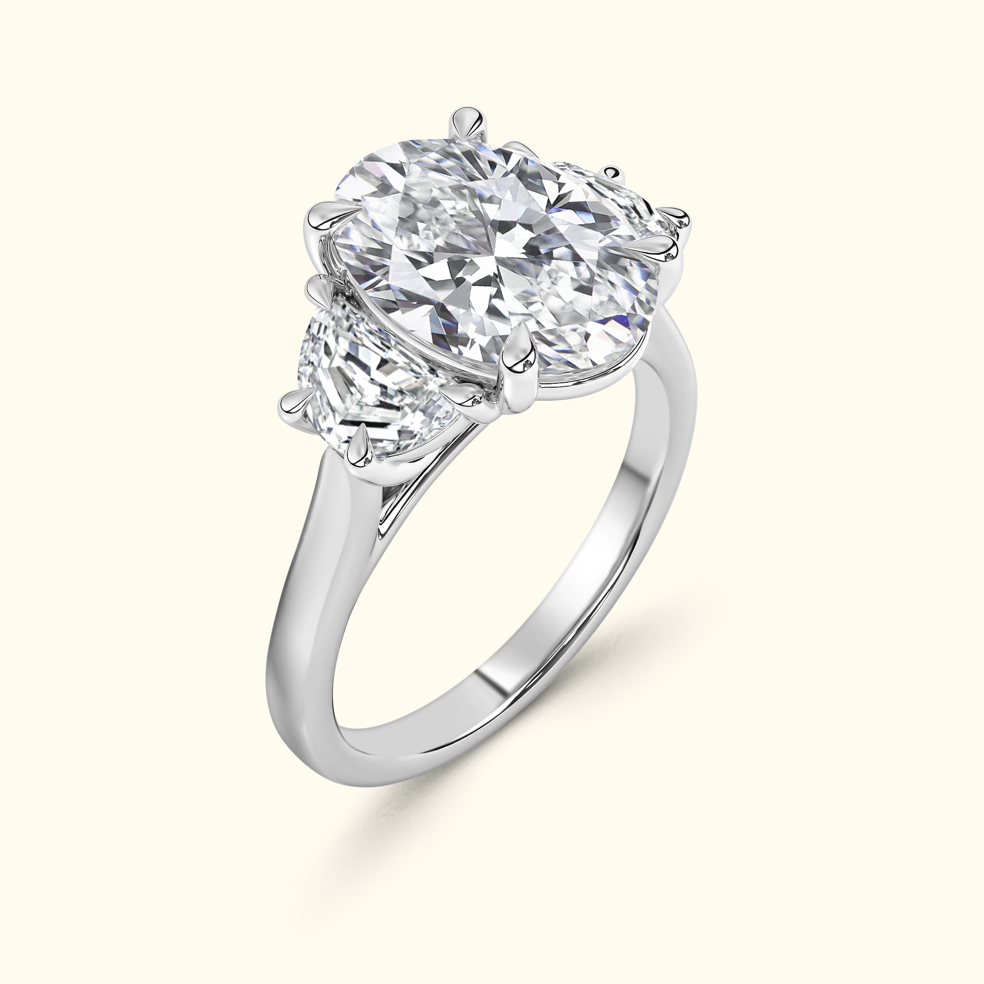 Graceful from every angle, this cathedral-set engagement ring features a dazzling oval center stone flanked by two radiant half moon diamonds. A hidden peekaboo diamond beneath the setting adds a secret touch of sparkle—because love is all about the little details.